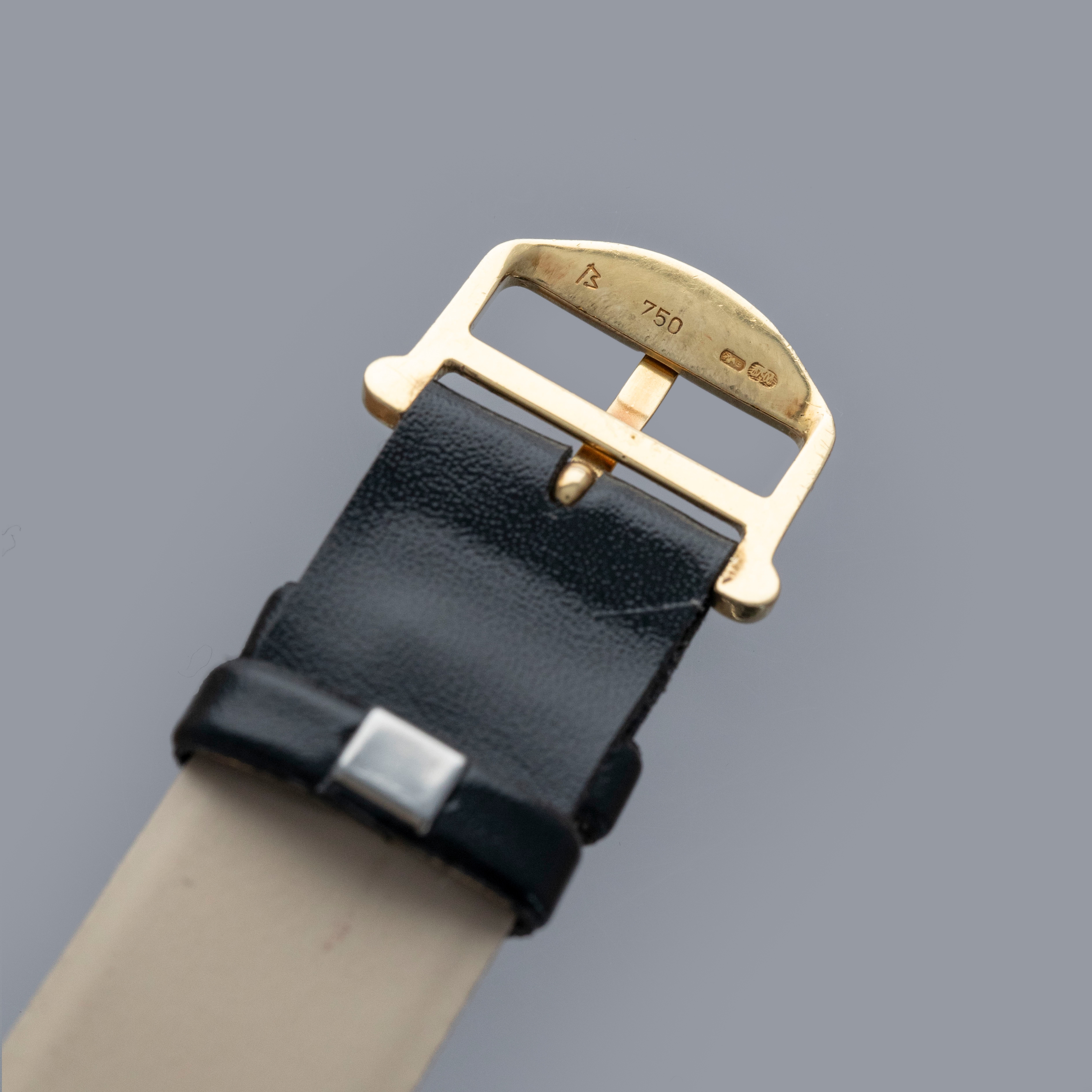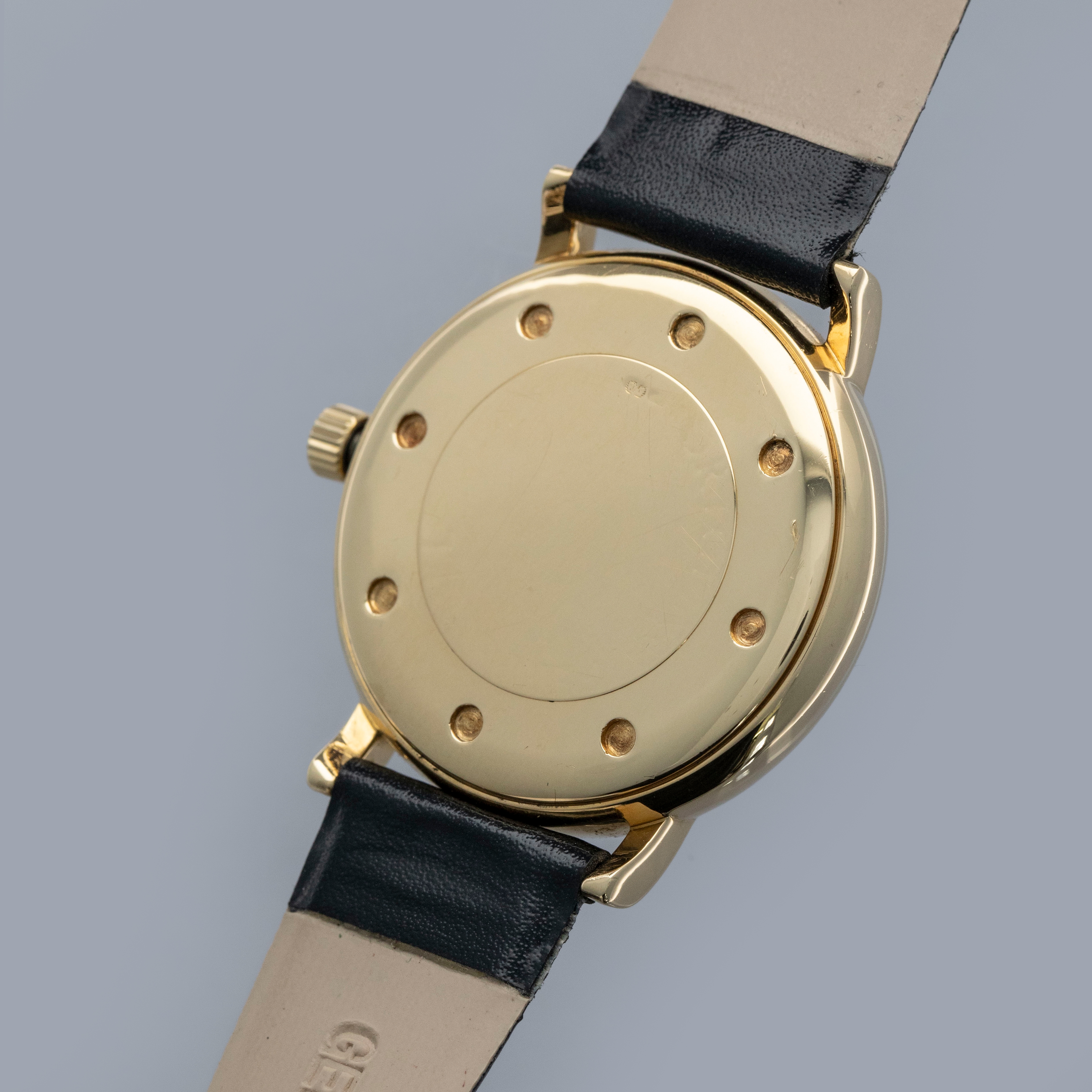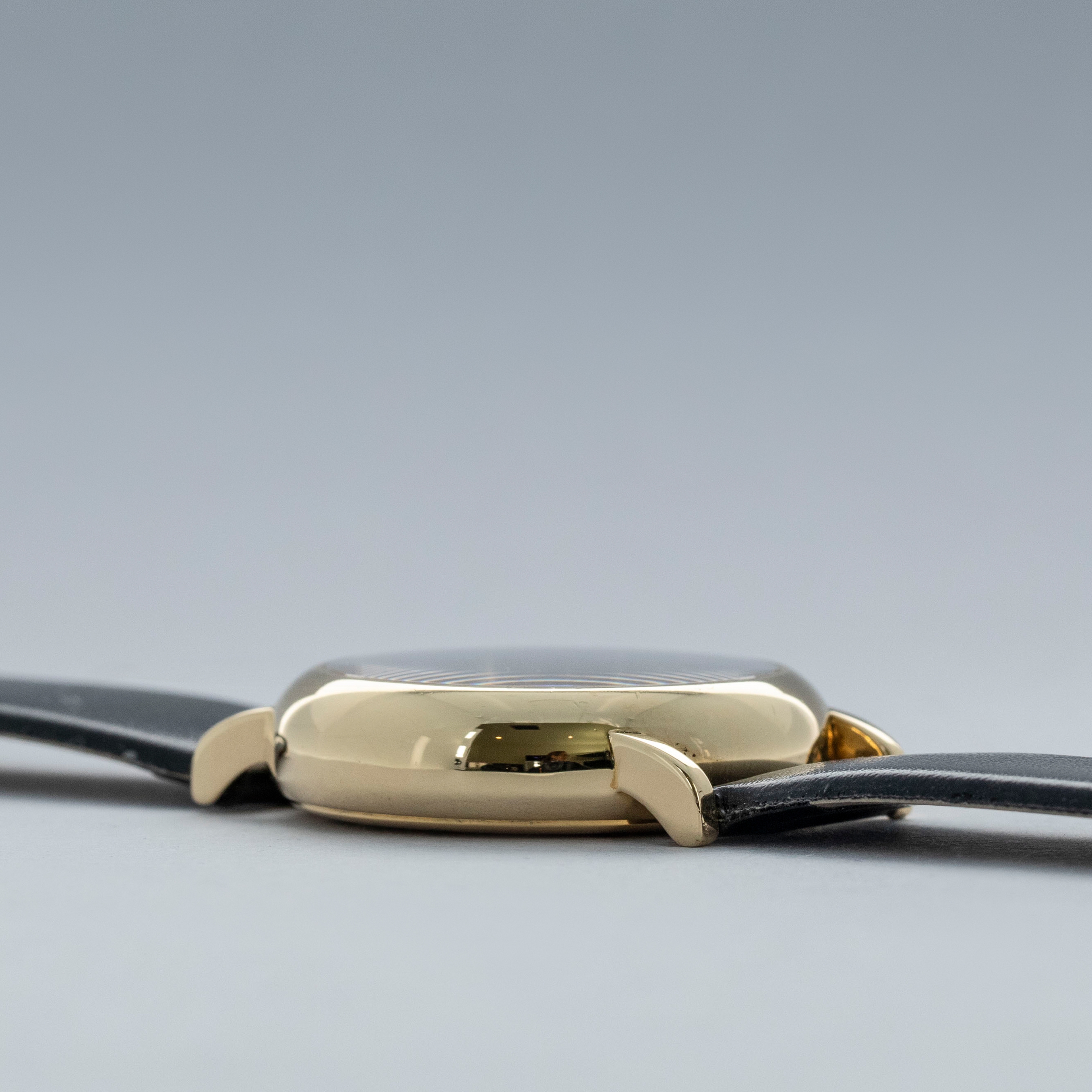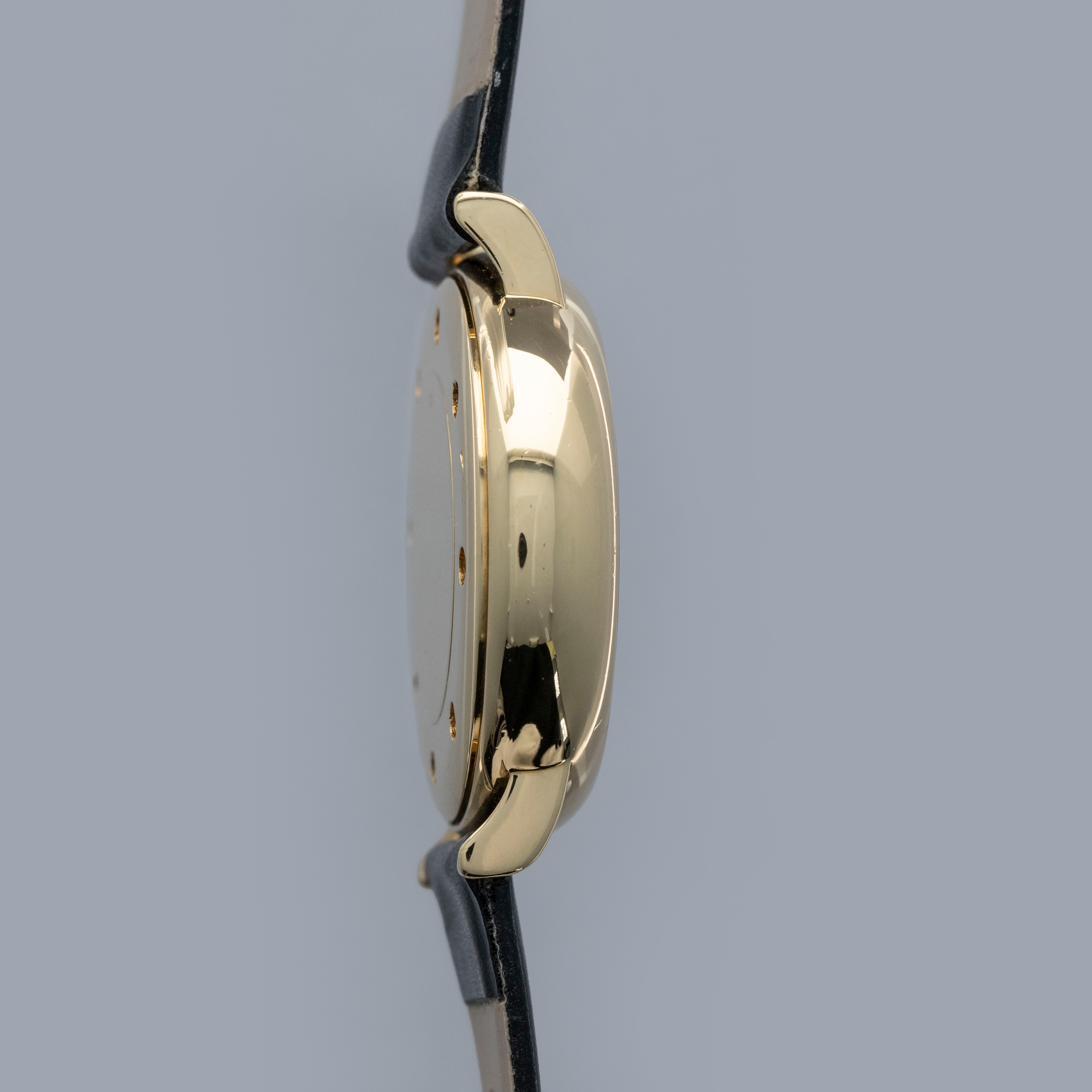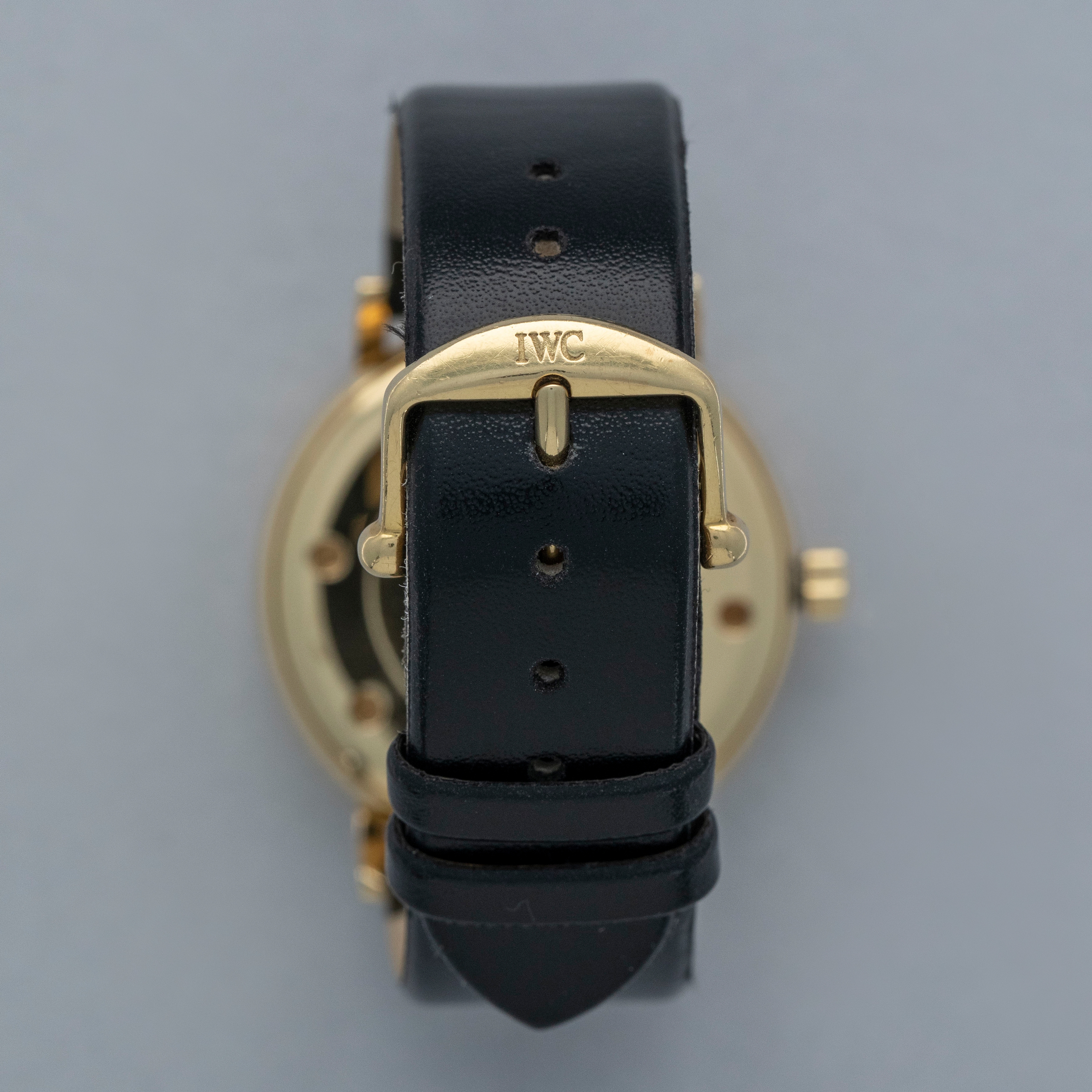 Watch is in overall very good condition. The yellow gold case shows moderate surface wear, with scratches along with a couple of small nicks on its previously polished surface. The caseback engravings and hallmarks are only partially visible due to wear and previous polishing. Serial number on exterior of caseback is no longer visible. The dial and hands remain near mint. It is fitted with a black leather strap and a yellow gold IWC buckle showing light surface scratches.