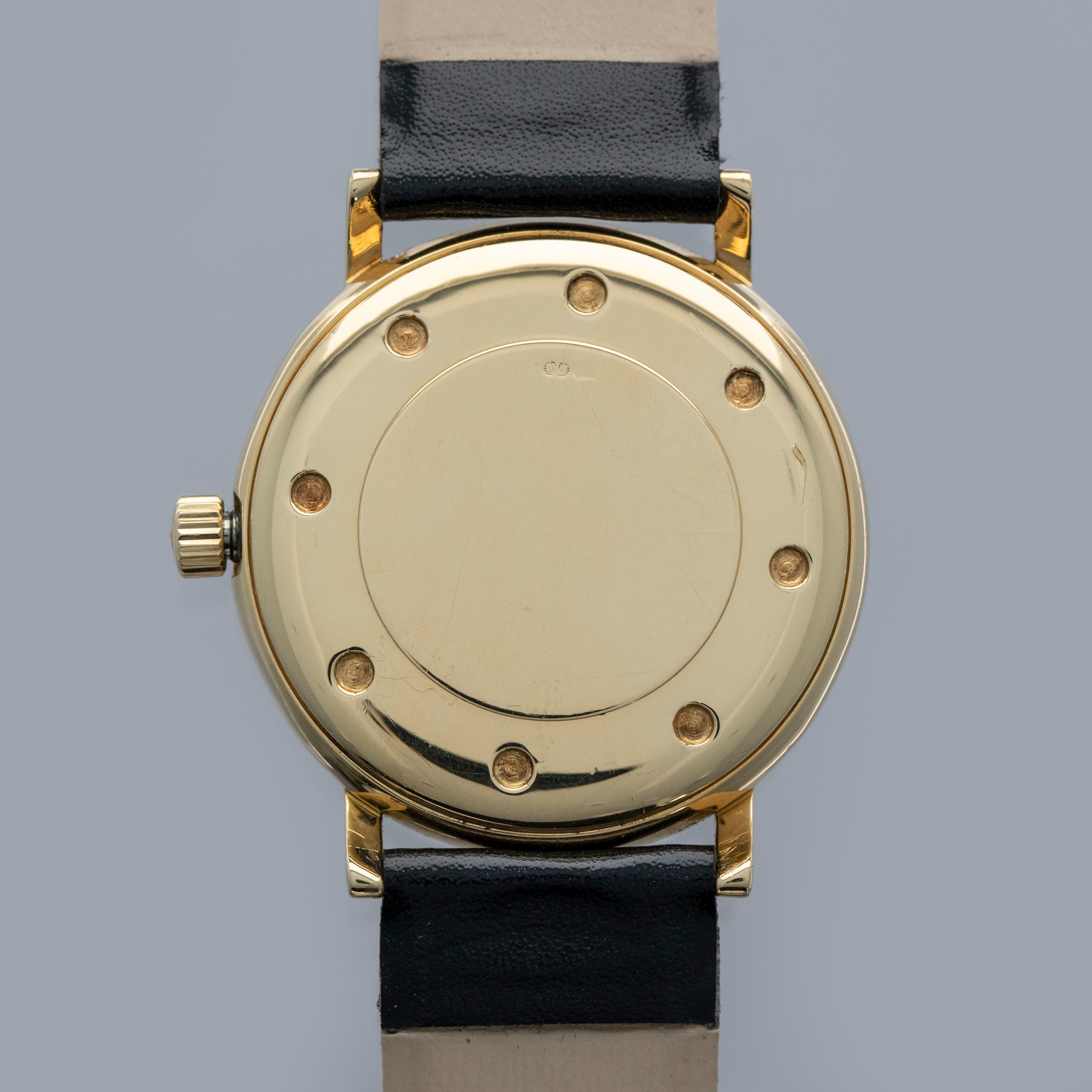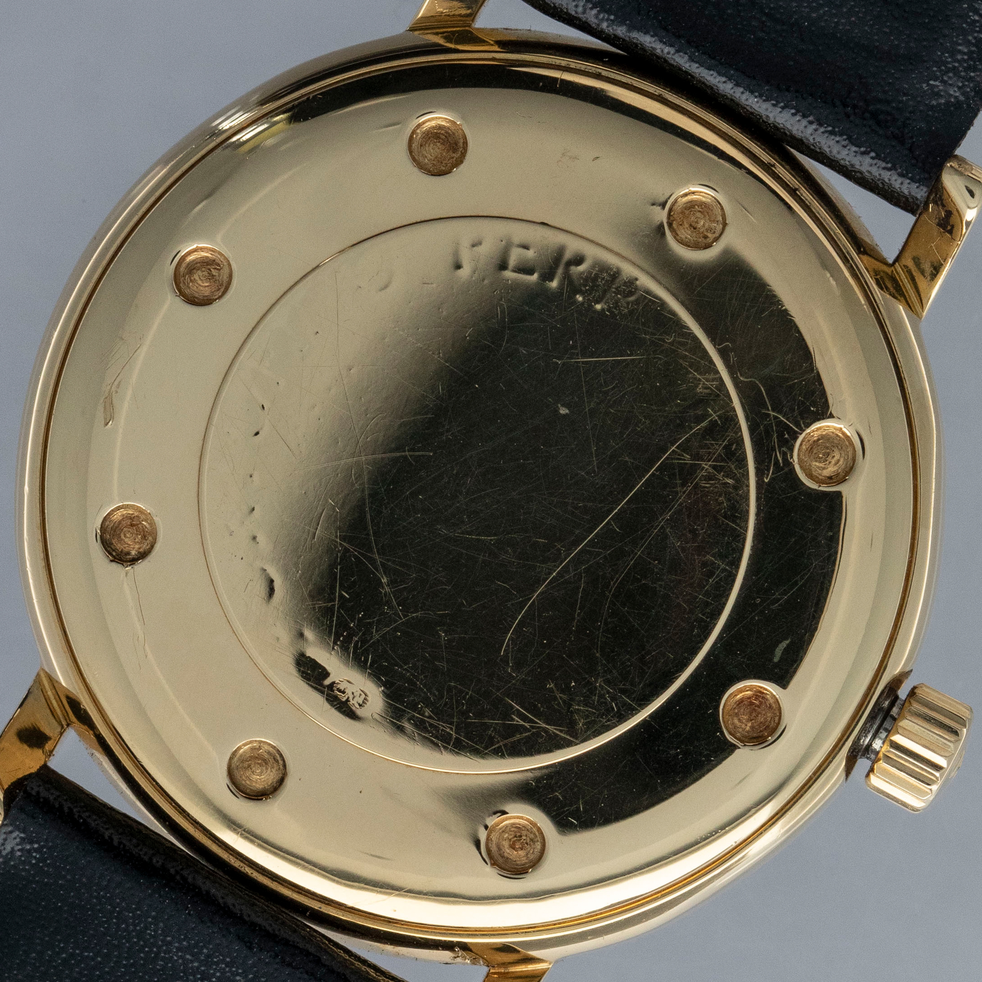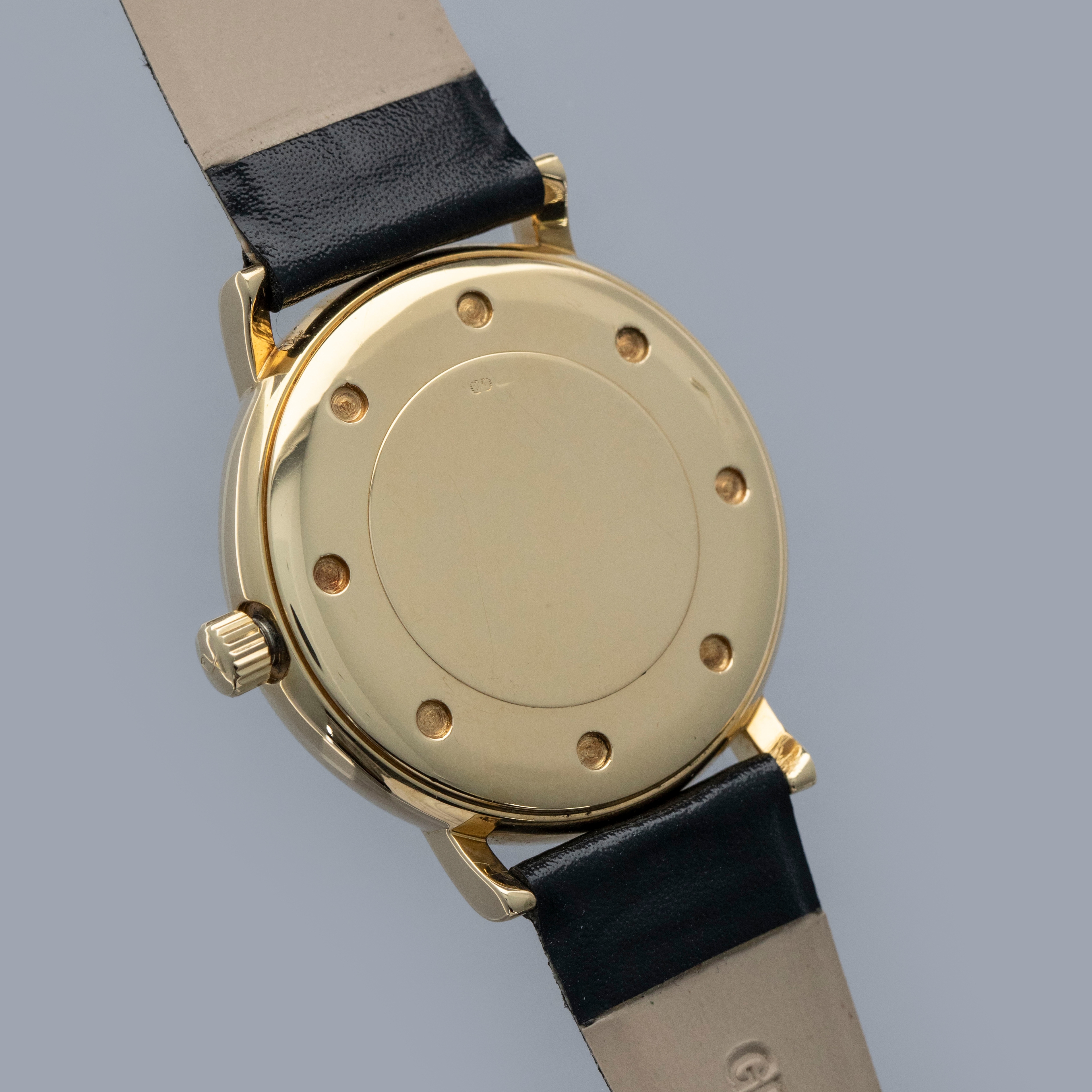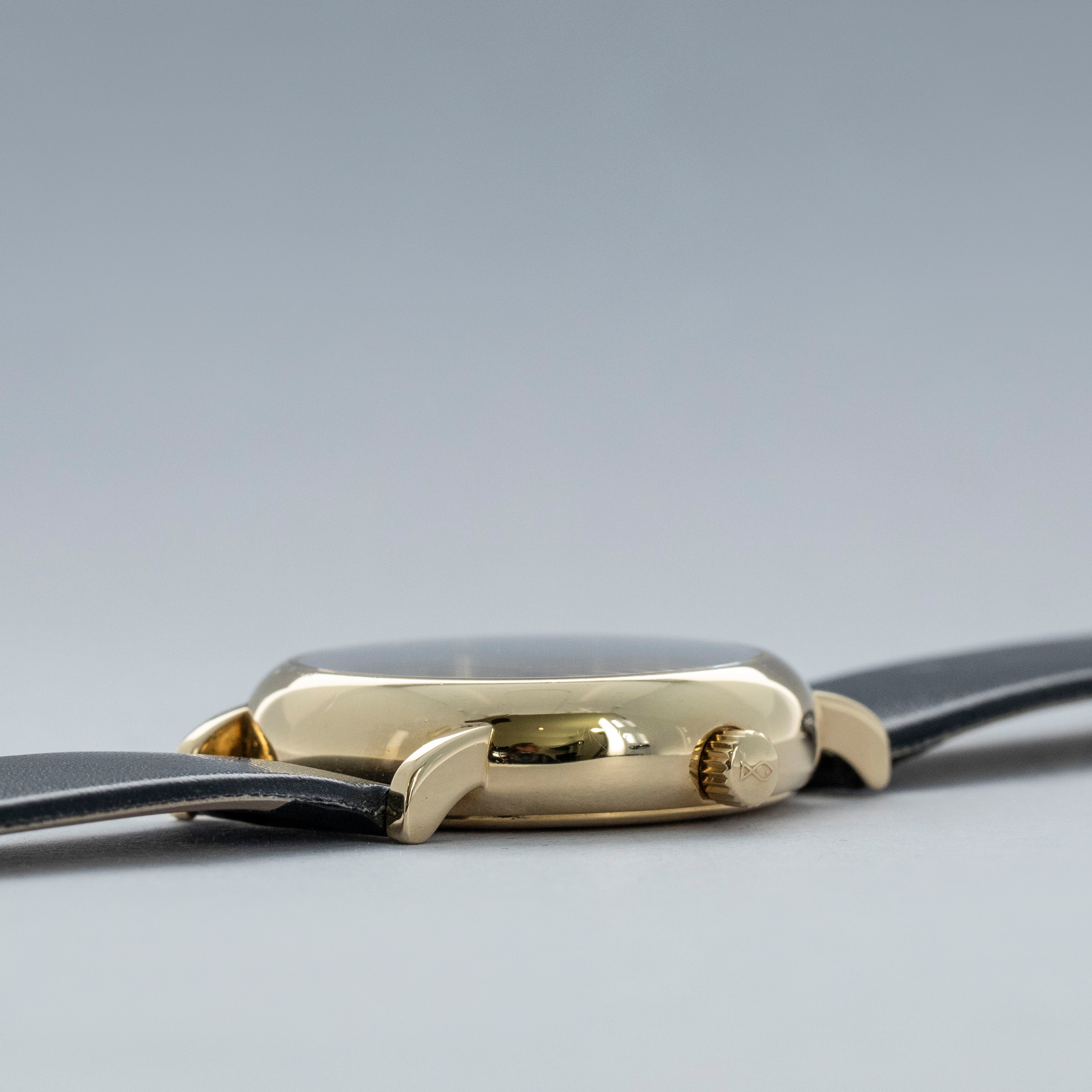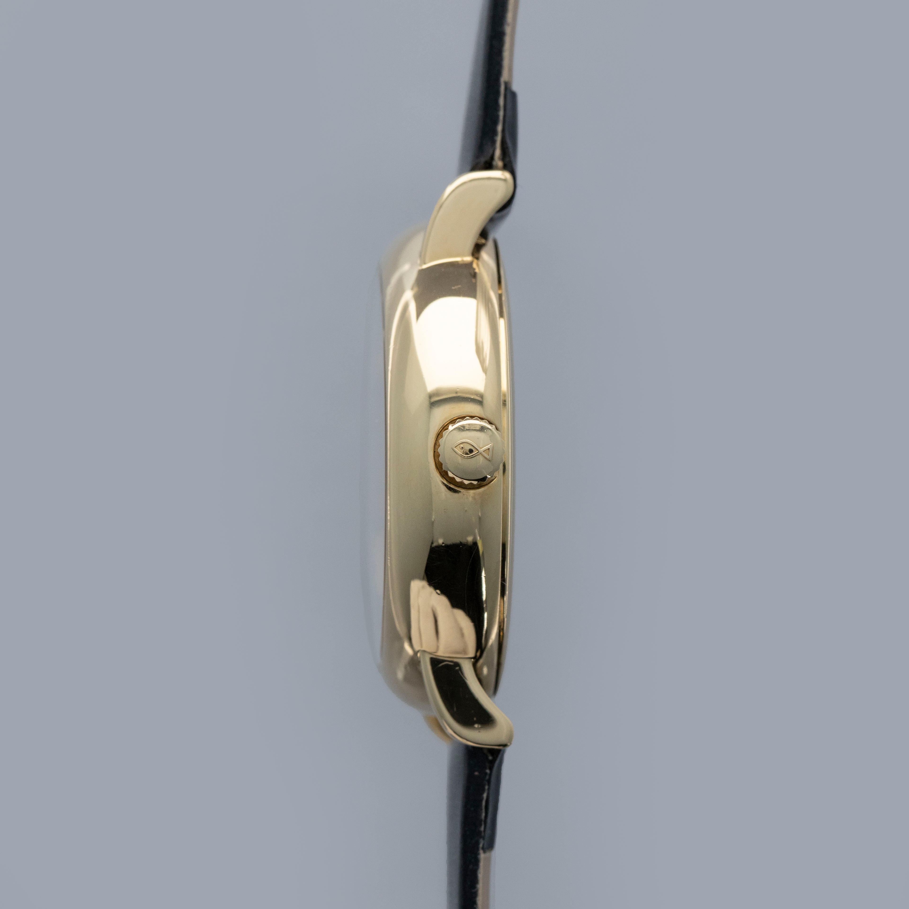 Watch is in overall very good condition. The yellow gold case shows moderate surface wear, with scratches along with a couple of small nicks on its previously polished surface. The caseback engravings and hallmarks are only partially visible due to wear and previous polishing. Serial number on exterior of caseback is no longer visible. The dial and hands remain near mint. It is fitted with a black leather strap and a yellow gold IWC buckle showing light surface scratches.