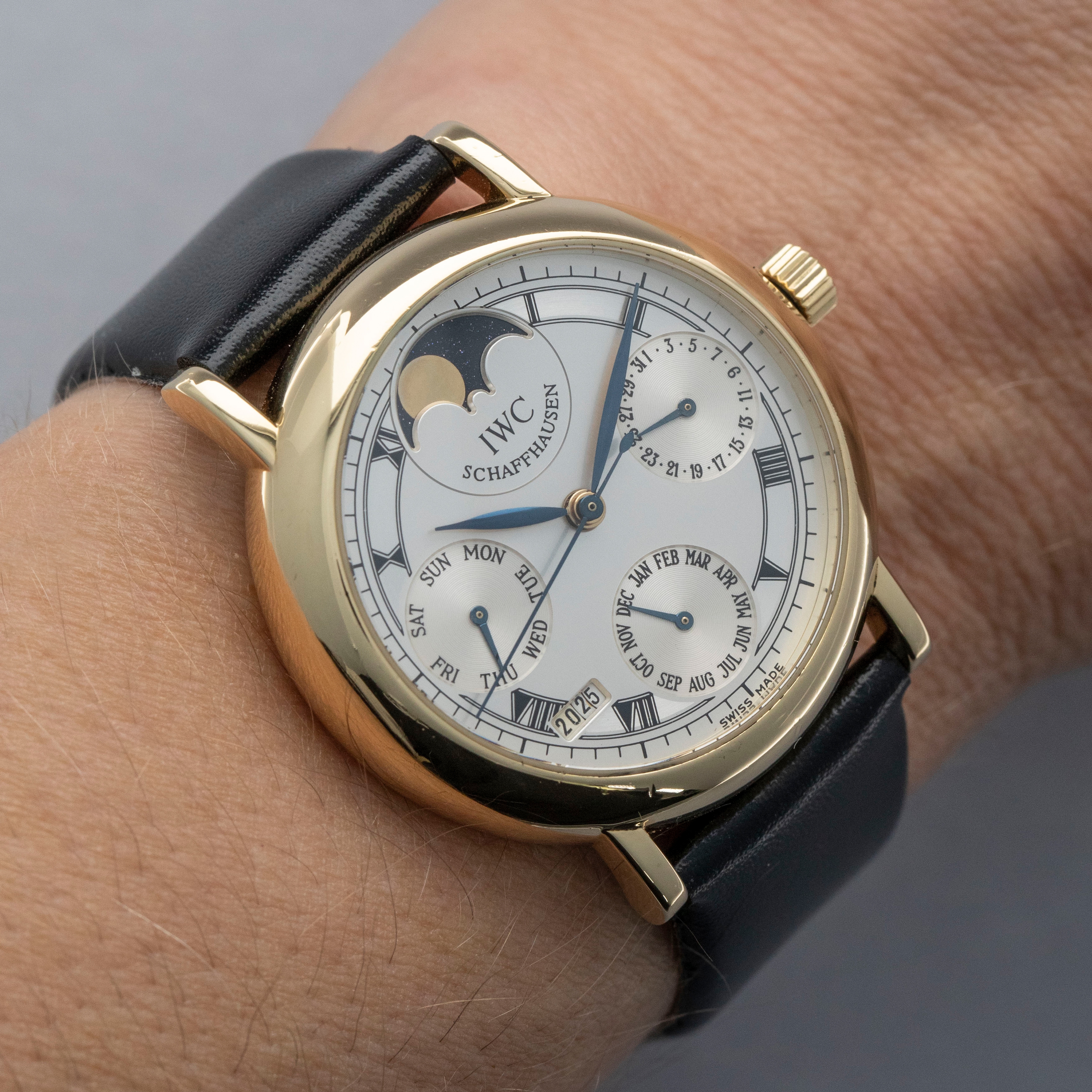 Featuring a rather unique font style for its Roman numerals, the IW3541's silver display is immediately different to most perpetual calendar dials, with its year aperture at 7 o'clock only compounding upon its unique design.