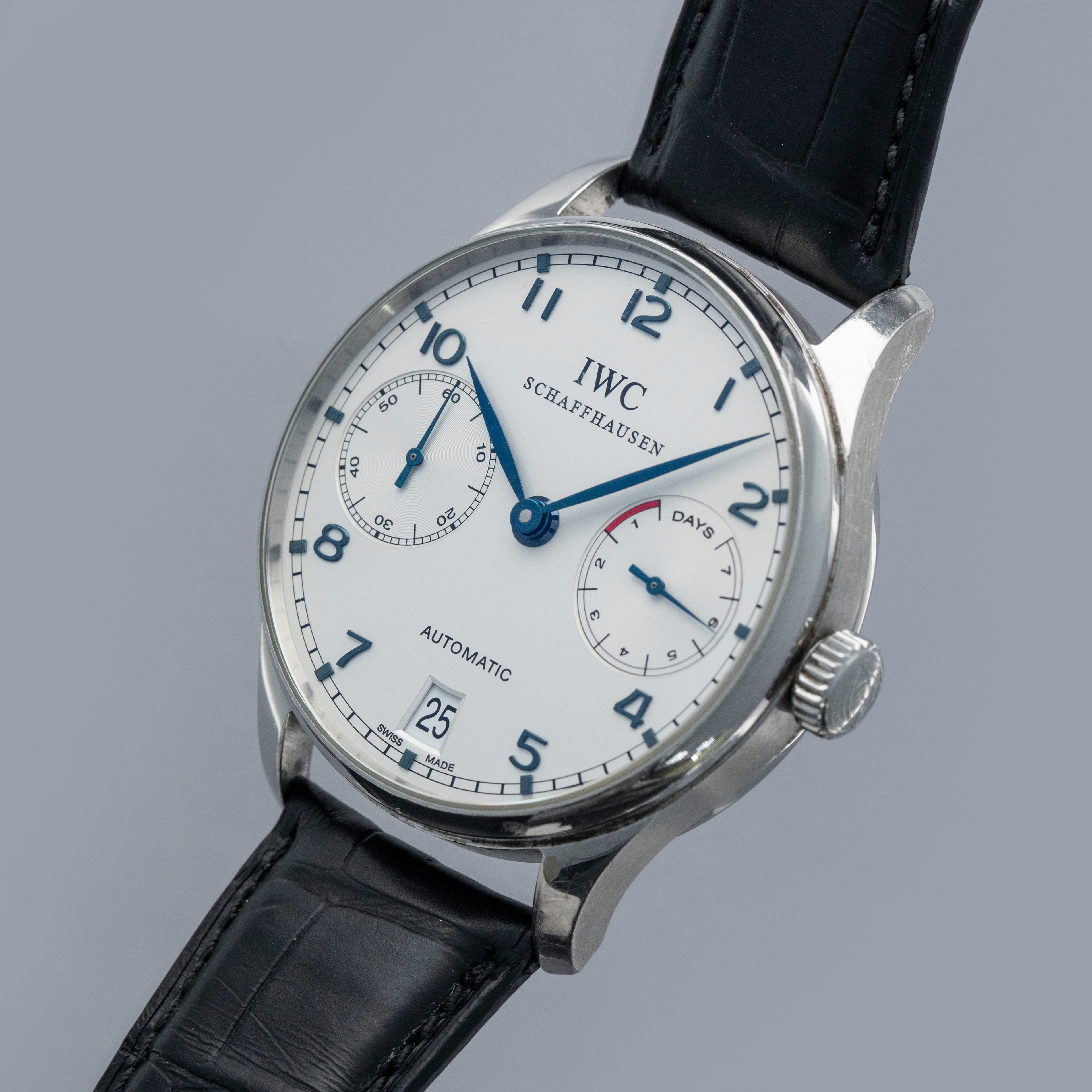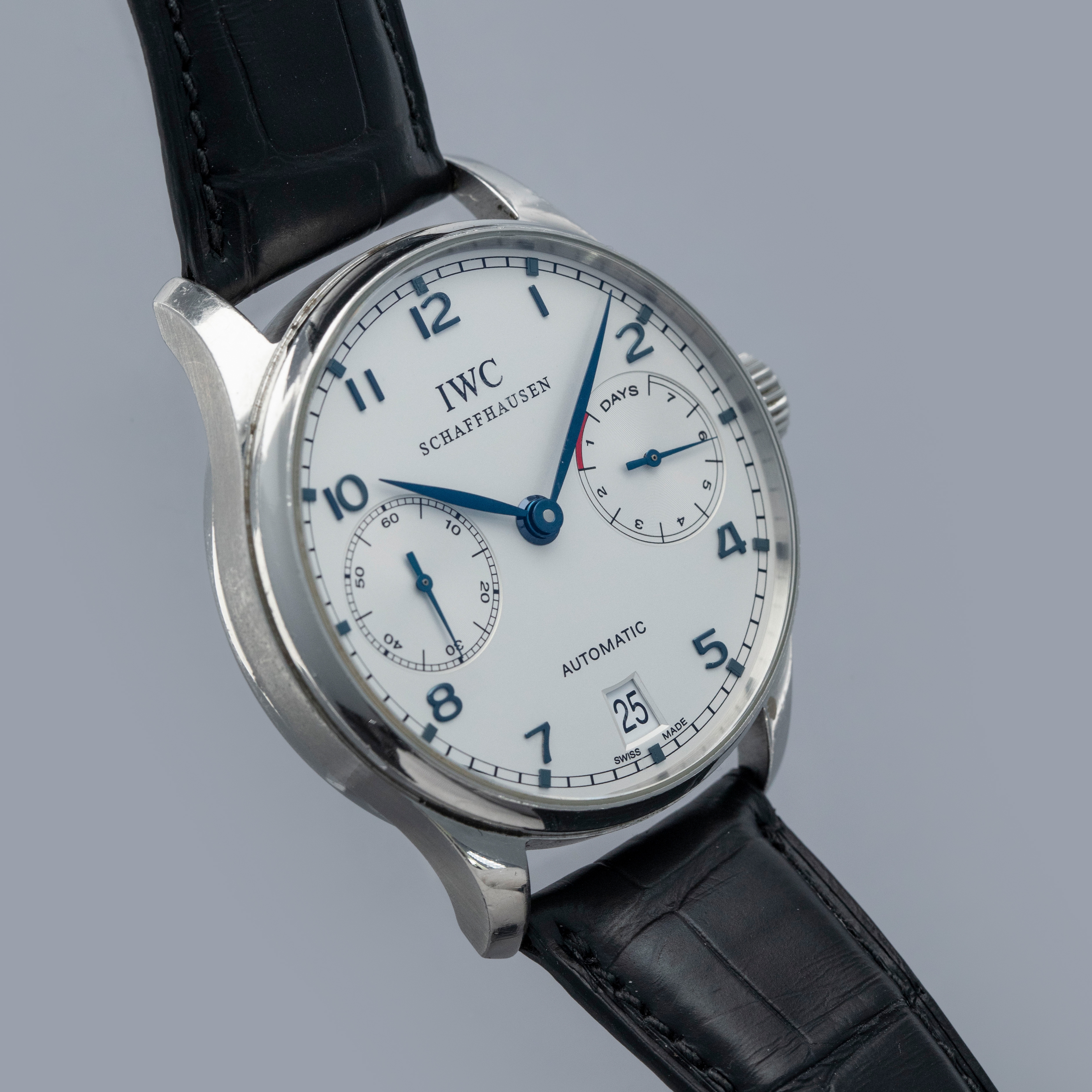 A seemingly age-old design, the Portugieser Seven Days features a timeless stainless steel case with a thin bezel and highly polished lugs, which combine to form one of IWC's best-known aesthetics.