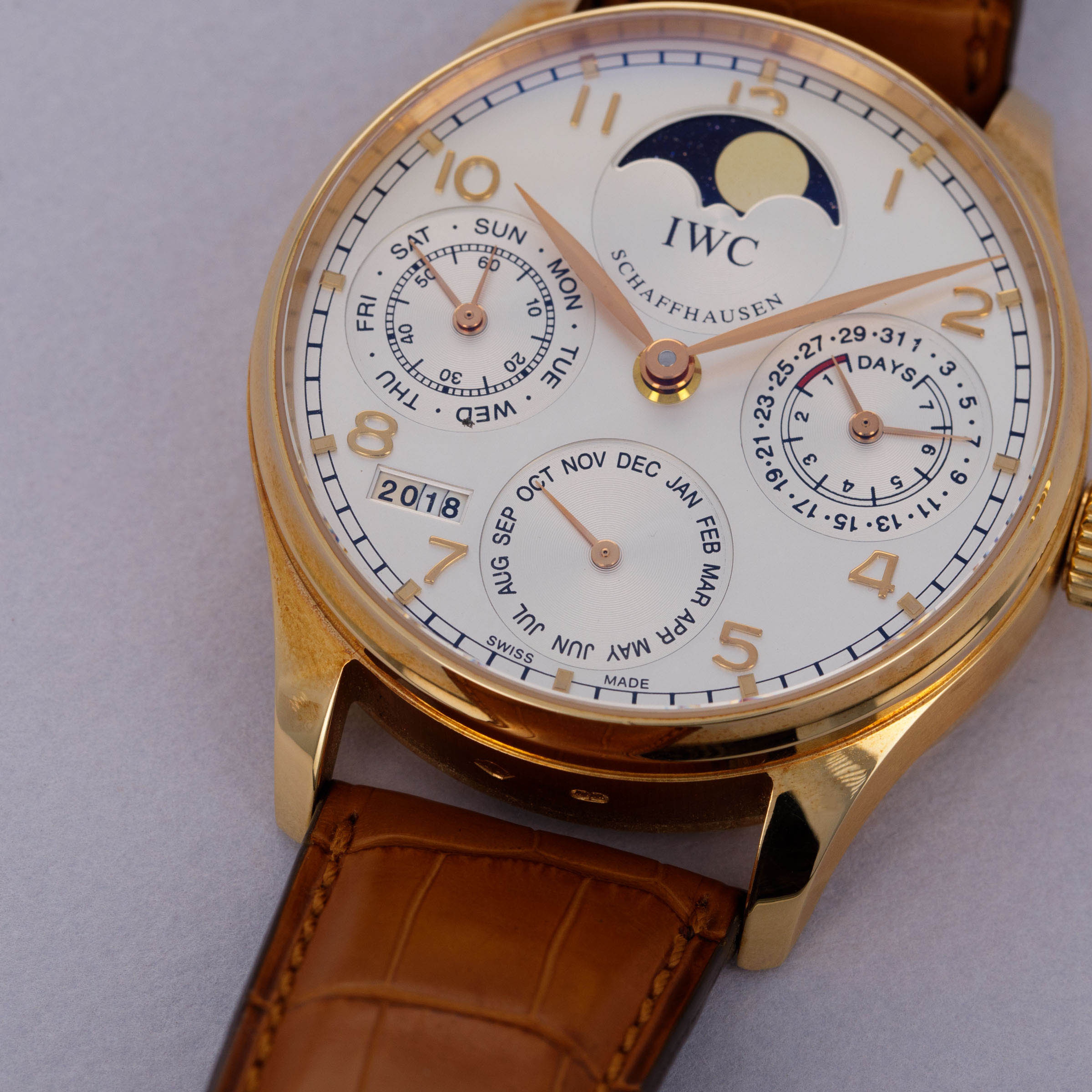 First launched in 1939, the IWC Portugieser has become an iconic piece of horological design thanks to its long and storied past as one of the first "big watches" to make it to market. Forging a reputation as a large and robust timepiece that straddles the line between a sports watch and dress watch, it features a large case, vintage-style pump pushers in its chronograph variants, immensely legible Arabic numerals, and clear subdials – all elements that combine to create an aesthetic that is timeless as IWC remain rooted to the collection’s original design brief. Relaunched in 1993, the Portugieser became an immensely popular collection within IWC’s arsenal, and so it was expanded upon to include then perpetual calendar variant that we have here, in 2006. Offered here, we have an 18kt rose gold silver dial variant of the Portugieser Perpetual Calendar ref. IW502213 with charming rose gold applied Arabic numerals and matching rose gold hands that contrast their bright backdrop with a stunningly luxurious effect, much in keeping with IWC’s theme as a luxury watchmaker. Featuring a quartet of subdials at 3 , 6, 9 and 12 o’clock for each of its displays, the ref. IW502213 features a bevy of information such as the day, month, date, leap year, a power reserve indicator and even the year itself.