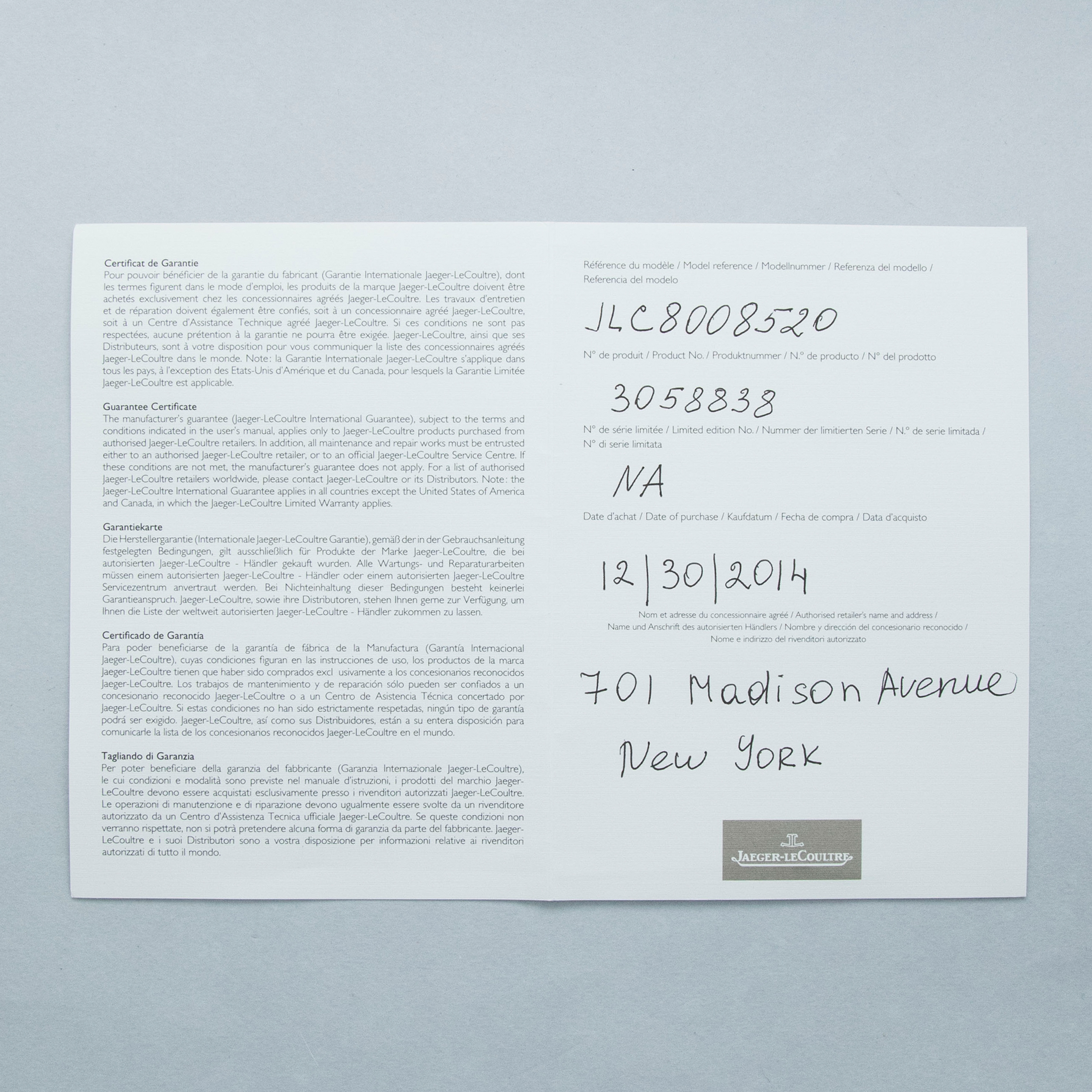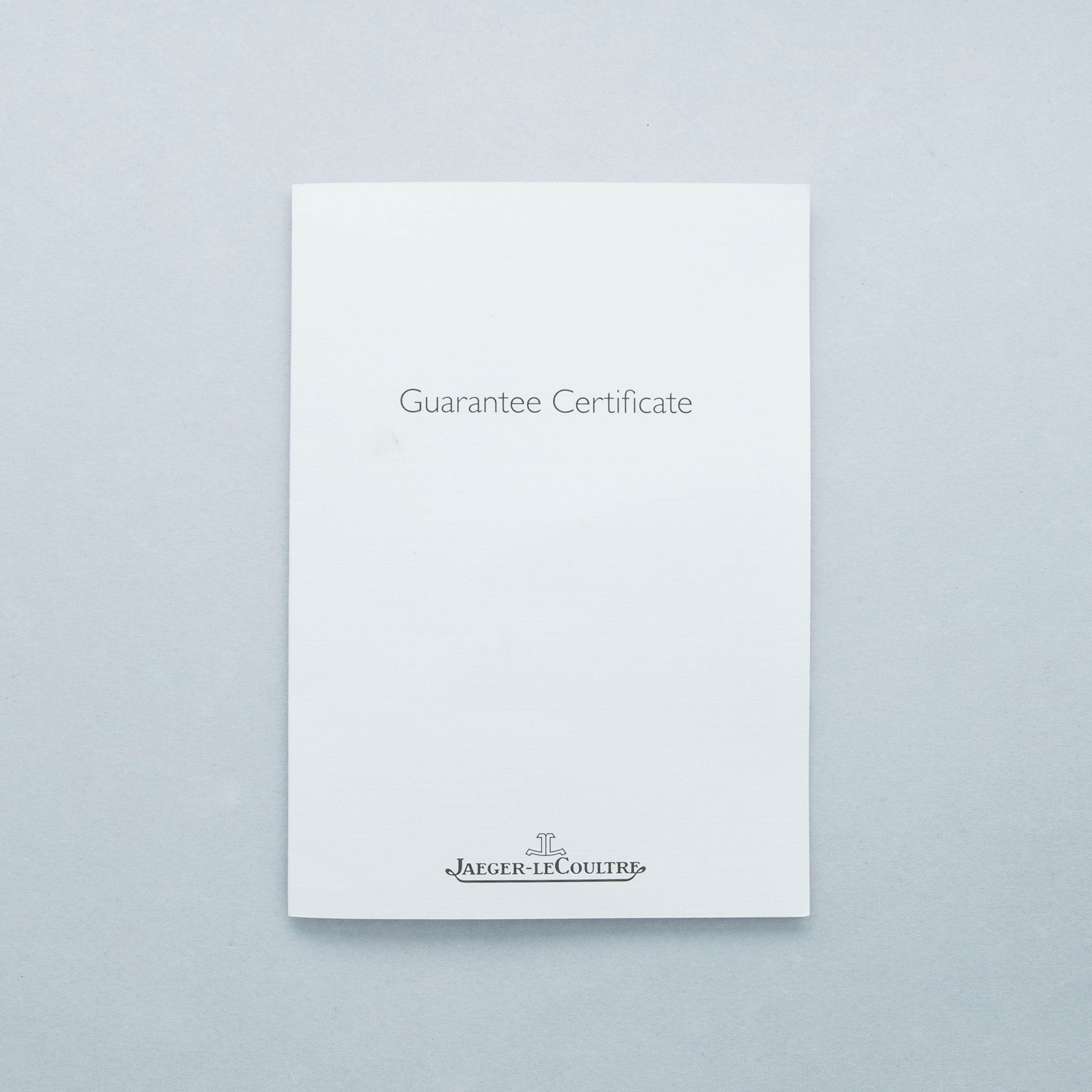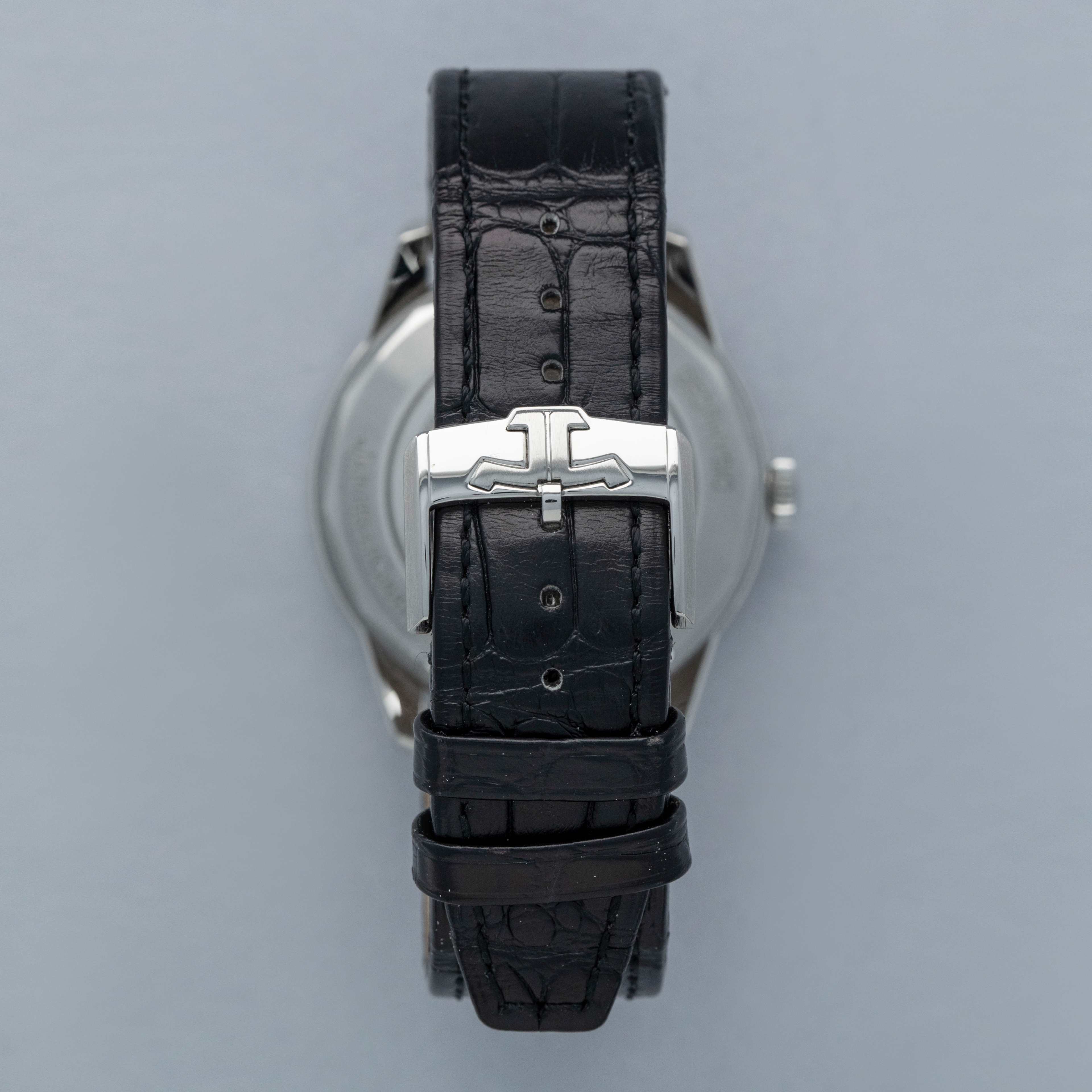 The watch is in overall excellent condition. The steel case has some light marks, as does the case back, which retains very crisp engravings and detailing. The polished bezel shows some light scratches and a couple of small nicks. The dial is excellent, with only minor damage visible in the “A” and “D” of “SWISS MADE” at the lower edge. The hands are very clean. The watch is fitted with a black Jaeger-LeCoultre alligator strap and a steel pin buckle, both in excellent condition. Comes complete with box and papers, warranty, booklets, loupe, and tag.