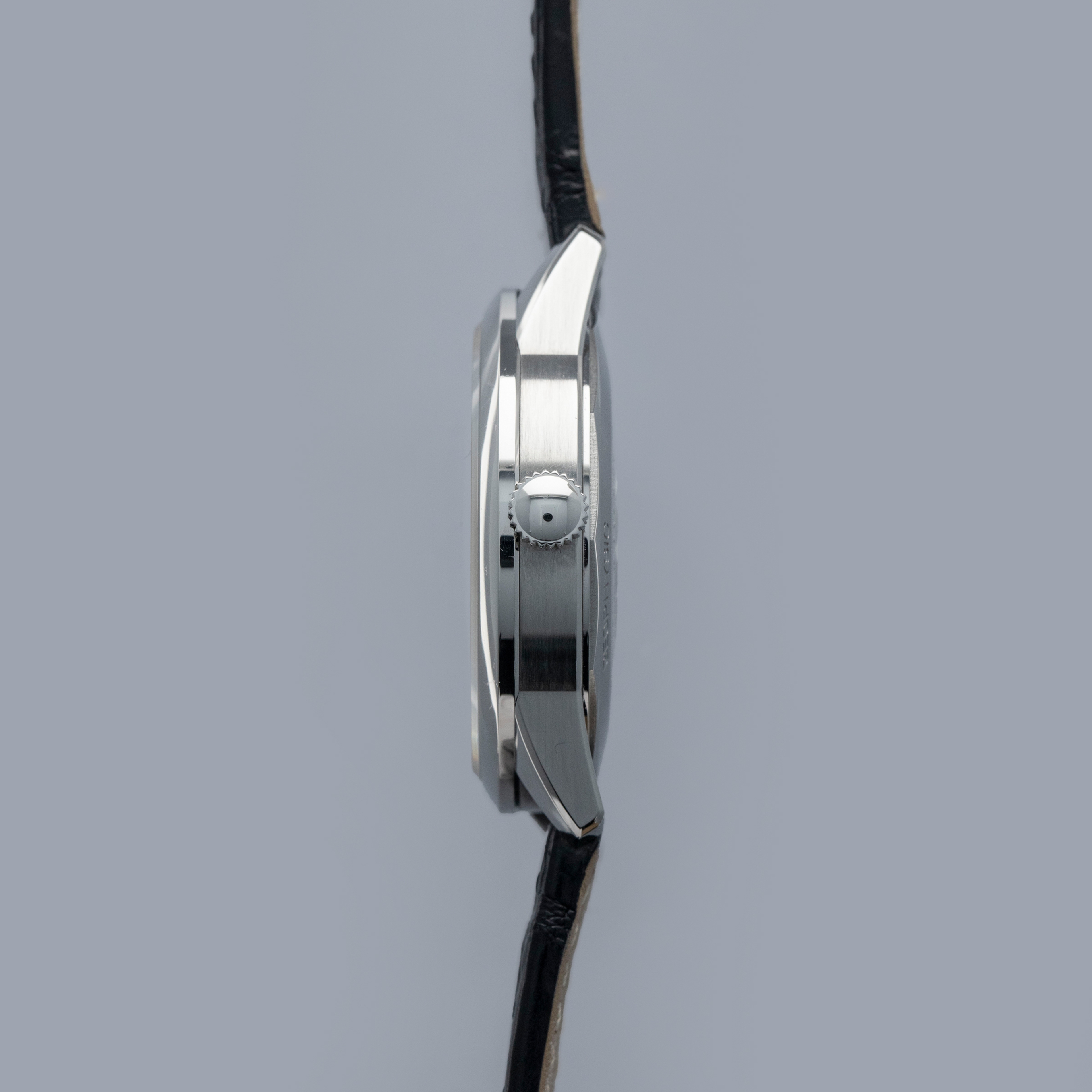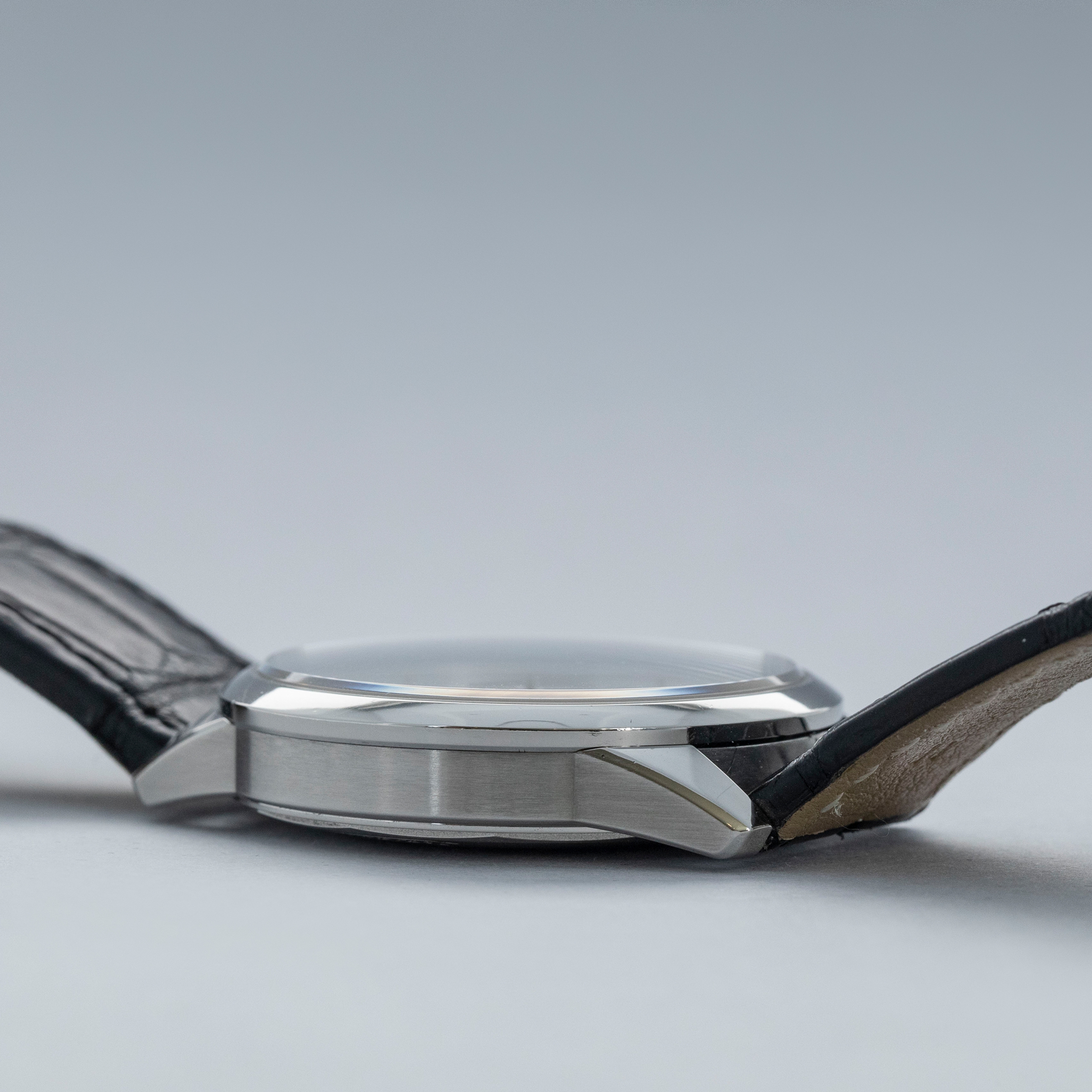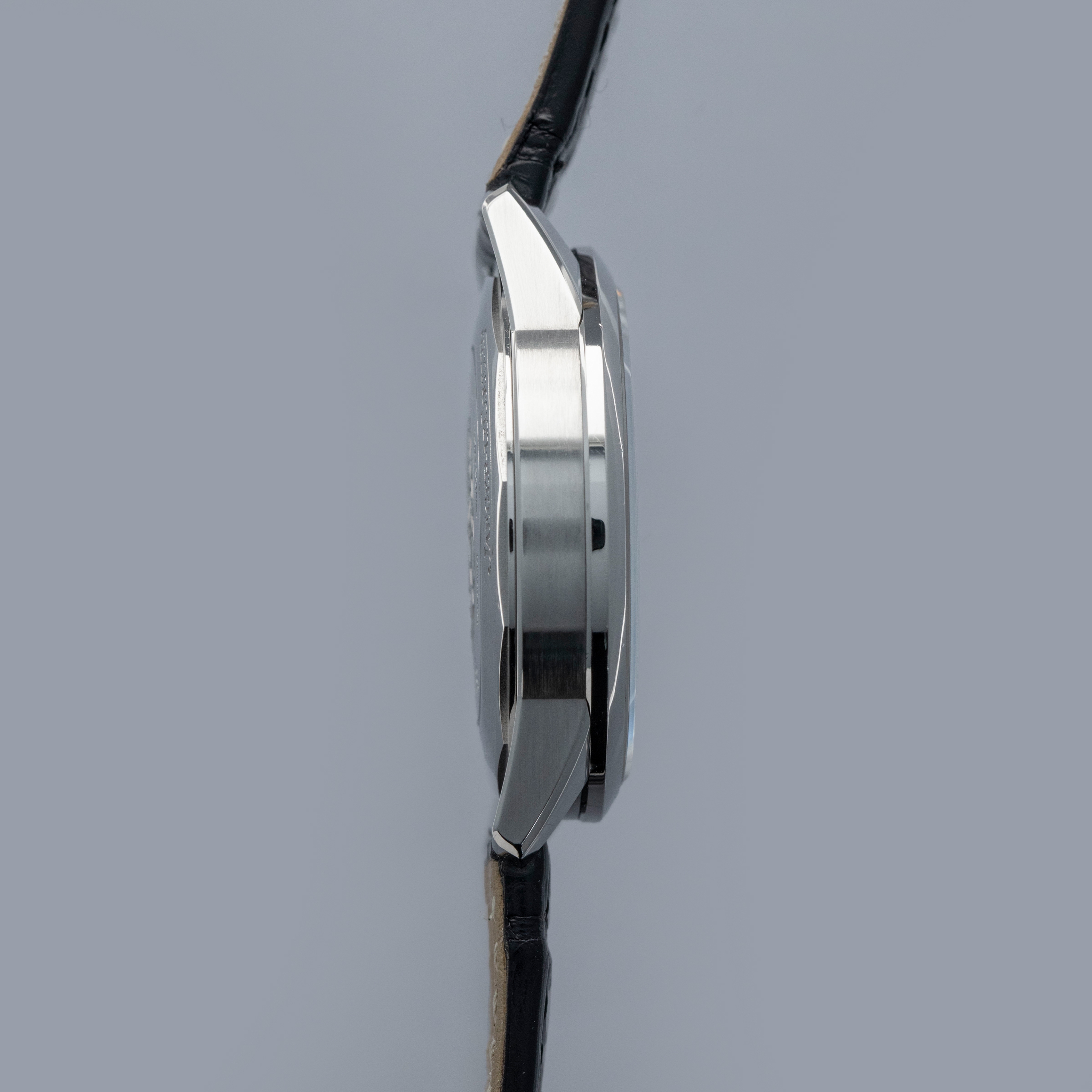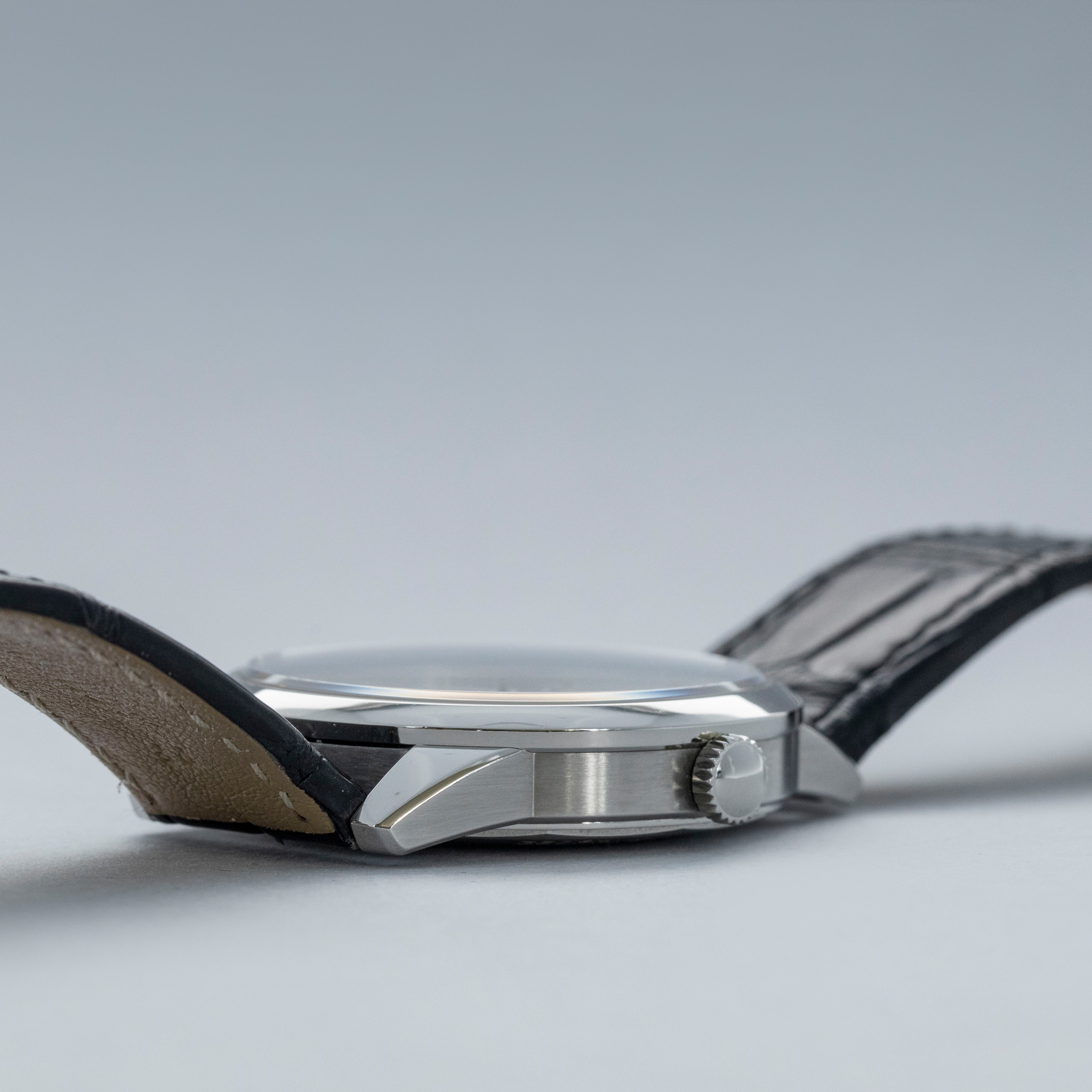 The watch is in overall excellent condition. The steel case has some light marks, as does the case back, which retains very crisp engravings and detailing. The polished bezel shows some light scratches and a couple of small nicks. The dial is excellent, with only minor damage visible in the “A” and “D” of “SWISS MADE” at the lower edge. The hands are very clean. The watch is fitted with a black Jaeger-LeCoultre alligator strap and a steel pin buckle, both in excellent condition. Comes complete with box and papers, warranty, booklets, loupe, and tag.