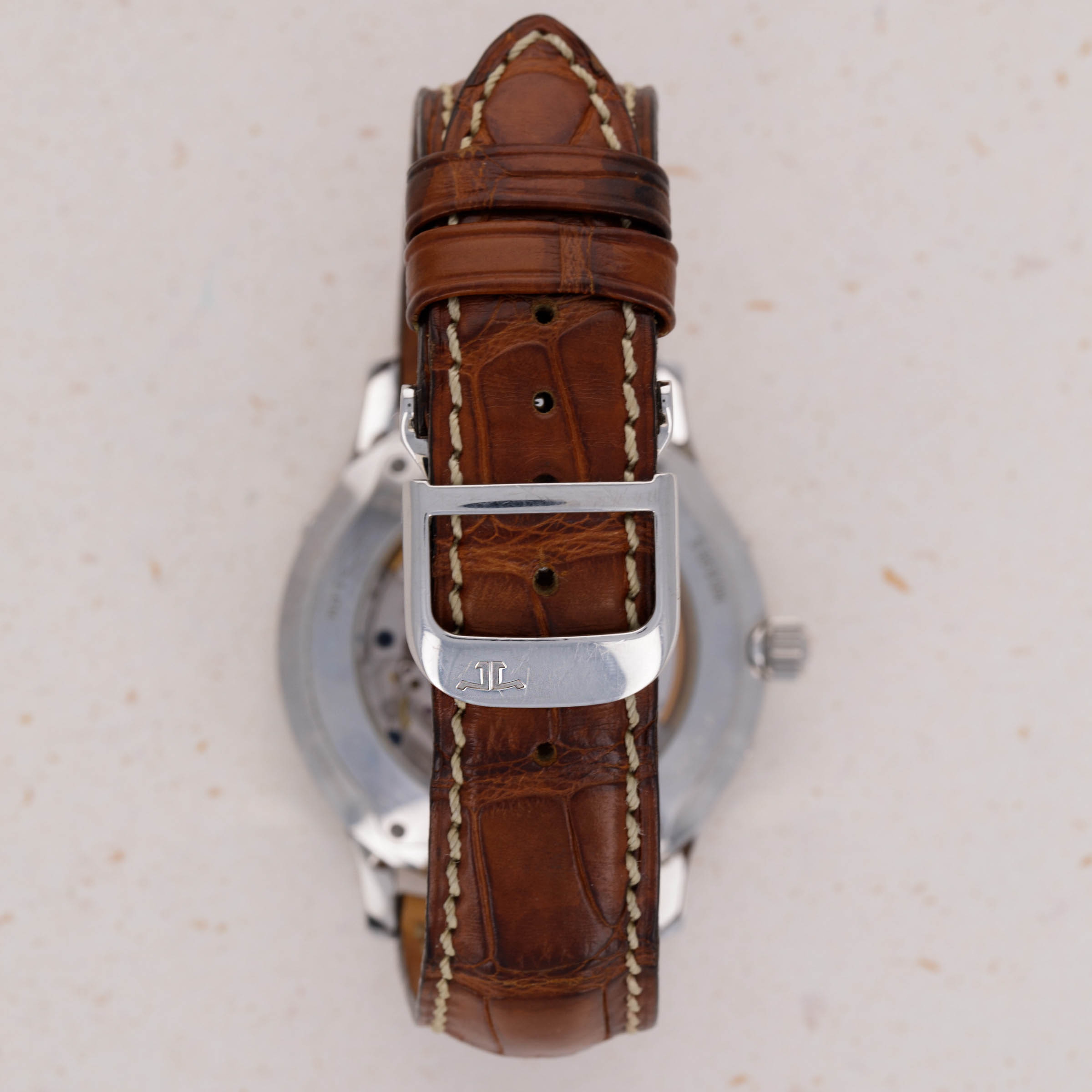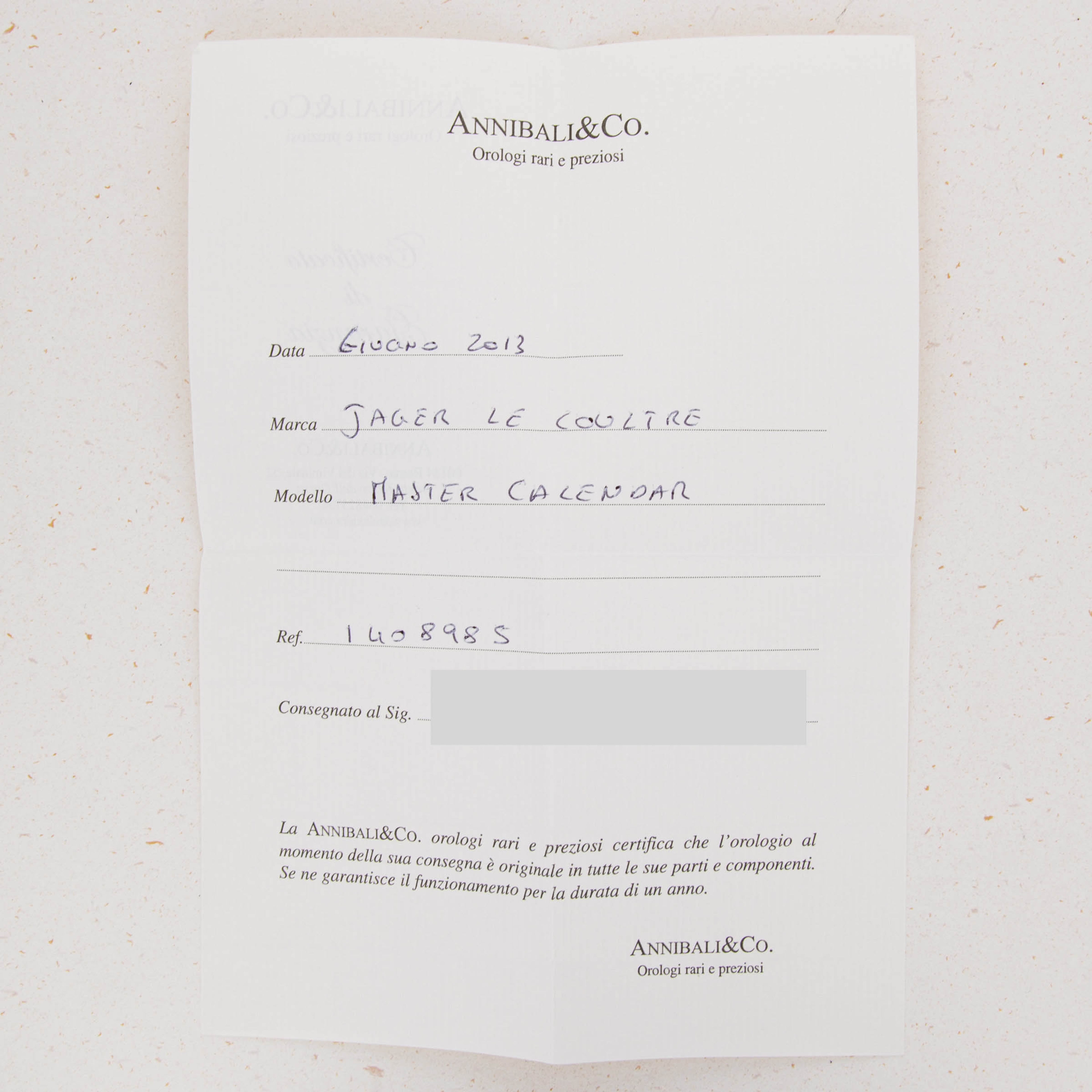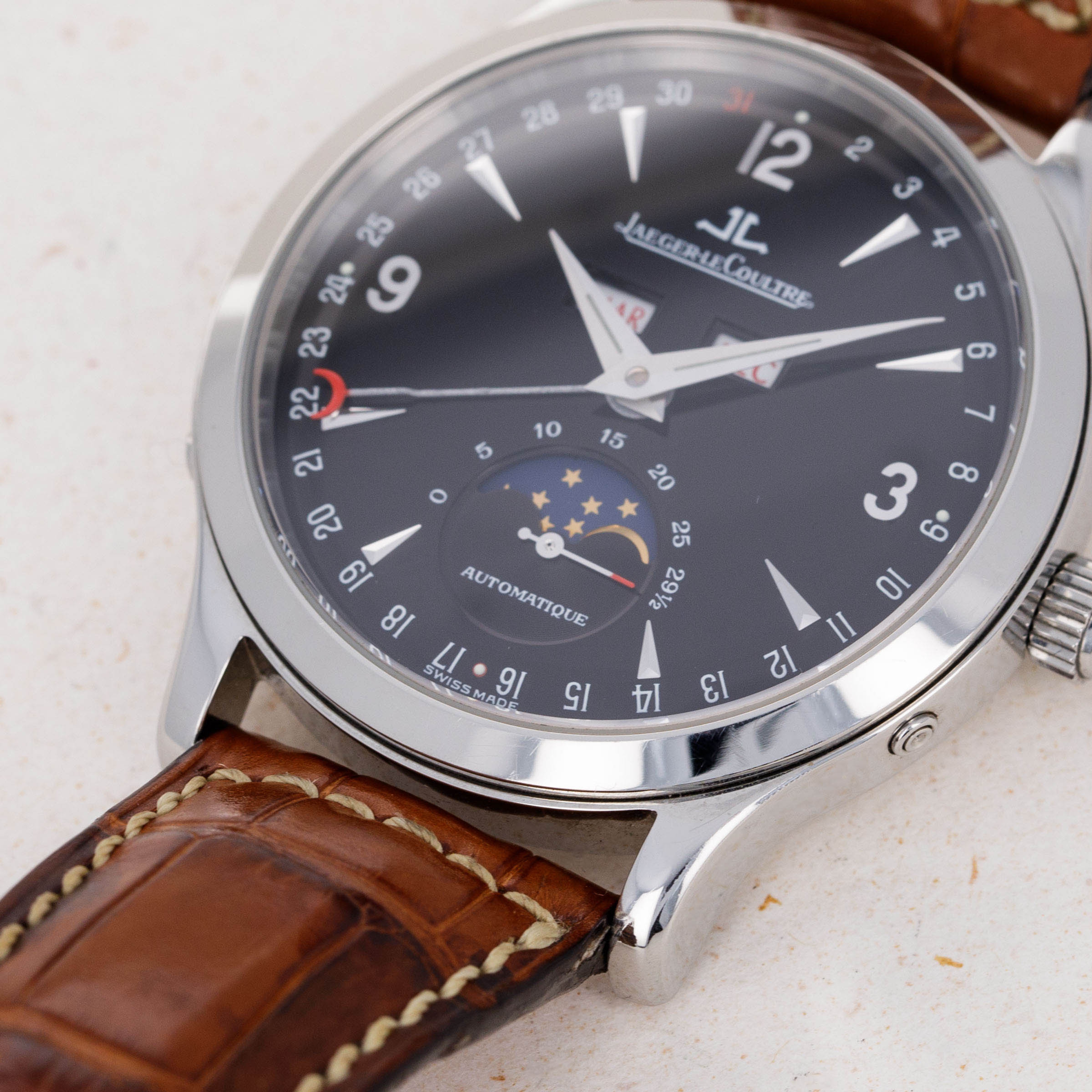 Boasting a beautiful black dial to stand out against its stainless steel case, this Master Calendar's display is elegant and refined everywhere you look and filled with nice details such as its red crescent-shaped pointer date hand, sharp dauphine hands or tasteful applied indices and numerals.
