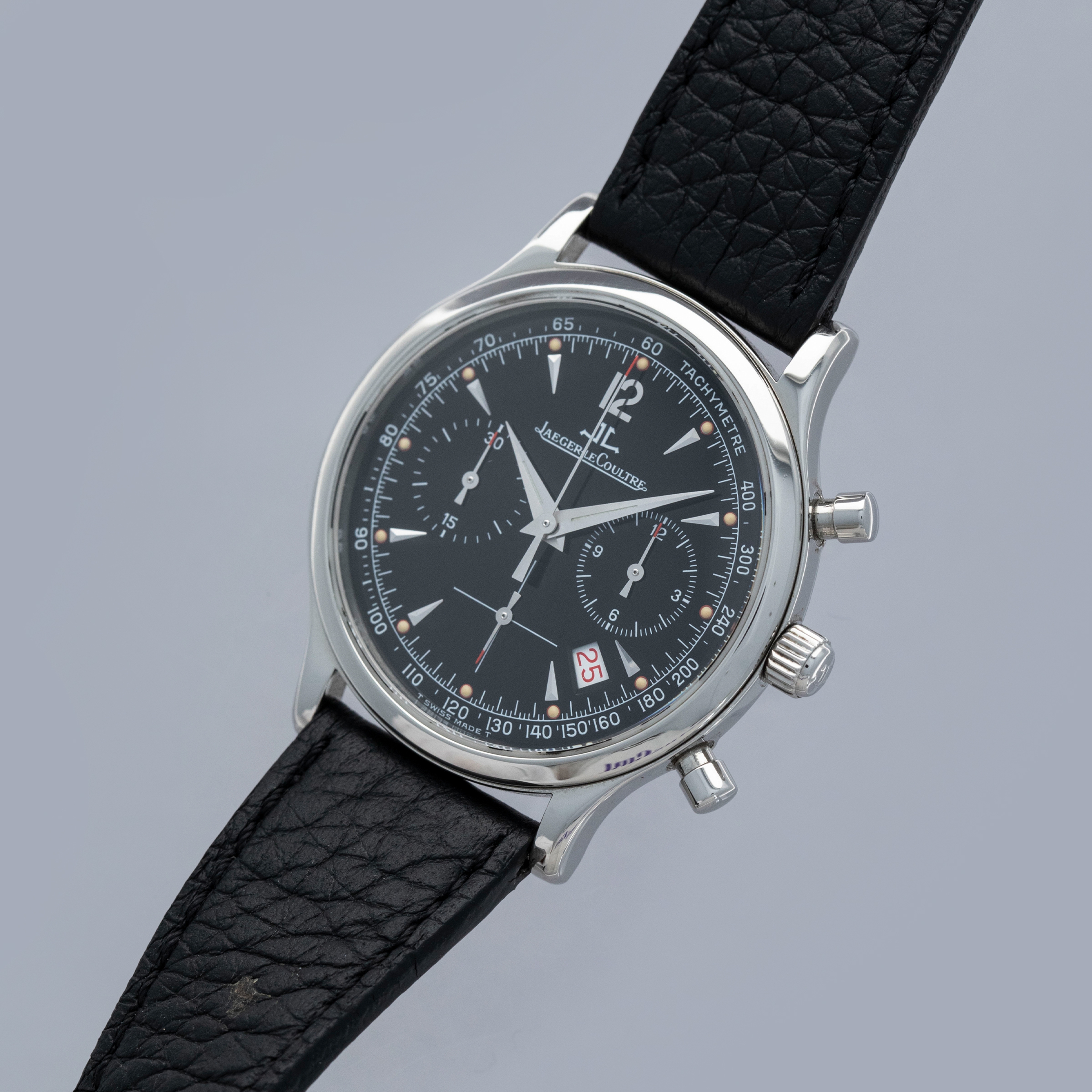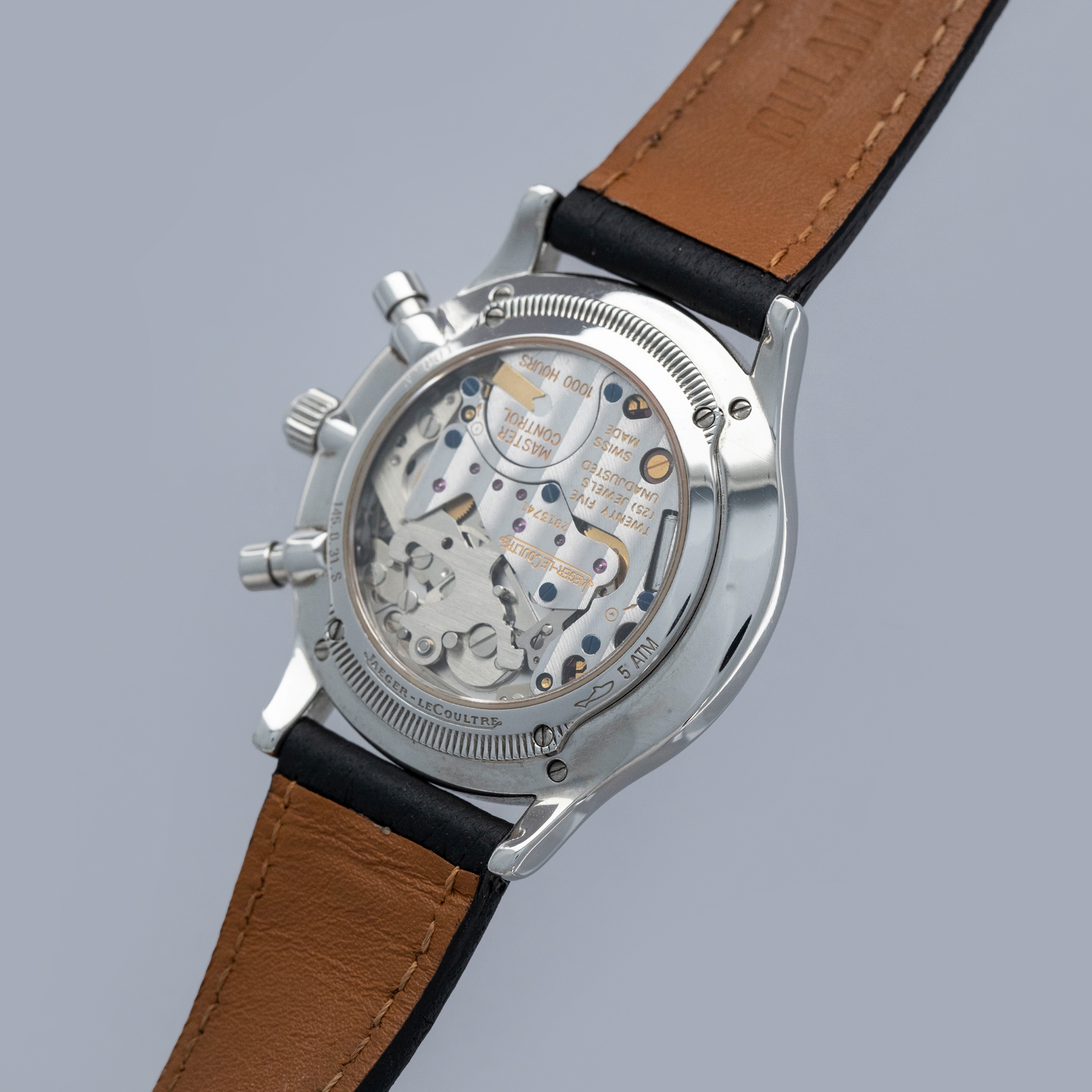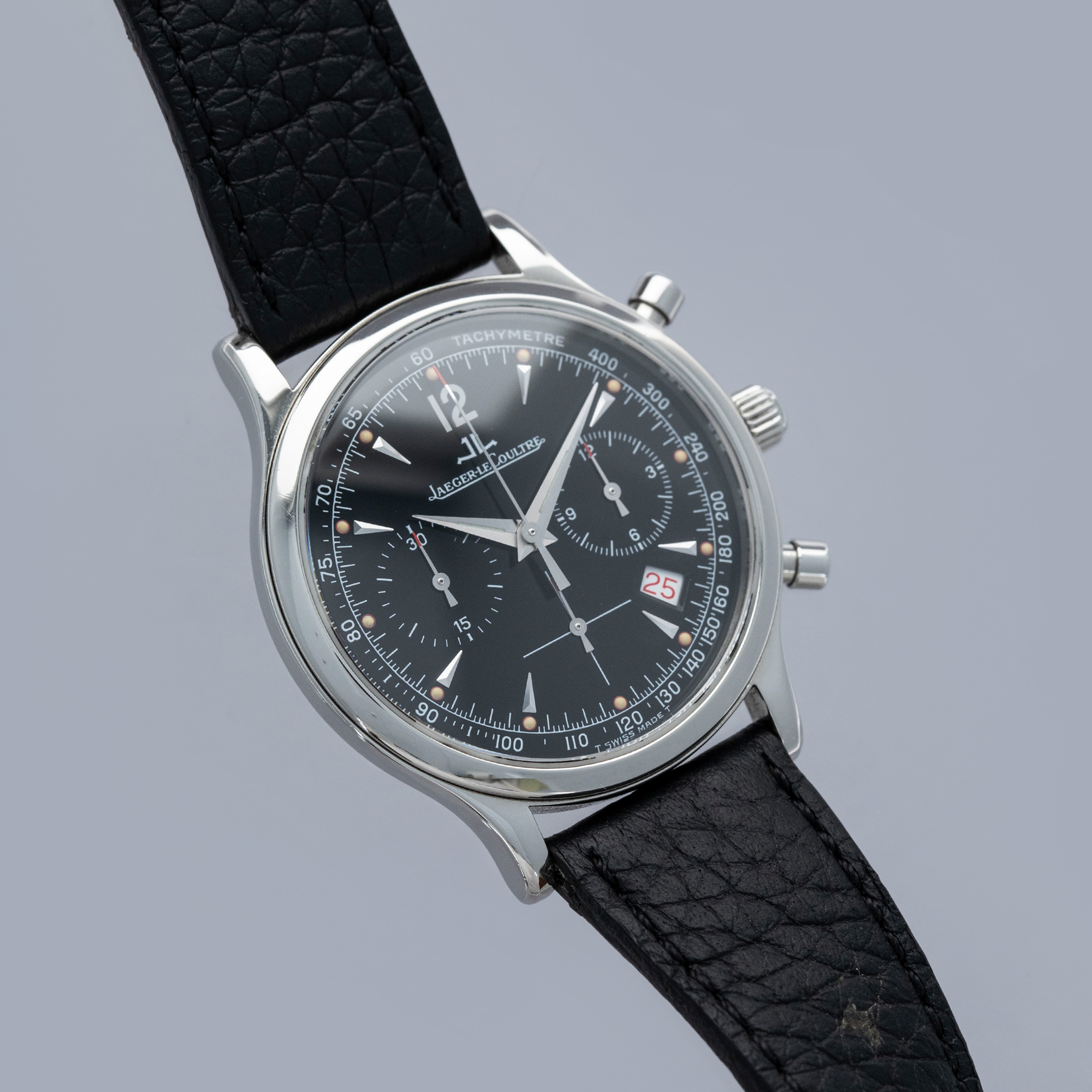 The watch is in overall excellent condition. The steel case has light scratches on the polished sections. The back of the case and the edge of the display case back show signs of wear, with light scratches and wear to the screw heads. The dial and hands are in near-mint condition. The watch is fitted with a black leather strap with steel pin buckle and is also accompanied by its original Jaeger-LeCoultre deployant clasp in excellent condition.