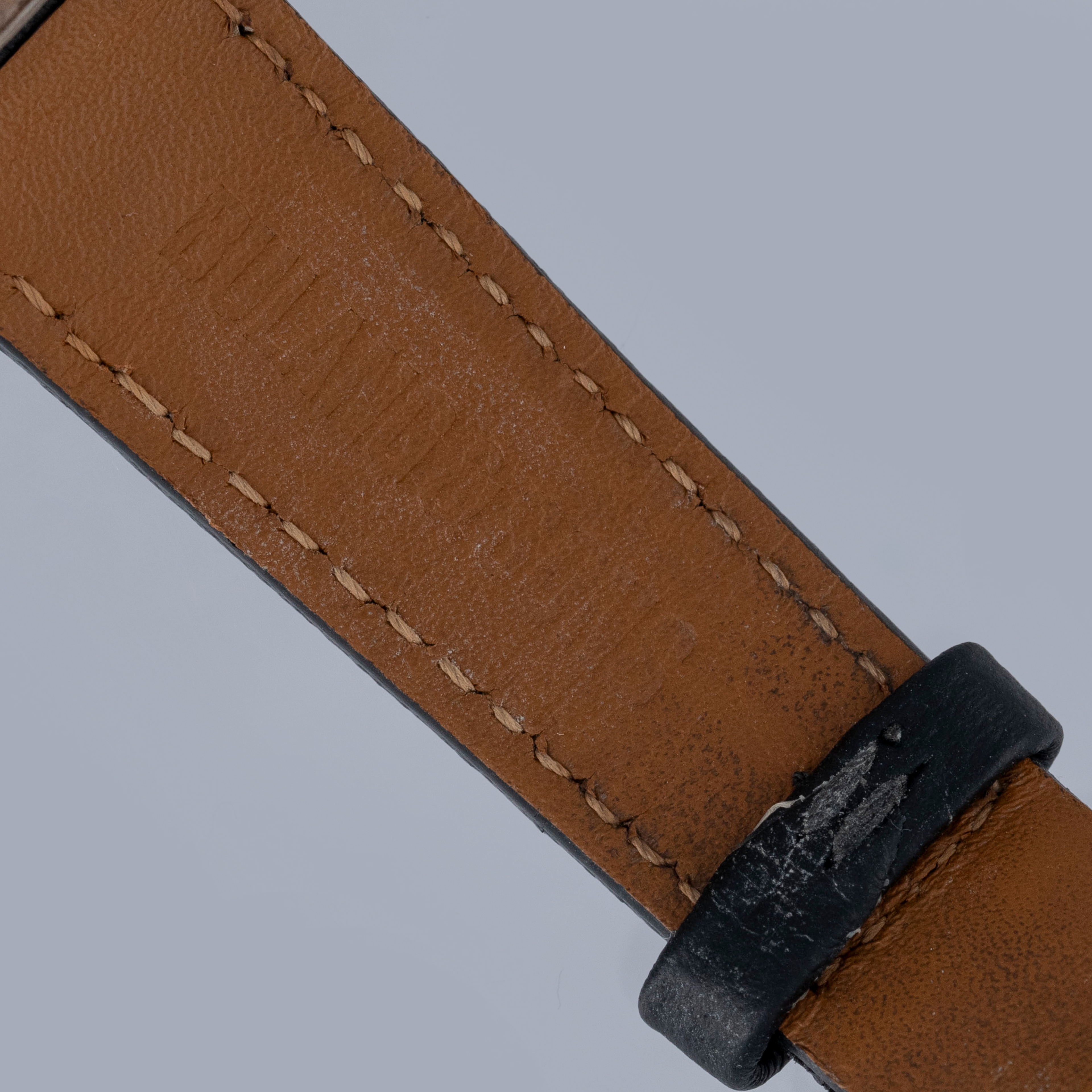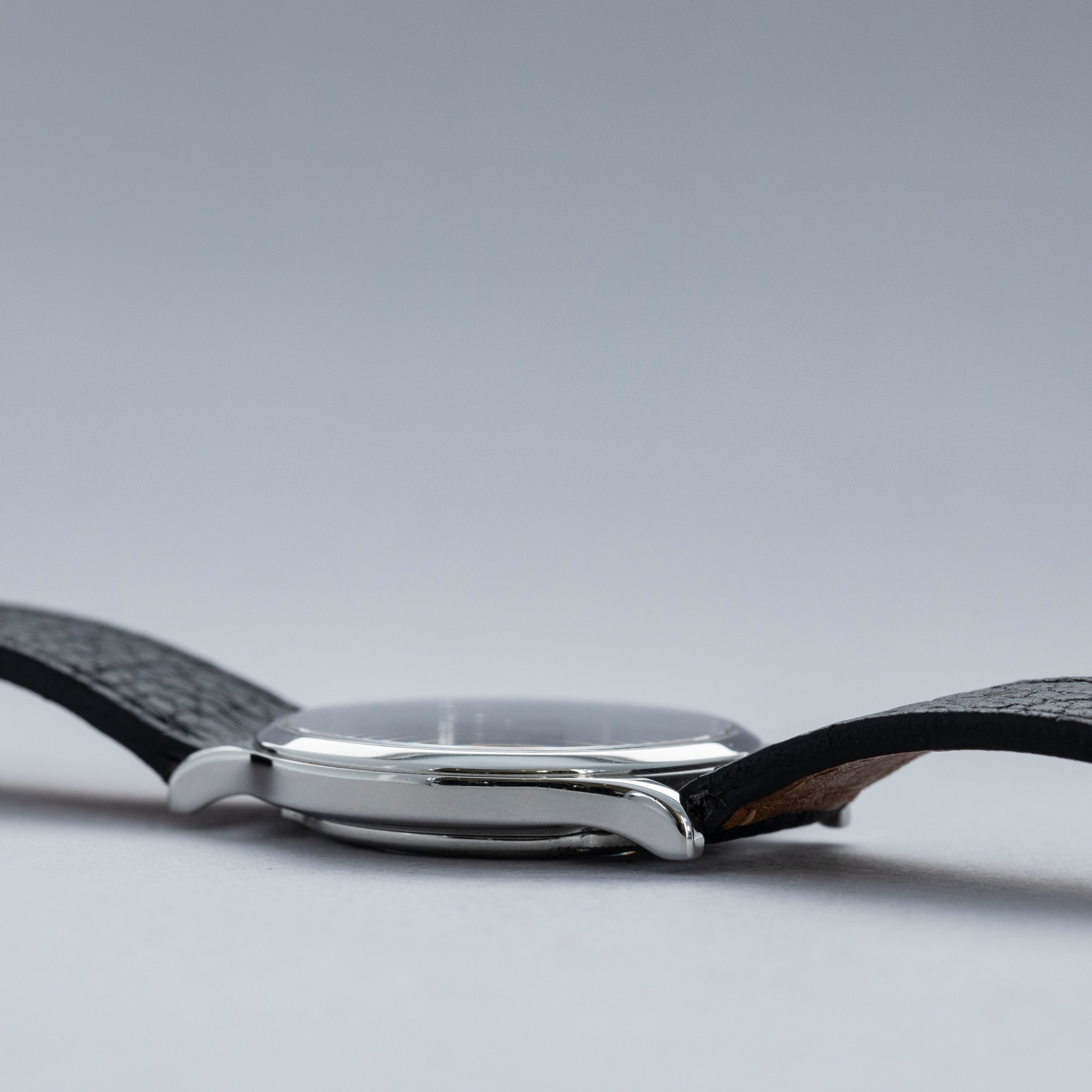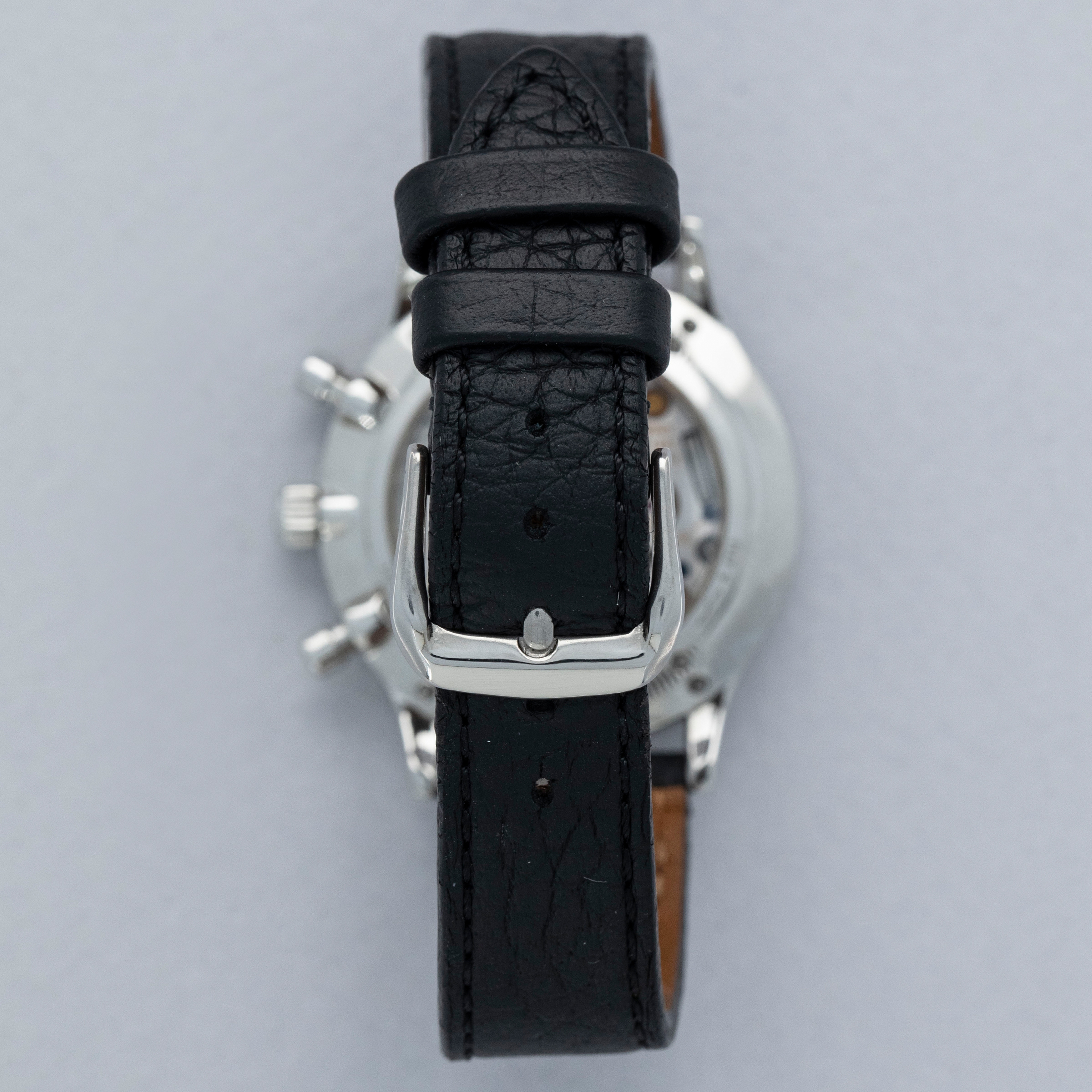 The watch is in overall excellent condition. The steel case has light scratches on the polished sections. The back of the case and the edge of the display case back show signs of wear, with light scratches and wear to the screw heads. The dial and hands are in near-mint condition. The watch is fitted with a black leather strap with steel pin buckle and is also accompanied by its original Jaeger-LeCoultre deployant clasp in excellent condition.