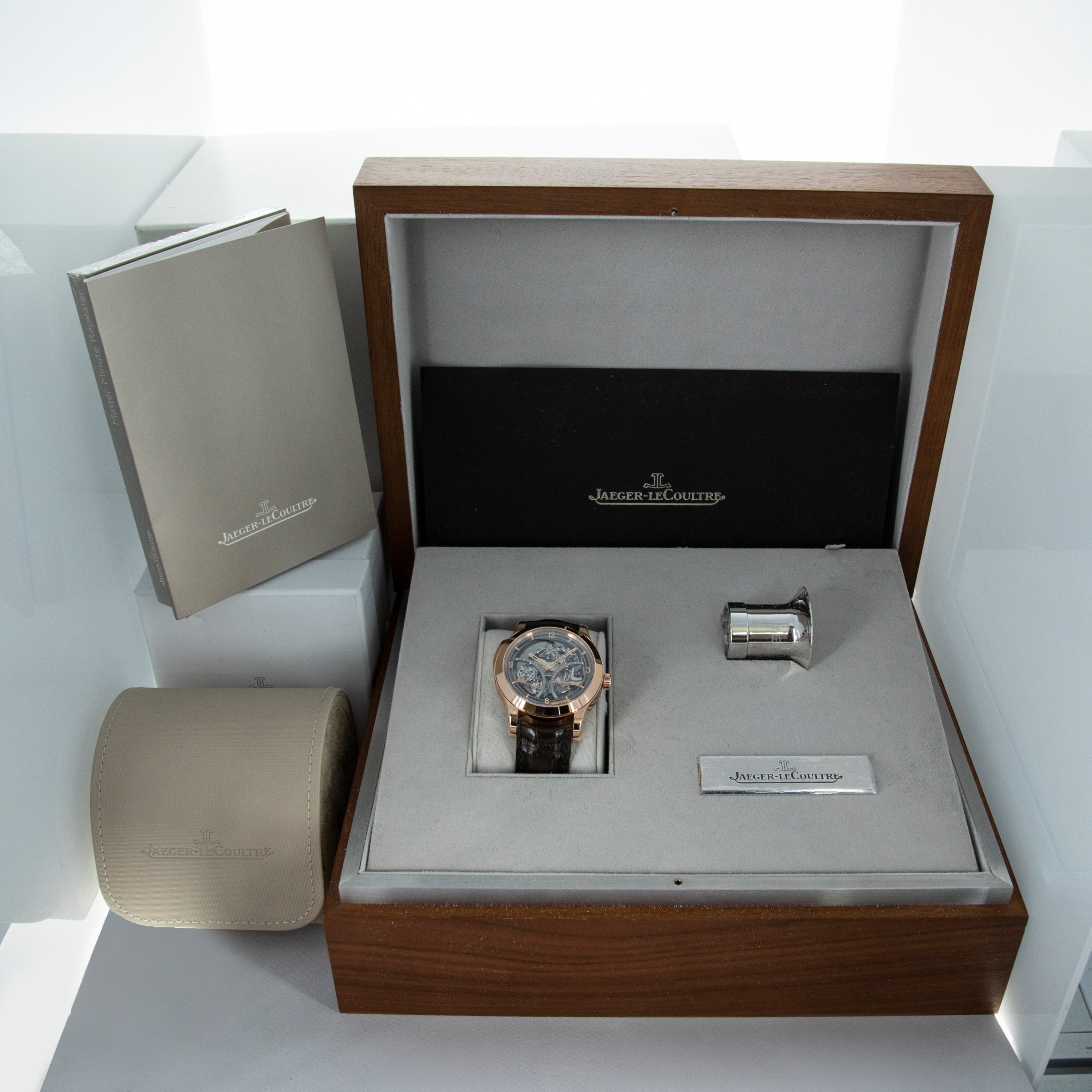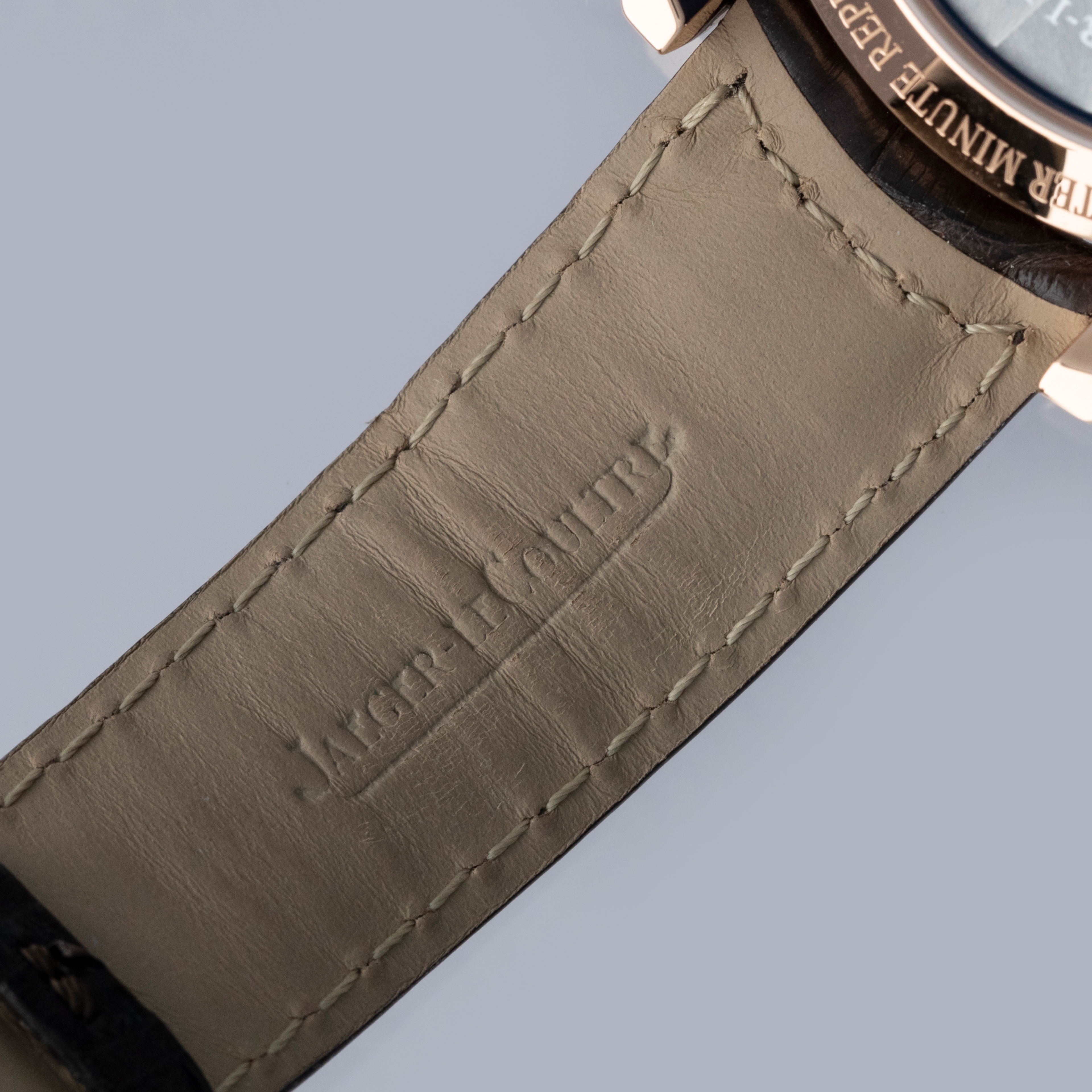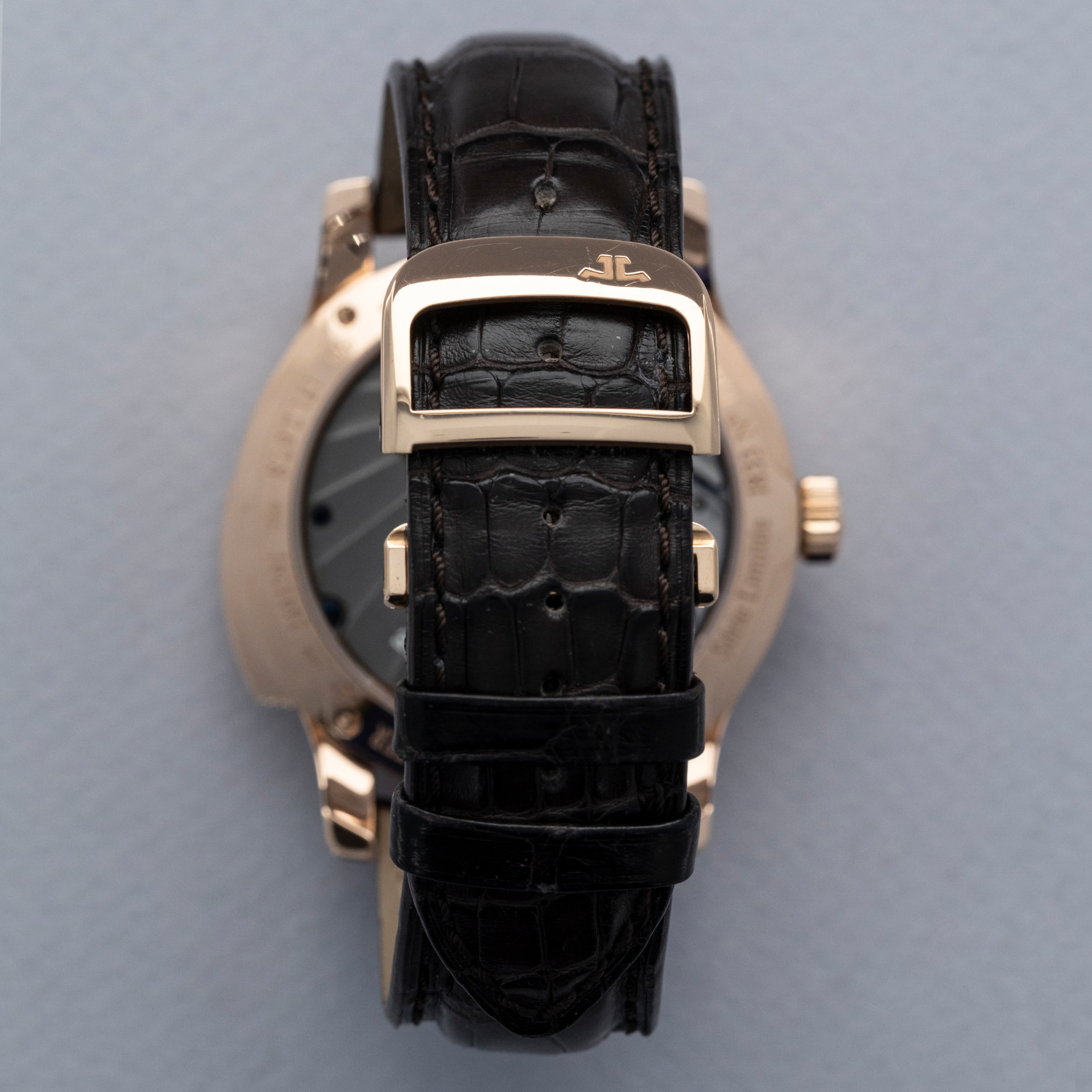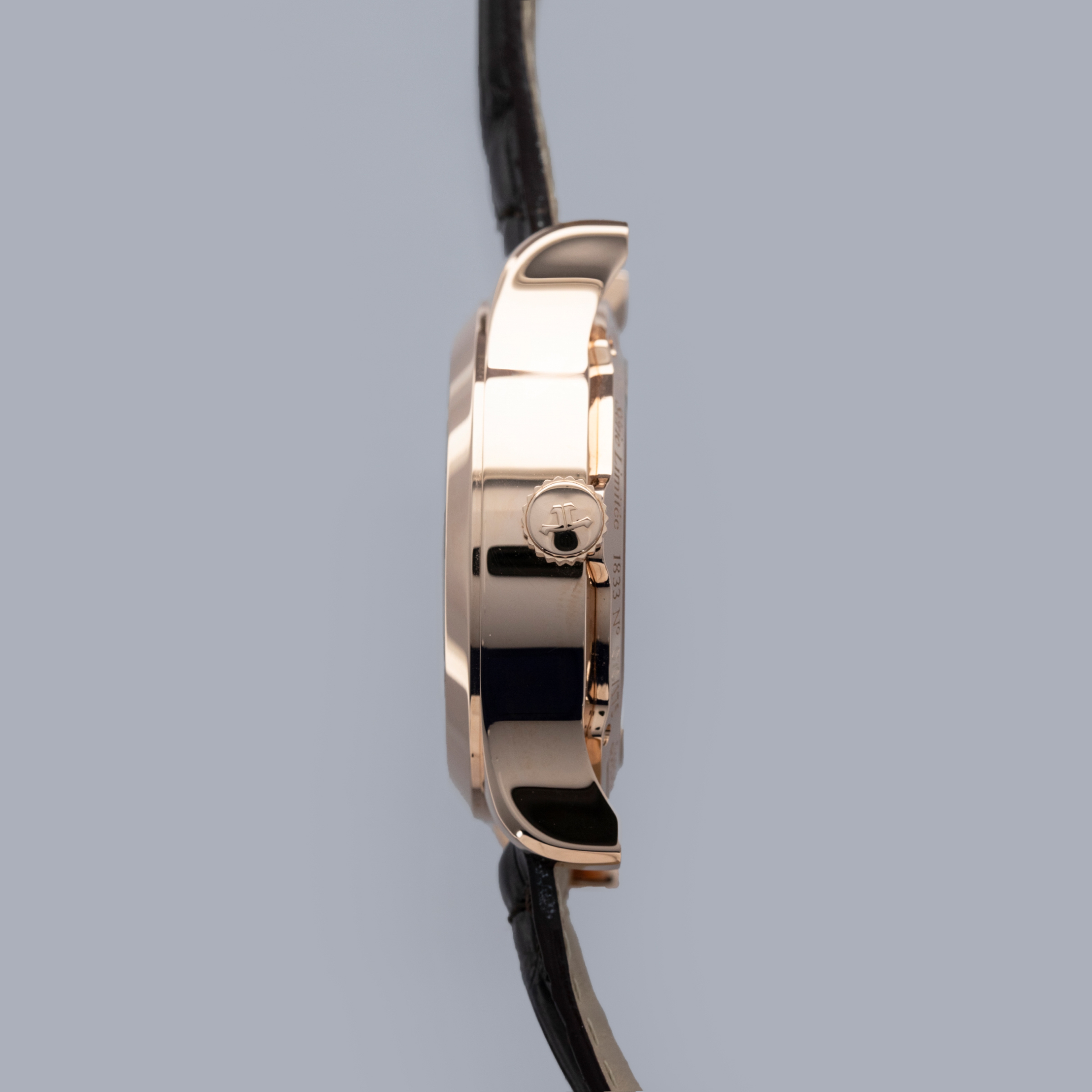 The rose gold case is in near-mint condition, with only very light marks. The display case back band features very crisp engravings. The dial is pristine. The watch is fitted with a brown JLC strap and a rose gold deployant clasp, both in near-mint condition. The watch comes with its original box and papers, including a JLC loupe, as well as a service pouch and service papers dating to 2024.