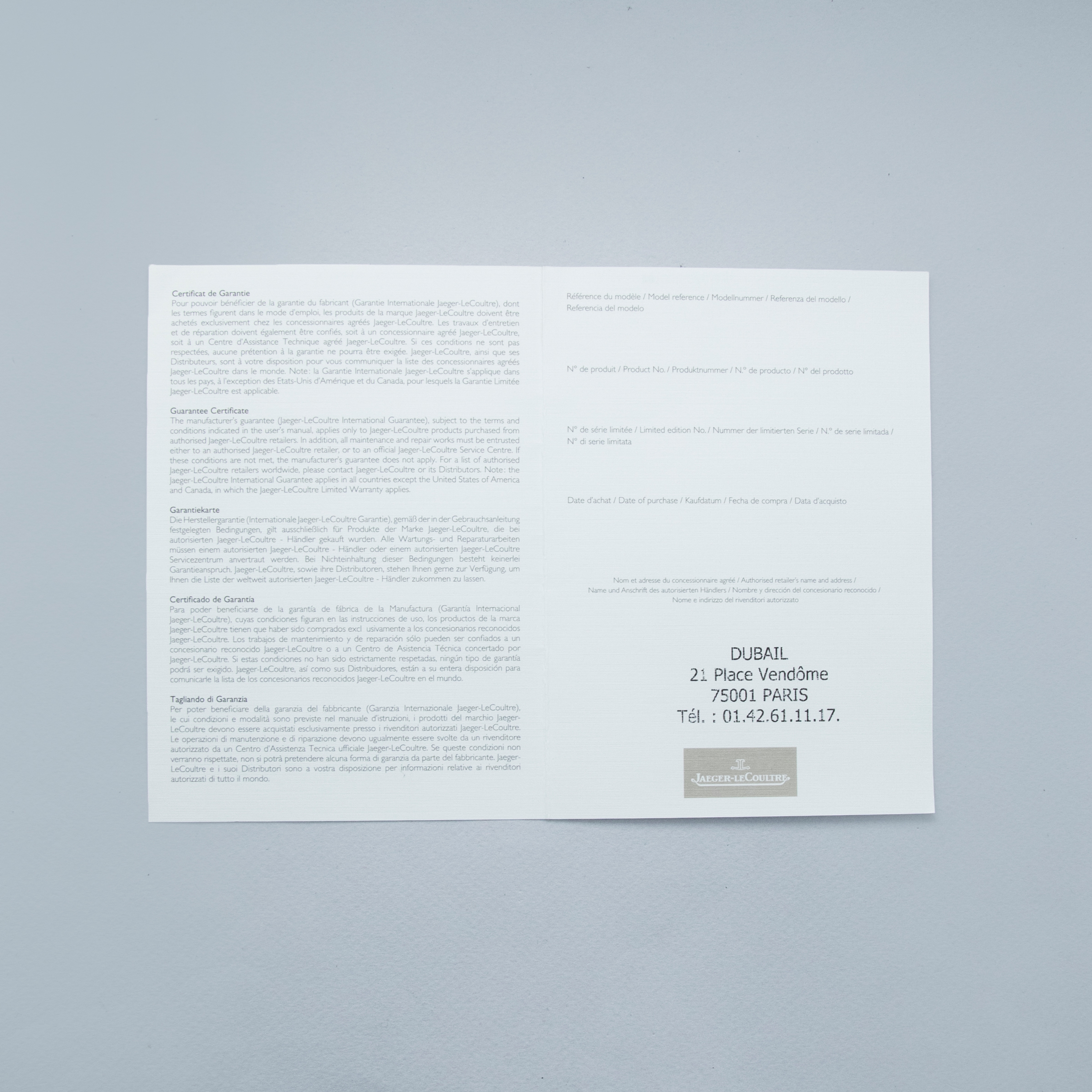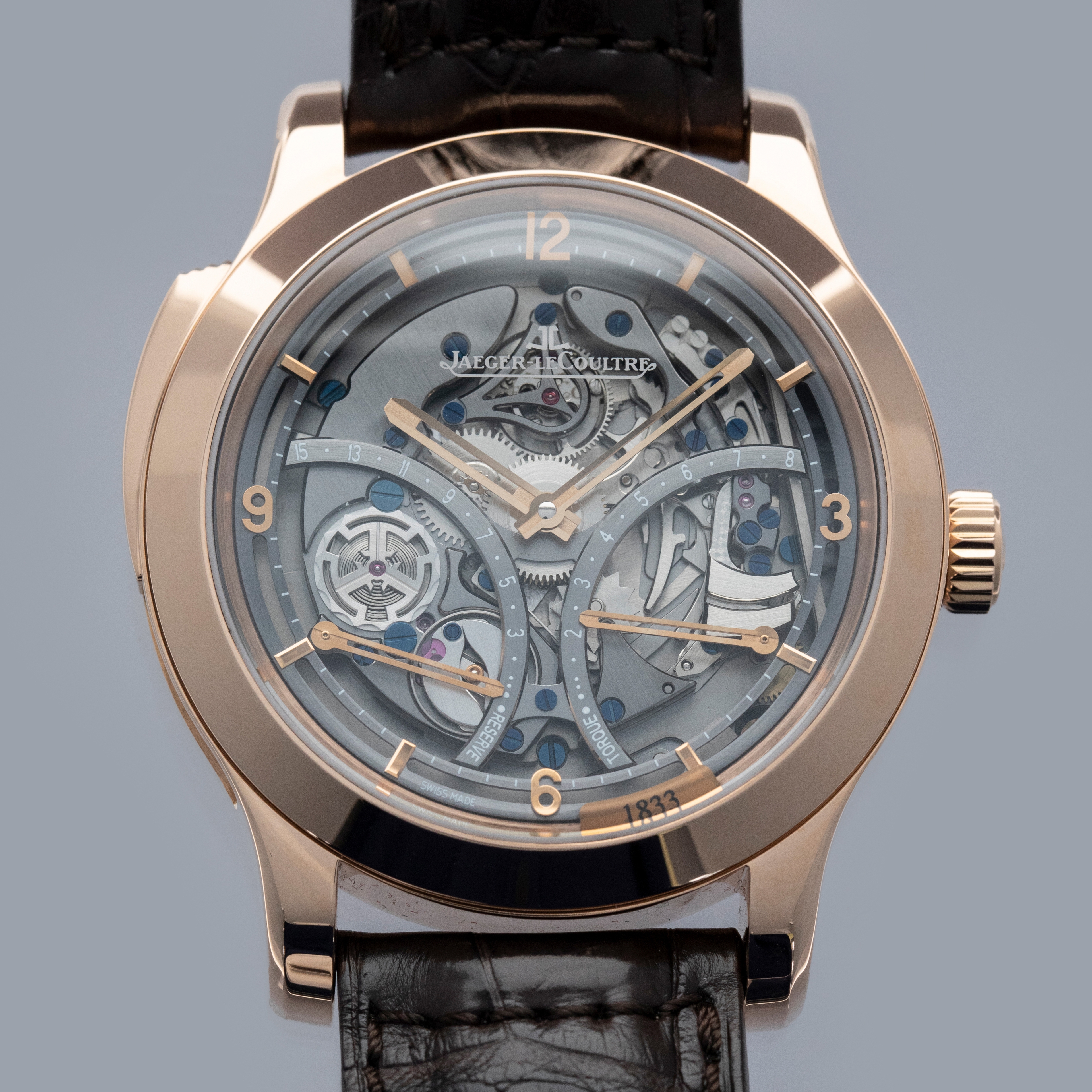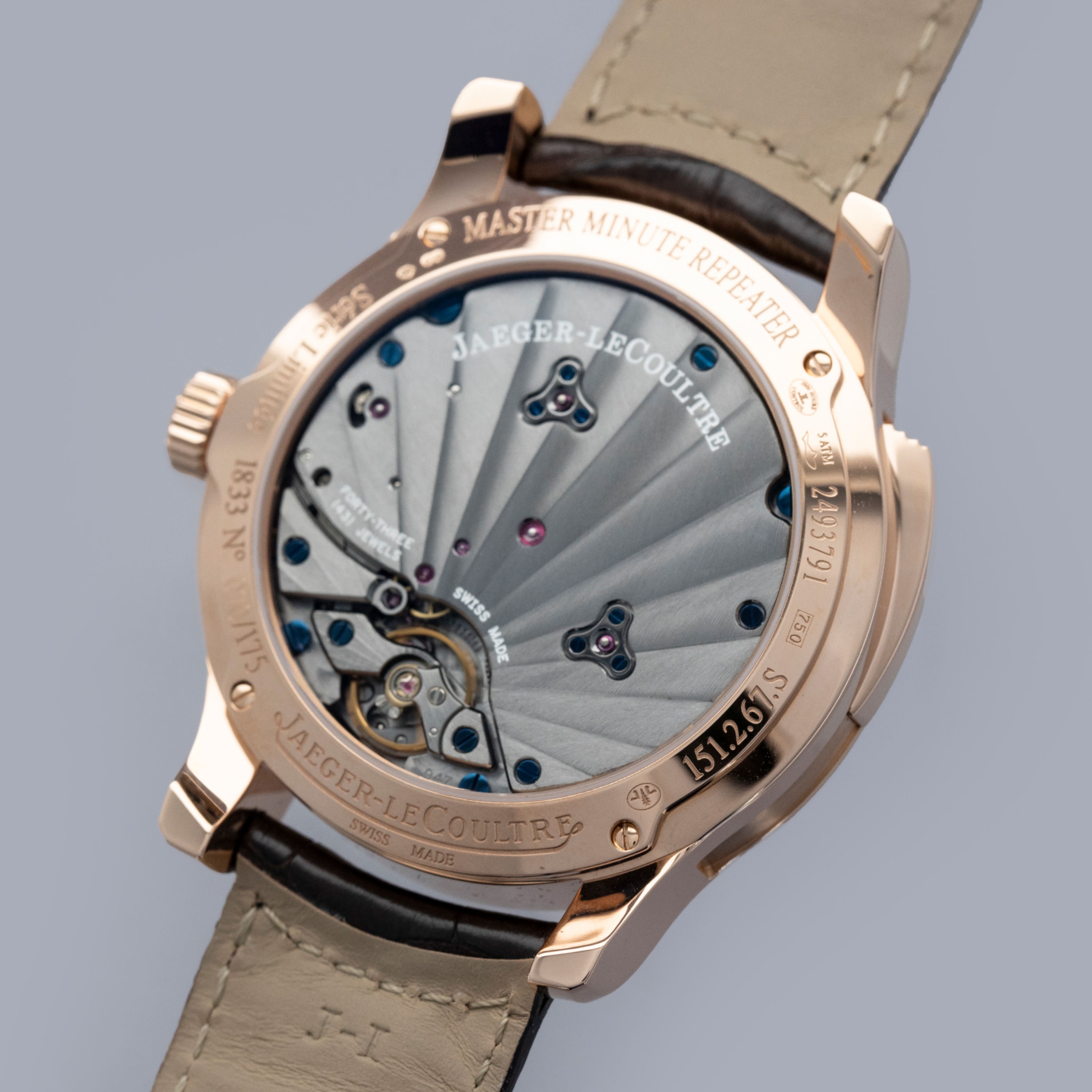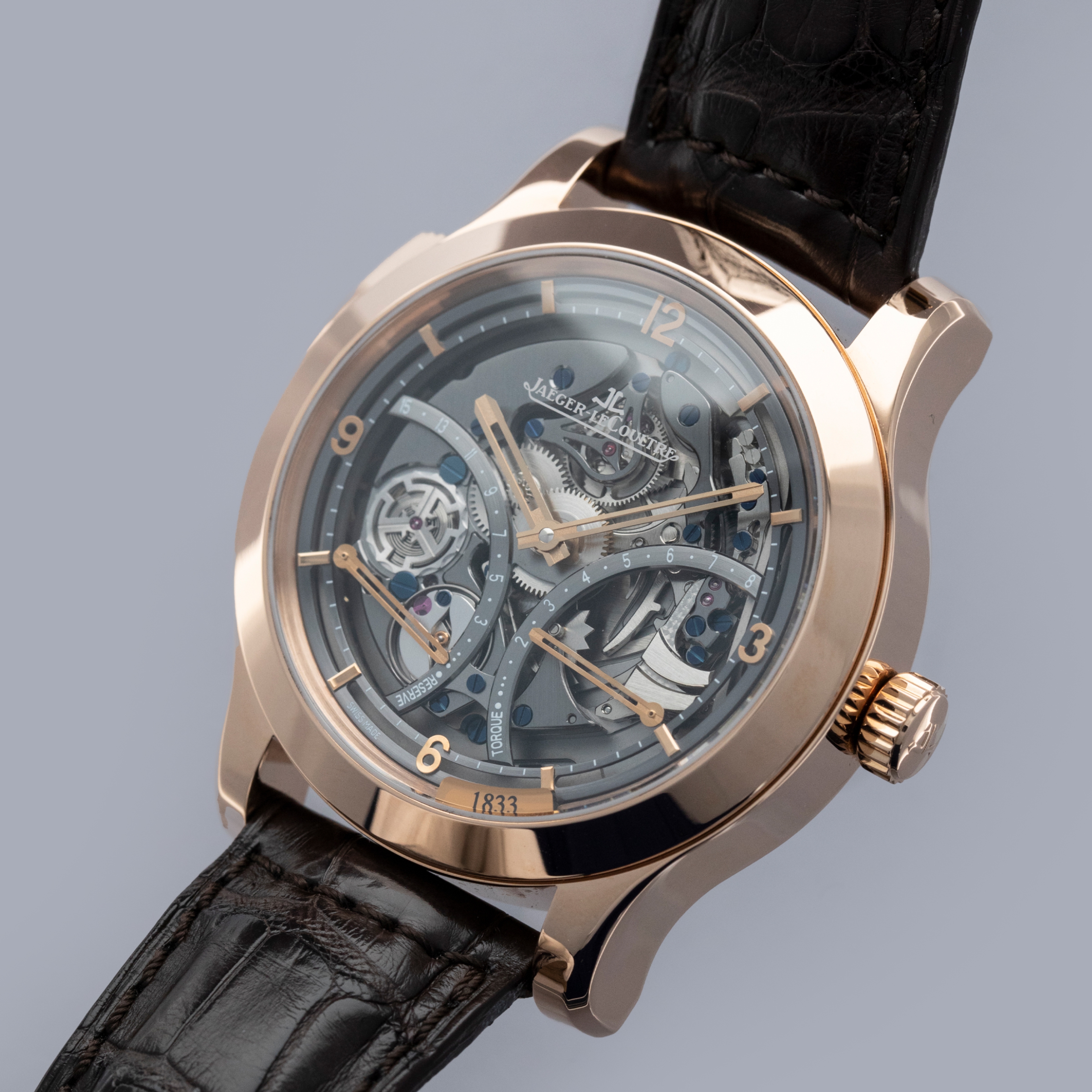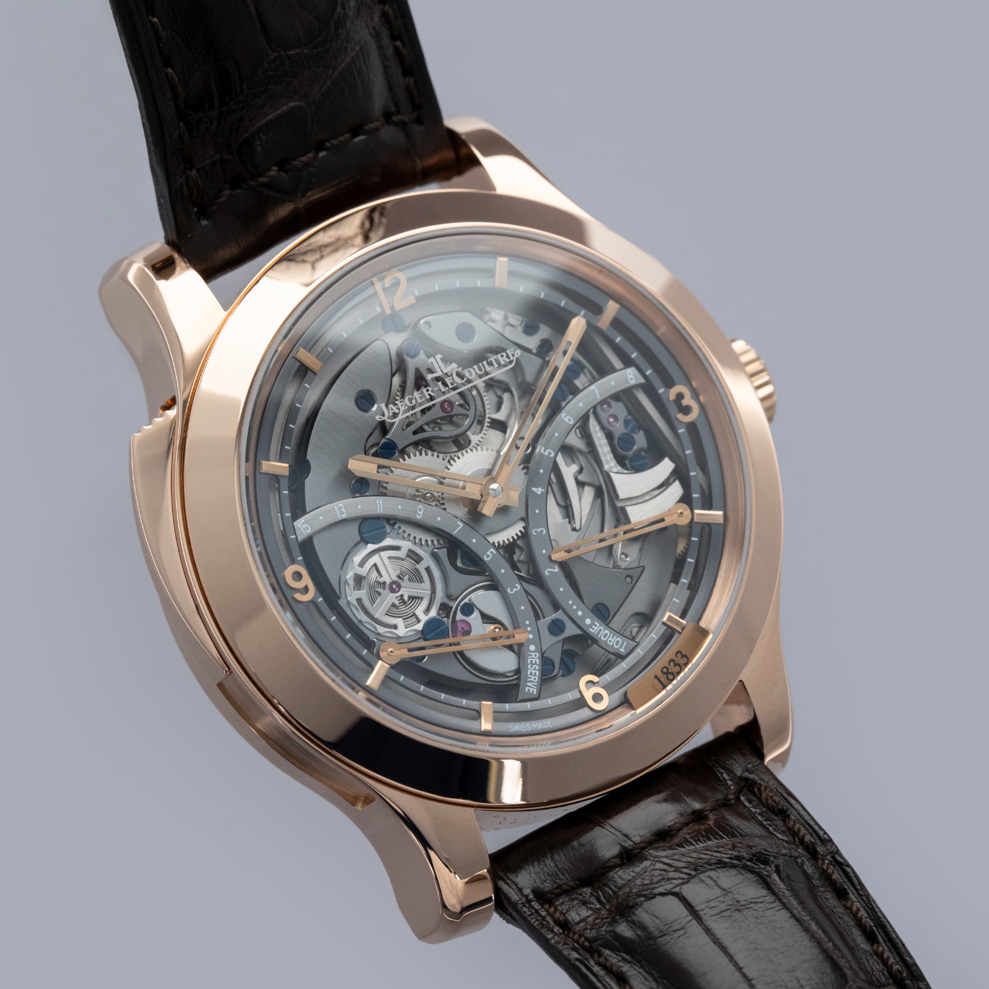 The rose gold case is in near-mint condition, with only very light marks. The display case back band features very crisp engravings. The dial is pristine. The watch is fitted with a brown JLC strap and a rose gold deployant clasp, both in near-mint condition. The watch comes with its original box and papers, including a JLC loupe, as well as a service pouch and service papers dating to 2024.