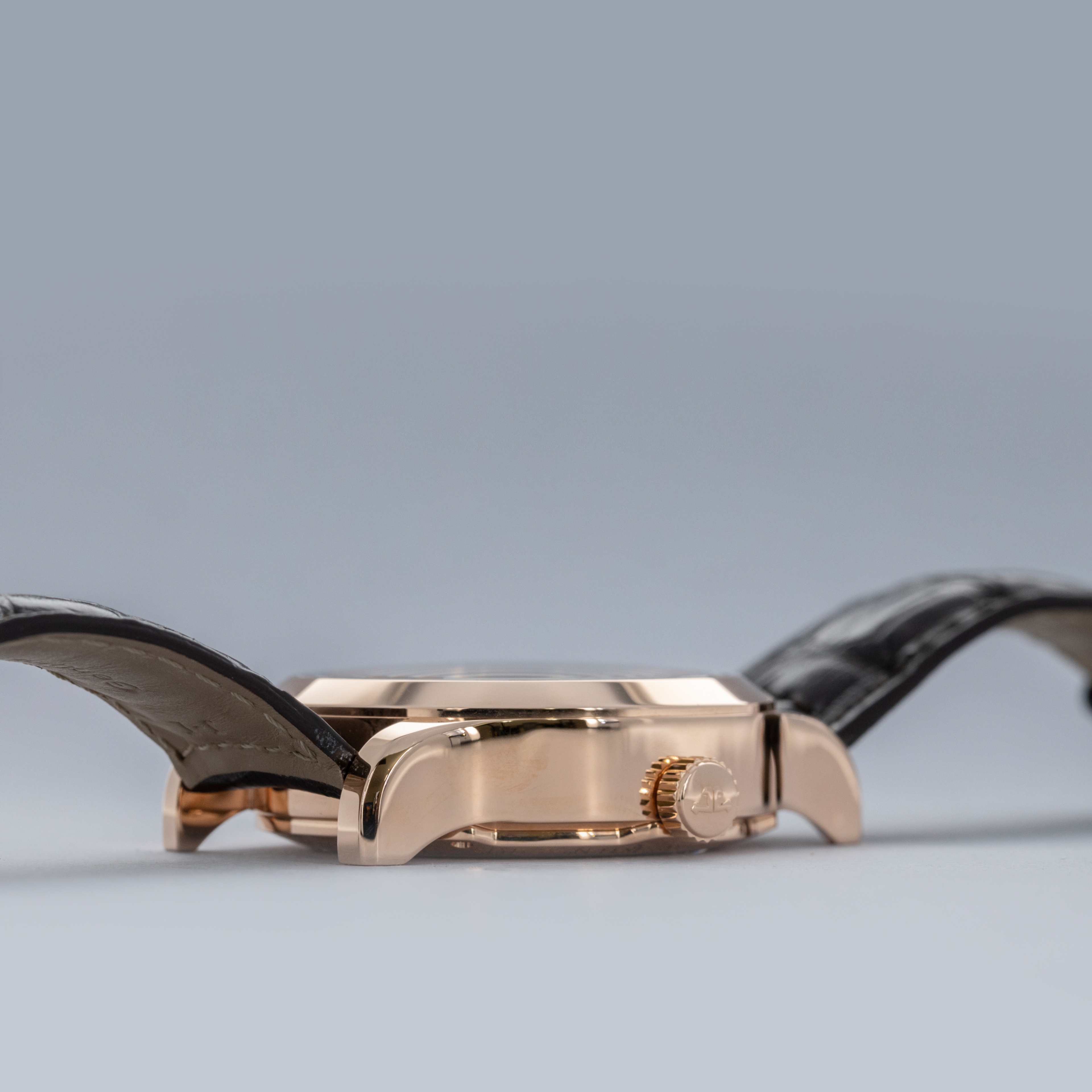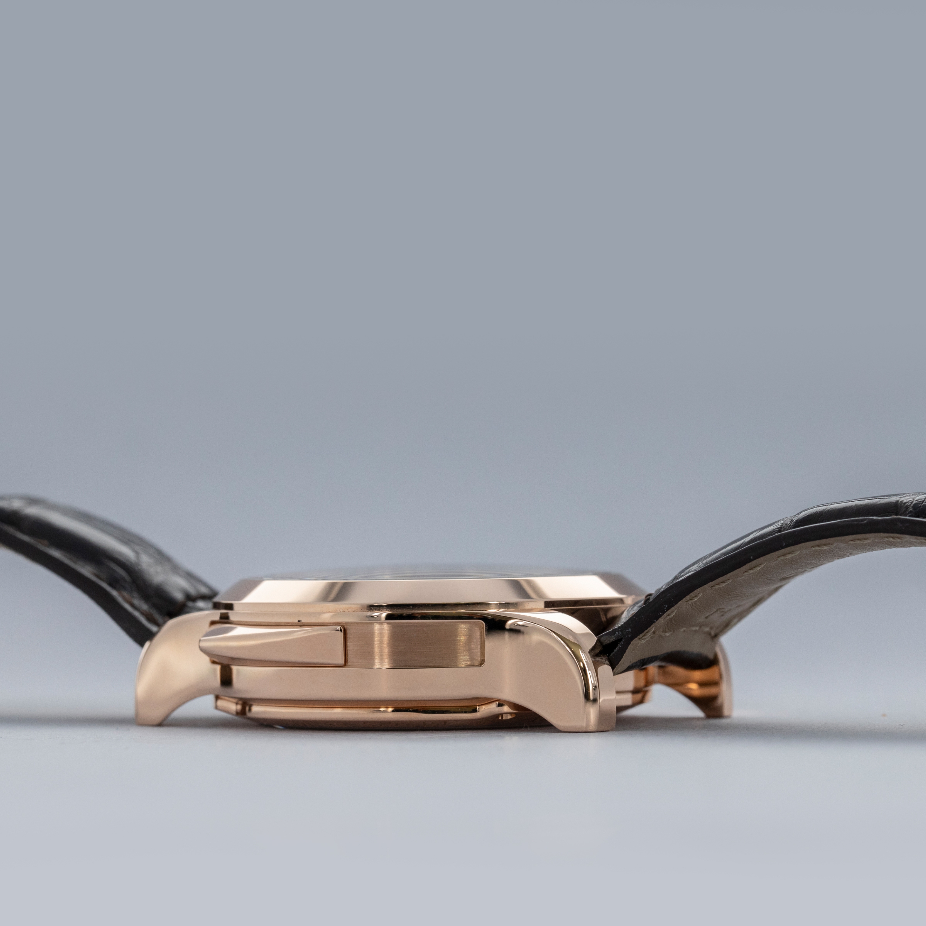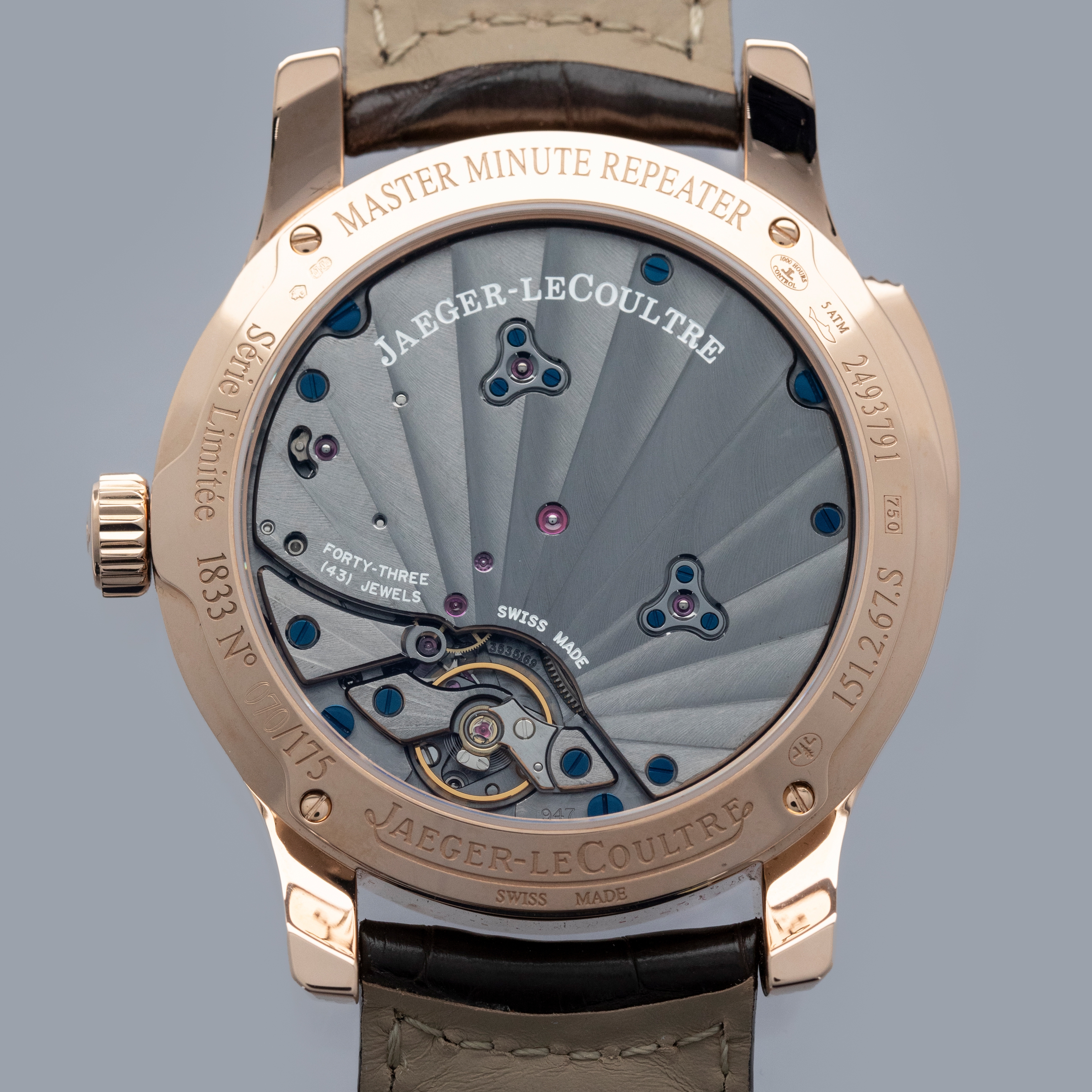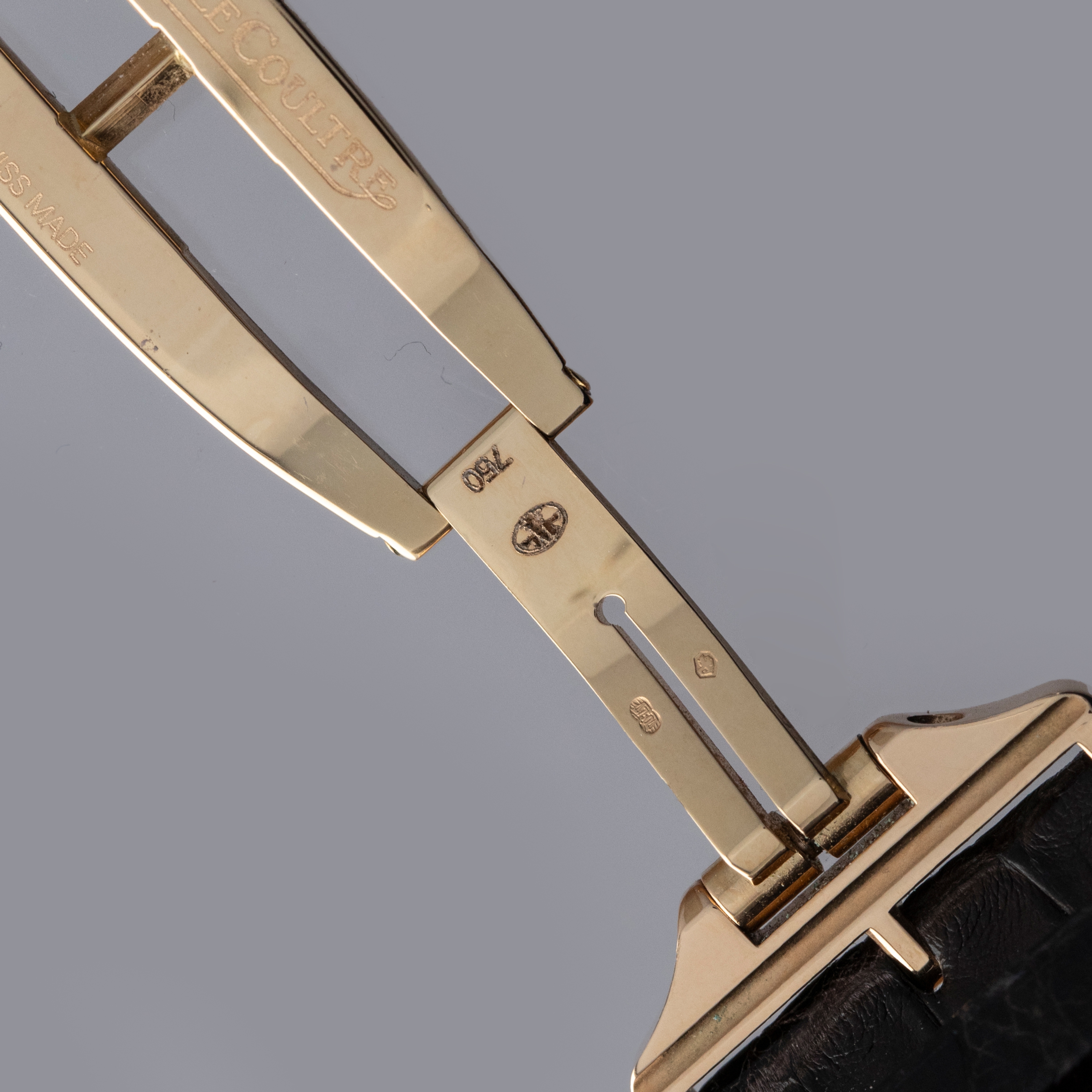 The rose gold case is in near-mint condition, with only very light marks. The display case back band features very crisp engravings. The dial is pristine. The watch is fitted with a brown JLC strap and a rose gold deployant clasp, both in near-mint condition. The watch comes with its original box and papers, including a JLC loupe, as well as a service pouch and service papers dating to 2024.
