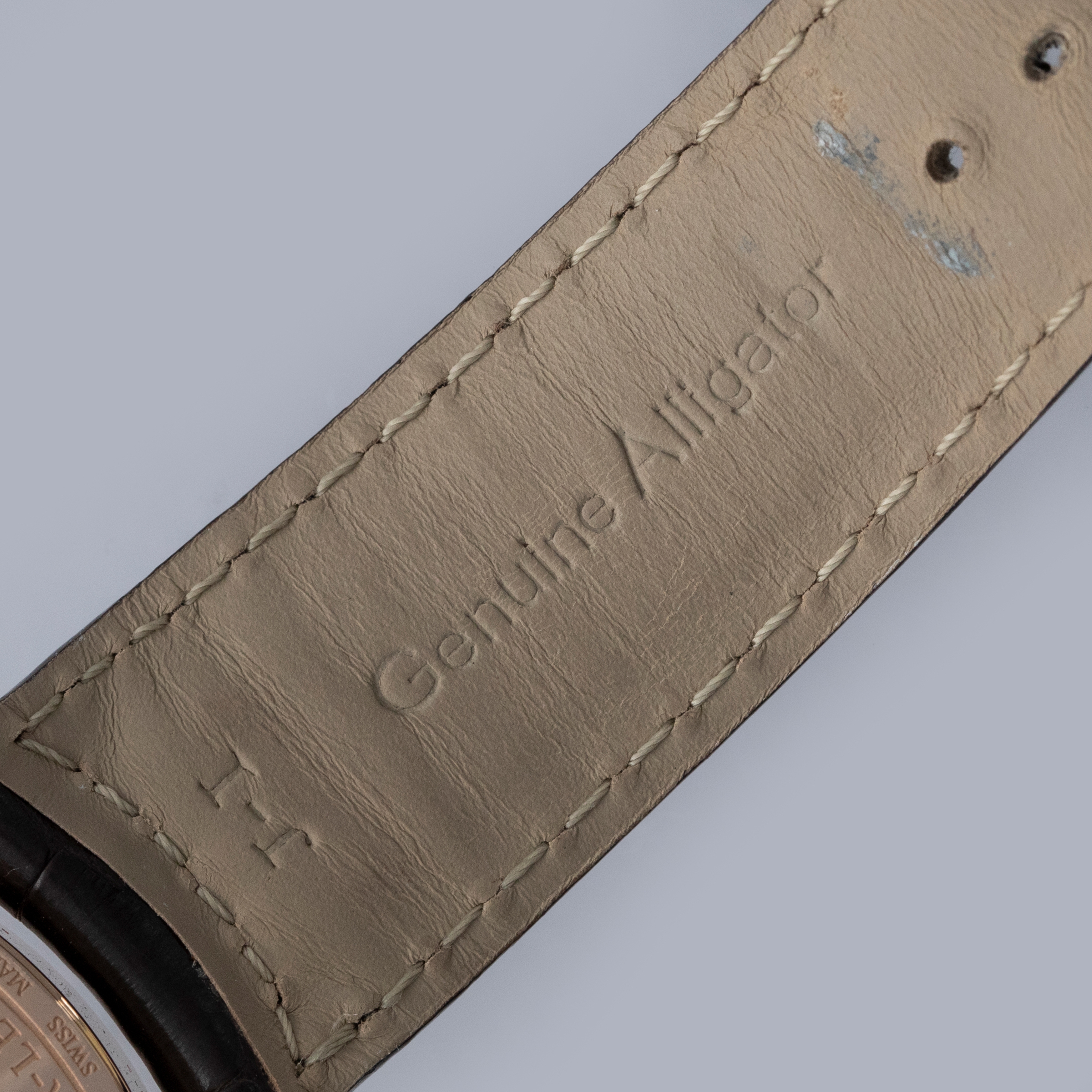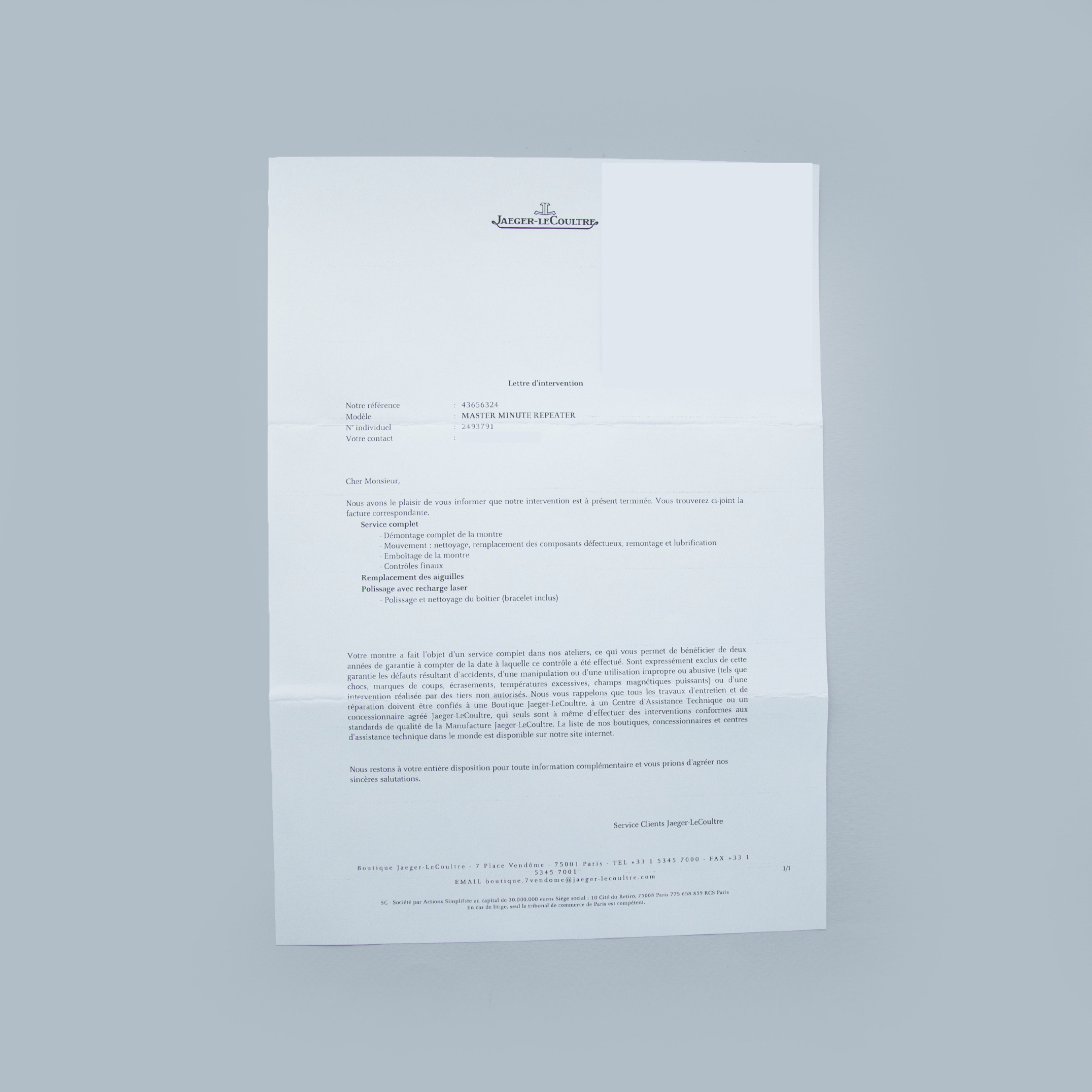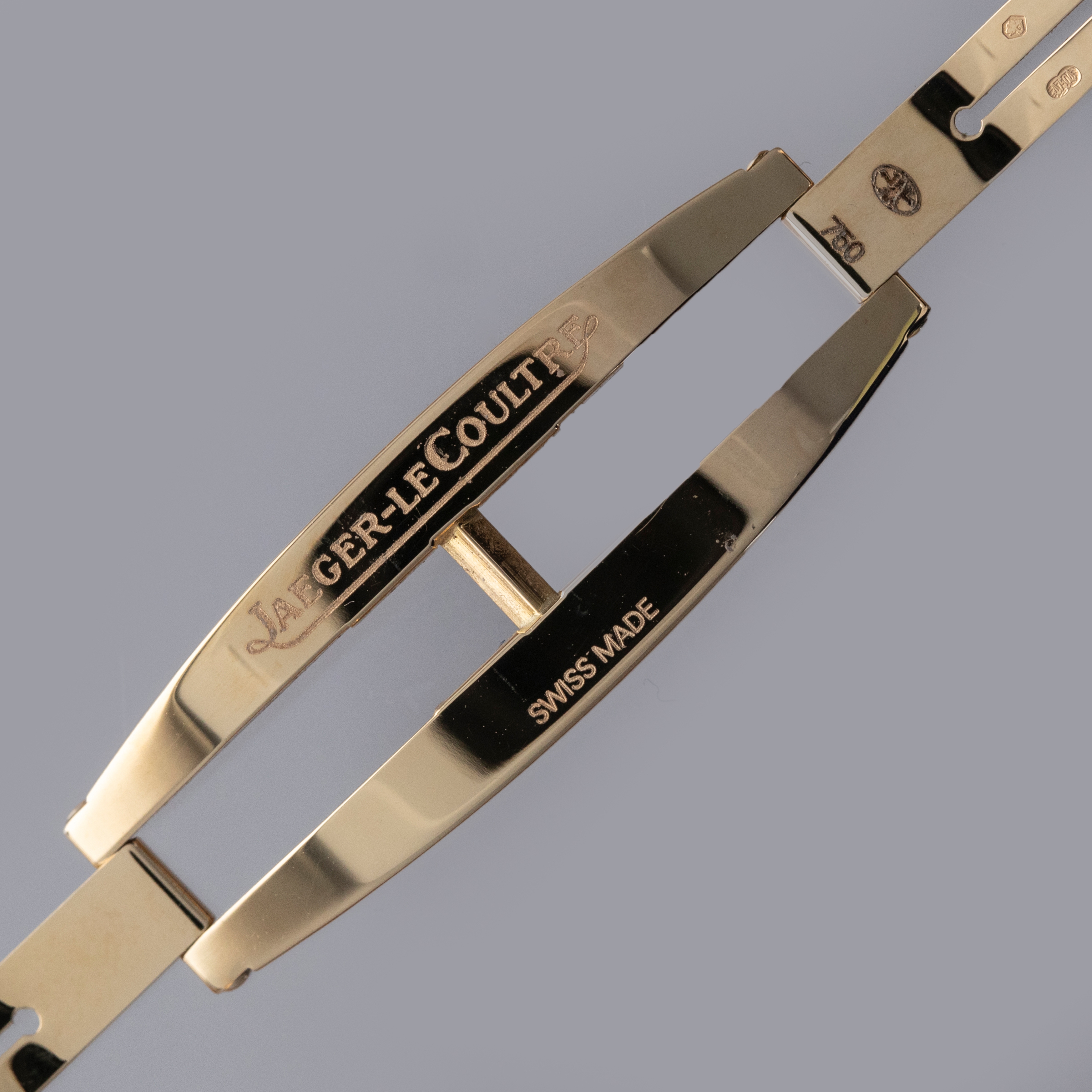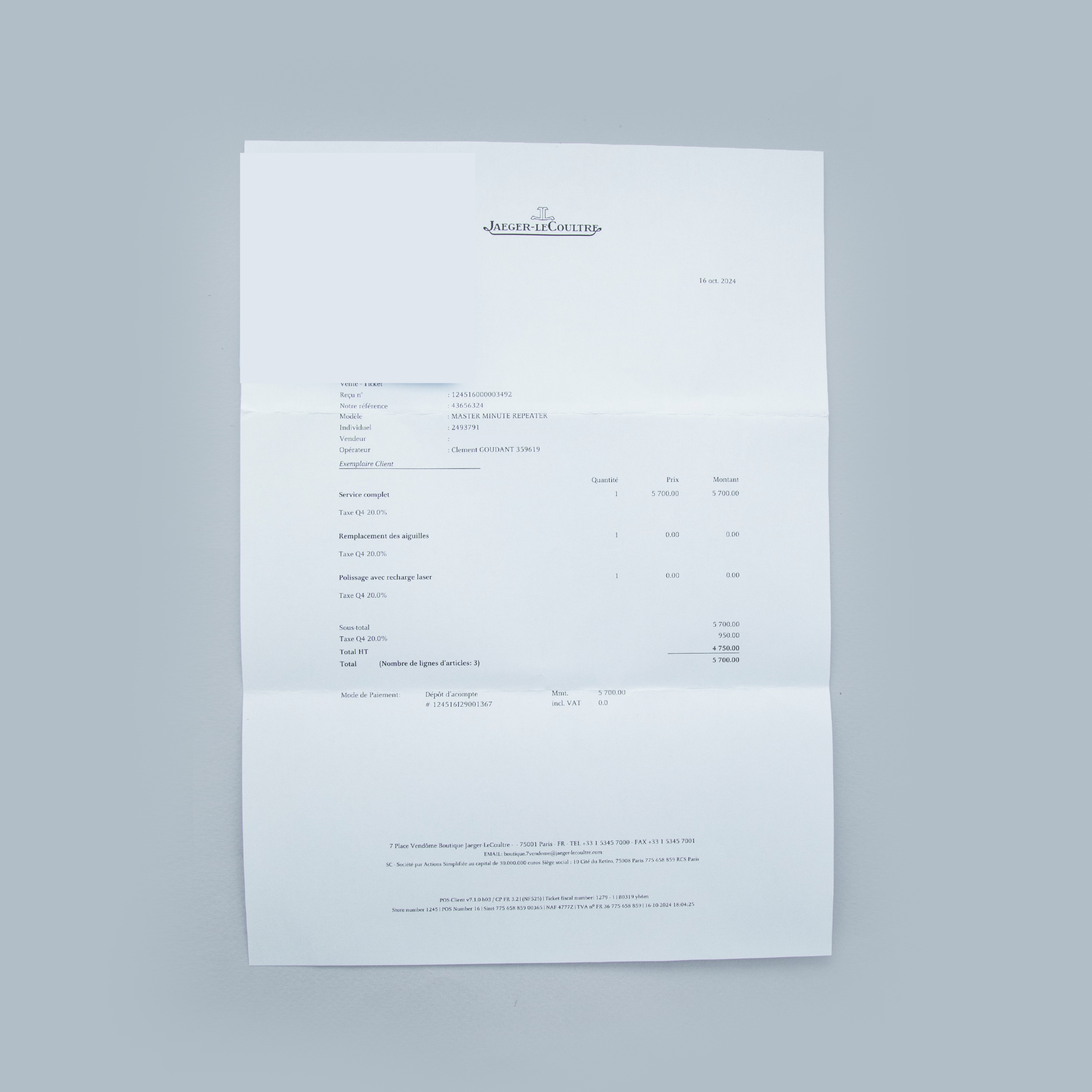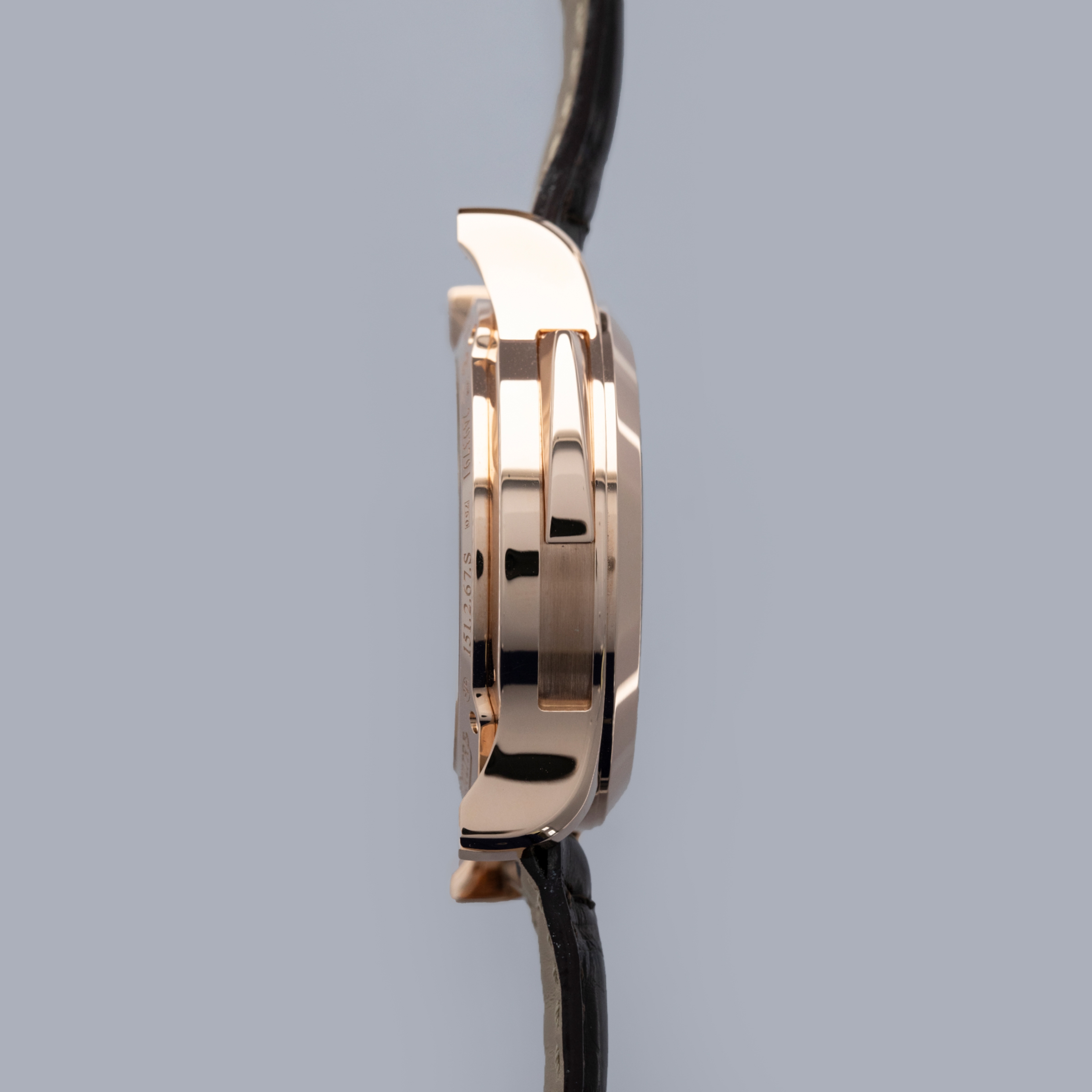 The rose gold case is in near-mint condition, with only very light marks. The display case back band features very crisp engravings. The dial is pristine. The watch is fitted with a brown JLC strap and a rose gold deployant clasp, both in near-mint condition. The watch comes with its original box and papers, including a JLC loupe, as well as a service pouch and service papers dating to 2024.
