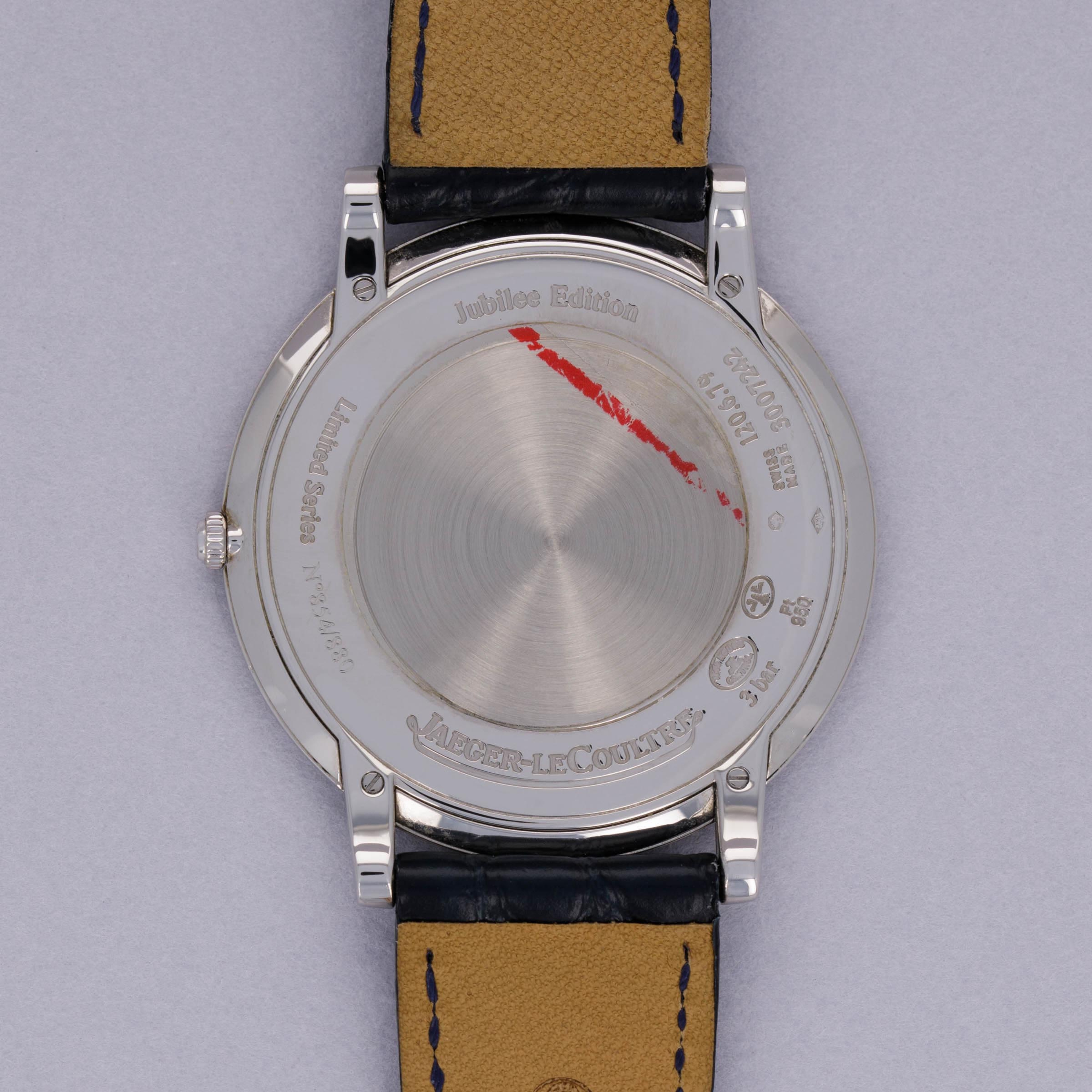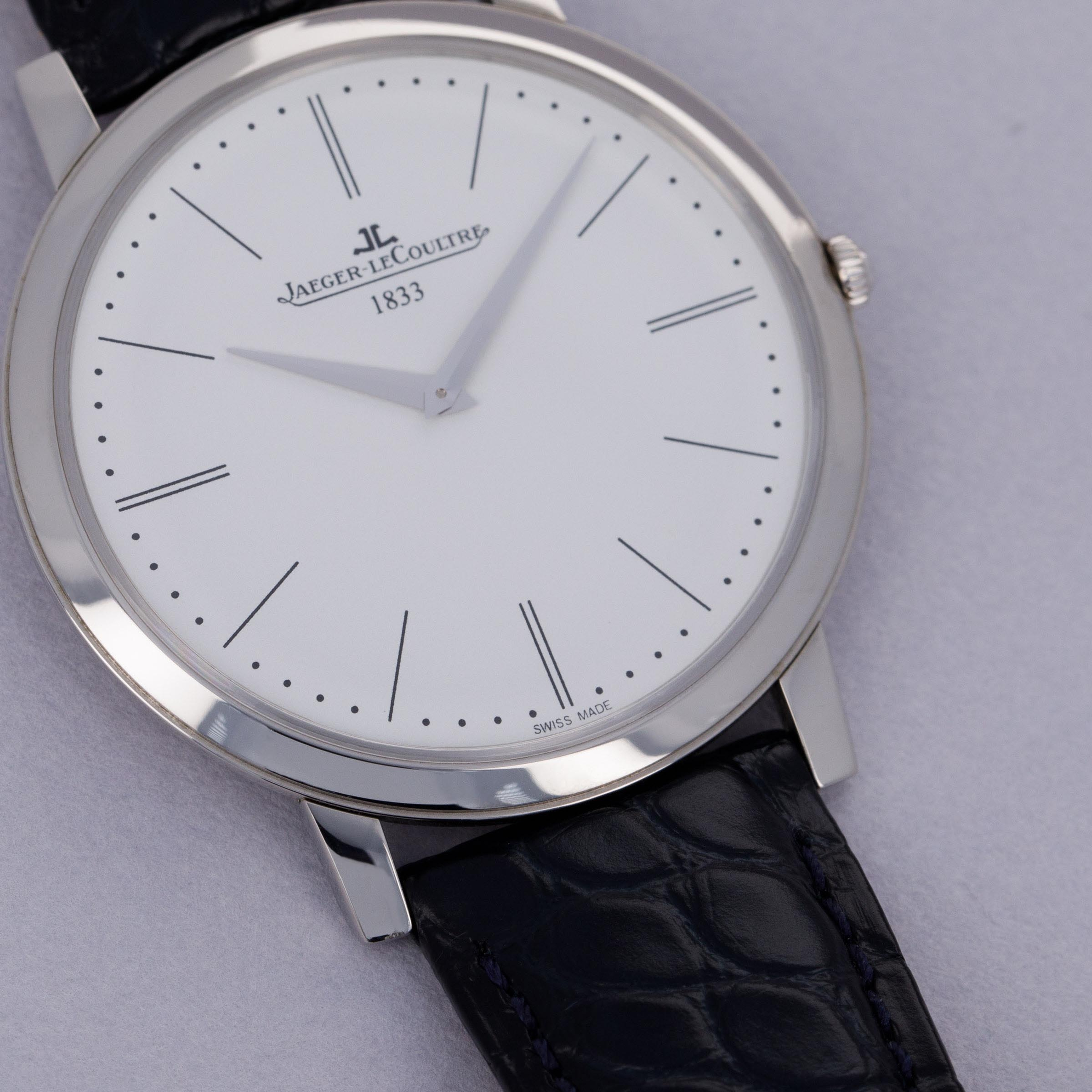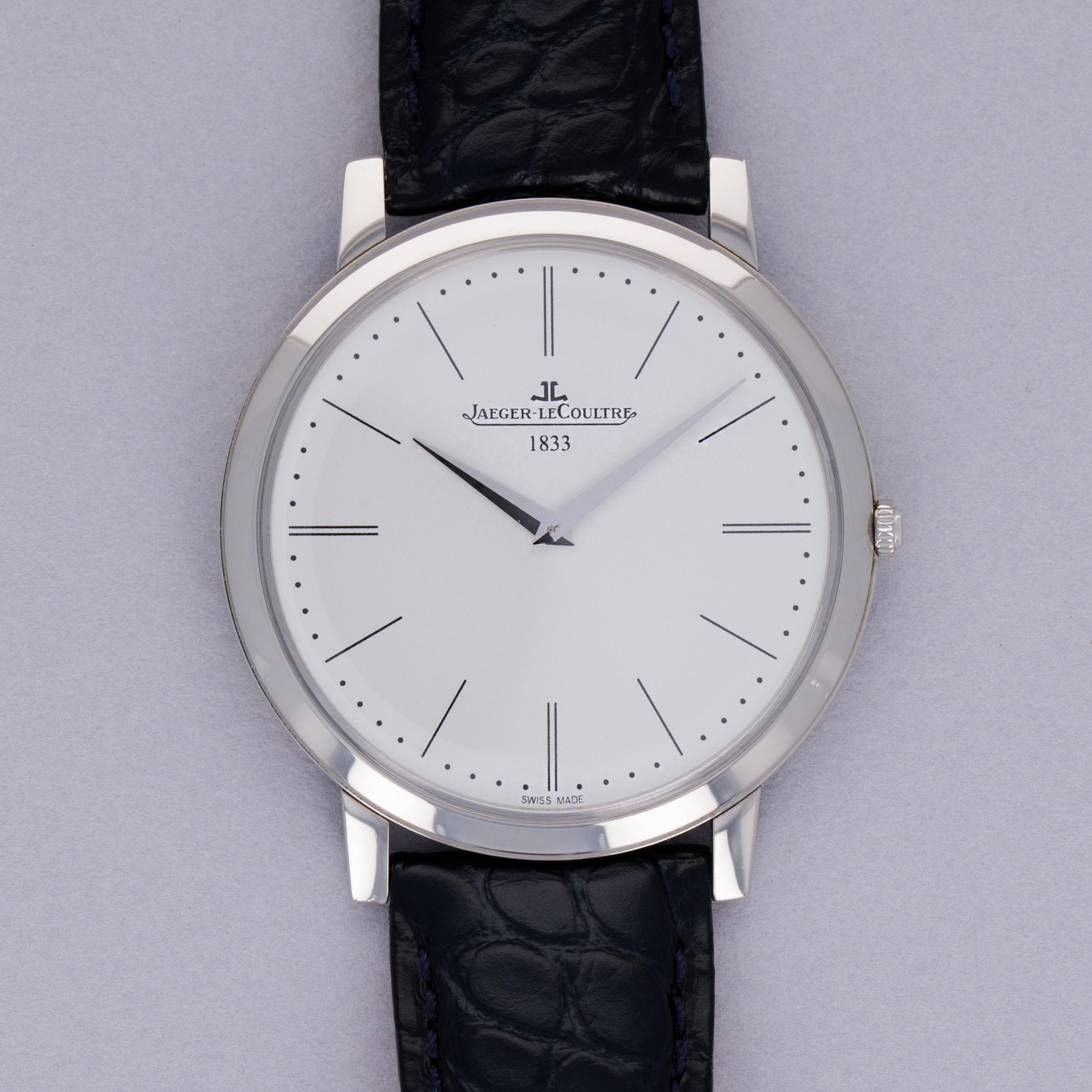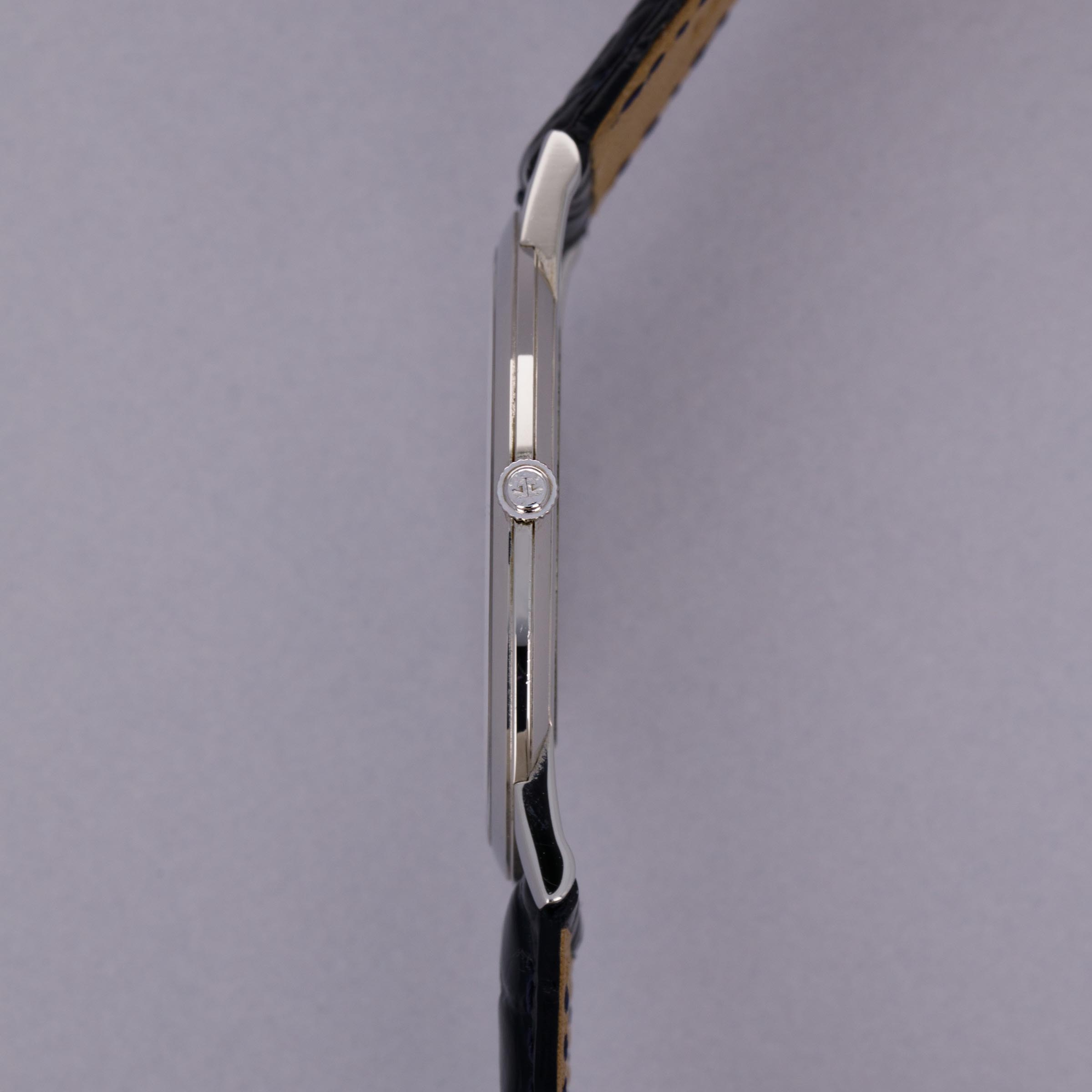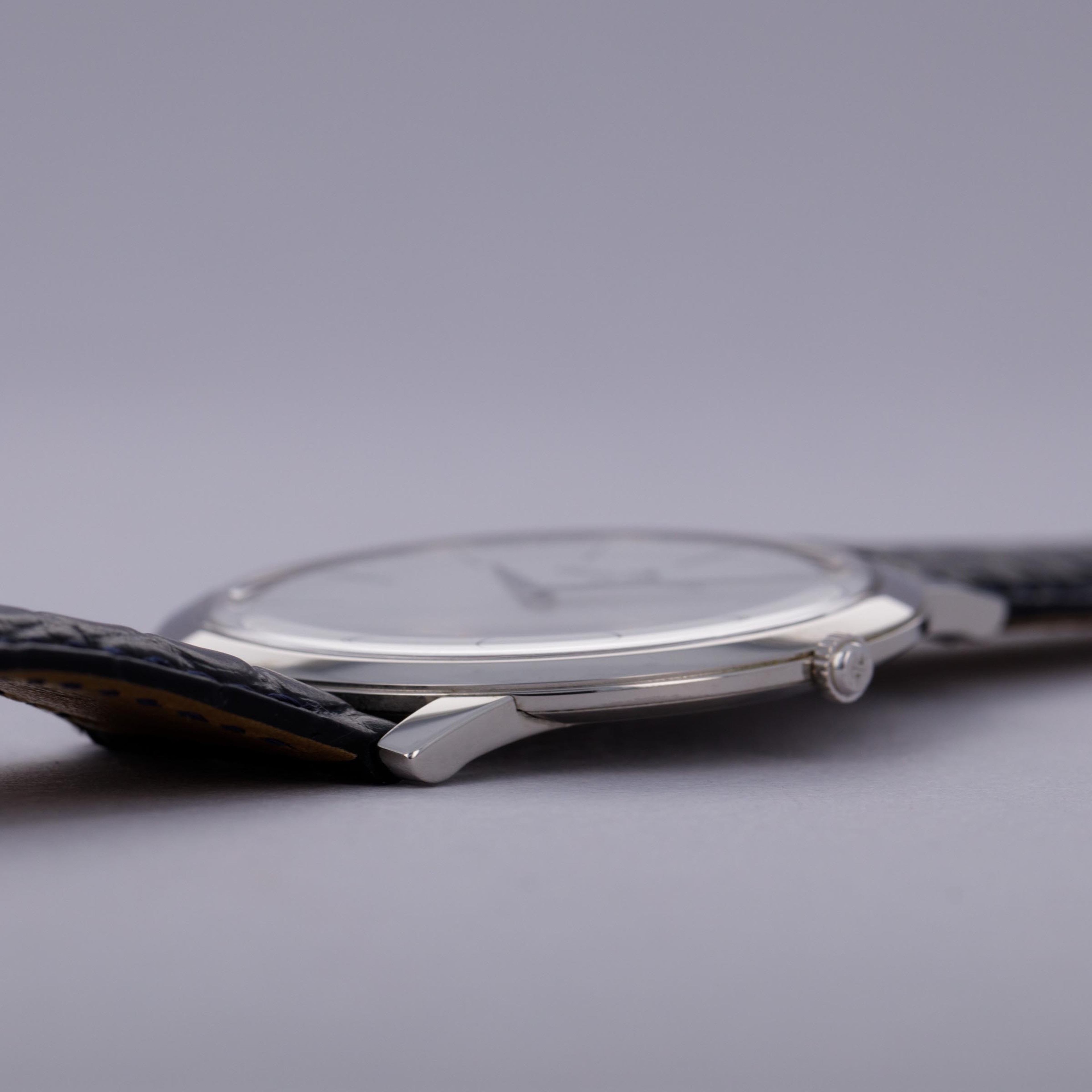 First debuting in 1992, the Jaeger LeCoultre Master is a vintage-inspired collection rooted to the 1950s aesthetic of old with elegant dials, refined constructions and brilliantly executed movements – all benchmarks of JLC’s talents as a watchmaker. Offered here, we have the Master Ultra-Thin ref. 120.6.79, a limited edition reference of just 888 pieces launched in 2013 that celebrated the 180th anniversary of JLC’s founding in 1833. Boasting a stunning, yet simple, silver dial and a platinum case that comes in at a perfectly wearable, and rather modern, 39mm diameter, this timepiece has everything one would want from JLC, the “watchmaker’s watchmaker.” Boasting sharp dauphine hands along with thin painted black stick indices, the ref. 120.6.79’s display is reserved, restrained and entirely traditional, as per its mid-century dress watch inspiration. Sporting a flat bezel, gently curving lugs, and just a single crown, the Master Ultra-This is a wonderfully wearable watch that speaks to the collection’s original source of inspiration, the 1950s and JLC’s important contribution to watchmaking while also celebrating JLC’s impressive craftsmanship through its manual-wind cal. 849 movement that is on display behind an exhibition caseback.