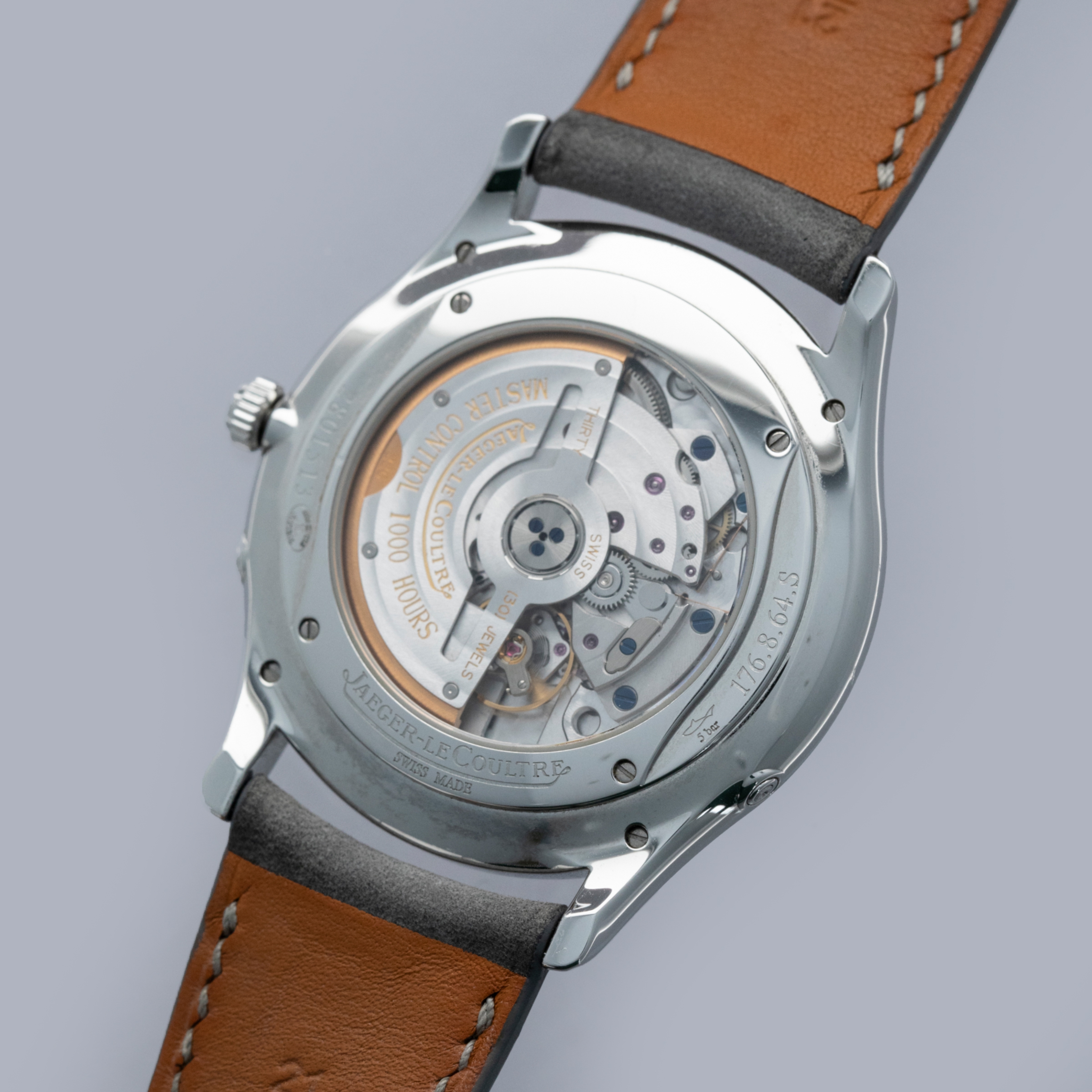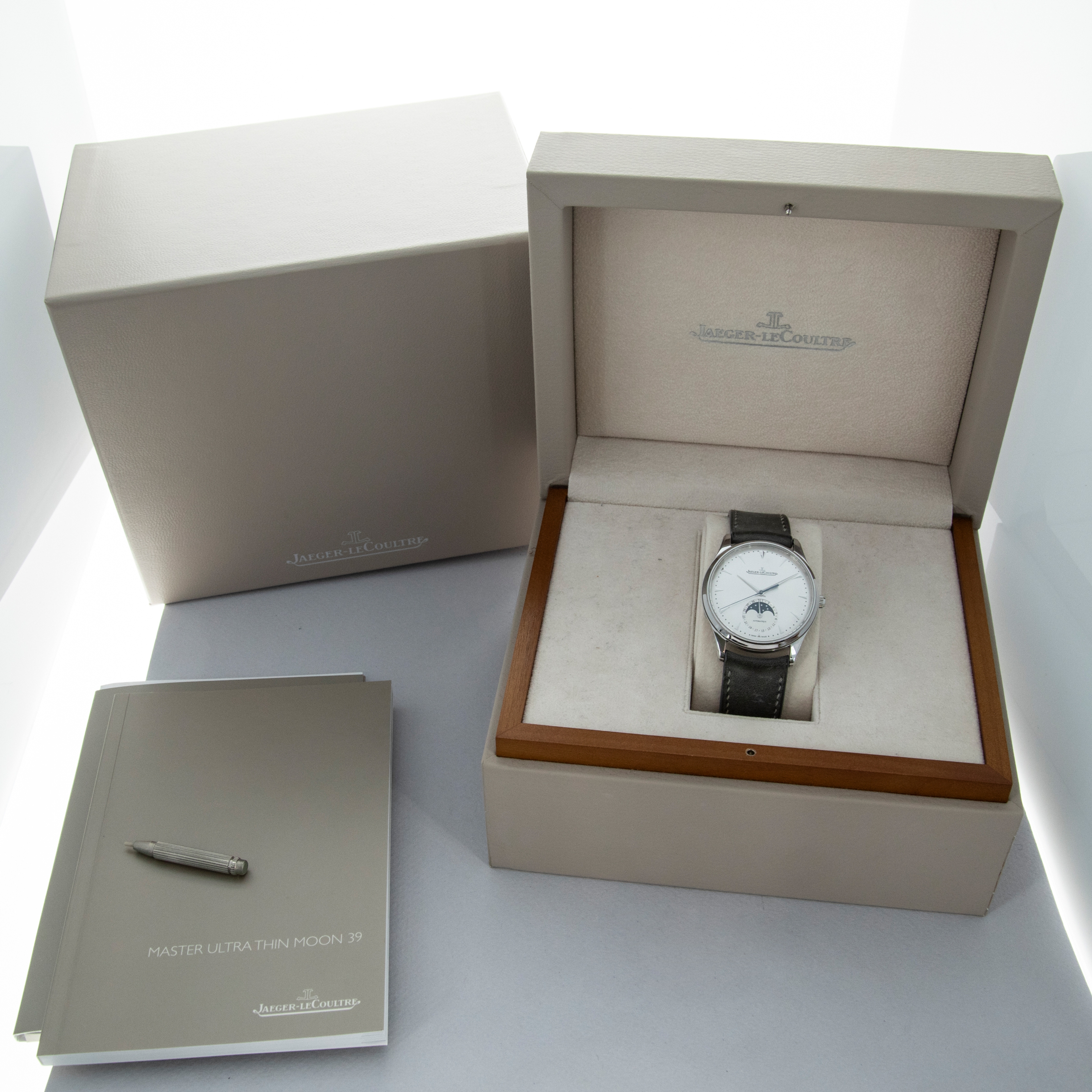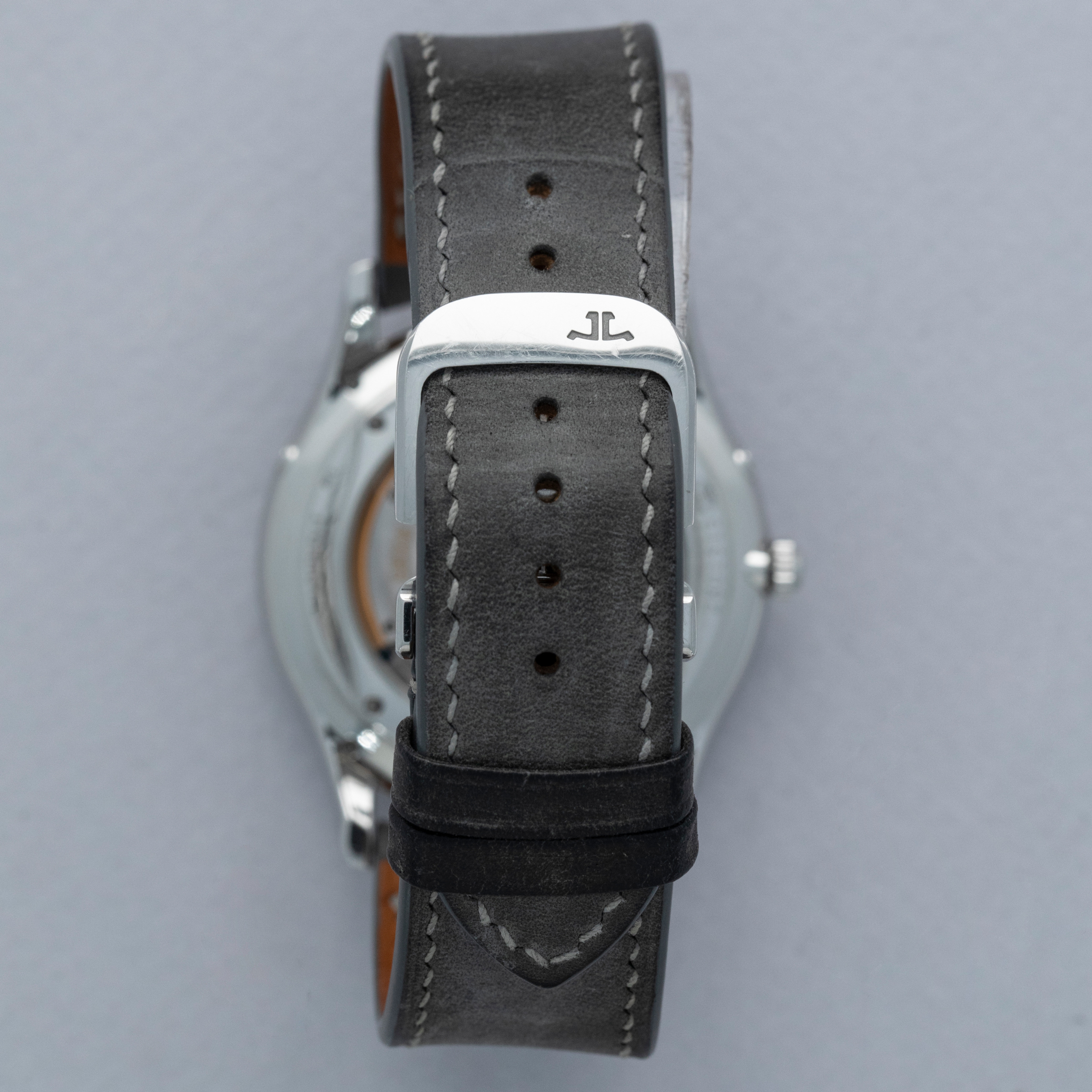 The stainless steel case is in excellent condition, with a few light scratches, but the case edges remain sharp and well-defined. The steel outer edge of the display case back has well-defined engravings, with some light wear to the screw heads and minor scratches. The dial shows no signs of aging, and the no-lume hands are very clean. The watch is fitted with a DeLugs strap and a stainless steel JLC deployant clasp, both in excellent condition. The watch comes complete with its original boxes, guarantee, manuals, and setting tool.