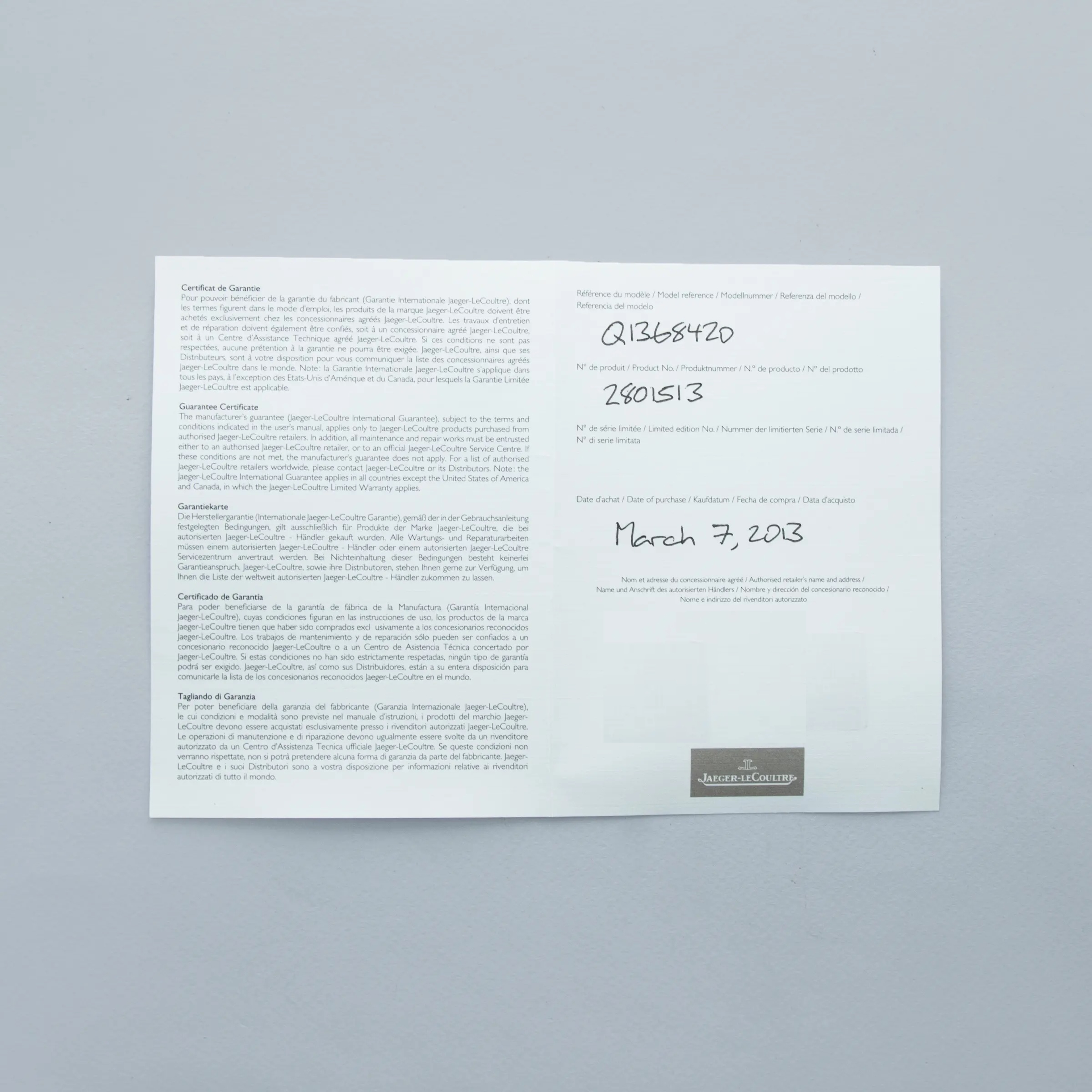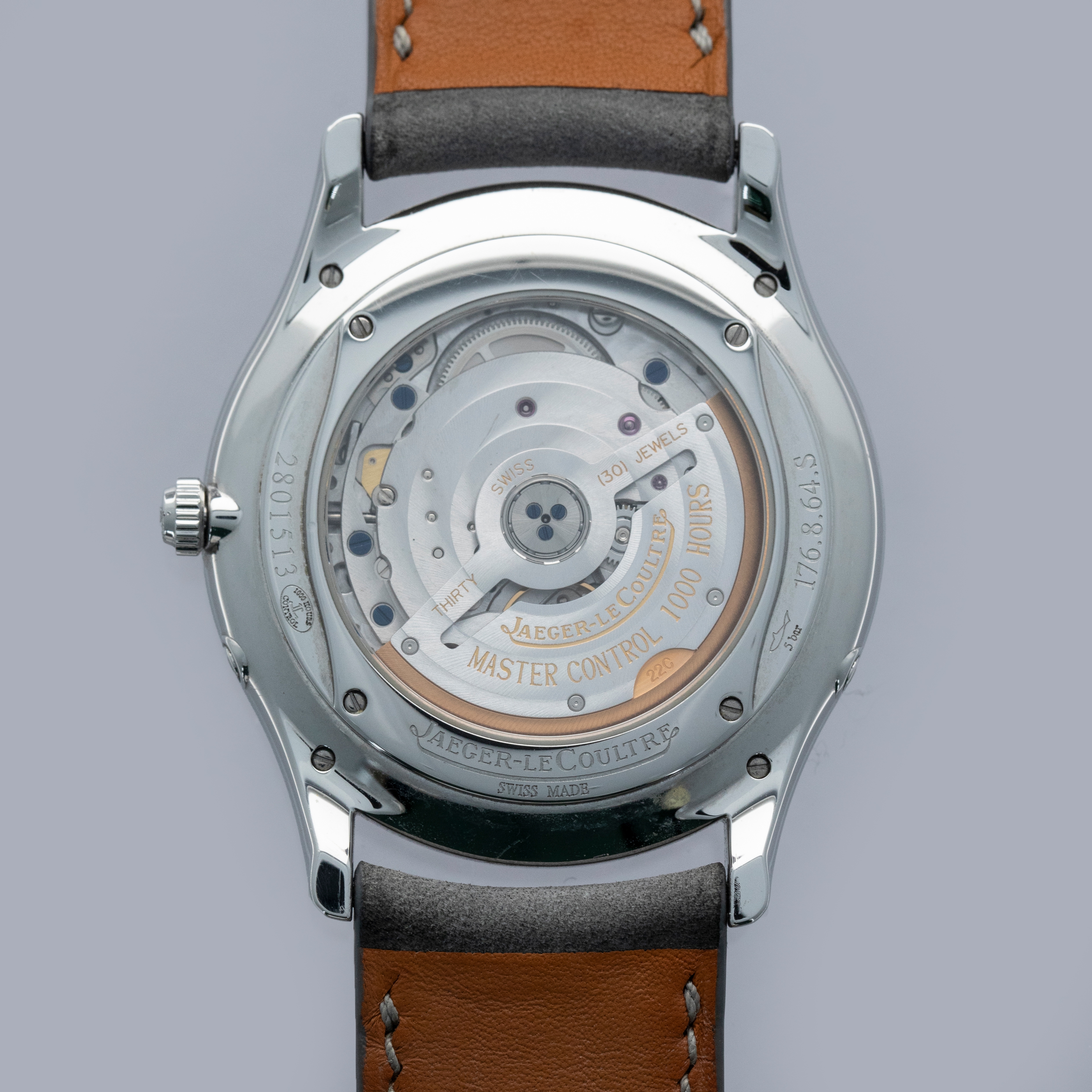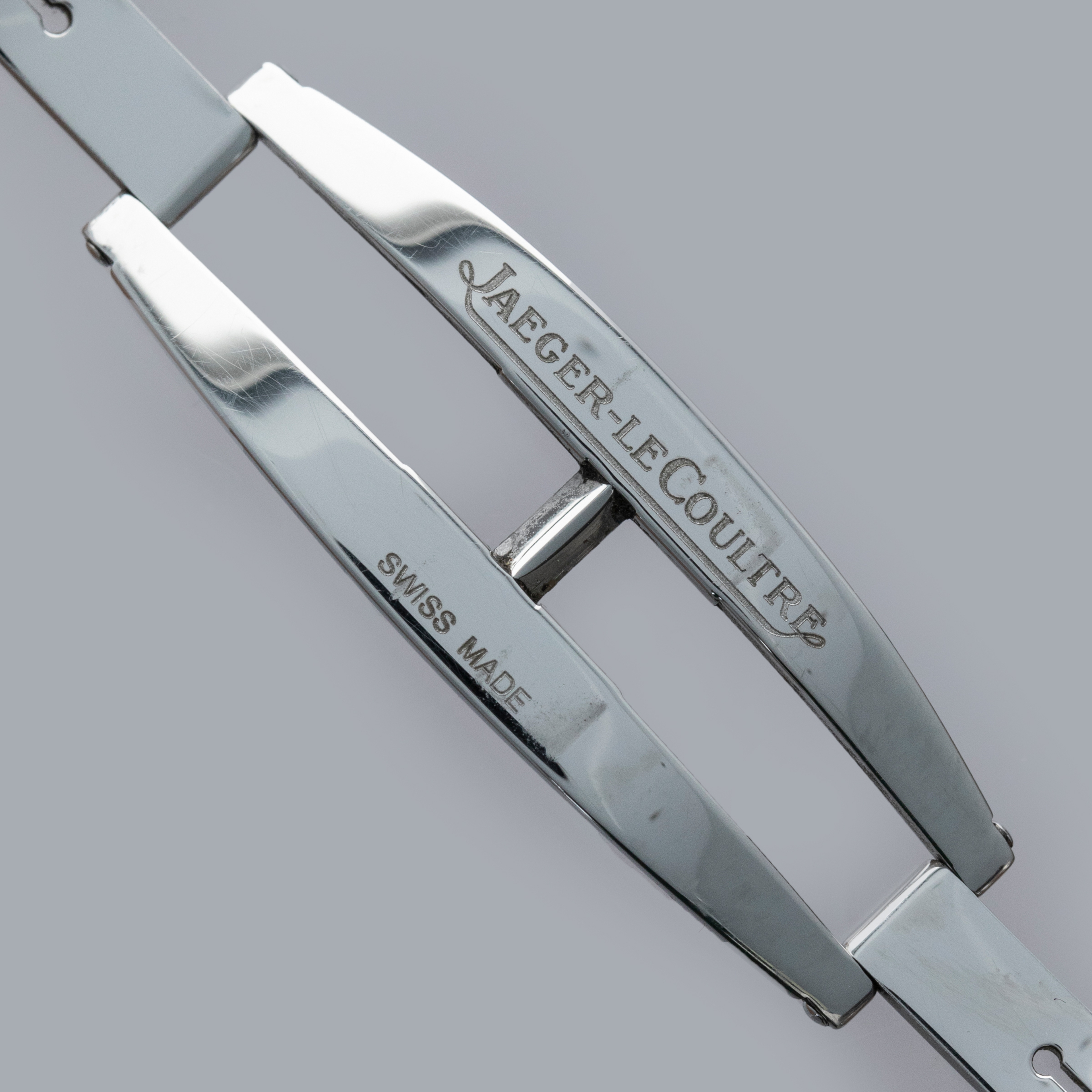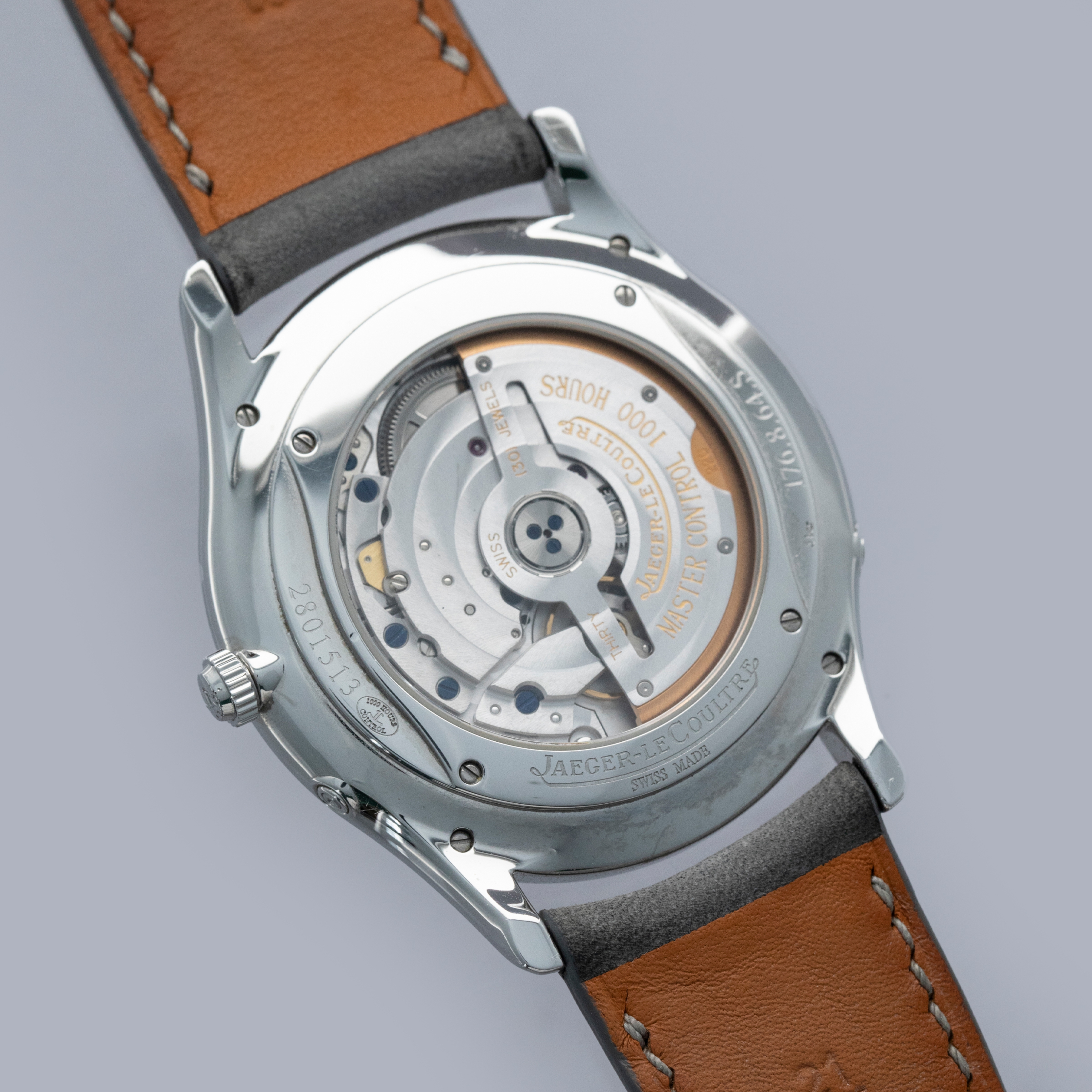 The stainless steel case is in excellent condition, with a few light scratches, but the case edges remain sharp and well-defined. The steel outer edge of the display case back has well-defined engravings, with some light wear to the screw heads and minor scratches. The dial shows no signs of aging, and the no-lume hands are very clean. The watch is fitted with a DeLugs strap and a stainless steel JLC deployant clasp, both in excellent condition. The watch comes complete with its original boxes, guarantee, manuals, and setting tool.