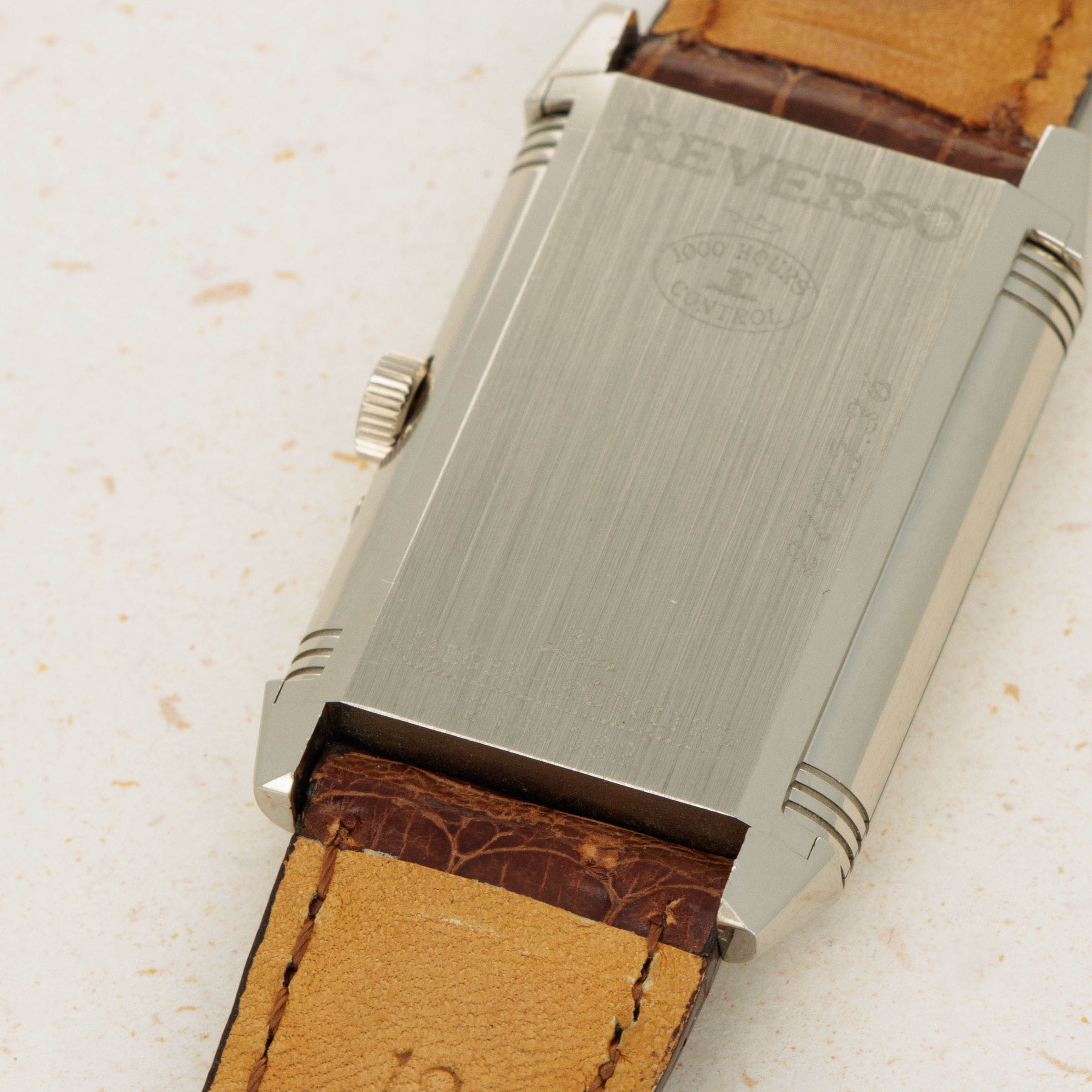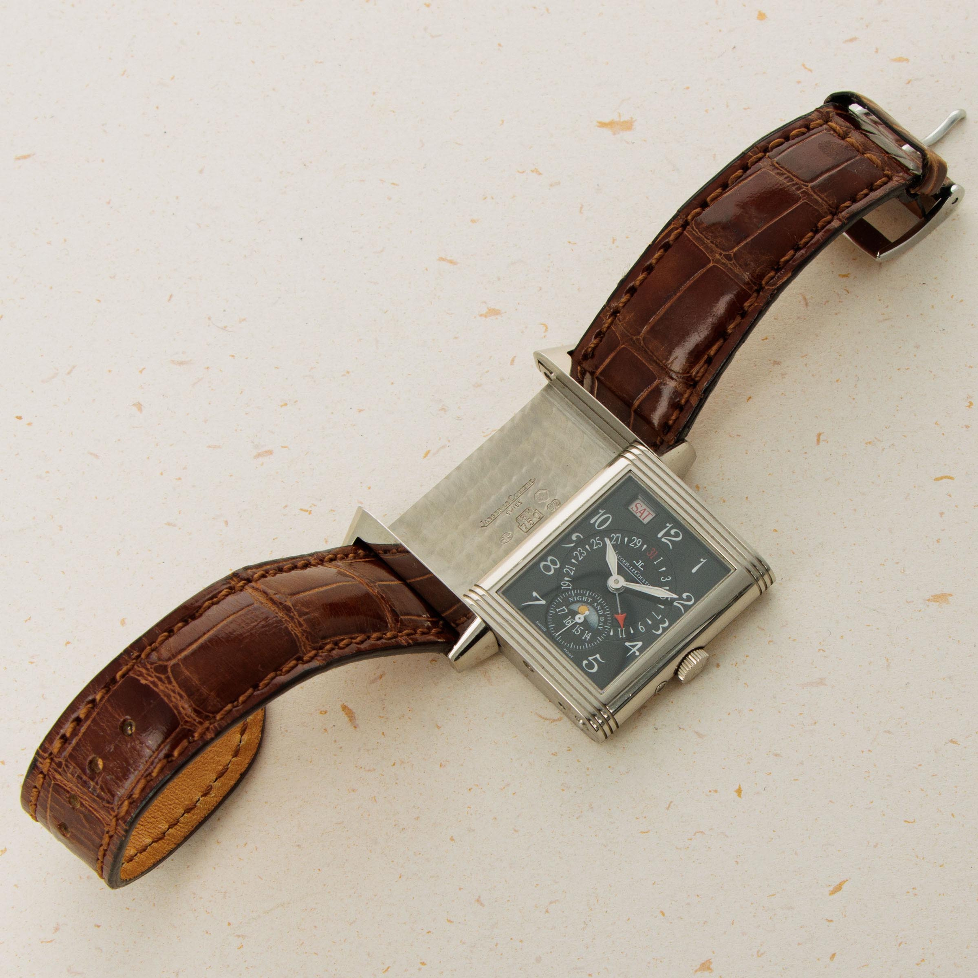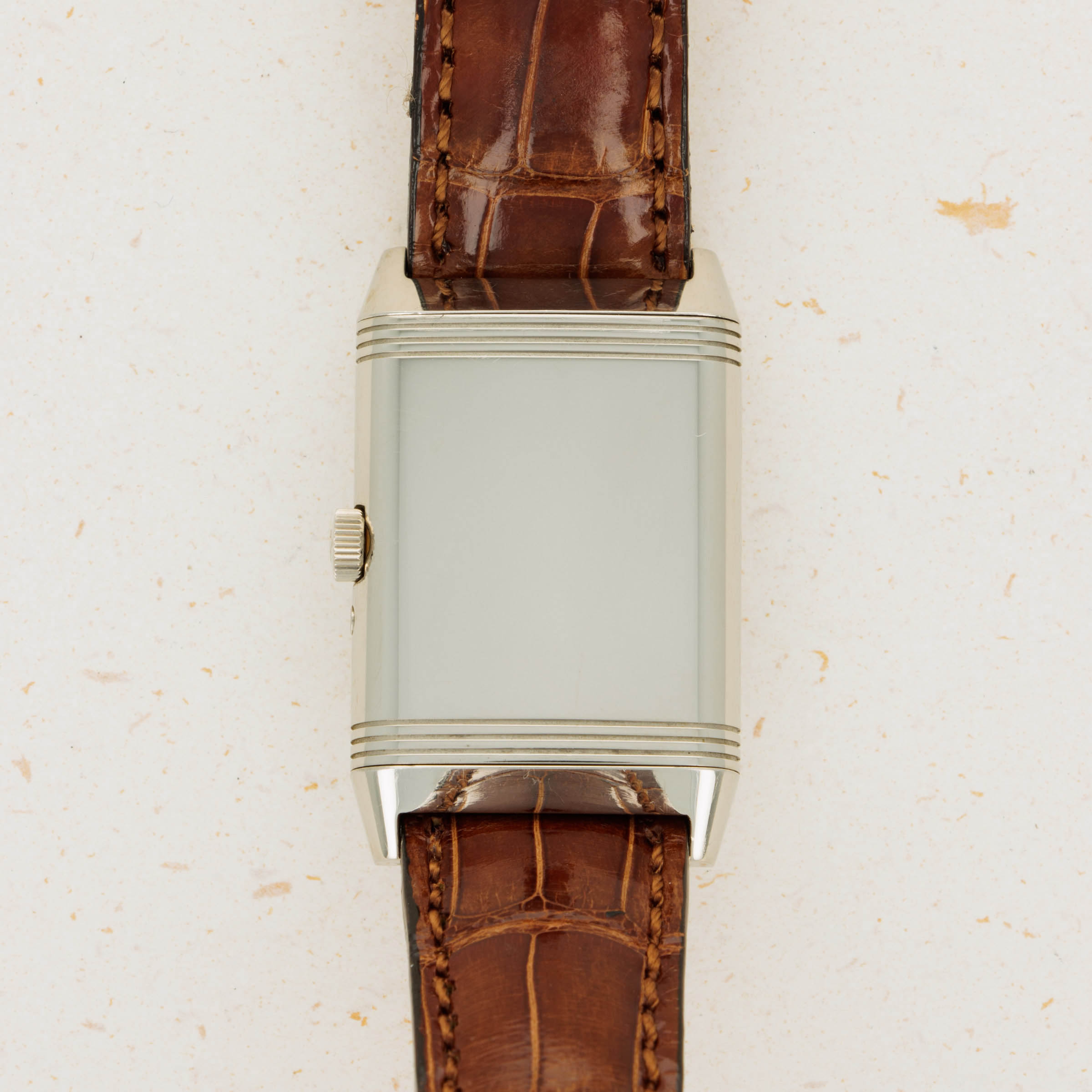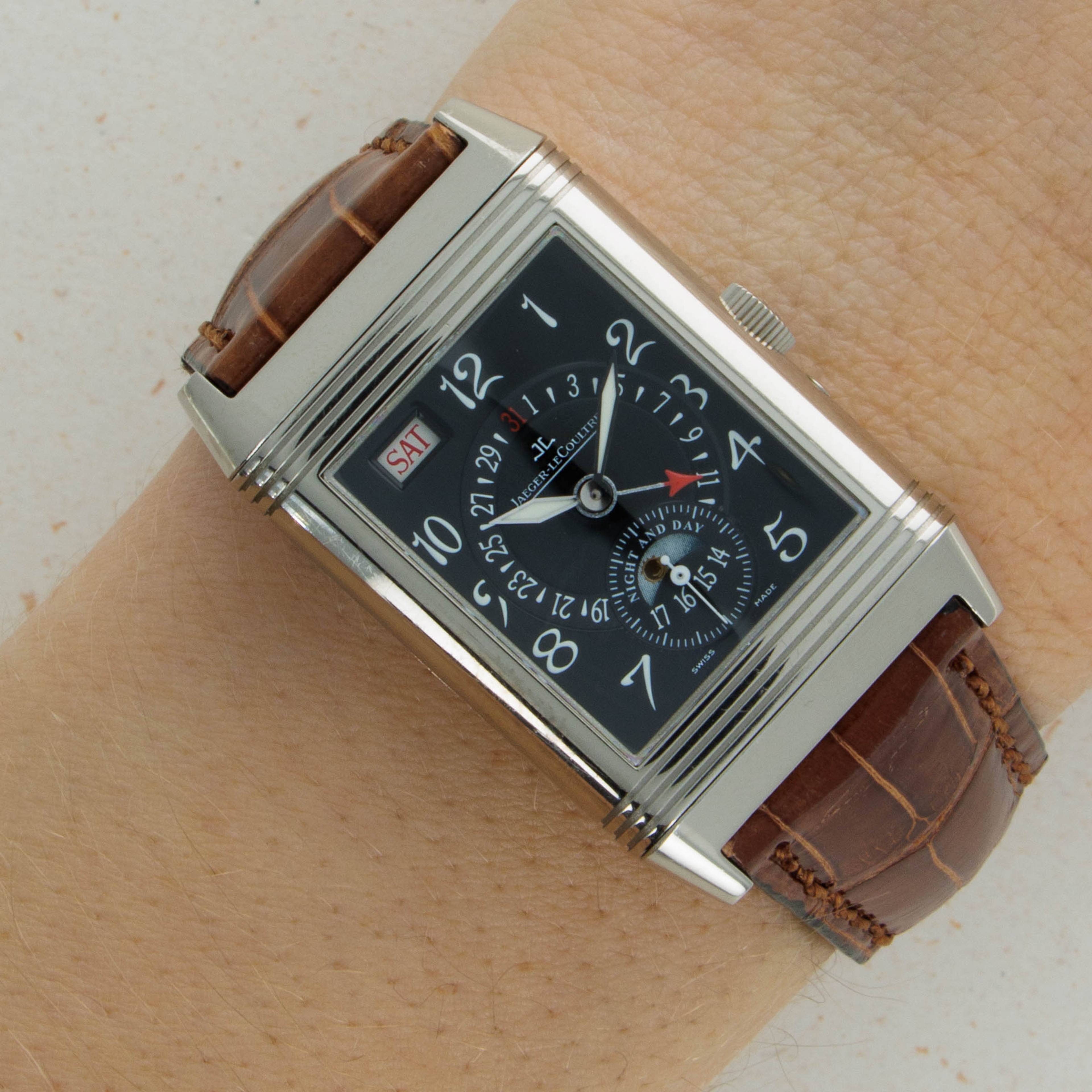 Standing 42mm tall and 26mm wide, this Reverso's construction is noticeably larger than the Reverso's original design, with its sleek 18kt white gold case sitting neatly on the wrist with a heft that is telling of its luxury and prestige.