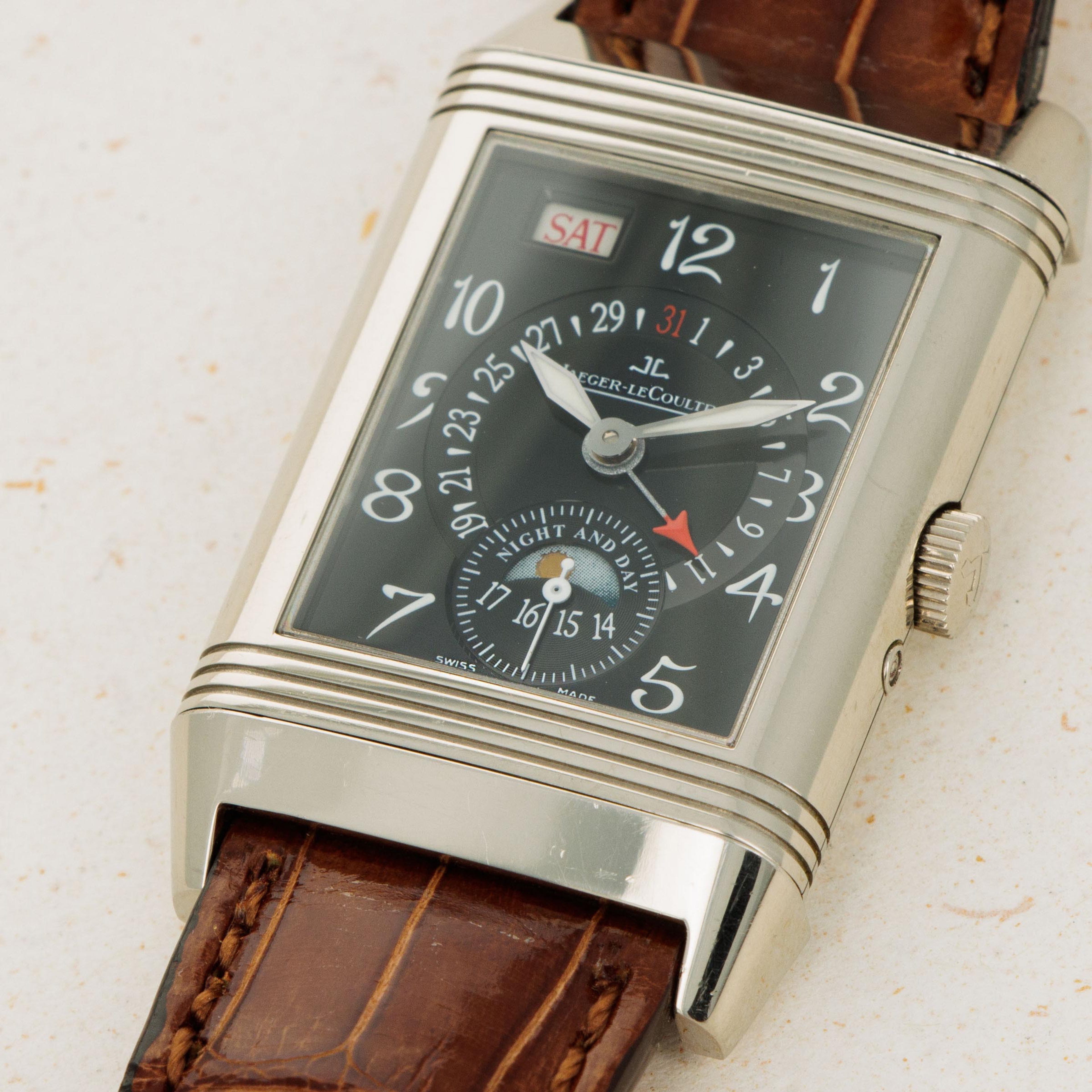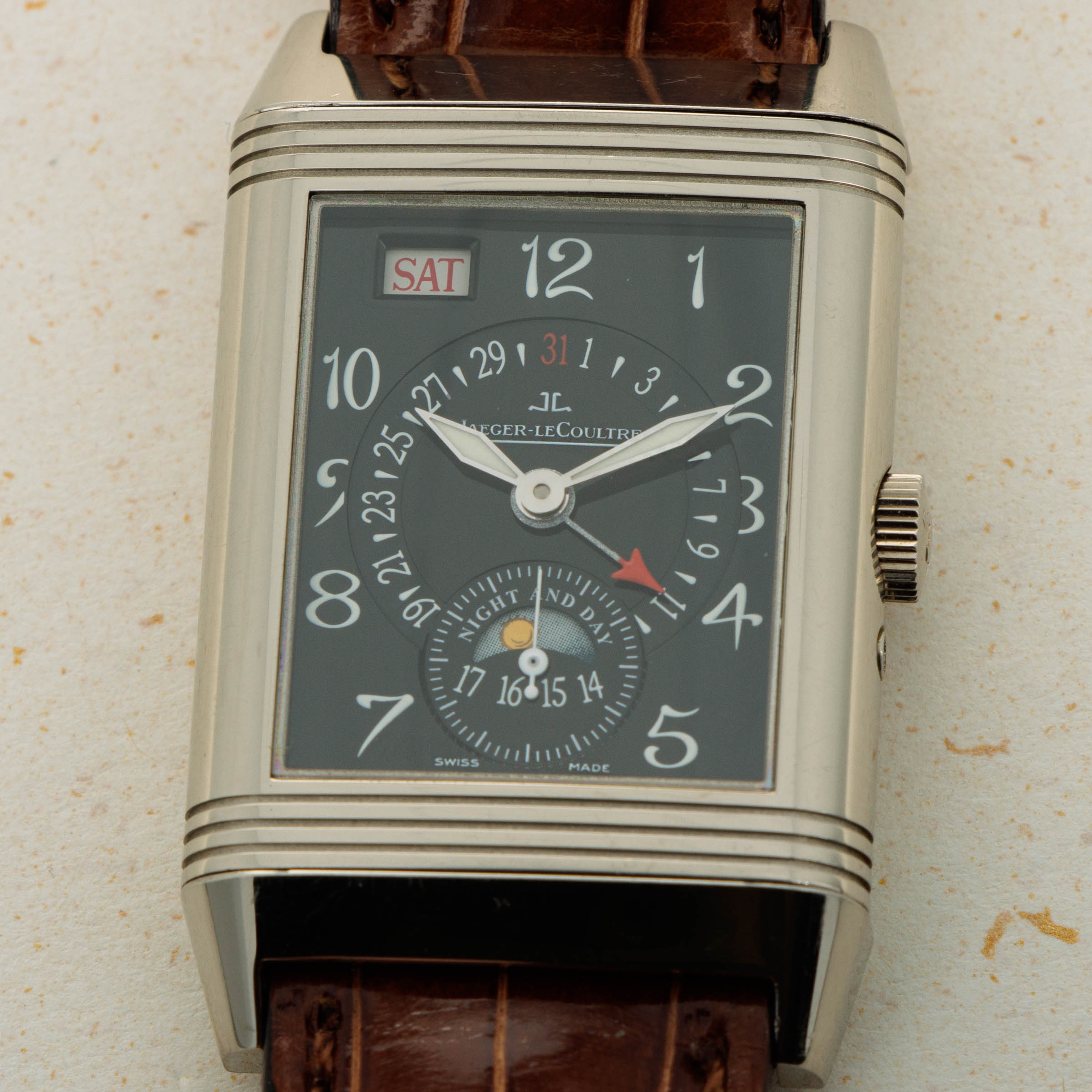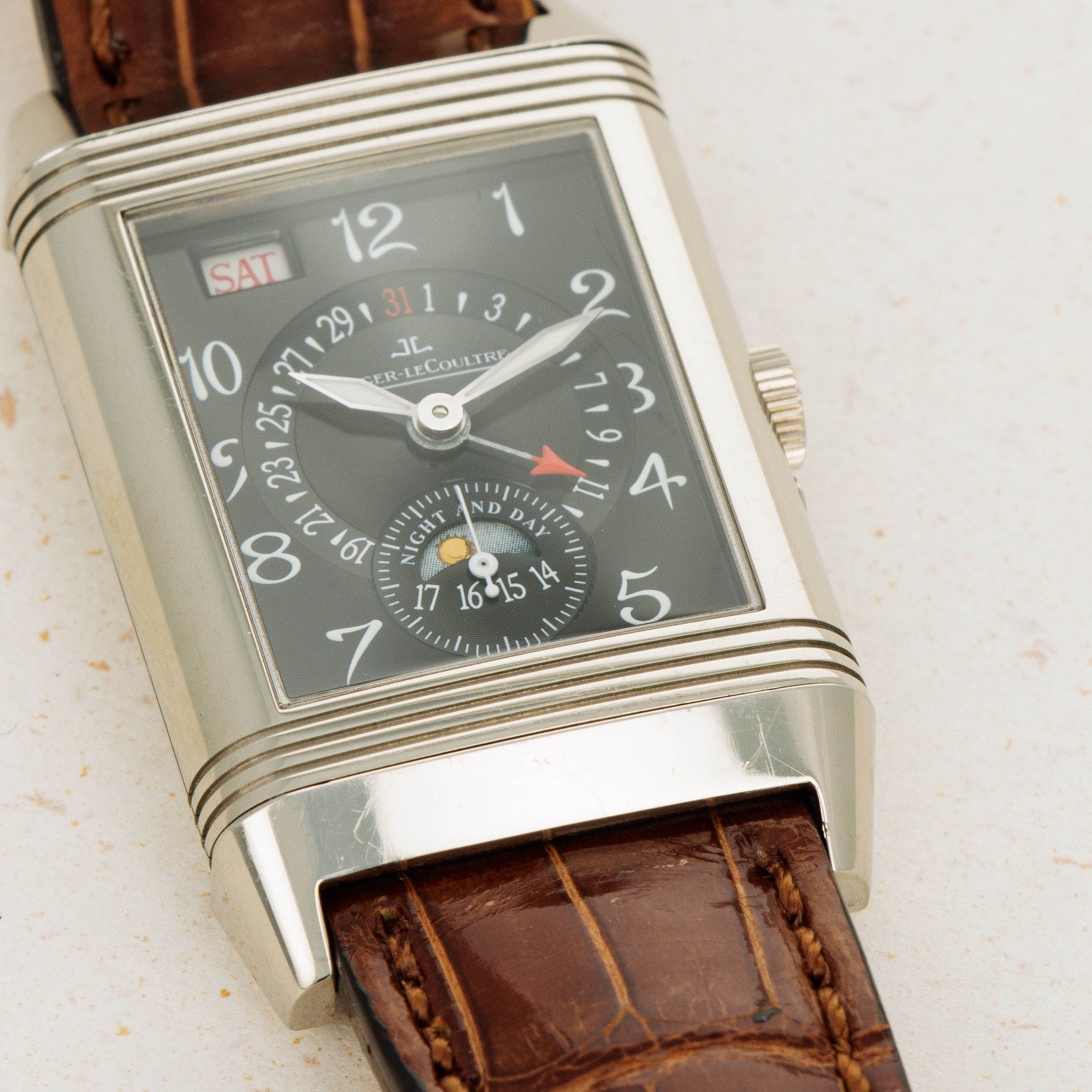 Boasting an unusual dial for a Reverso, the ref., 270.3.36 features a day aperture at 11 o'clock, a pointer date wheel, a gorgeously designed AM/PM indicator and a running seconds subdial that all combine to give this timepiece a wonderfully detailed aesthetic.