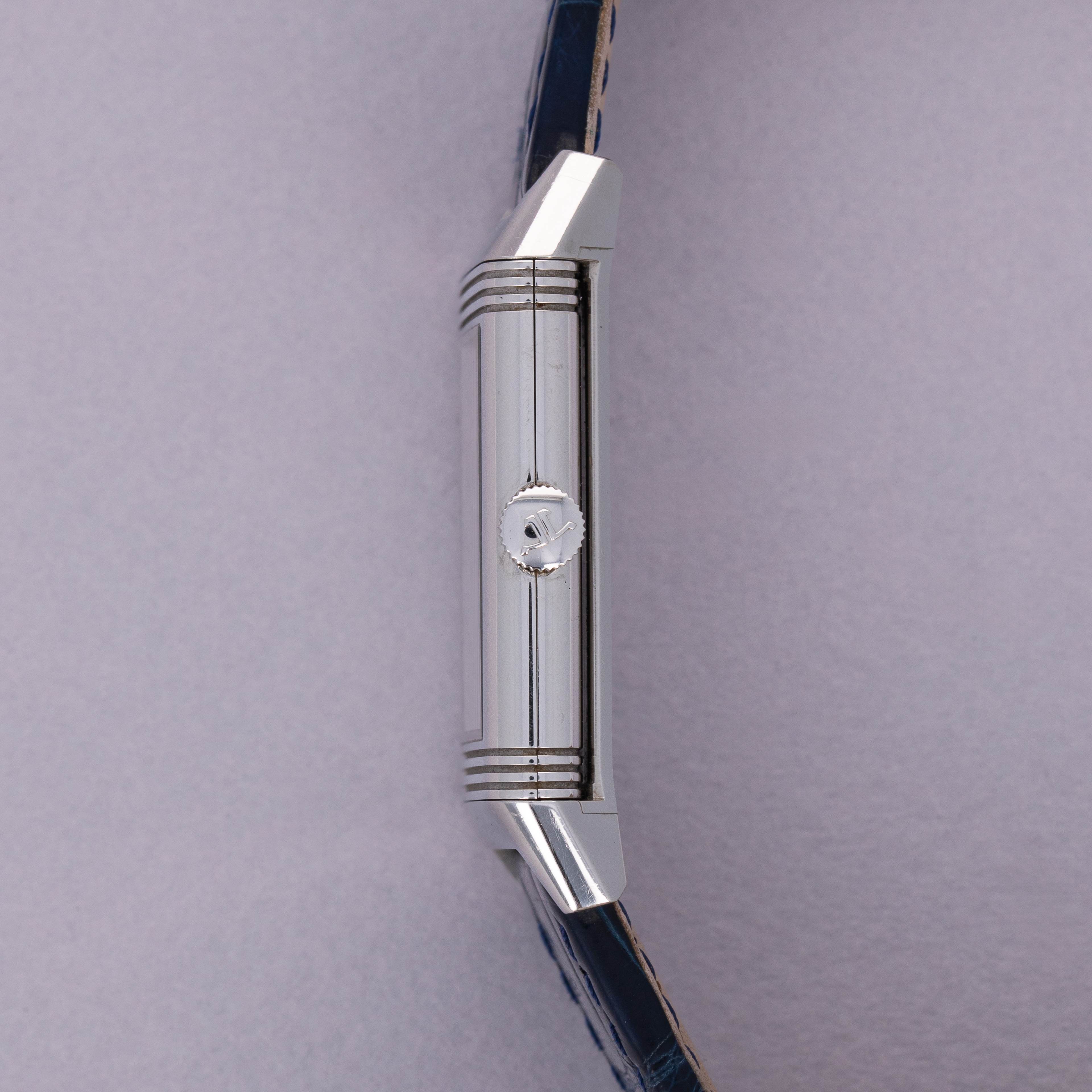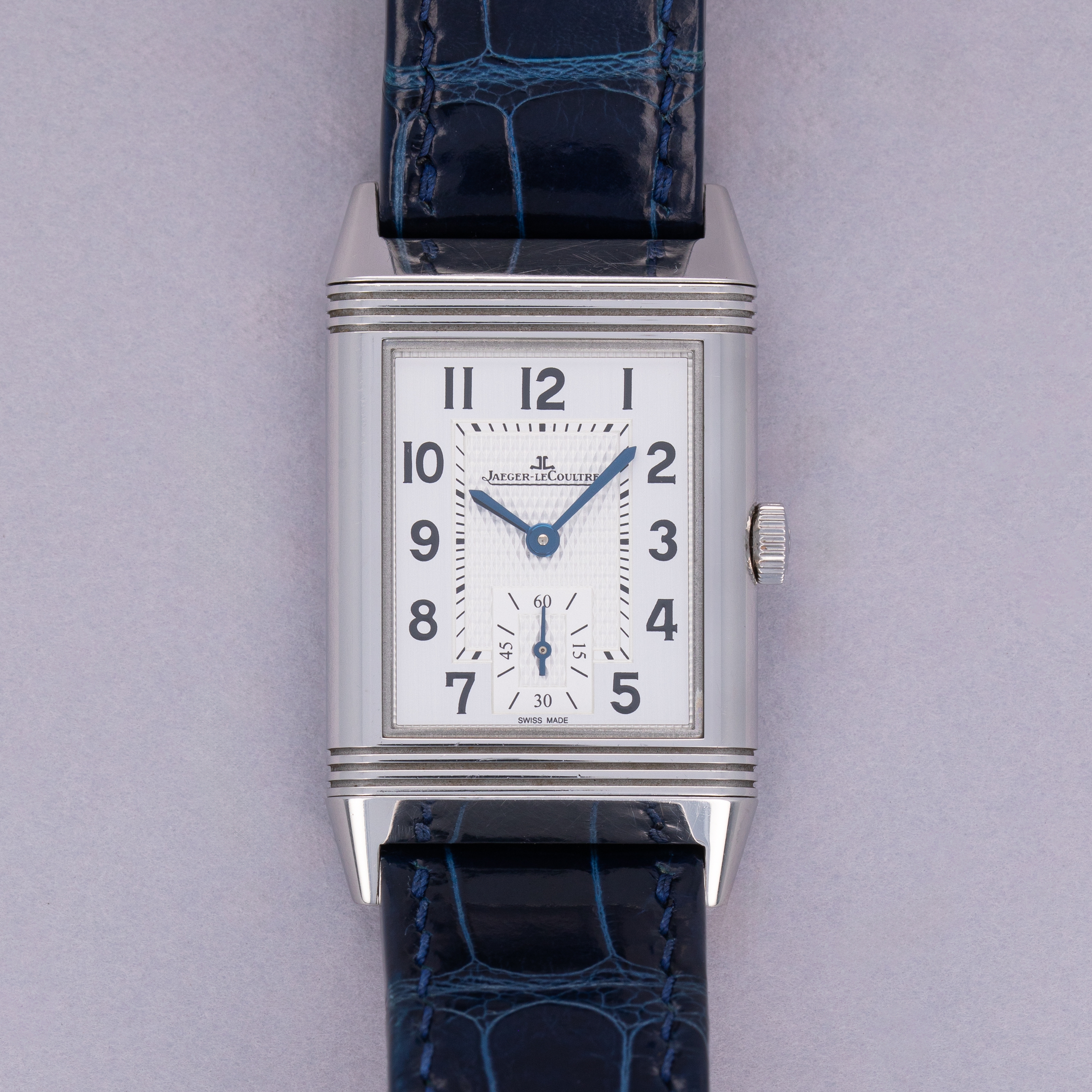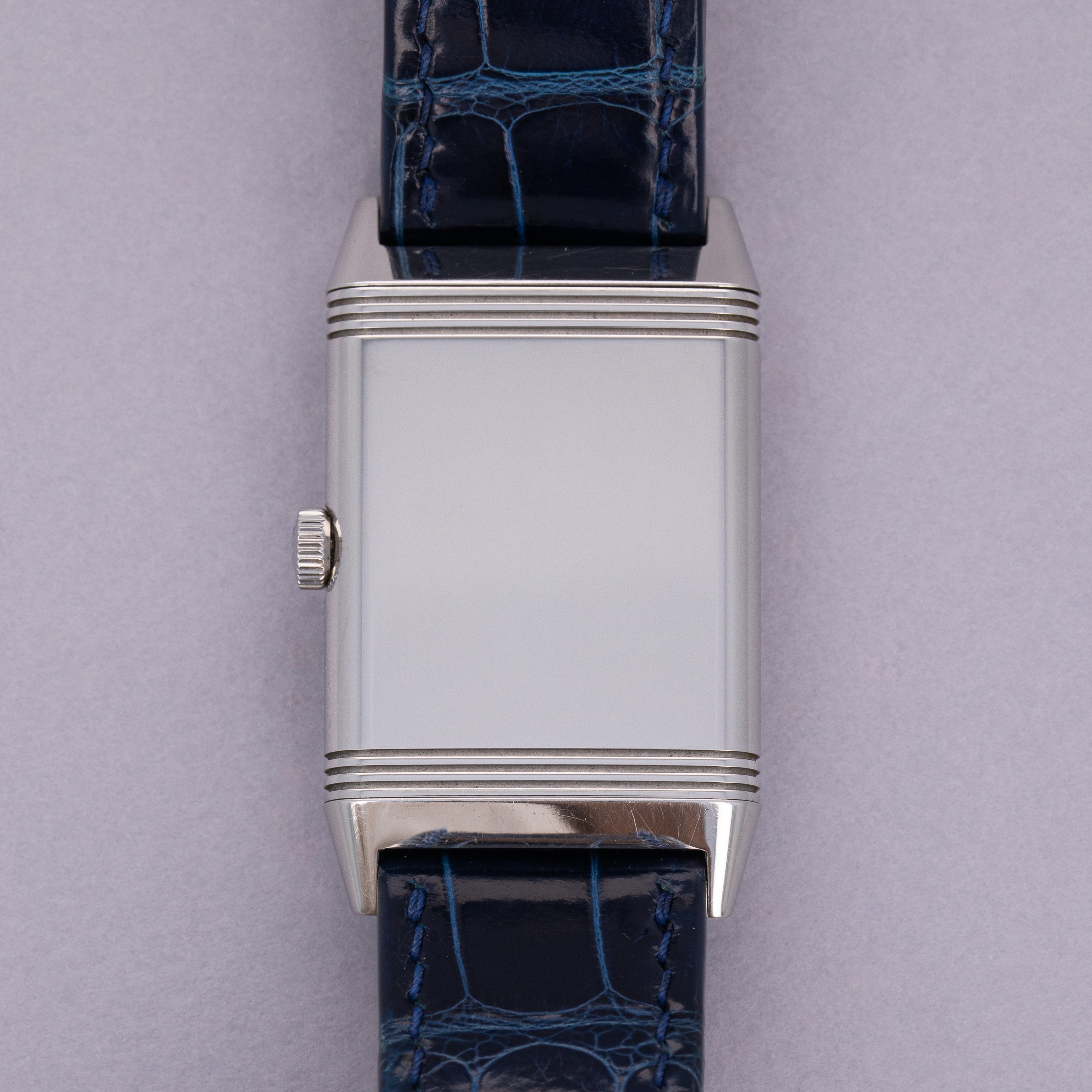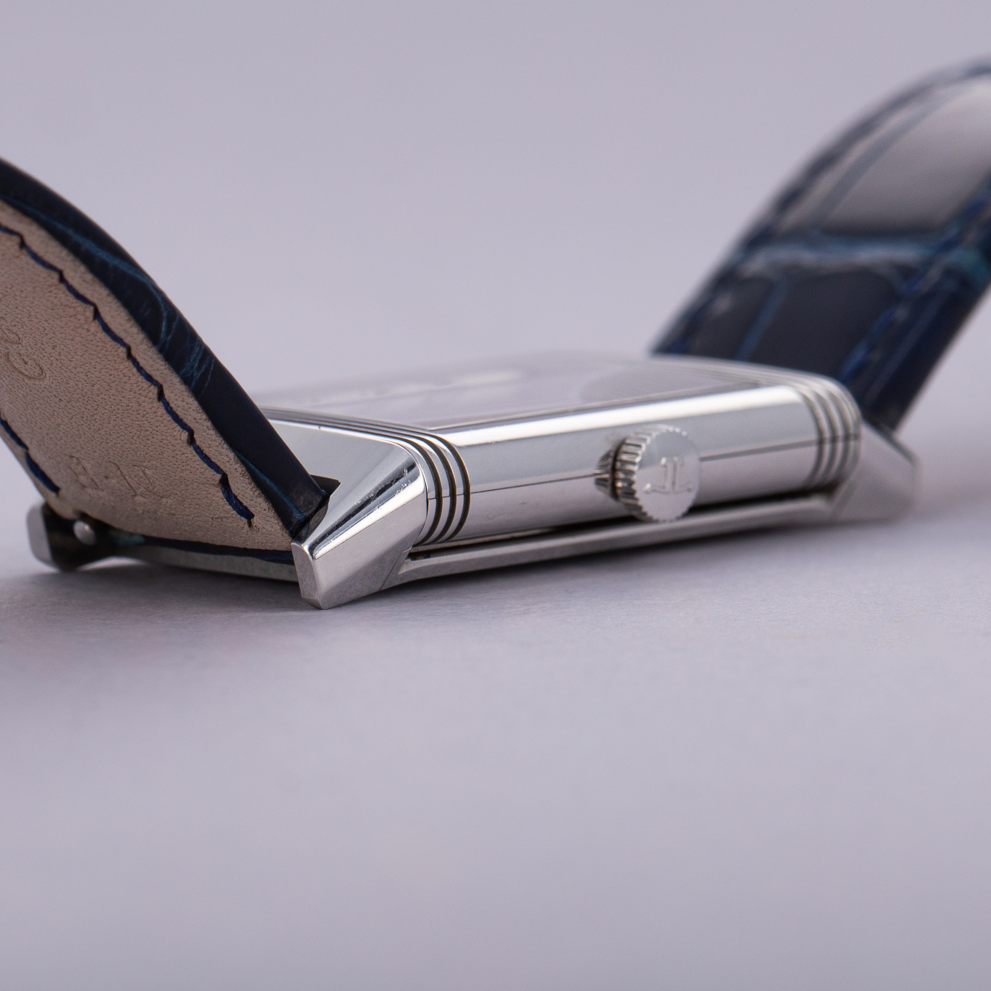 Featuring an immensely classical silver dial, this example boasts smart Arabic numerals along with blued steel hands, guilloche engraving and a running small seconds subdial that all combine to ensure that this Reverso's iconic monochrome silver display is a delight to behold.