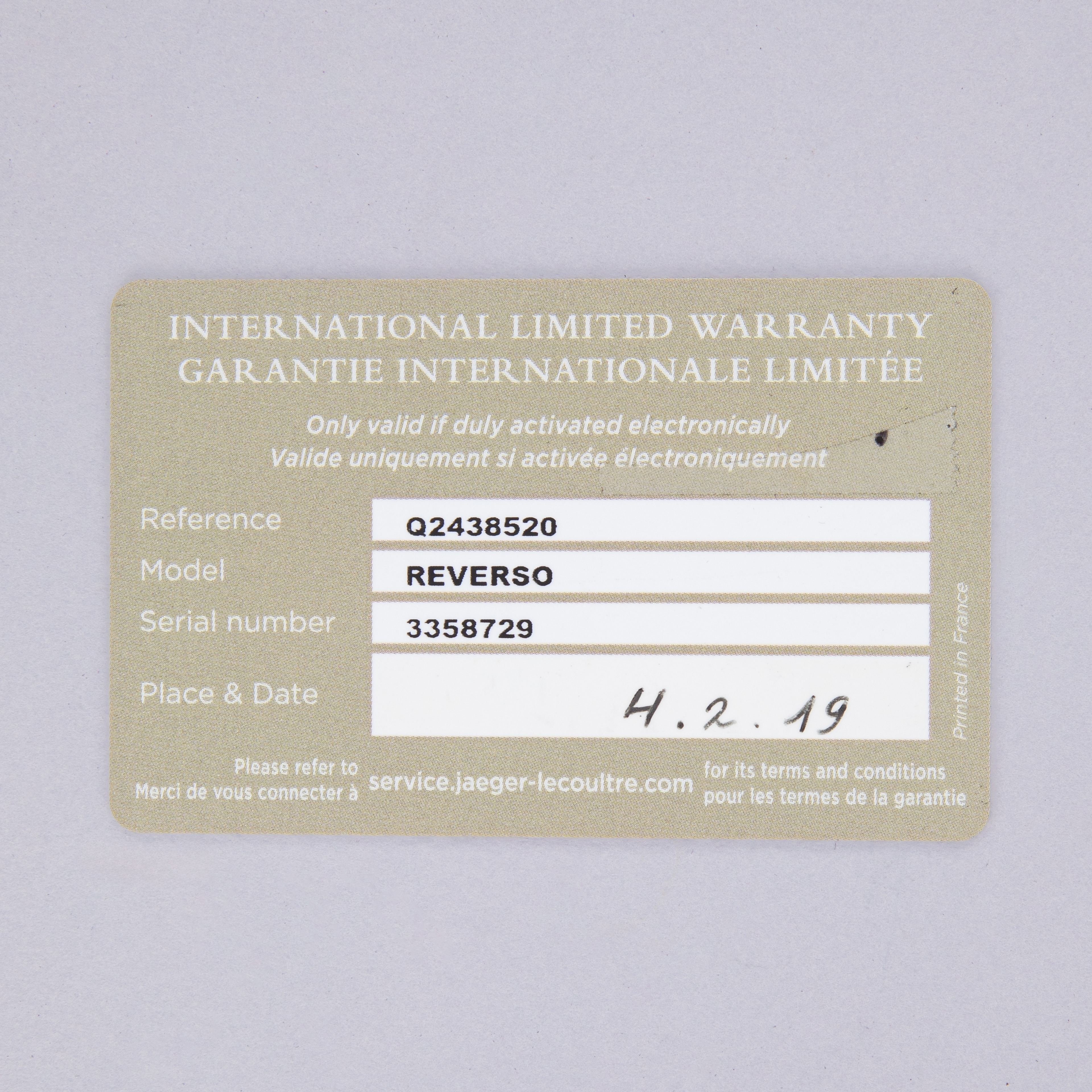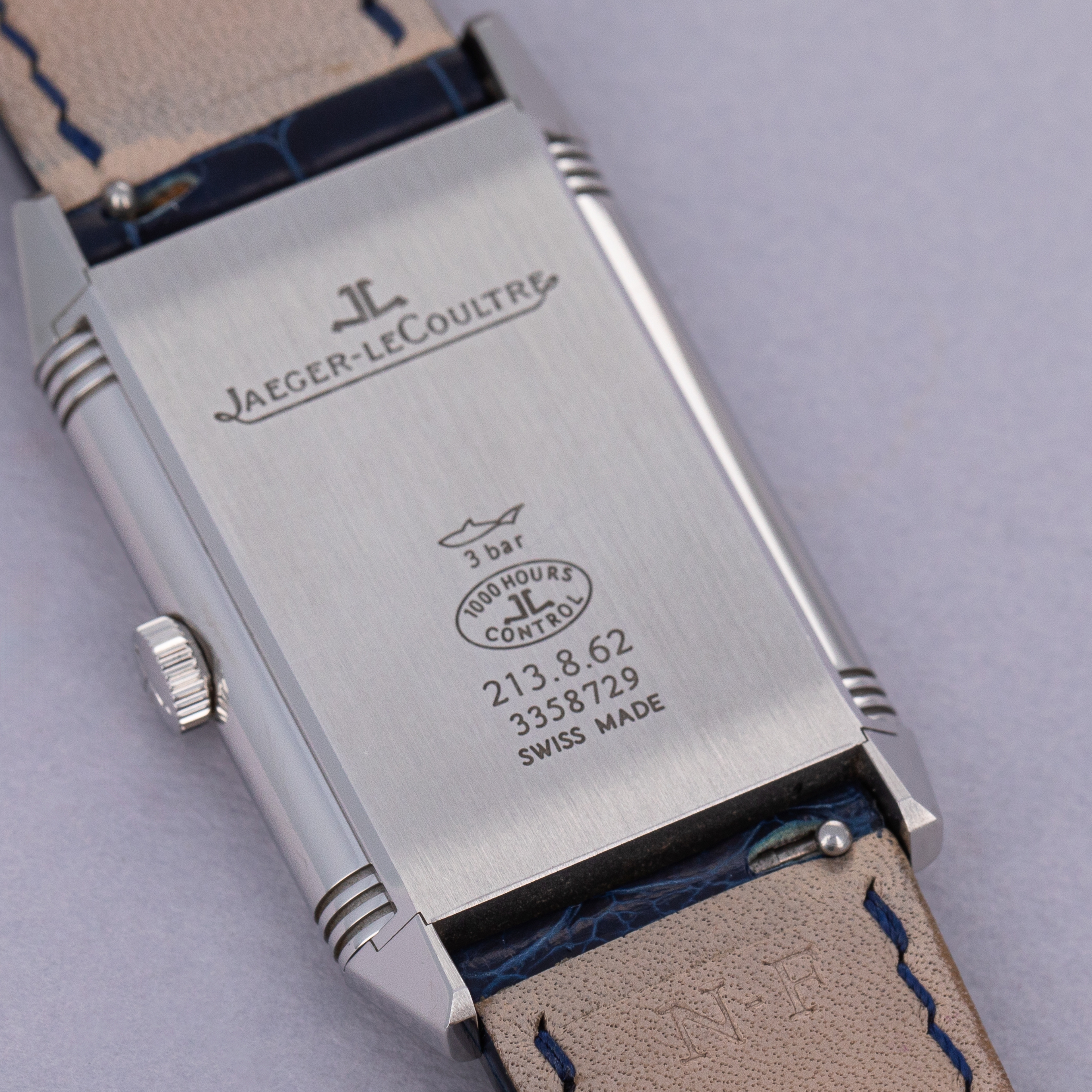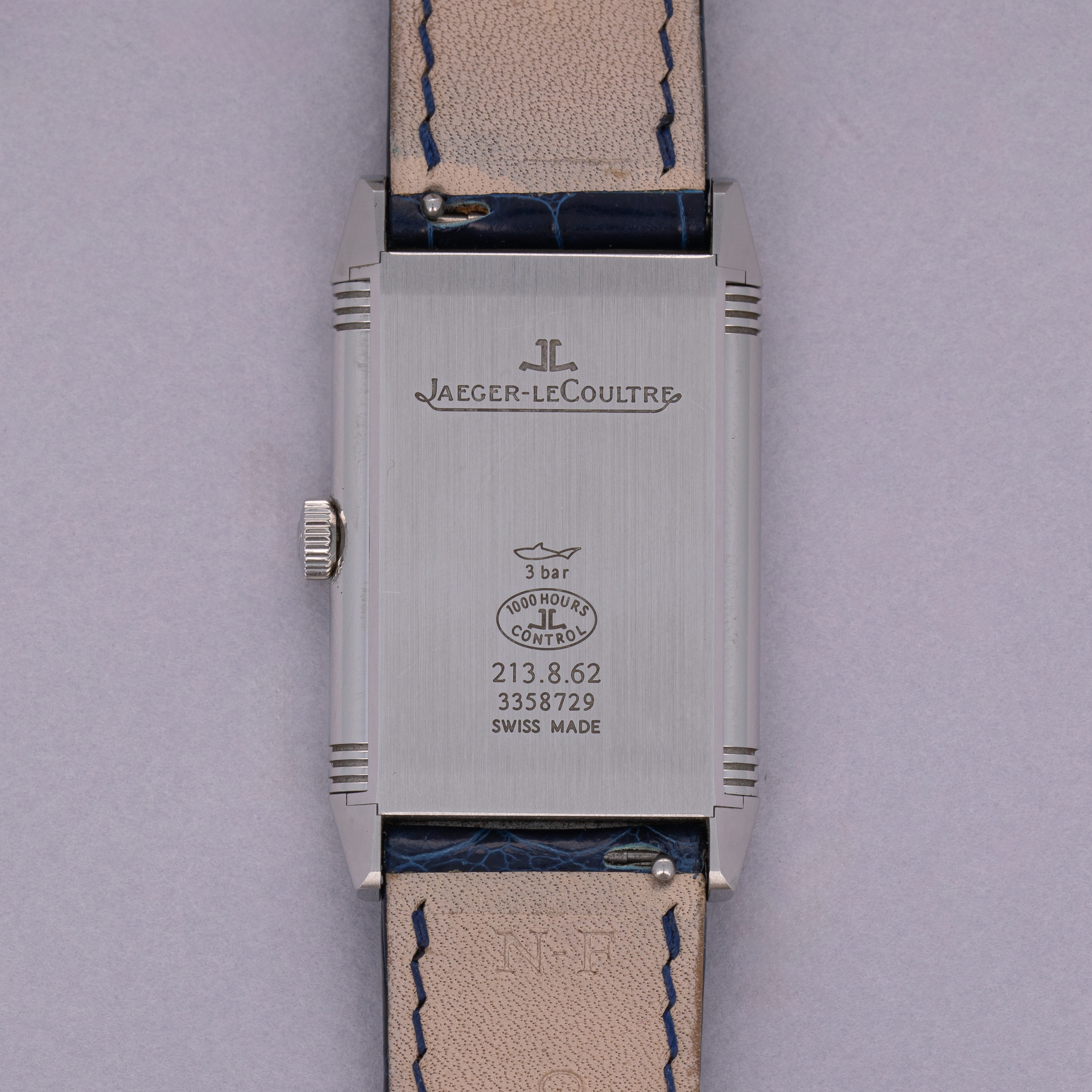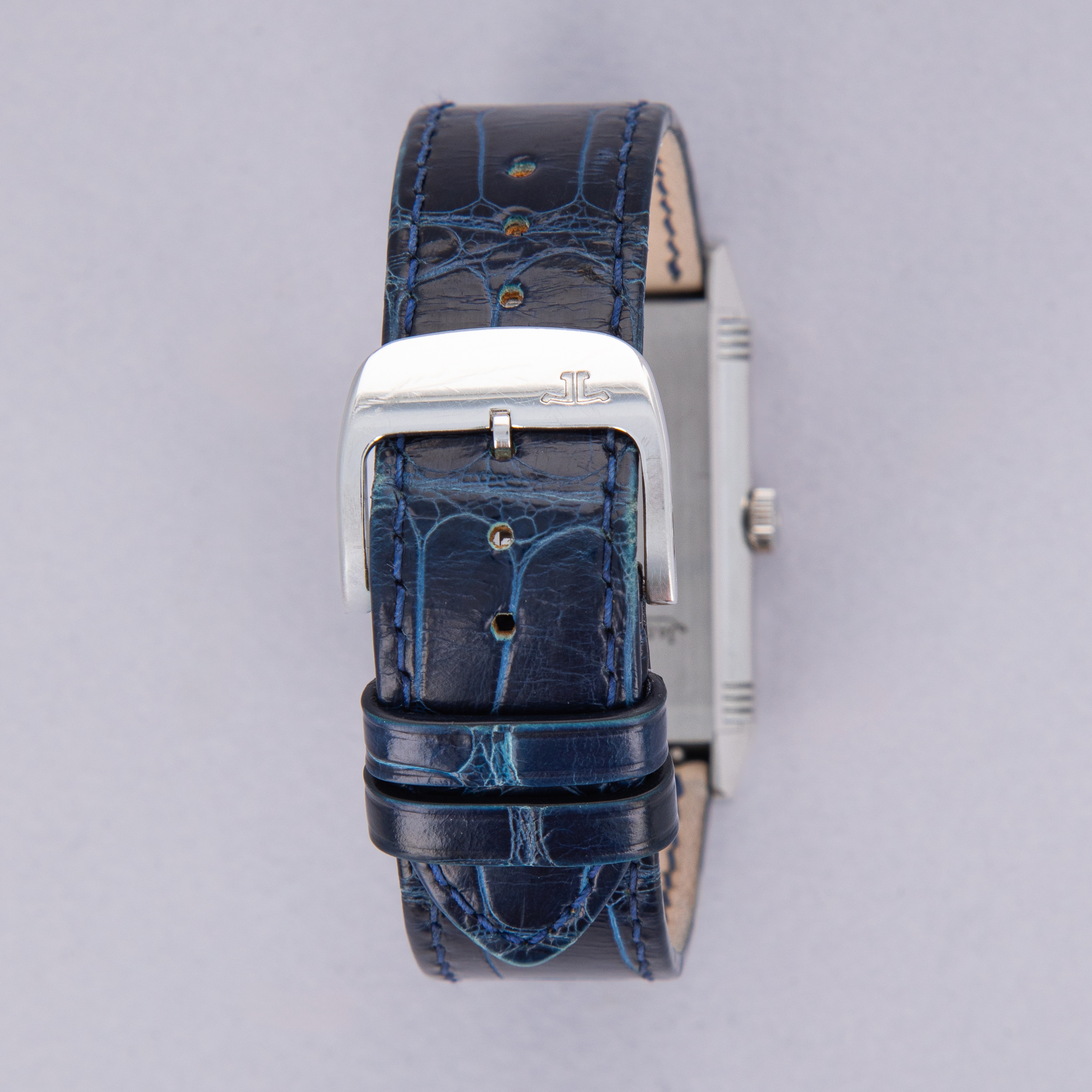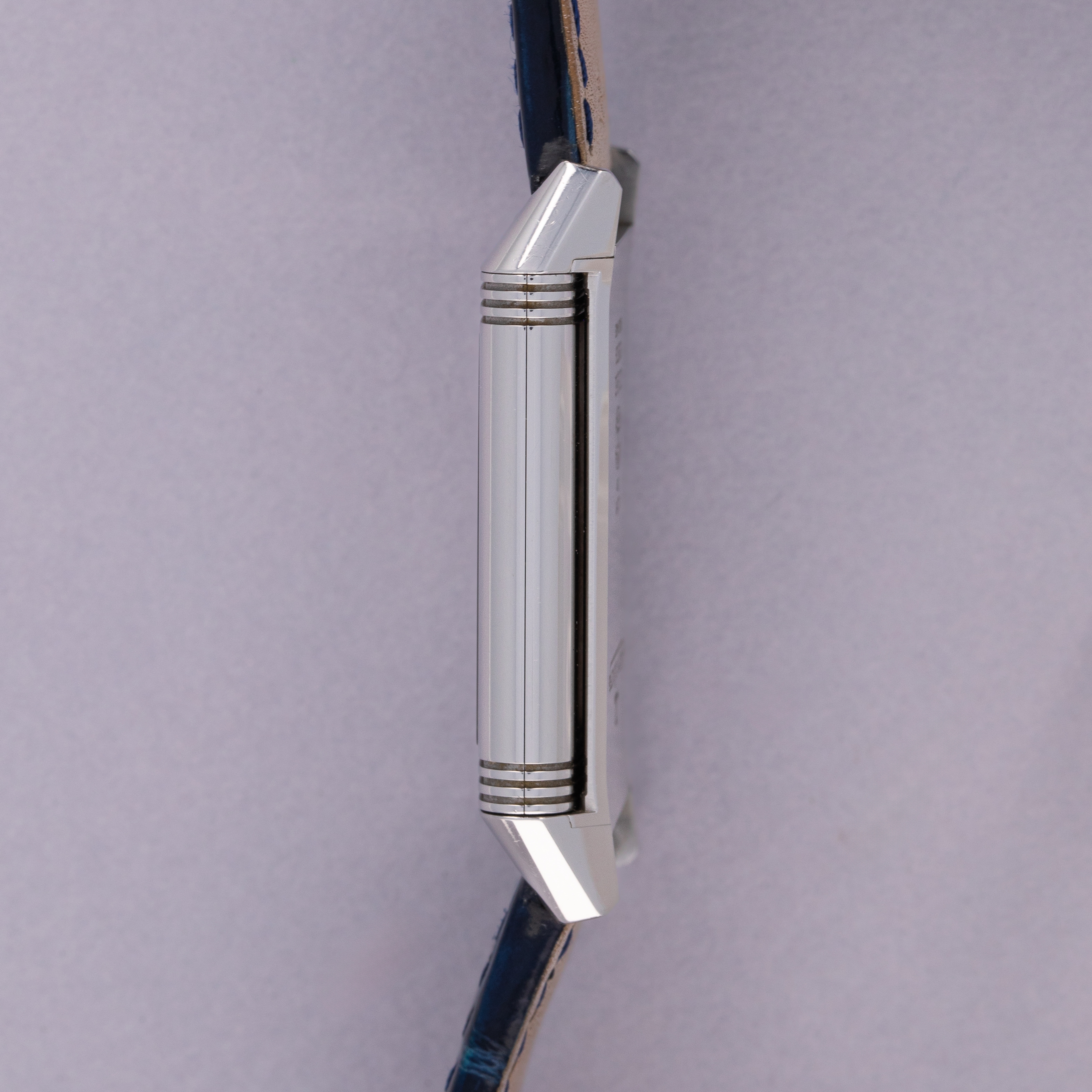 Featuring an immensely classical silver dial, this example boasts smart Arabic numerals along with blued steel hands, guilloche engraving and a running small seconds subdial that all combine to ensure that this Reverso's iconic monochrome silver display is a delight to behold.