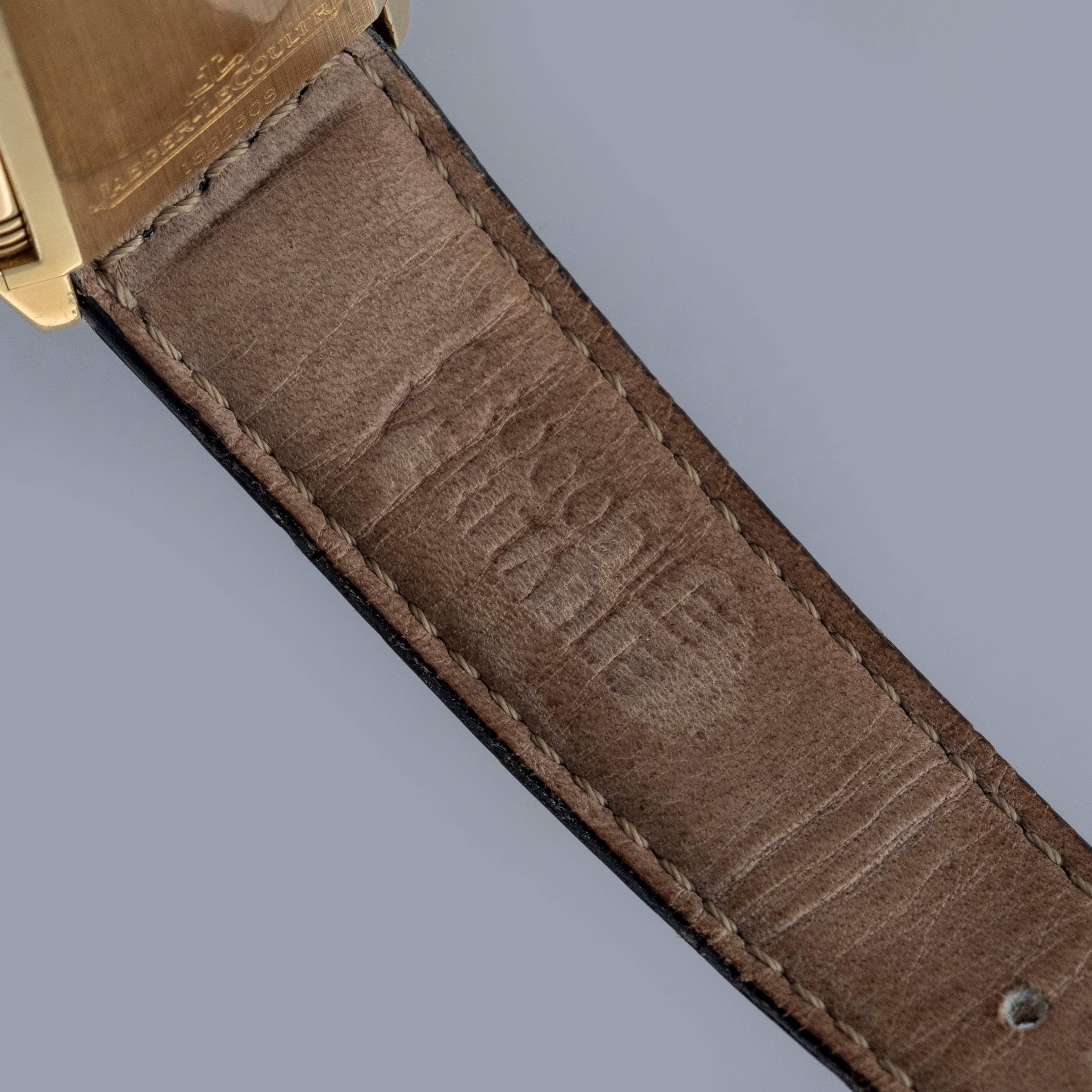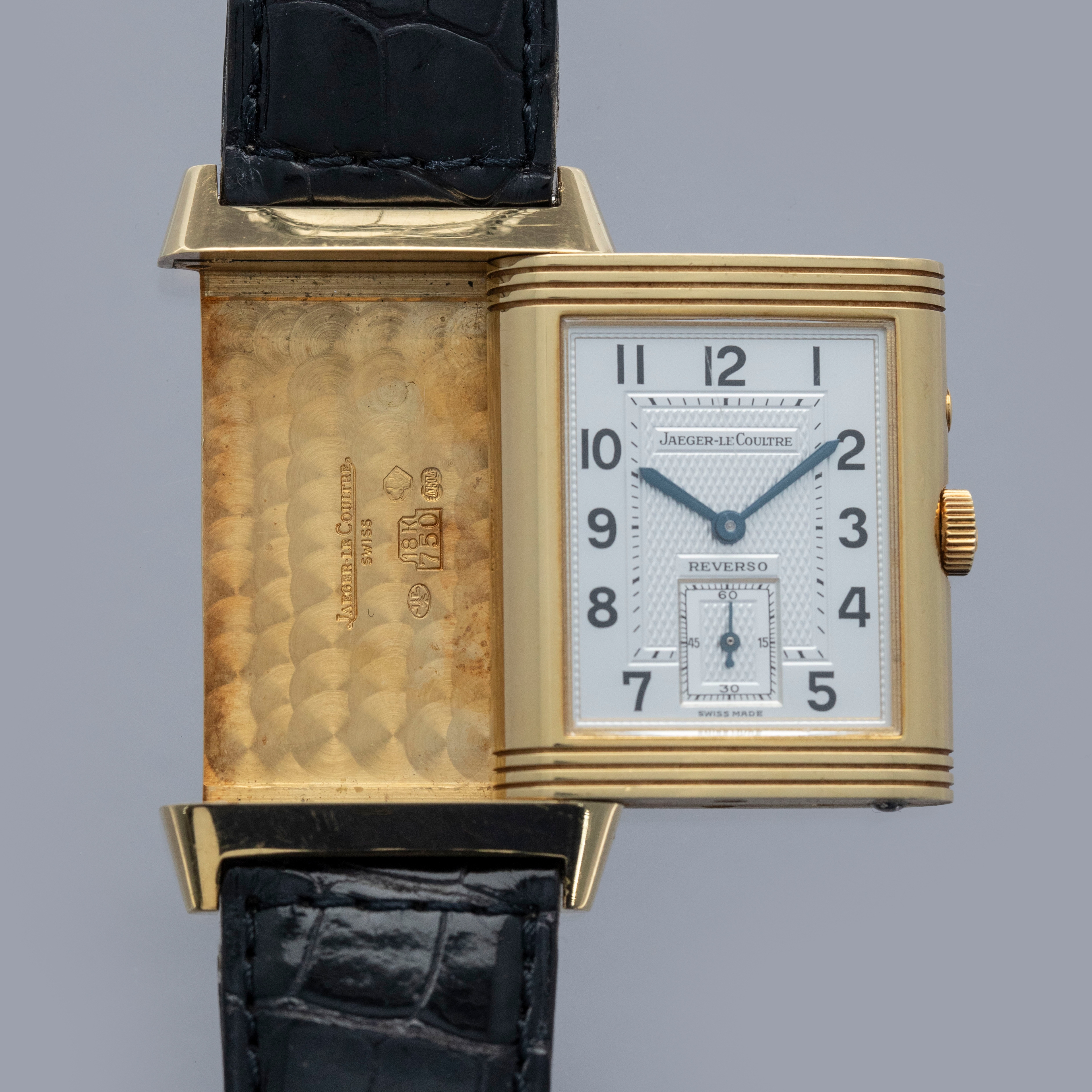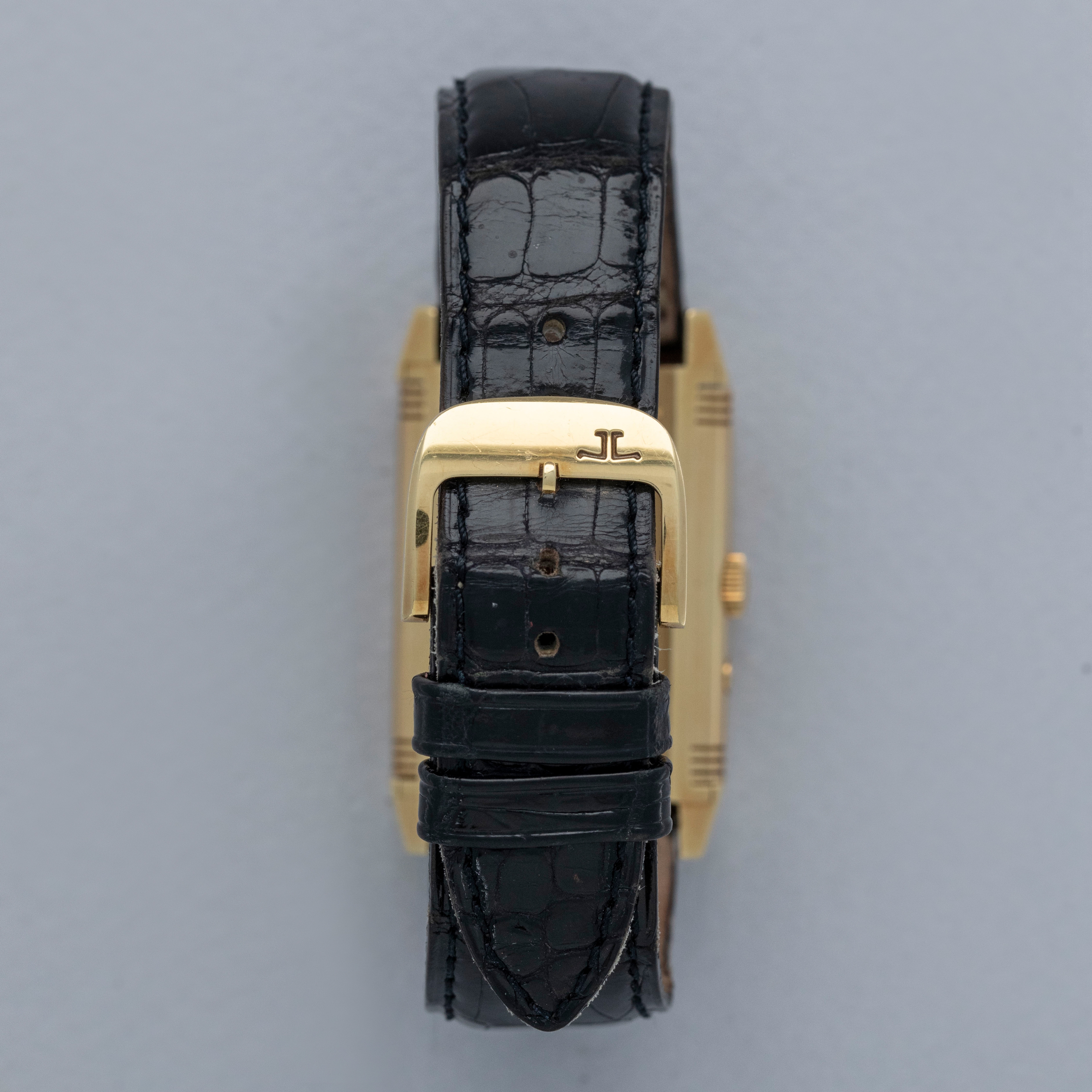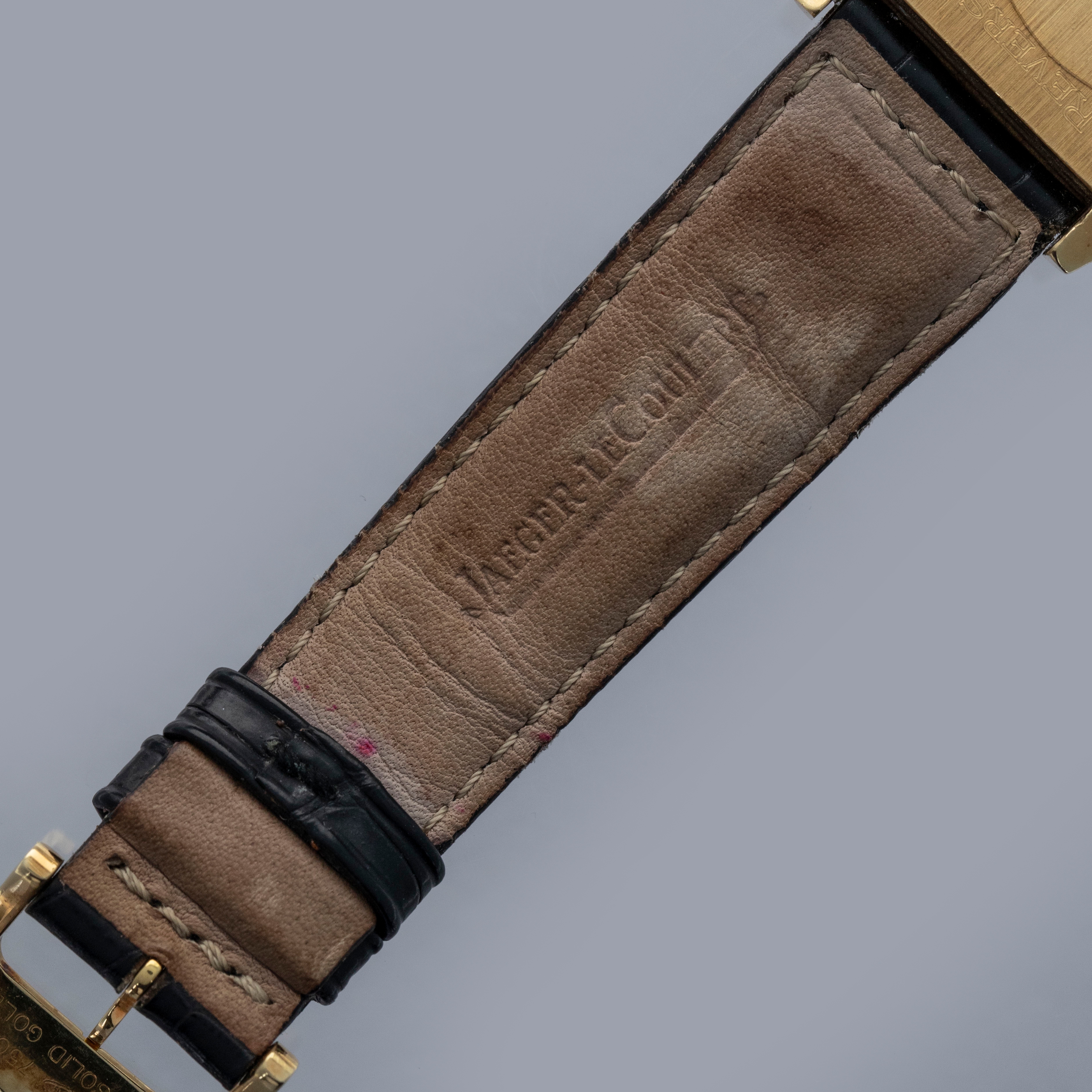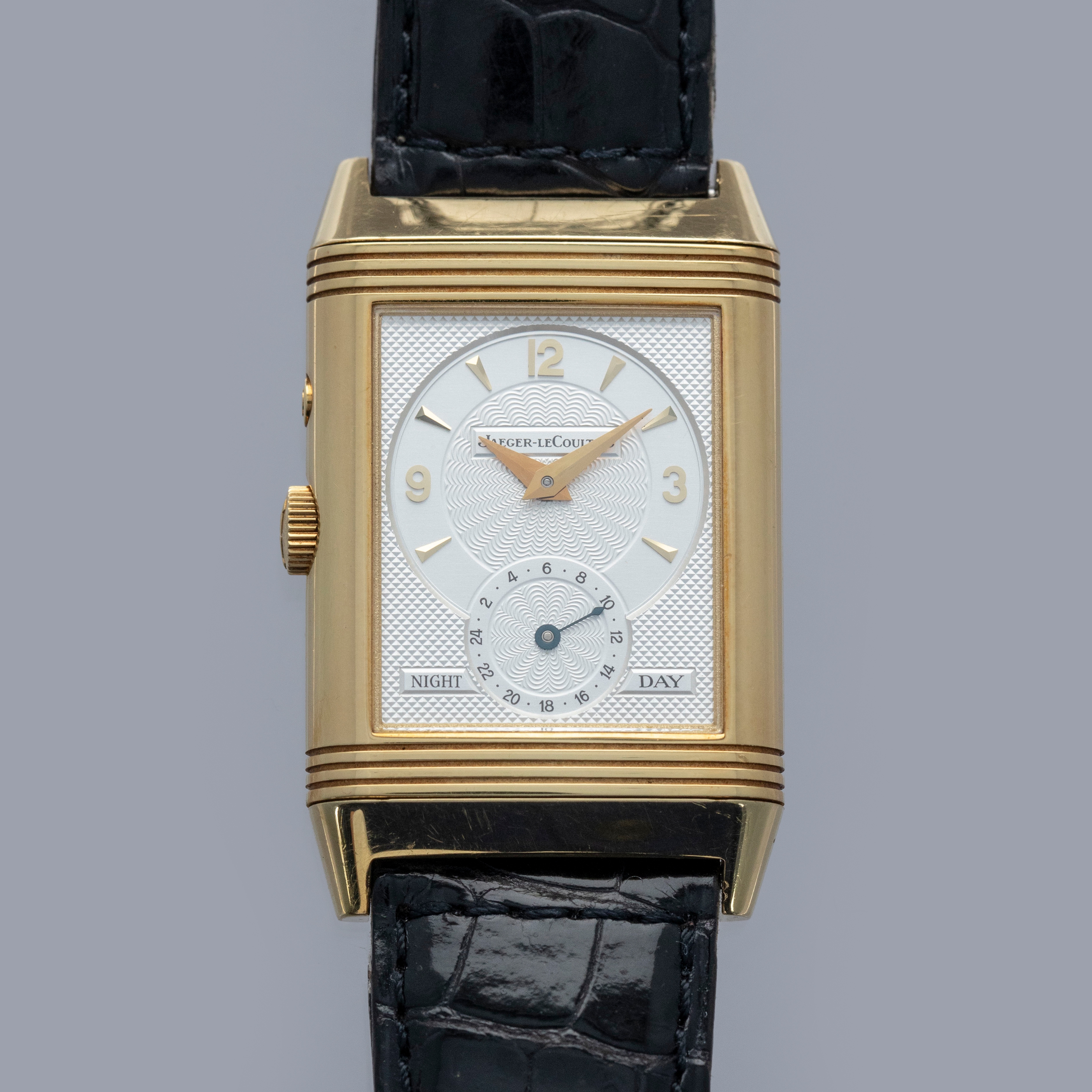 The watch is in overall excellent condition. The yellow gold case has surface scratches and marks. The case back engravings are all crisp. The Arabic hours dial is like new, with clean blued hands. Please note there is a long scratch and a few small chips around the edge of the crystal on this side. The night and day side dial is also like new, with clean gold hands and an excellent crystal. It is fitted with a black alligator Jaeger-LeCoultre strap in very good condition, and a yellow gold Jaeger-LeCoultre-signed pin buckle in excellent condition.