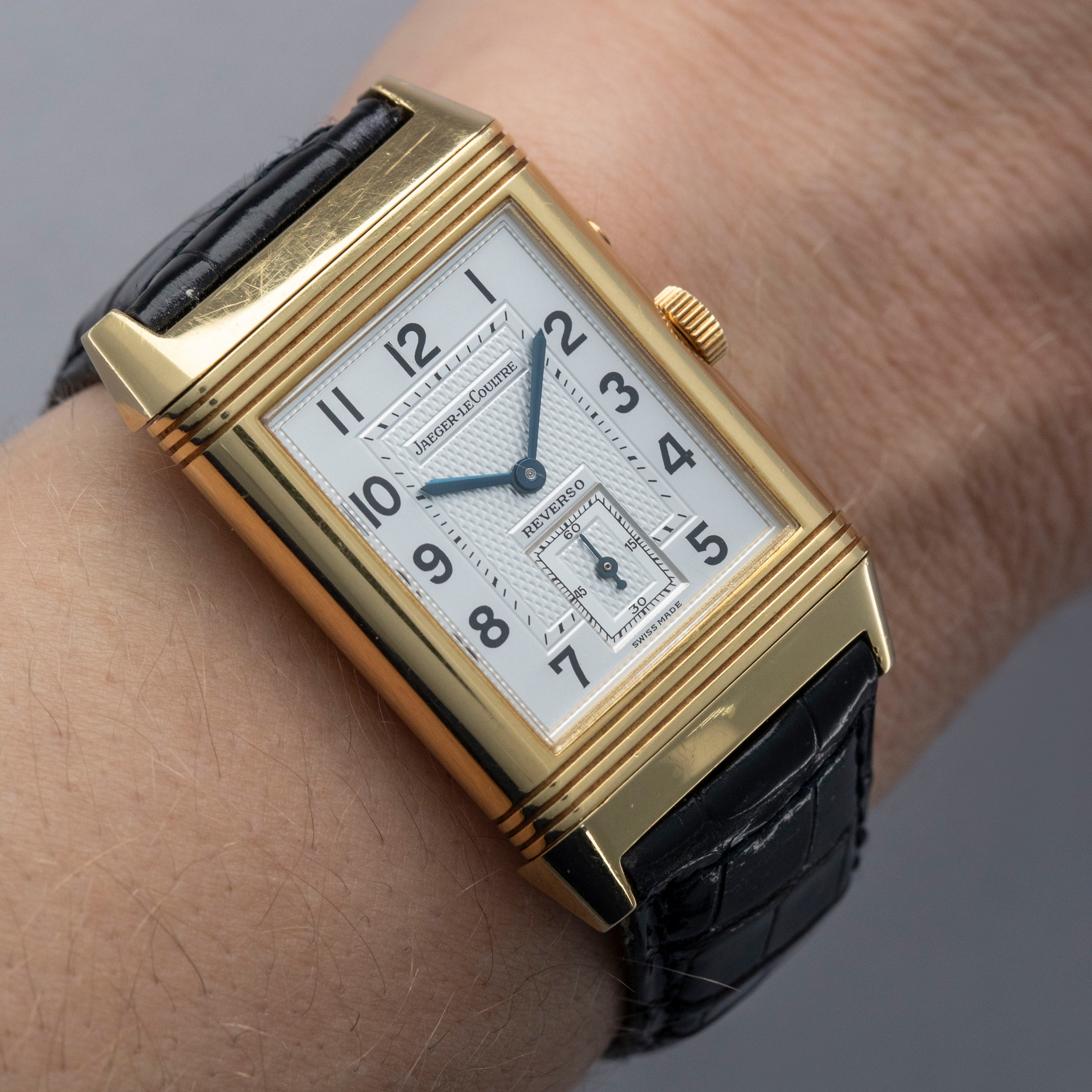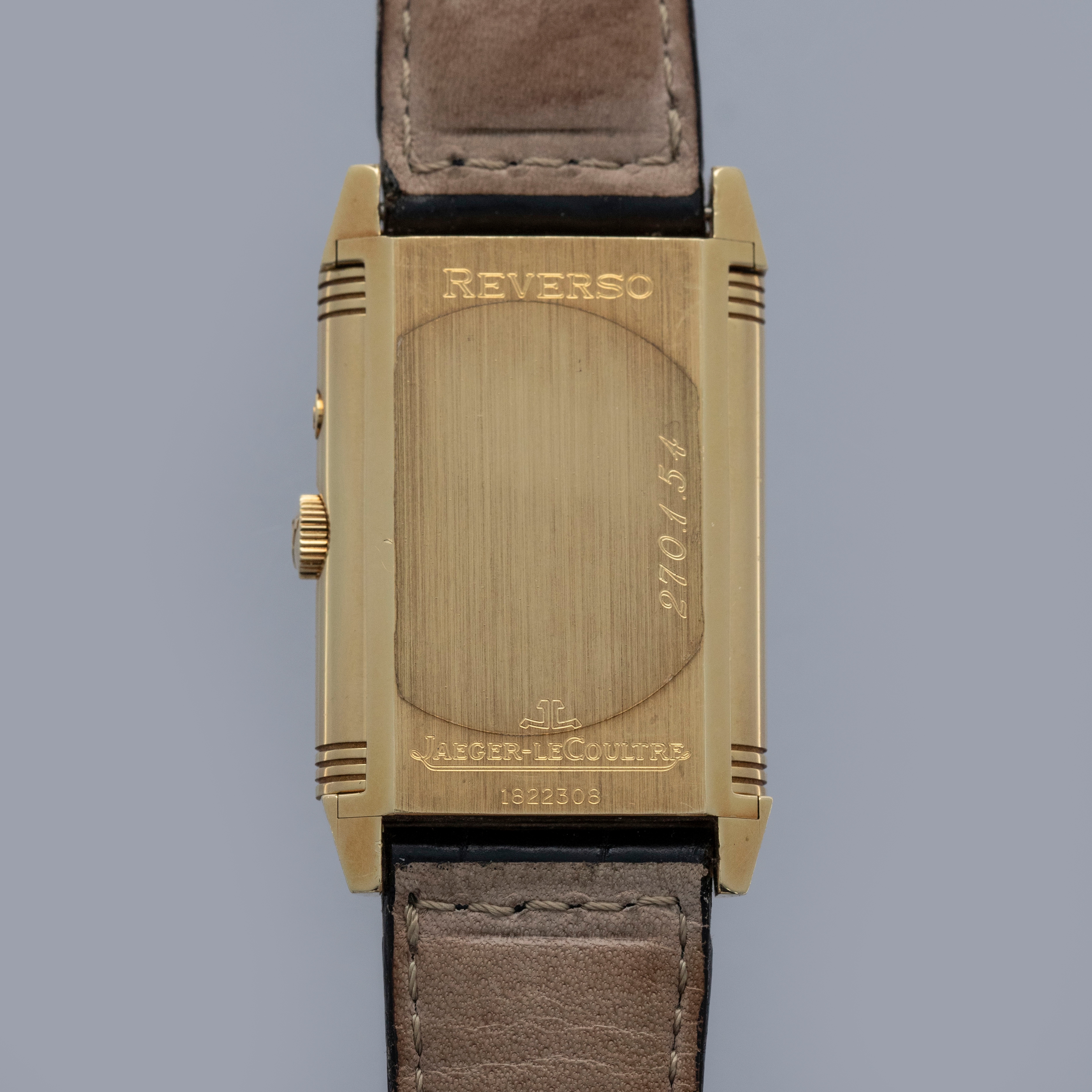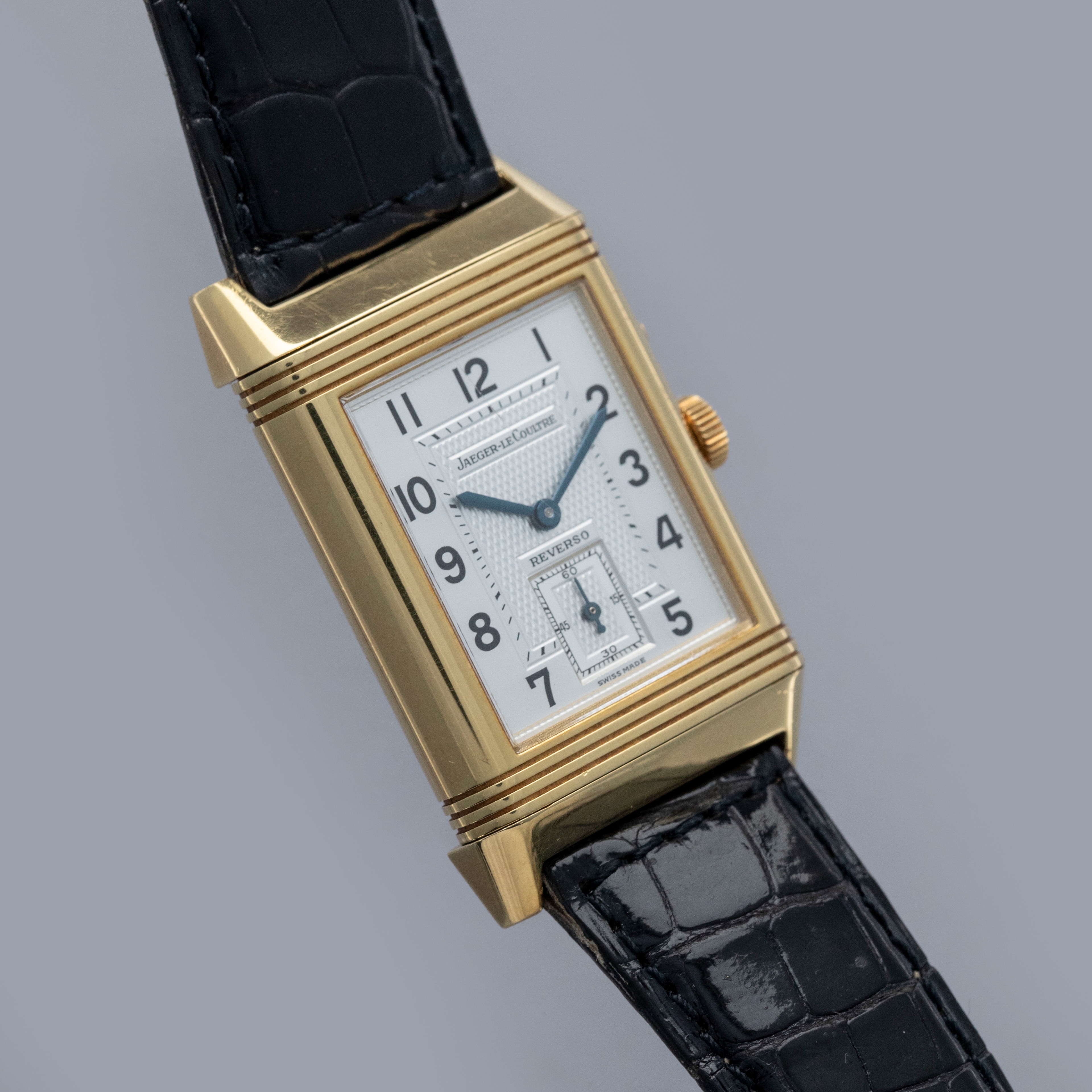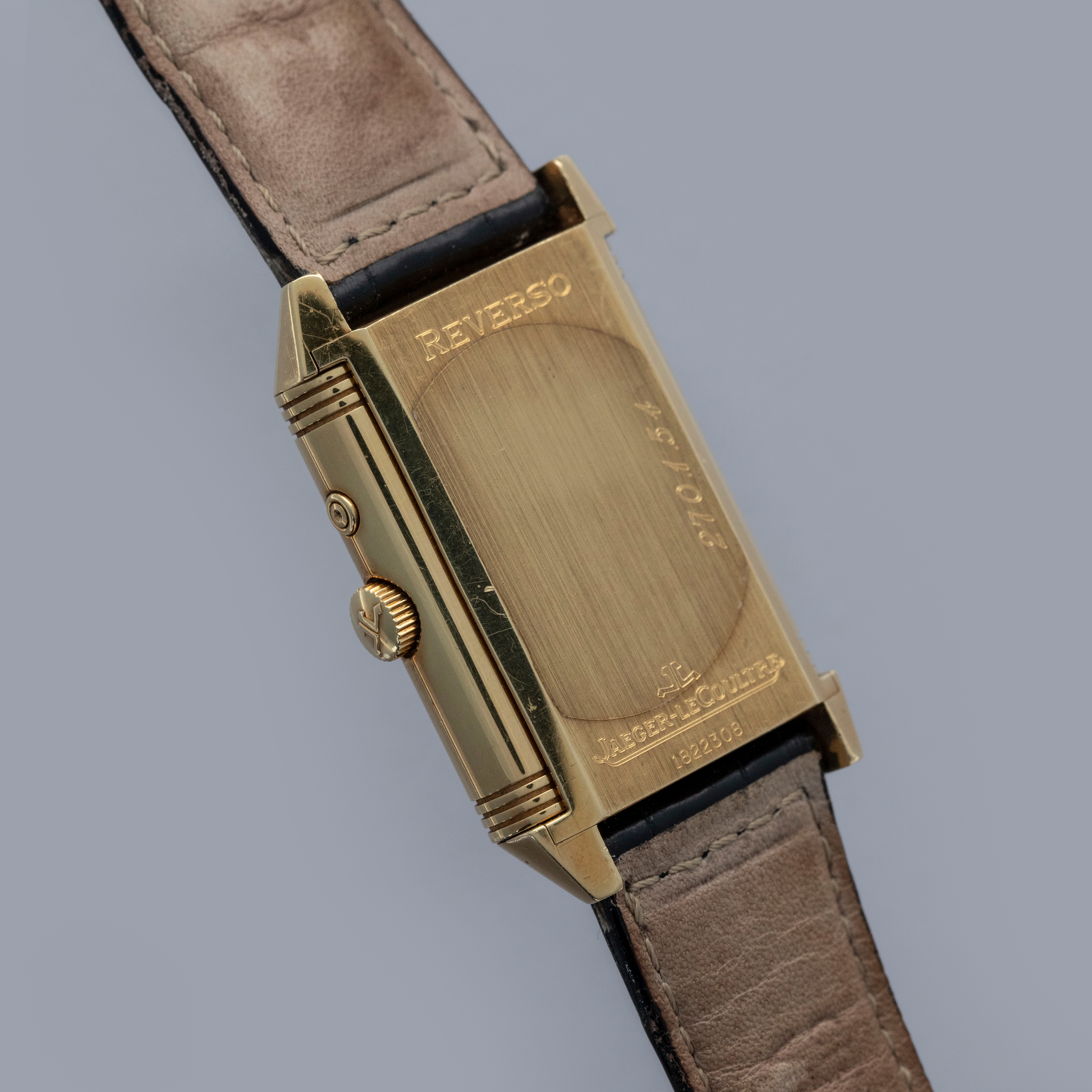 The watch is in overall excellent condition. The yellow gold case has surface scratches and marks. The case back engravings are all crisp. The Arabic hours dial is like new, with clean blued hands. Please note there is a long scratch and a few small chips around the edge of the crystal on this side. The night and day side dial is also like new, with clean gold hands and an excellent crystal. It is fitted with a black alligator Jaeger-LeCoultre strap in very good condition, and a yellow gold Jaeger-LeCoultre-signed pin buckle in excellent condition.