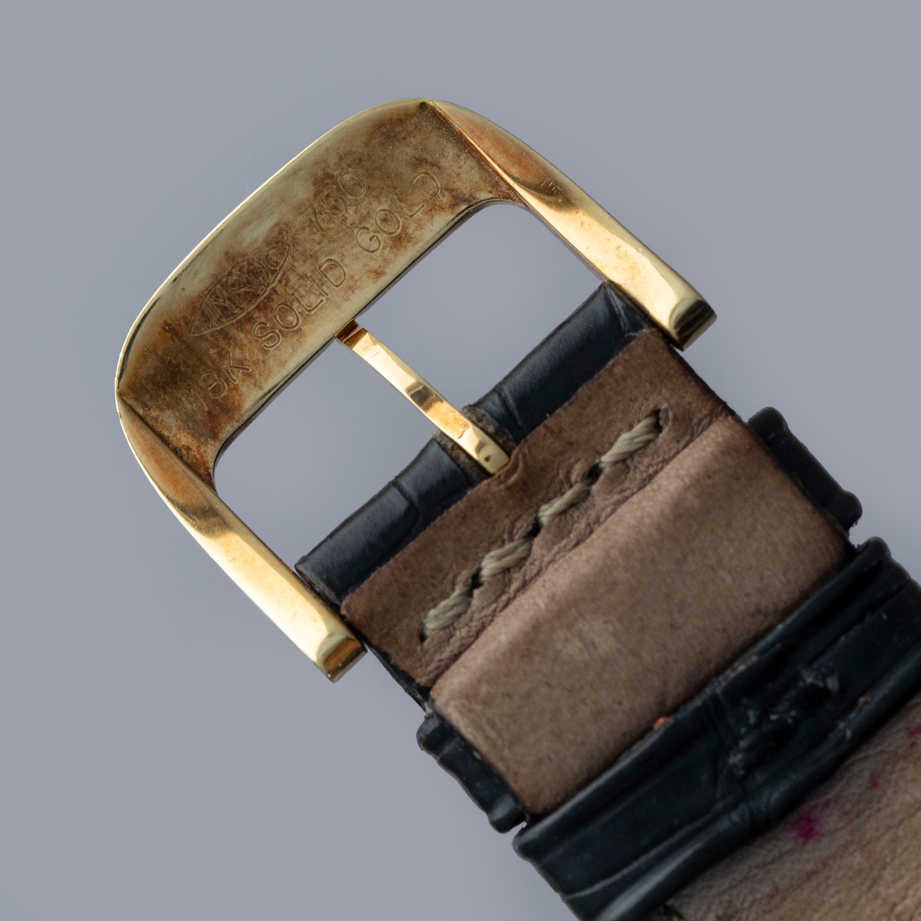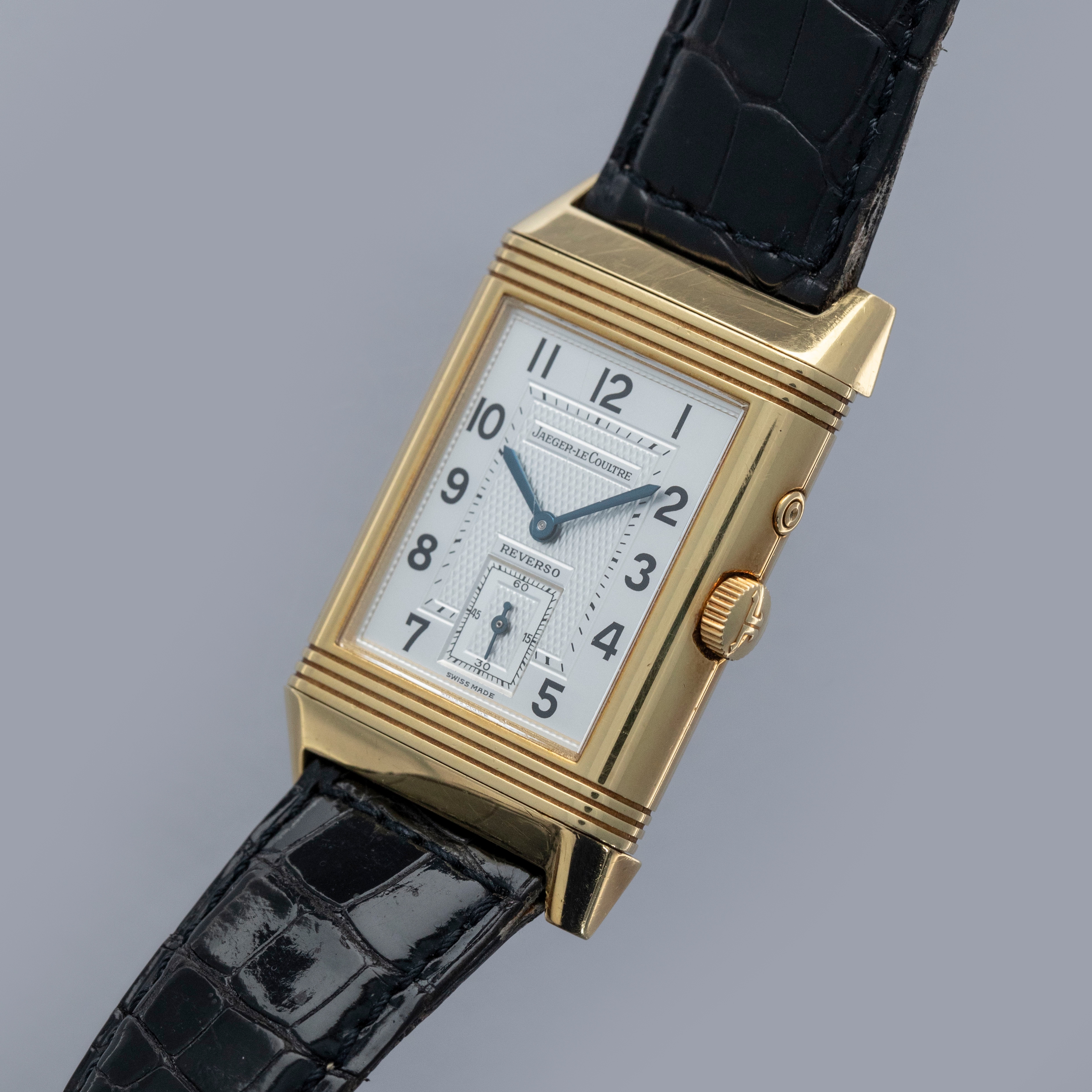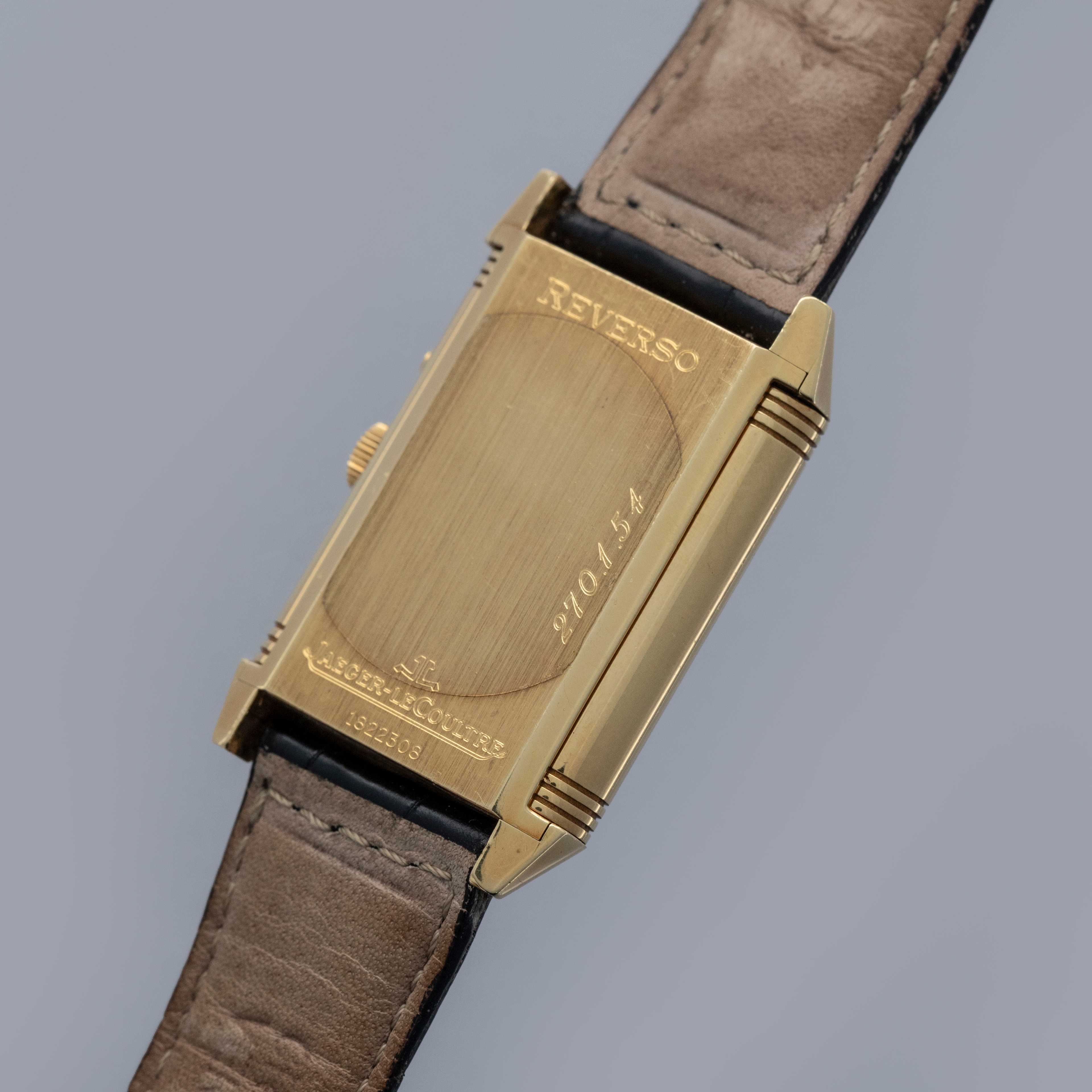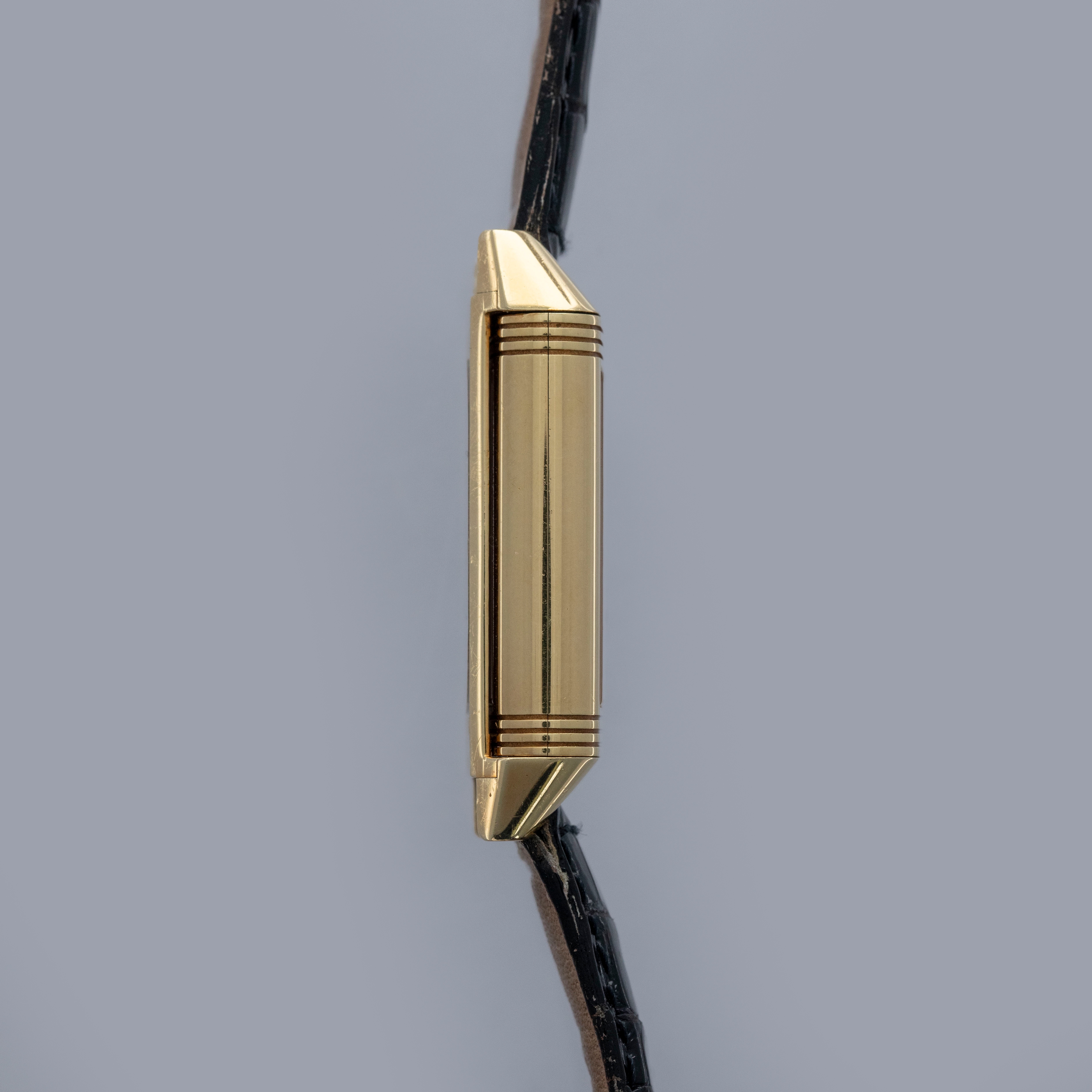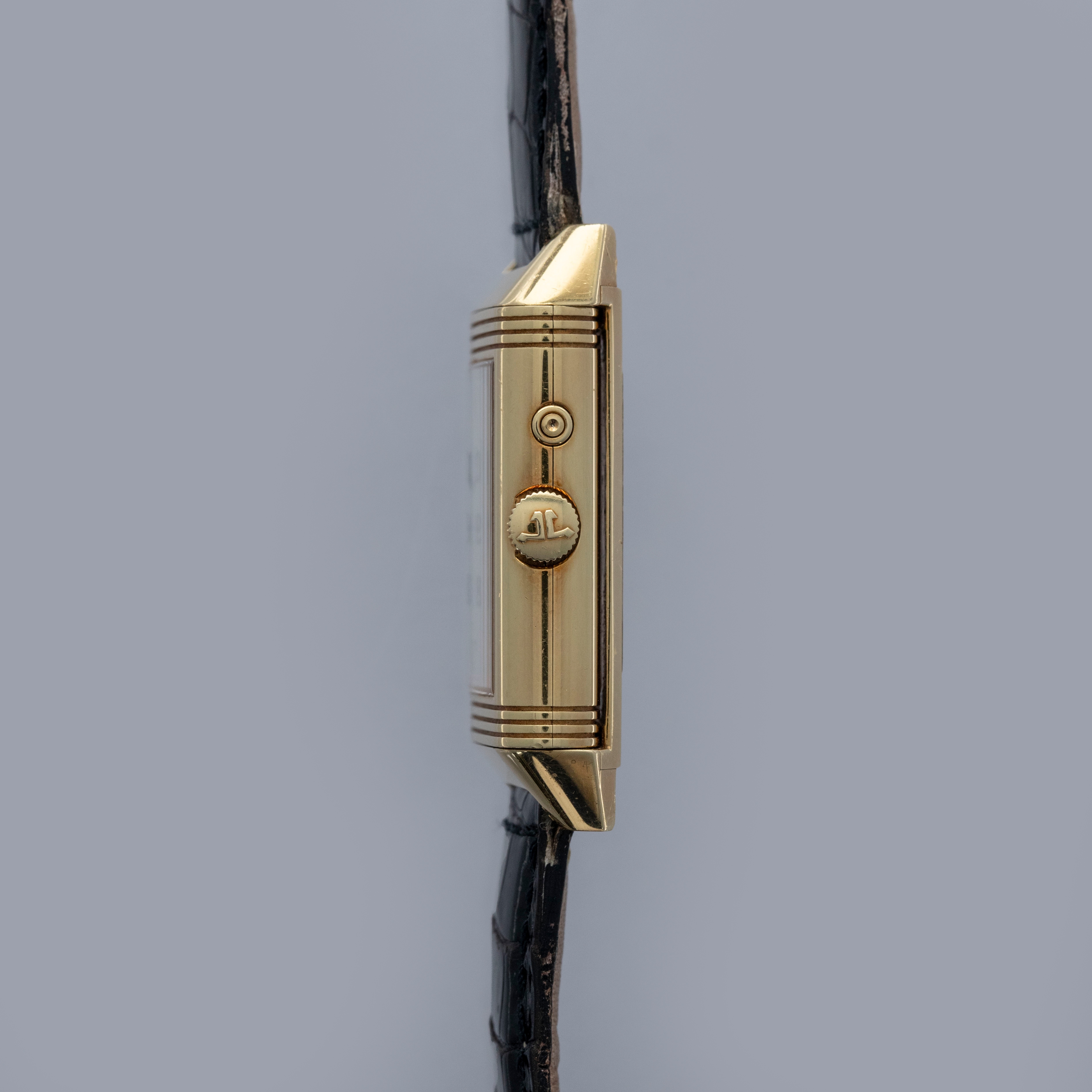 The watch is in overall excellent condition. The yellow gold case has surface scratches and marks. The case back engravings are all crisp. The Arabic hours dial is like new, with clean blued hands. Please note there is a long scratch and a few small chips around the edge of the crystal on this side. The night and day side dial is also like new, with clean gold hands and an excellent crystal. It is fitted with a black alligator Jaeger-LeCoultre strap in very good condition, and a yellow gold Jaeger-LeCoultre-signed pin buckle in excellent condition.