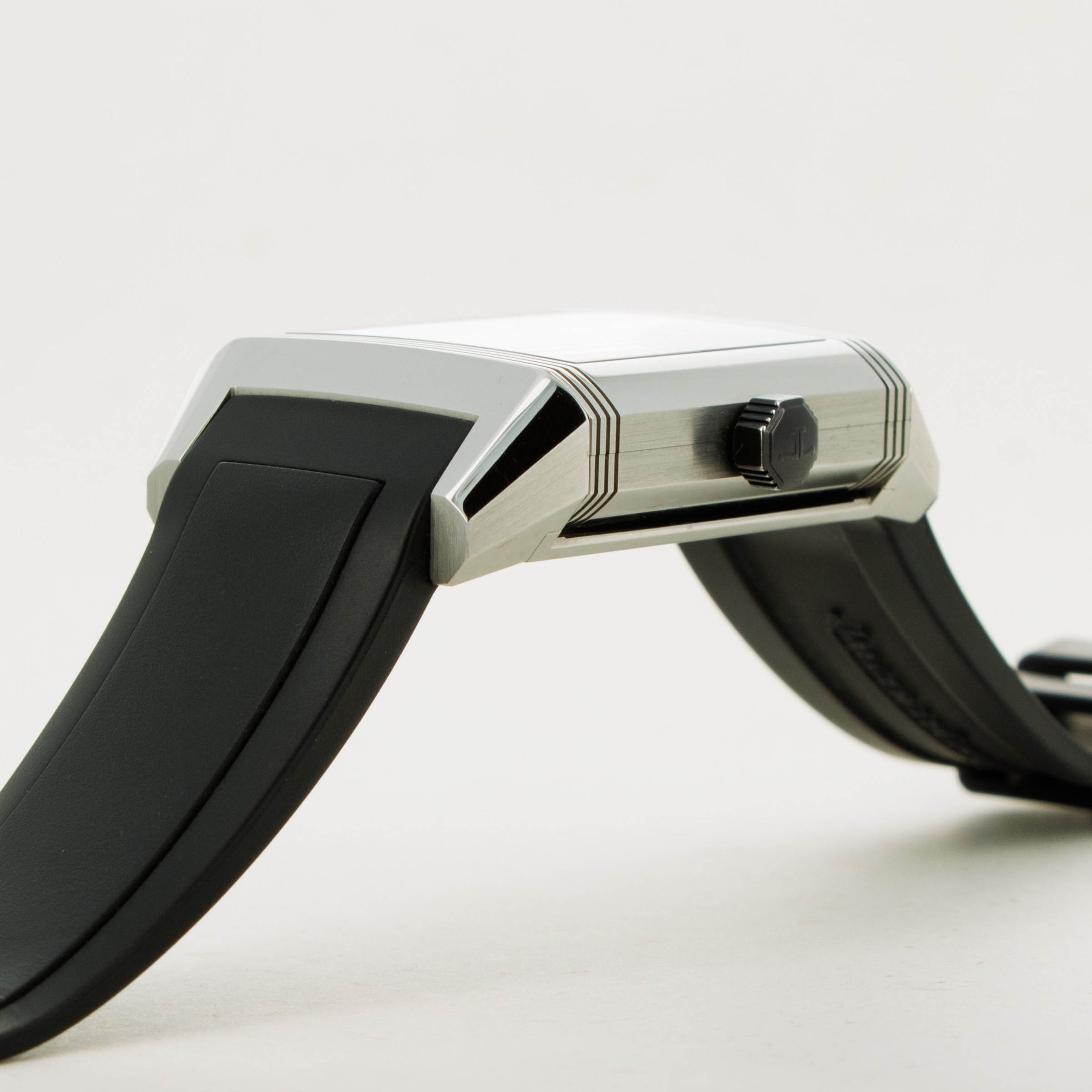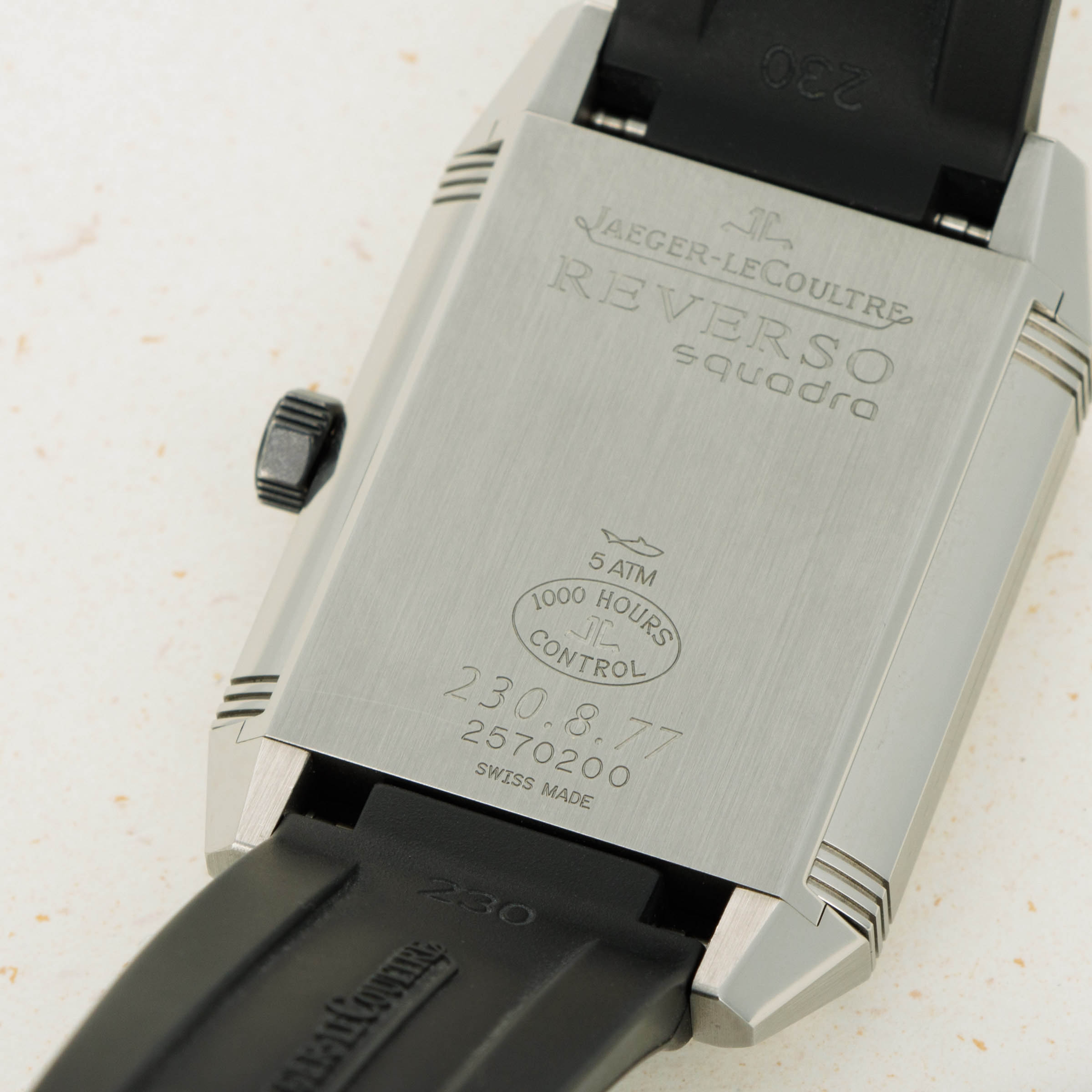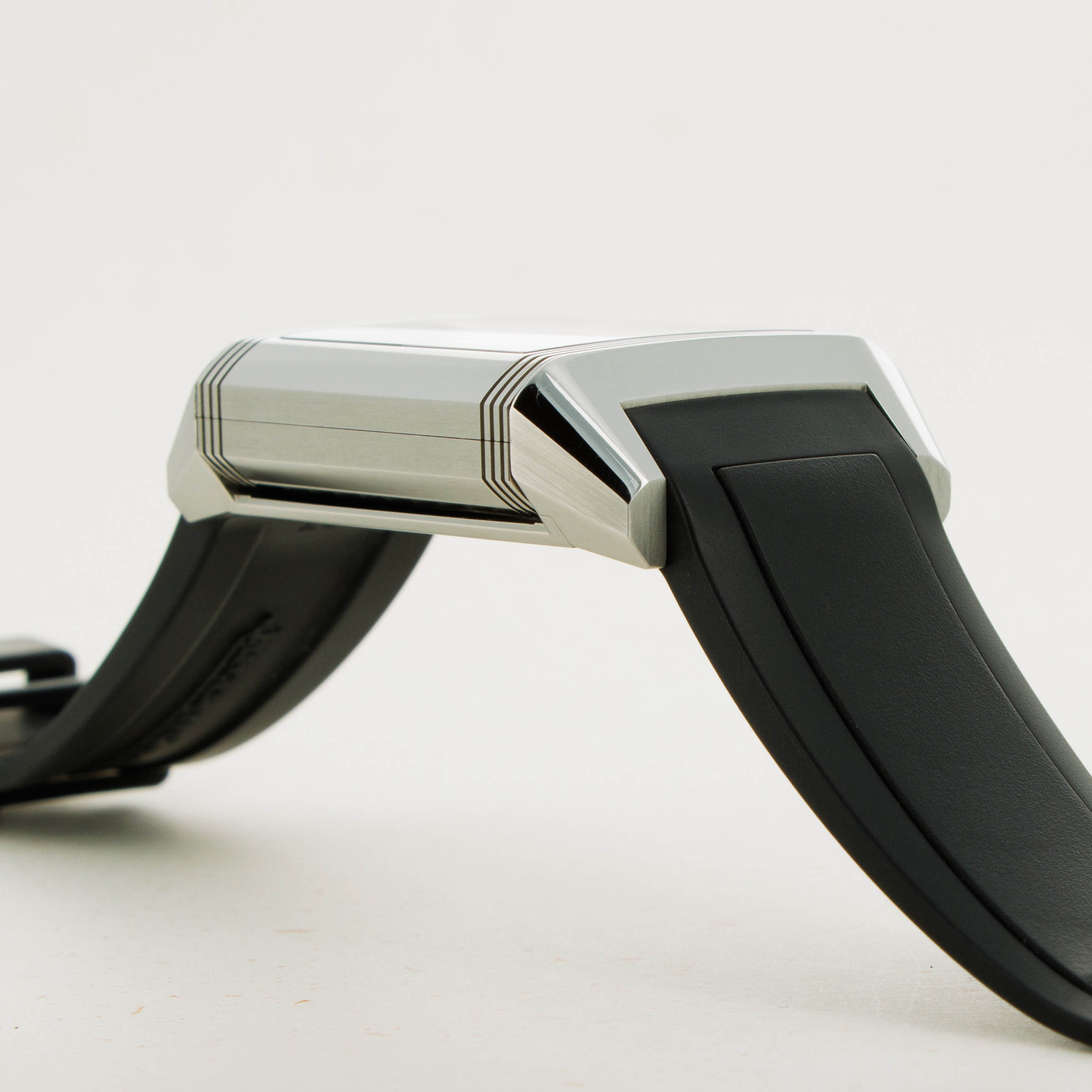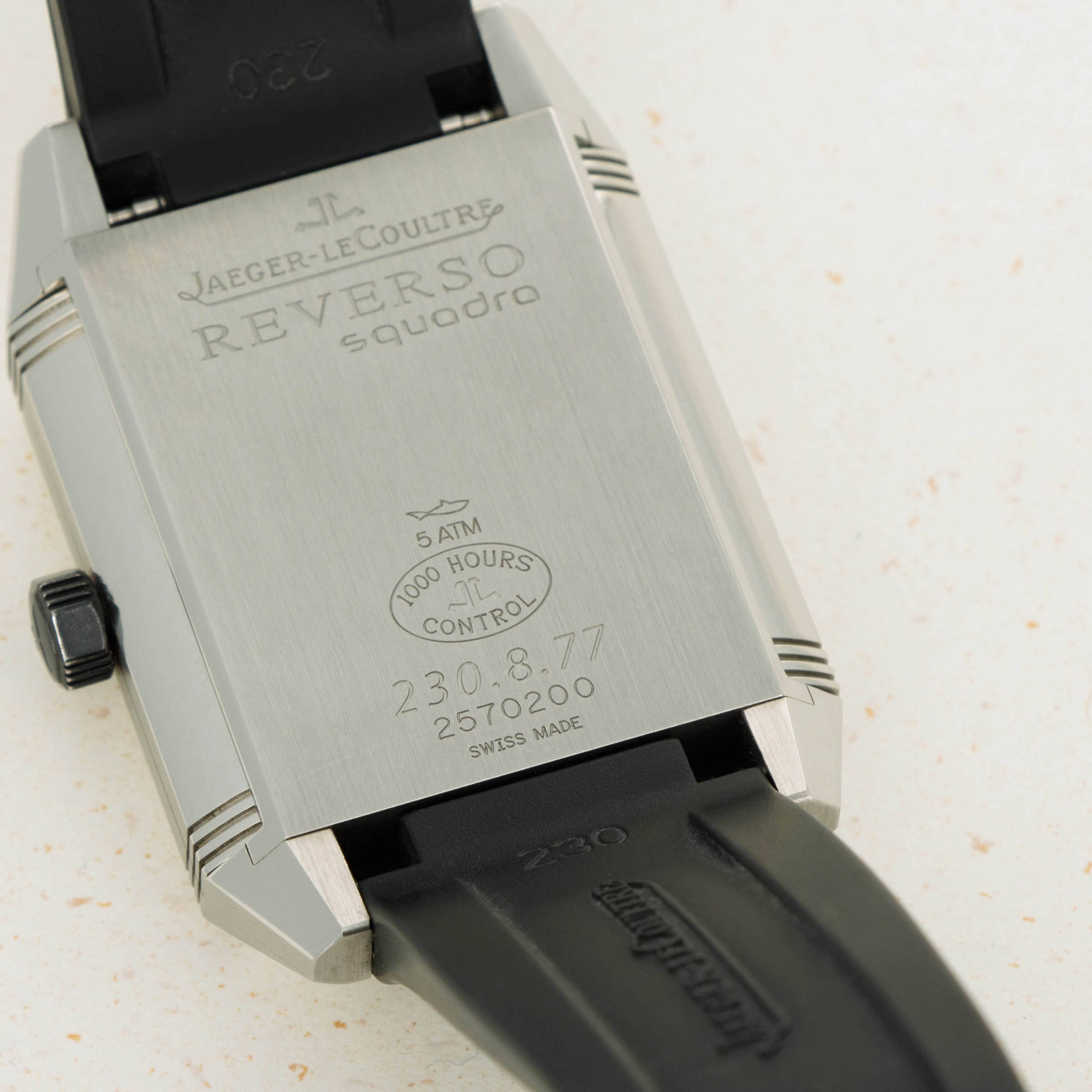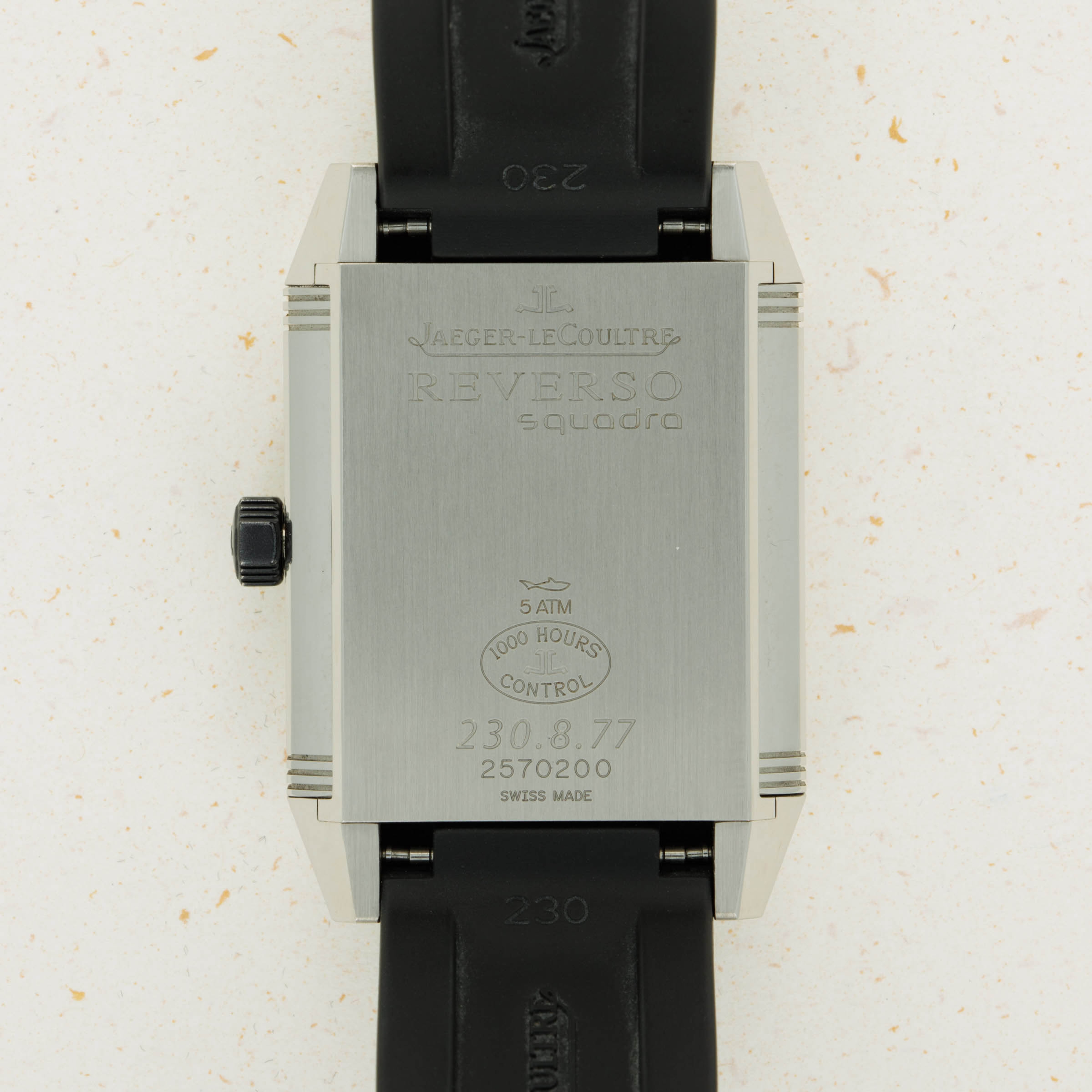 A remarkable timepiece that embodies the spirit of elegance and versatility, the Jaeger-LeCoultre Reverso Squadra Q700868P forms an interest part of Jaeger-LeCoultre's iconic Reverso collection, which has been a much-loved symbol of horological excellence since its introduction in the 1930s. Launched in 2006 and featuring a distinctive square-shaped case made of stainless steel, the Reverso Squadra Q700868P features a contemporary and sporty aesthetic that moves a little bit away from the Reverso’s typically reserved design DNA. Larger in size at 50mm tall and 35mm wide, the Squadra’s overarching philosophy was to speak to the larger watch trend that had come about in the 2000s. Featuring a striking black dial with a textured pattern that adds depth and sophistication to its overall design and luminescent hour markers and hands ensuring optimal legibility even in low-light conditions, the Squadra is a wonderful fusion of functionality and iconic design. Sitting on a stylish black rubber strap that perfectly complements its sporty character. The Squadra is a timepiece that caters to the discerning tastes of watch enthusiasts by capturing the essence of the Reverso collection’s DNA with its unique case design, and coupling it with Jaeger-LeCoultre's expertise in horological craftsmanship and desire to create something new from a watchmaking icon. In essence, the Squadra stands as a testament to Jaeger-LeCoultre's commitment to producing exceptional timepieces that transcend trends and remain timeless in their design and appeal.
