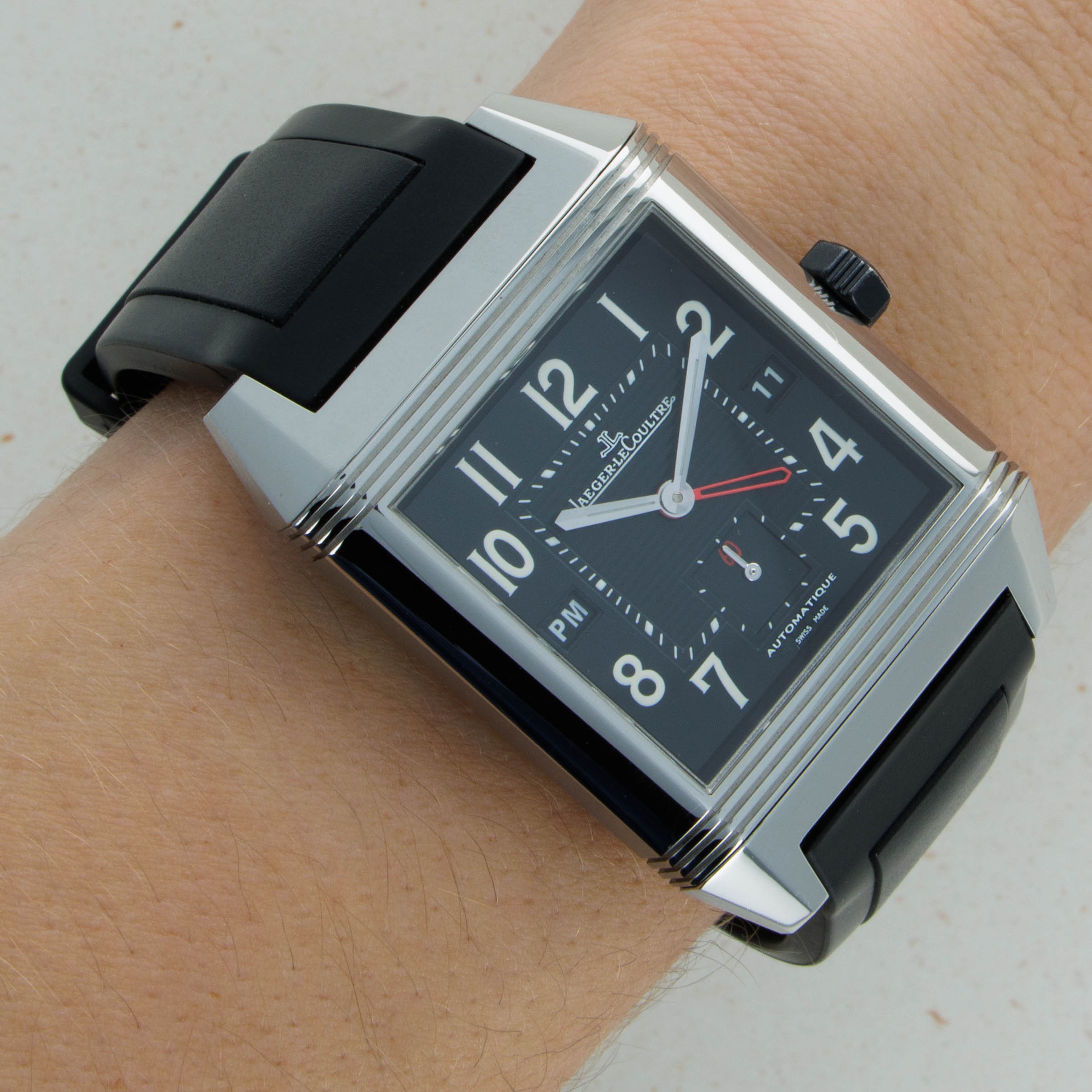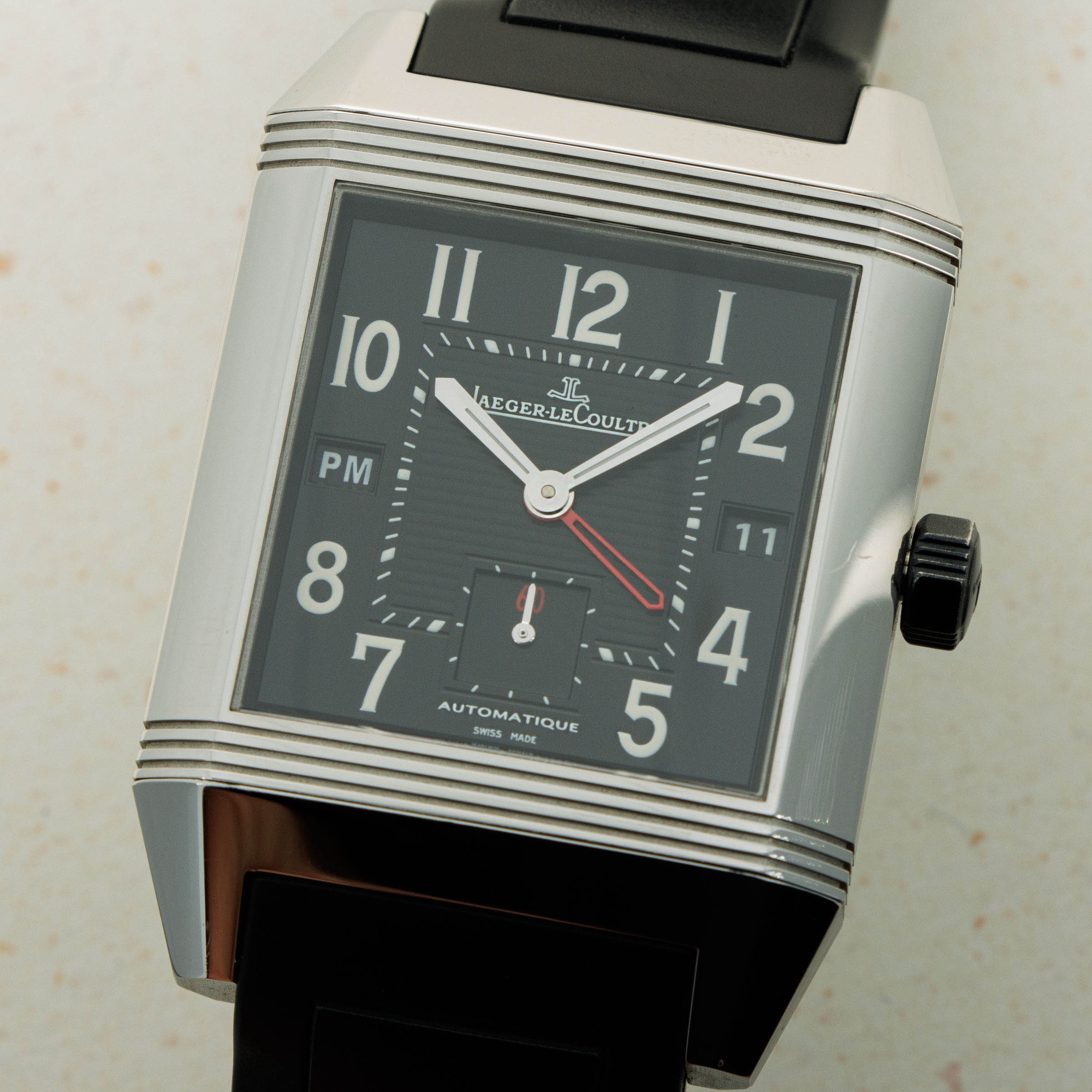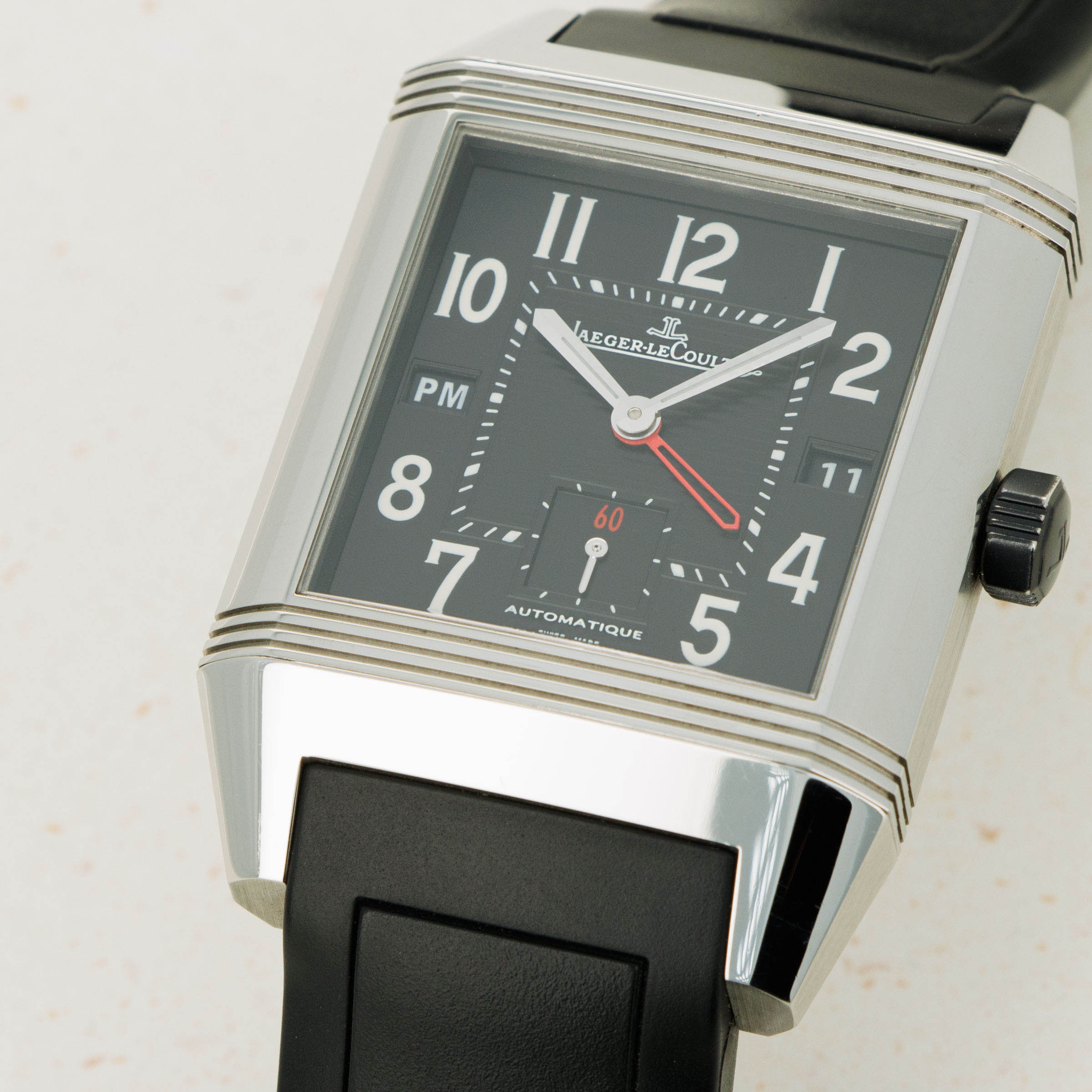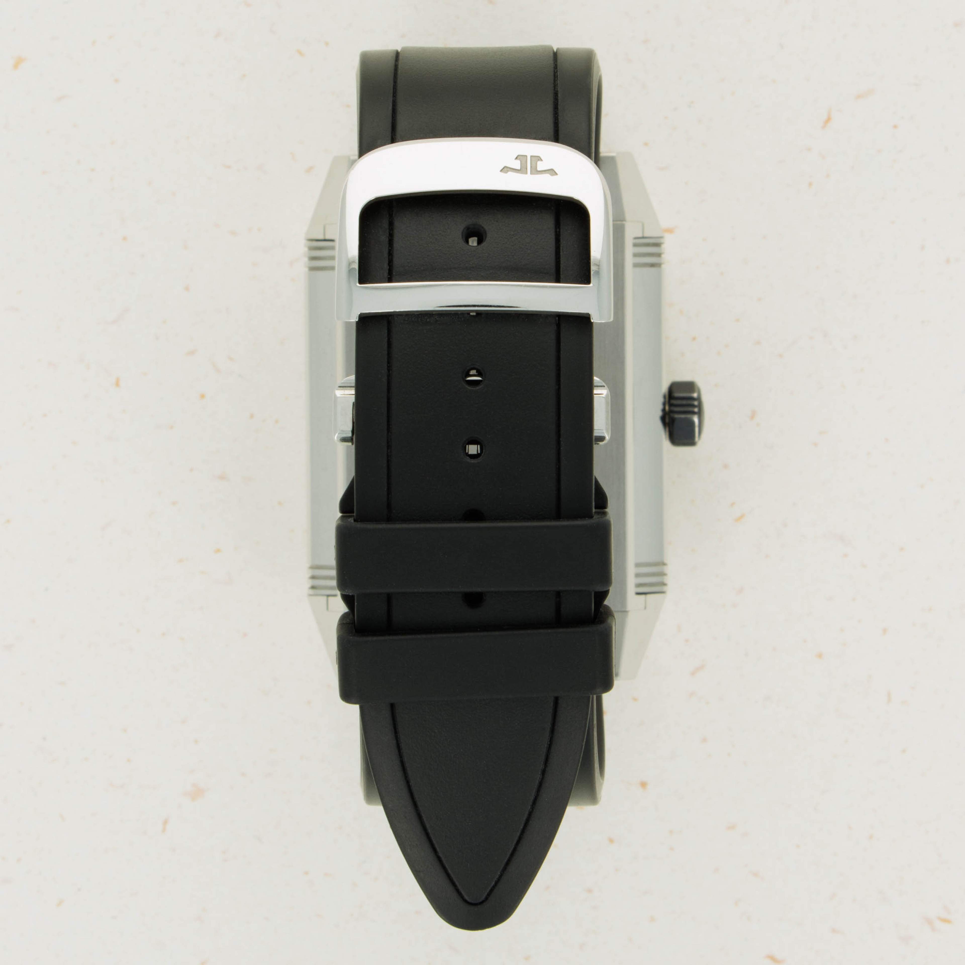 A remarkable timepiece that embodies the spirit of elegance and versatility, the Jaeger-LeCoultre Reverso Squadra Q700868P forms an interest part of Jaeger-LeCoultre's iconic Reverso collection, which has been a much-loved symbol of horological excellence since its introduction in the 1930s. Launched in 2006 and featuring a distinctive square-shaped case made of stainless steel, the Reverso Squadra Q700868P features a contemporary and sporty aesthetic that moves a little bit away from the Reverso’s typically reserved design DNA. Larger in size at 50mm tall and 35mm wide, the Squadra’s overarching philosophy was to speak to the larger watch trend that had come about in the 2000s. Featuring a striking black dial with a textured pattern that adds depth and sophistication to its overall design and luminescent hour markers and hands ensuring optimal legibility even in low-light conditions, the Squadra is a wonderful fusion of functionality and iconic design. Sitting on a stylish black rubber strap that perfectly complements its sporty character. The Squadra is a timepiece that caters to the discerning tastes of watch enthusiasts by capturing the essence of the Reverso collection’s DNA with its unique case design, and coupling it with Jaeger-LeCoultre's expertise in horological craftsmanship and desire to create something new from a watchmaking icon. In essence, the Squadra stands as a testament to Jaeger-LeCoultre's commitment to producing exceptional timepieces that transcend trends and remain timeless in their design and appeal.
