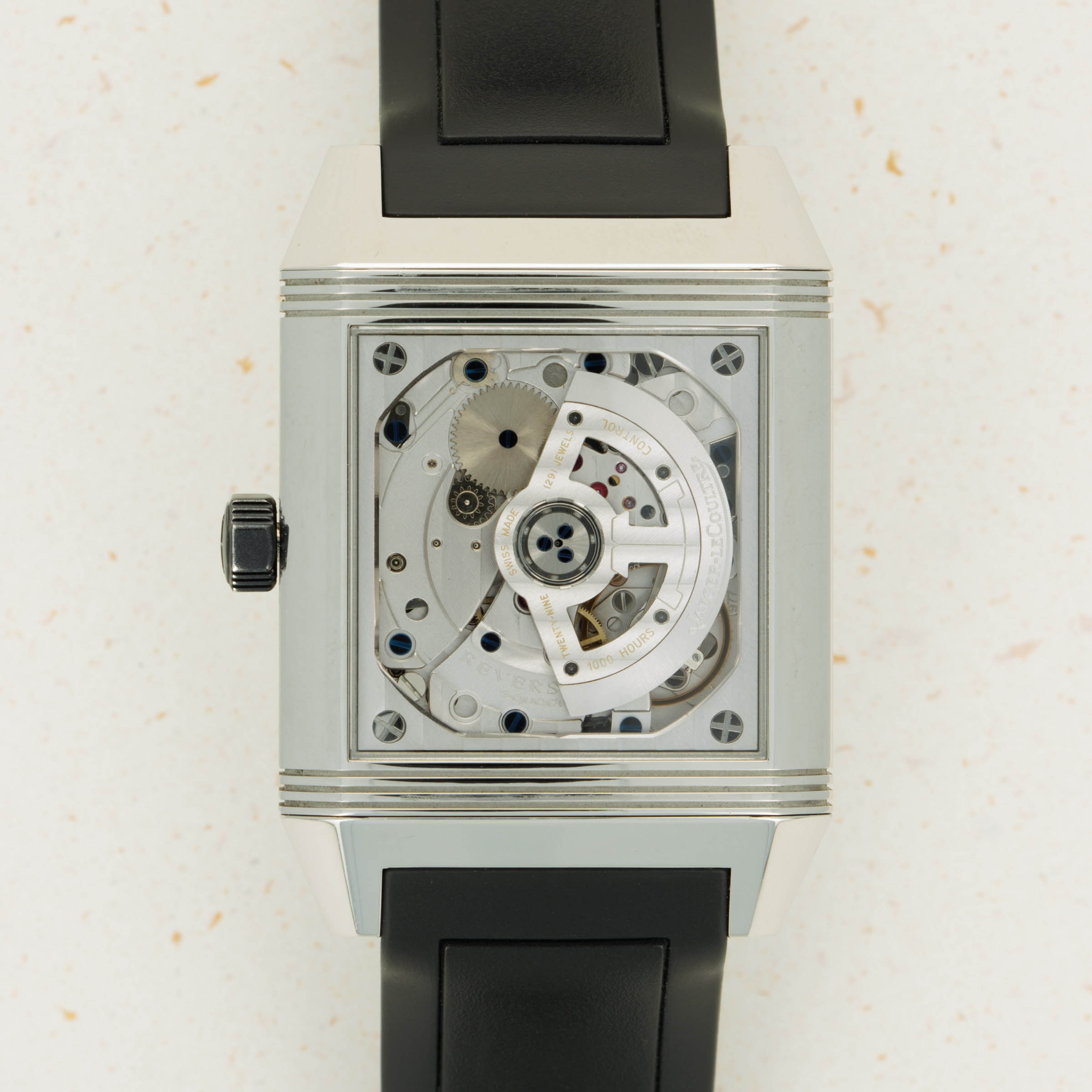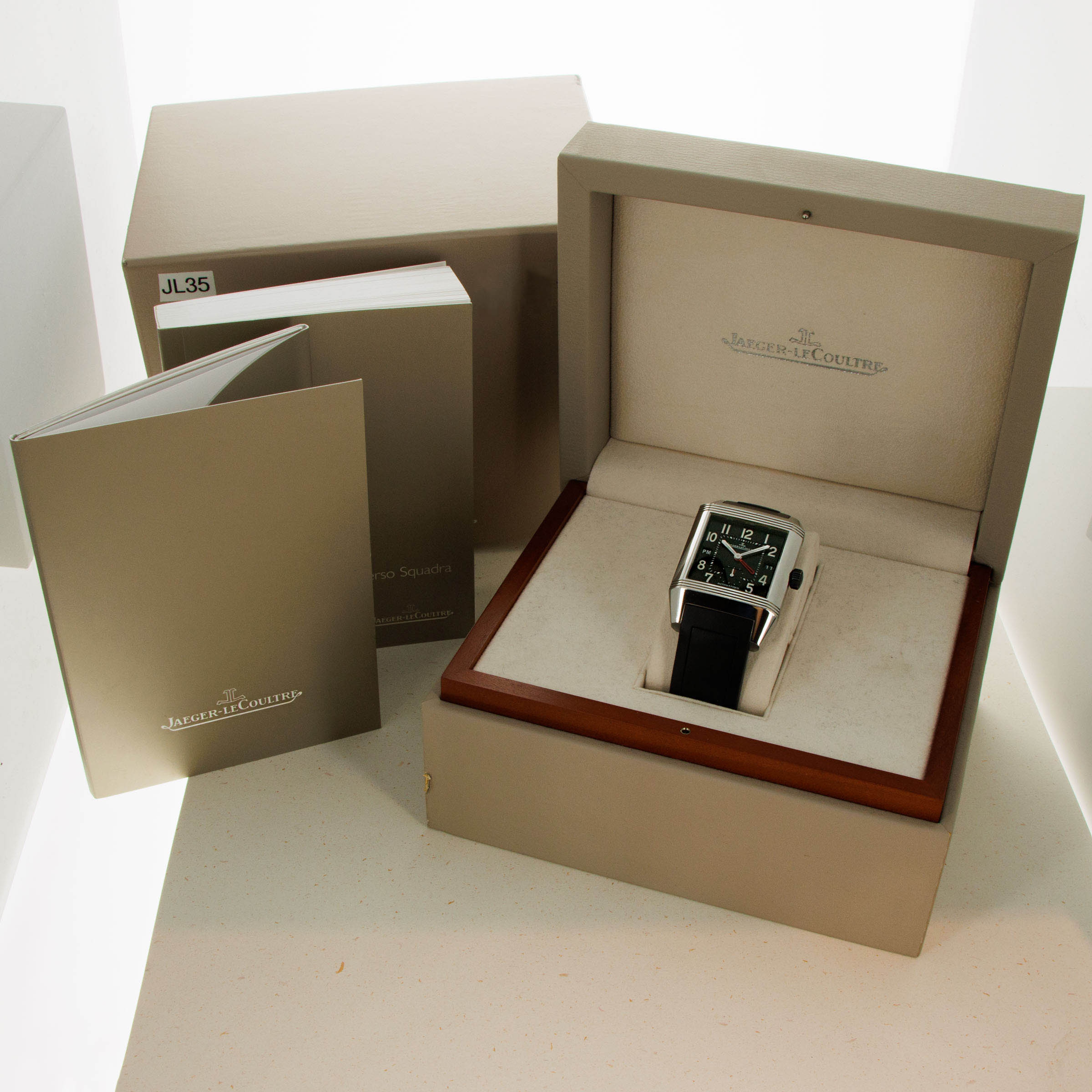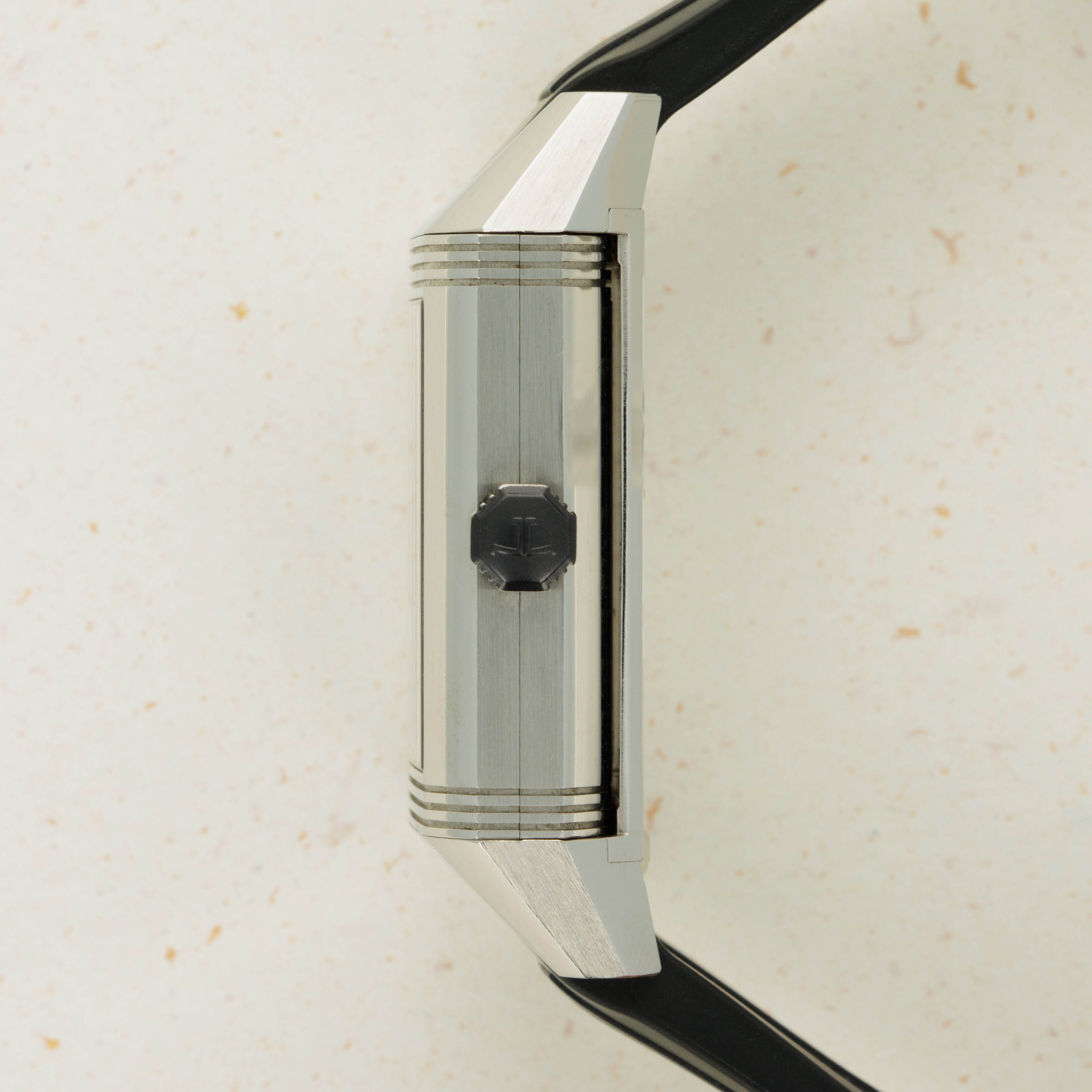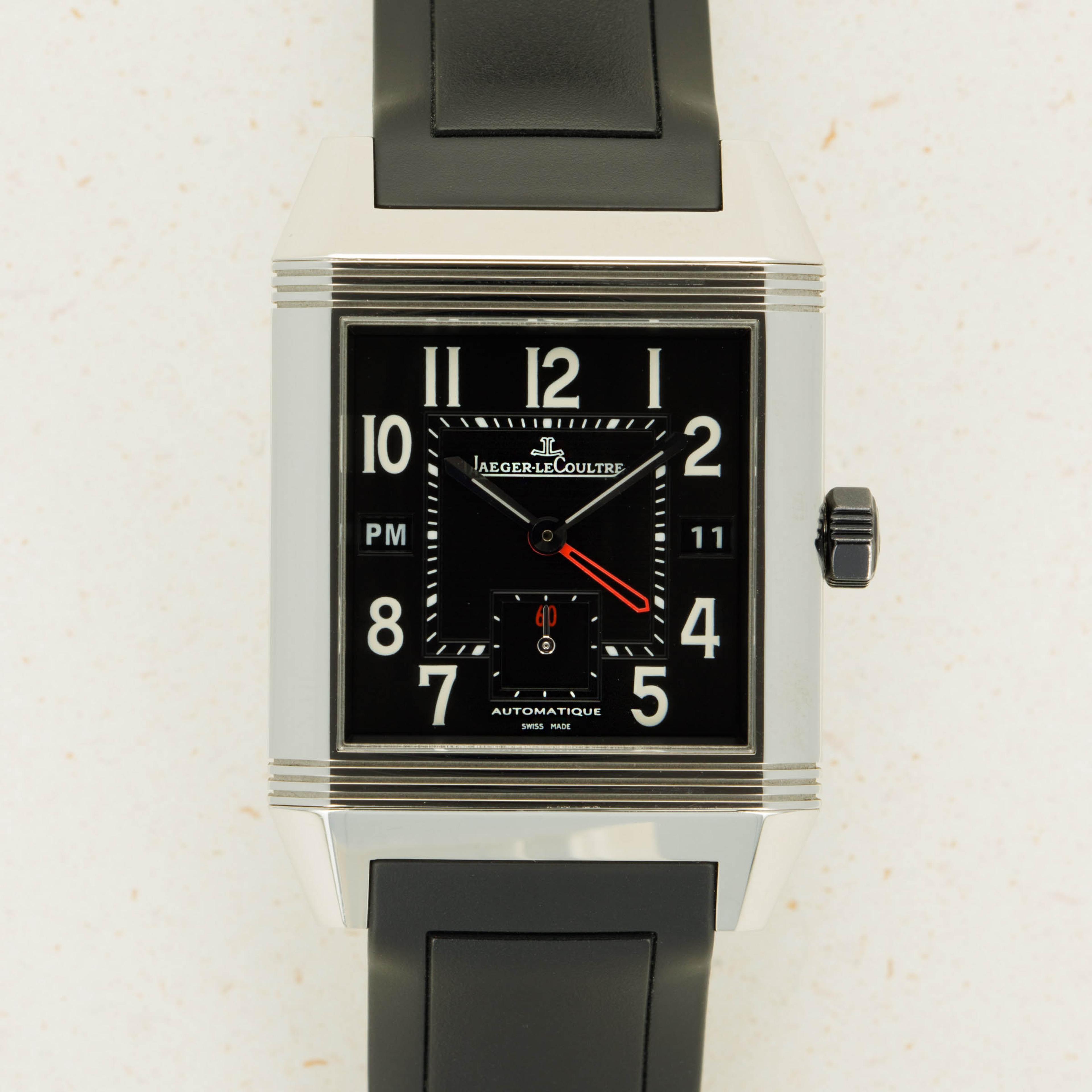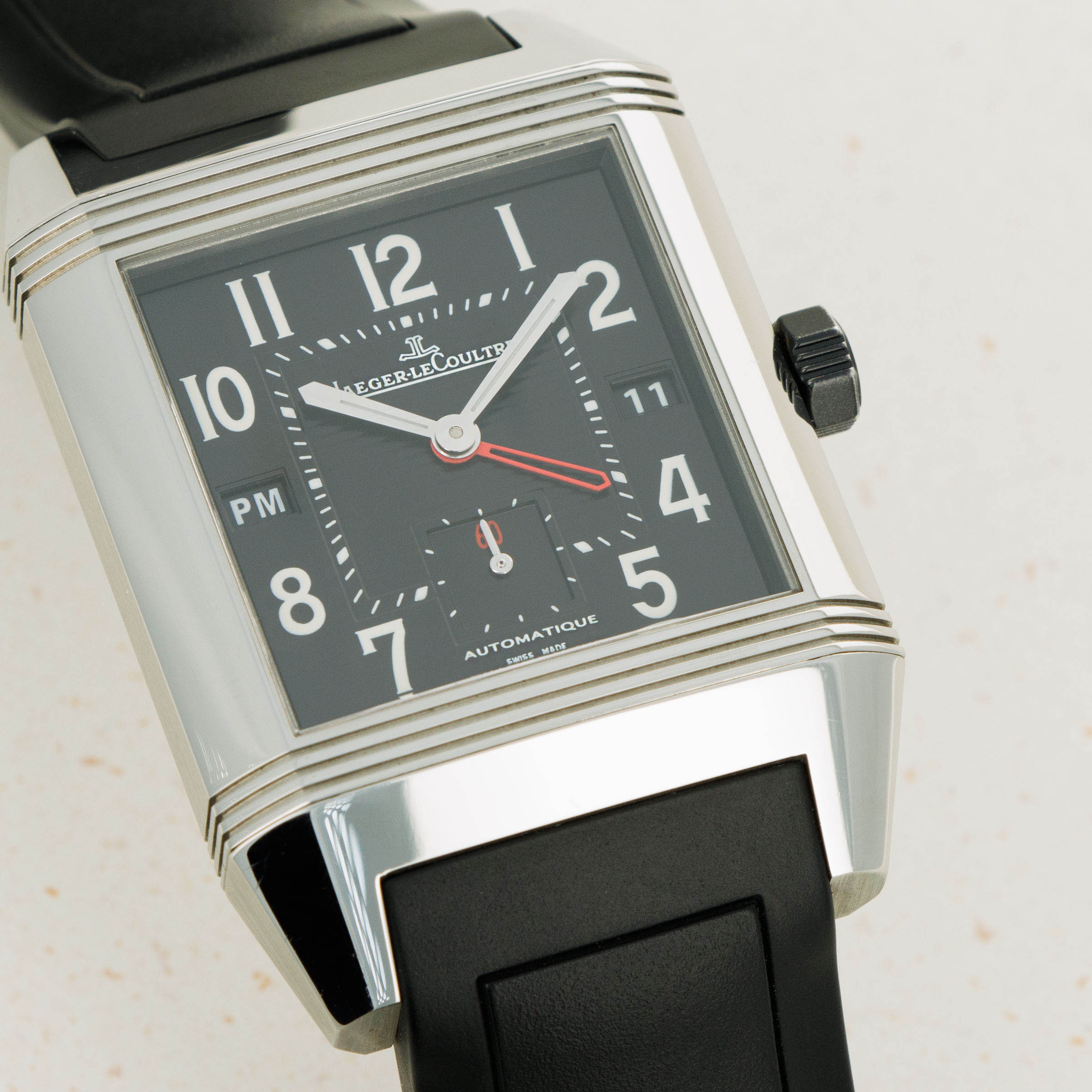 A remarkable timepiece that embodies the spirit of elegance and versatility, the Jaeger-LeCoultre Reverso Squadra Q700868P forms an interest part of Jaeger-LeCoultre's iconic Reverso collection, which has been a much-loved symbol of horological excellence since its introduction in the 1930s. Launched in 2006 and featuring a distinctive square-shaped case made of stainless steel, the Reverso Squadra Q700868P features a contemporary and sporty aesthetic that moves a little bit away from the Reverso’s typically reserved design DNA. Larger in size at 50mm tall and 35mm wide, the Squadra’s overarching philosophy was to speak to the larger watch trend that had come about in the 2000s. Featuring a striking black dial with a textured pattern that adds depth and sophistication to its overall design and luminescent hour markers and hands ensuring optimal legibility even in low-light conditions, the Squadra is a wonderful fusion of functionality and iconic design. Sitting on a stylish black rubber strap that perfectly complements its sporty character. The Squadra is a timepiece that caters to the discerning tastes of watch enthusiasts by capturing the essence of the Reverso collection’s DNA with its unique case design, and coupling it with Jaeger-LeCoultre's expertise in horological craftsmanship and desire to create something new from a watchmaking icon. In essence, the Squadra stands as a testament to Jaeger-LeCoultre's commitment to producing exceptional timepieces that transcend trends and remain timeless in their design and appeal.