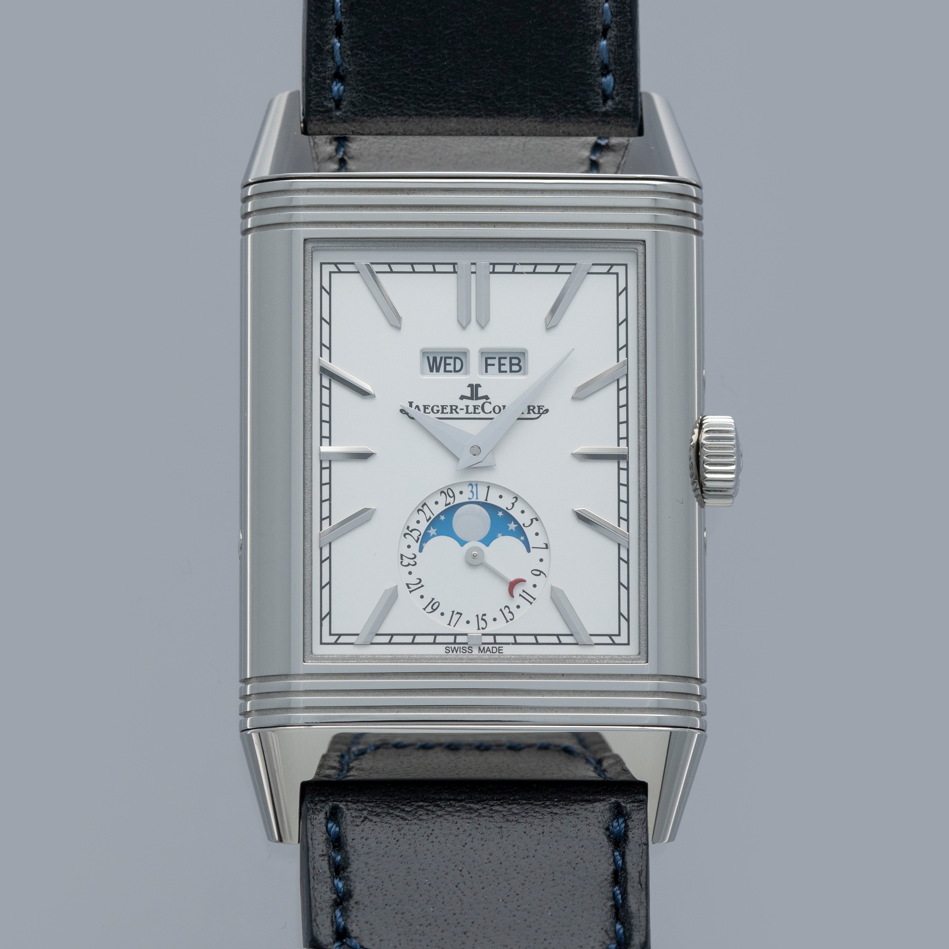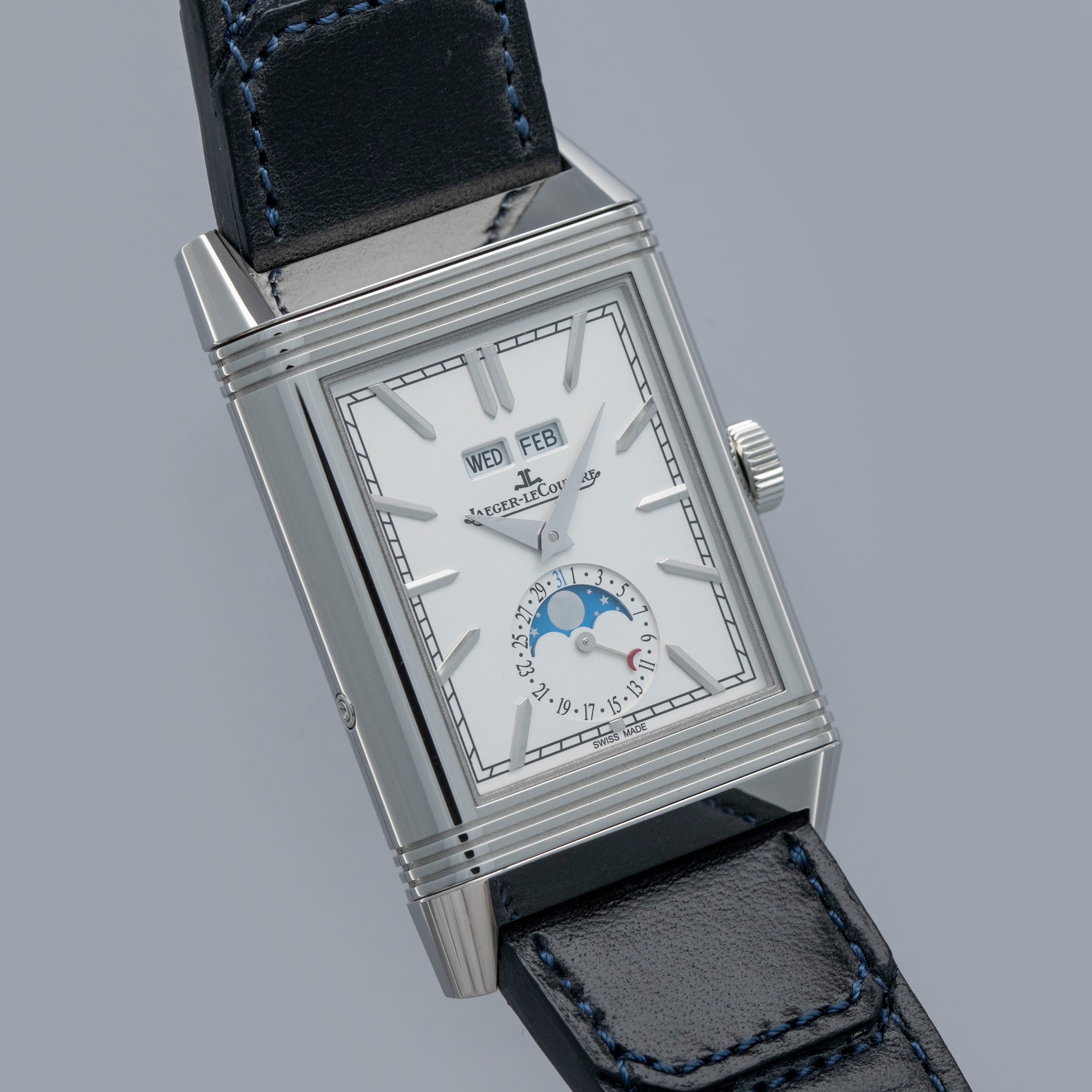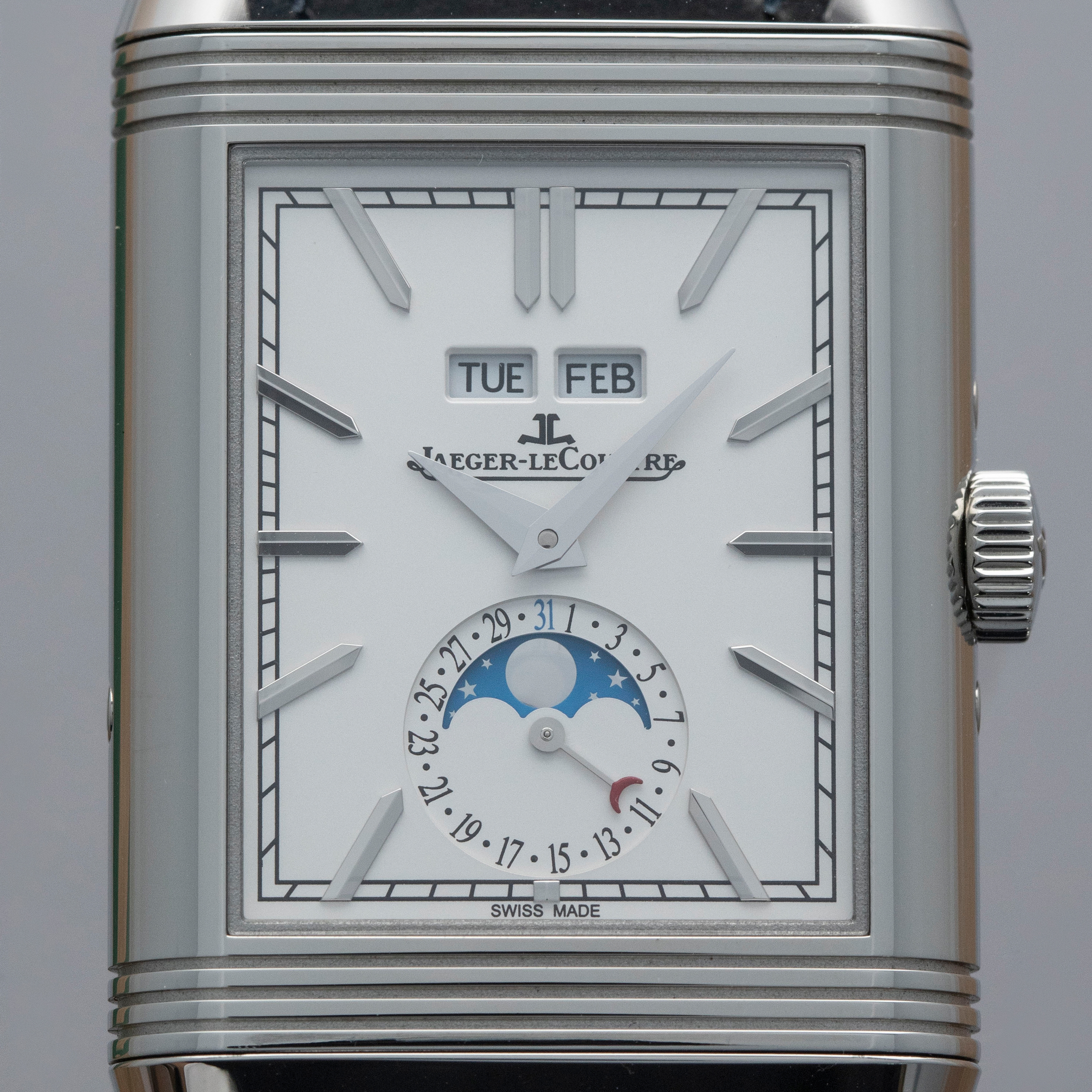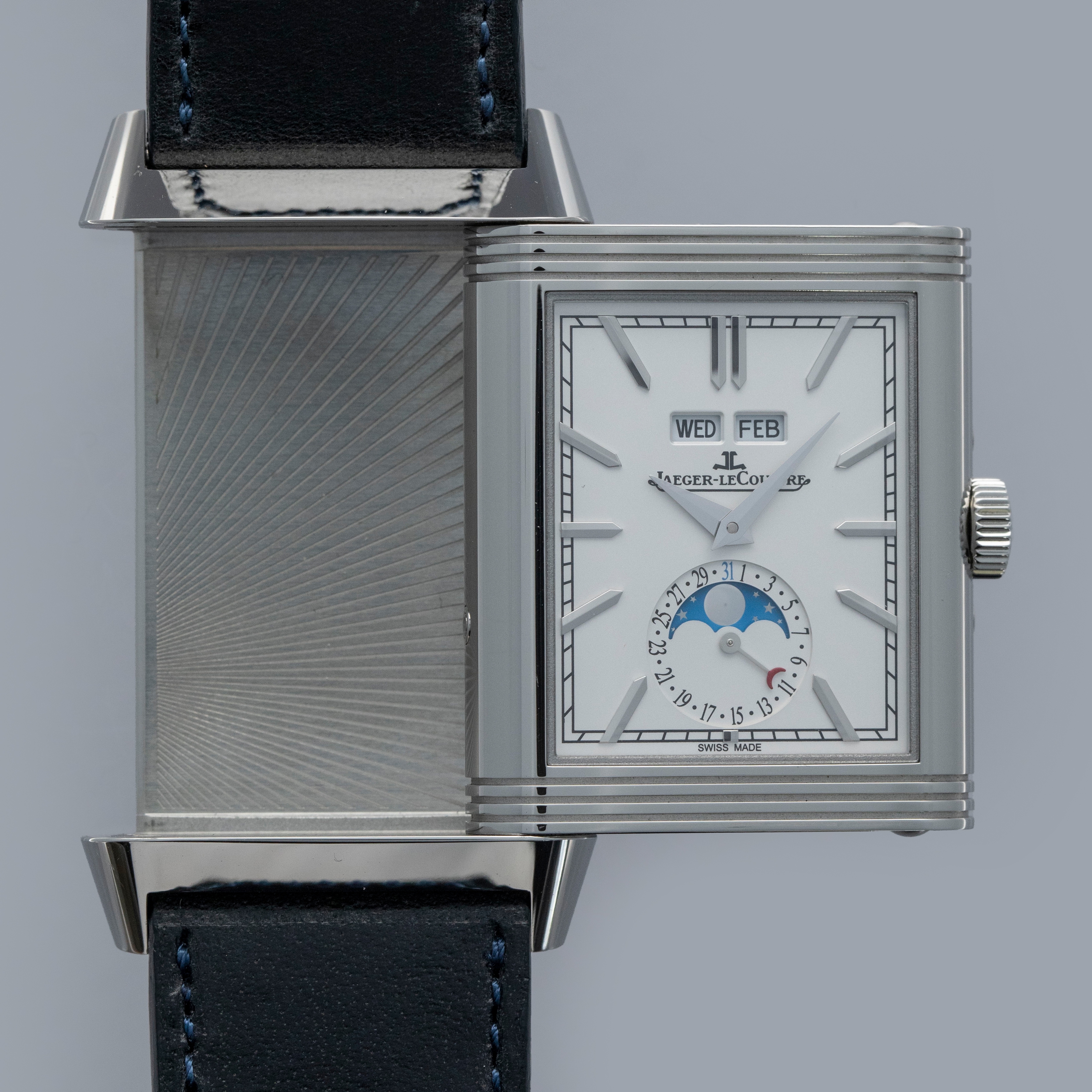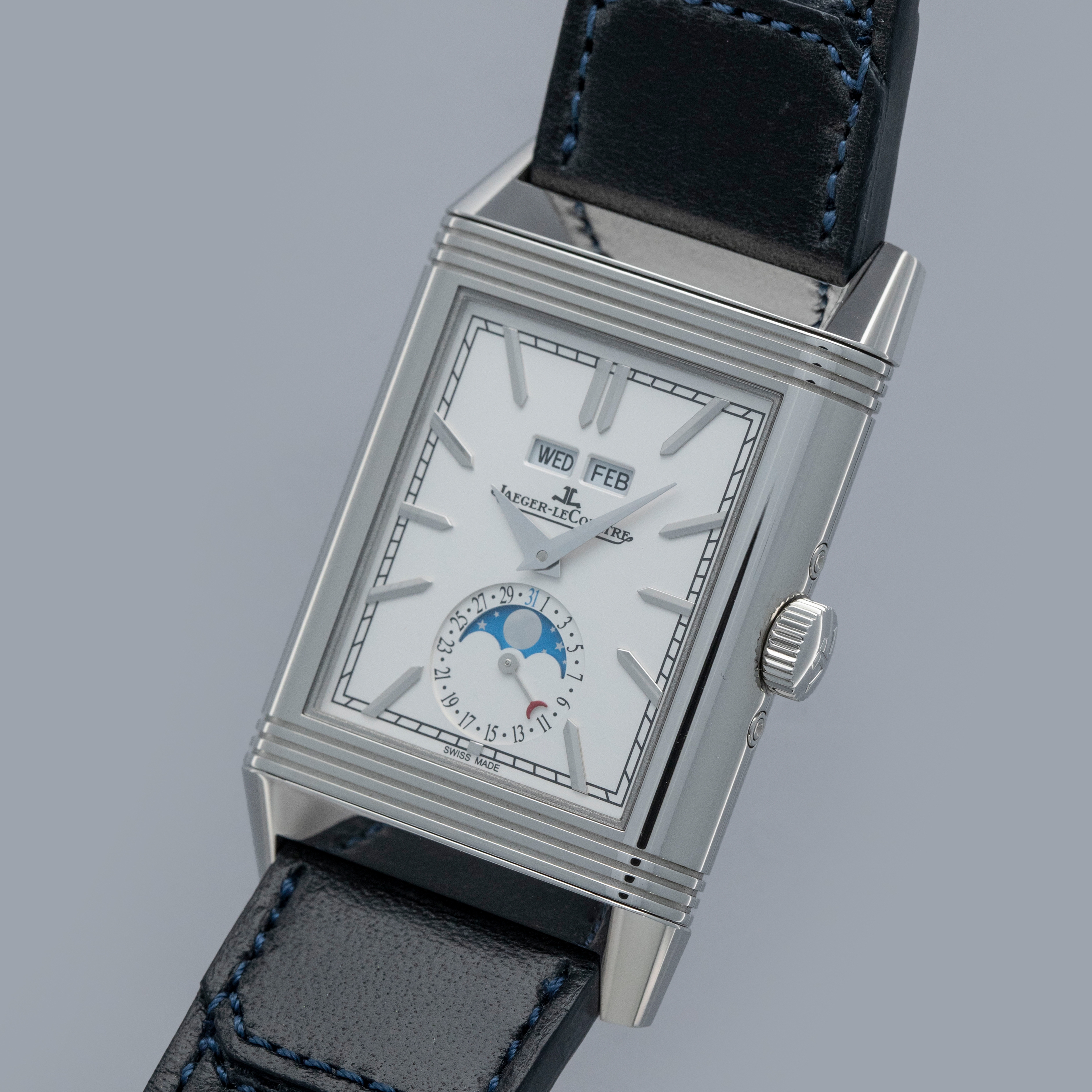 Boasting two dials, this is the Reverso's calendar dial with day and month apertures alongside a pointer date subdial that also harbored a moonphase indicator.
