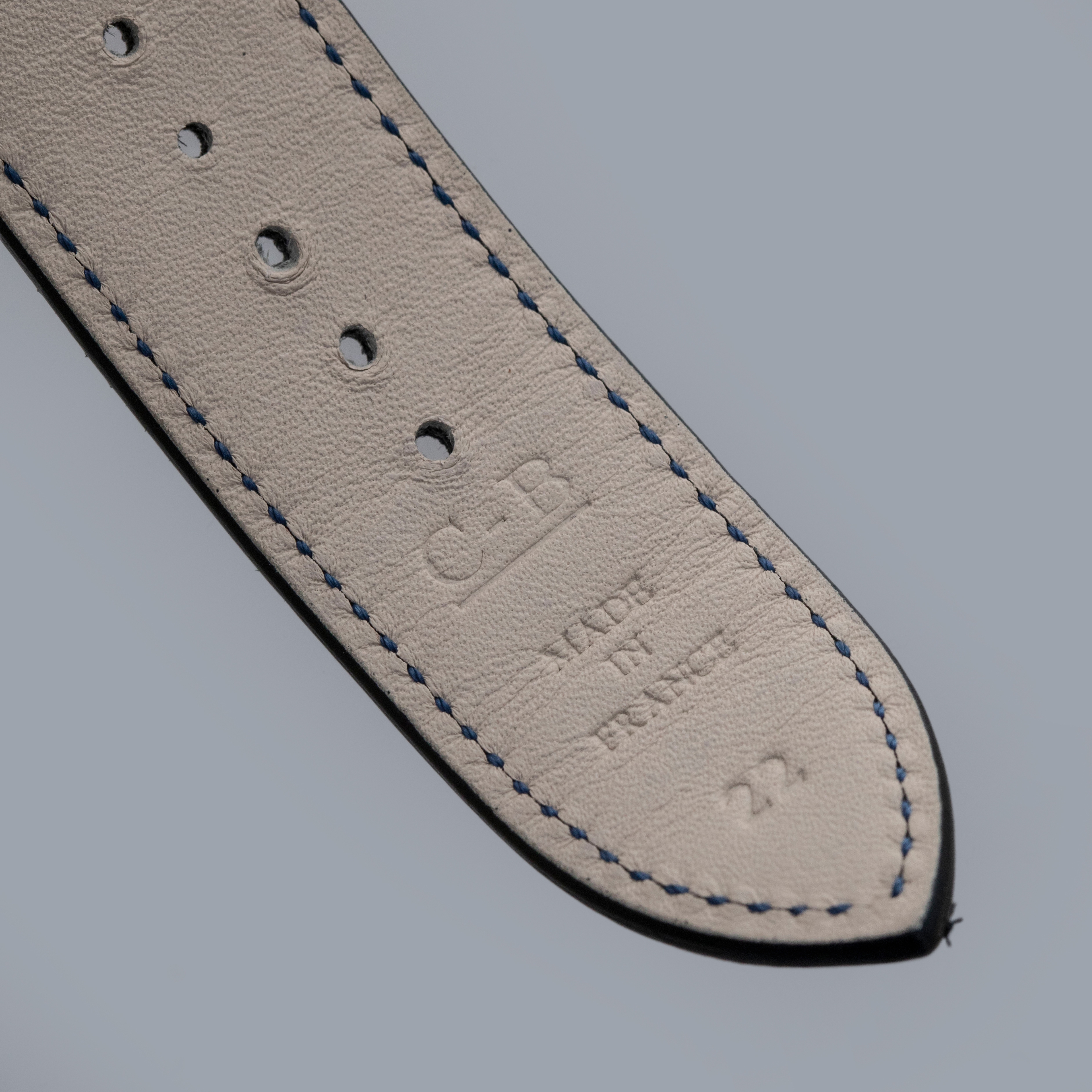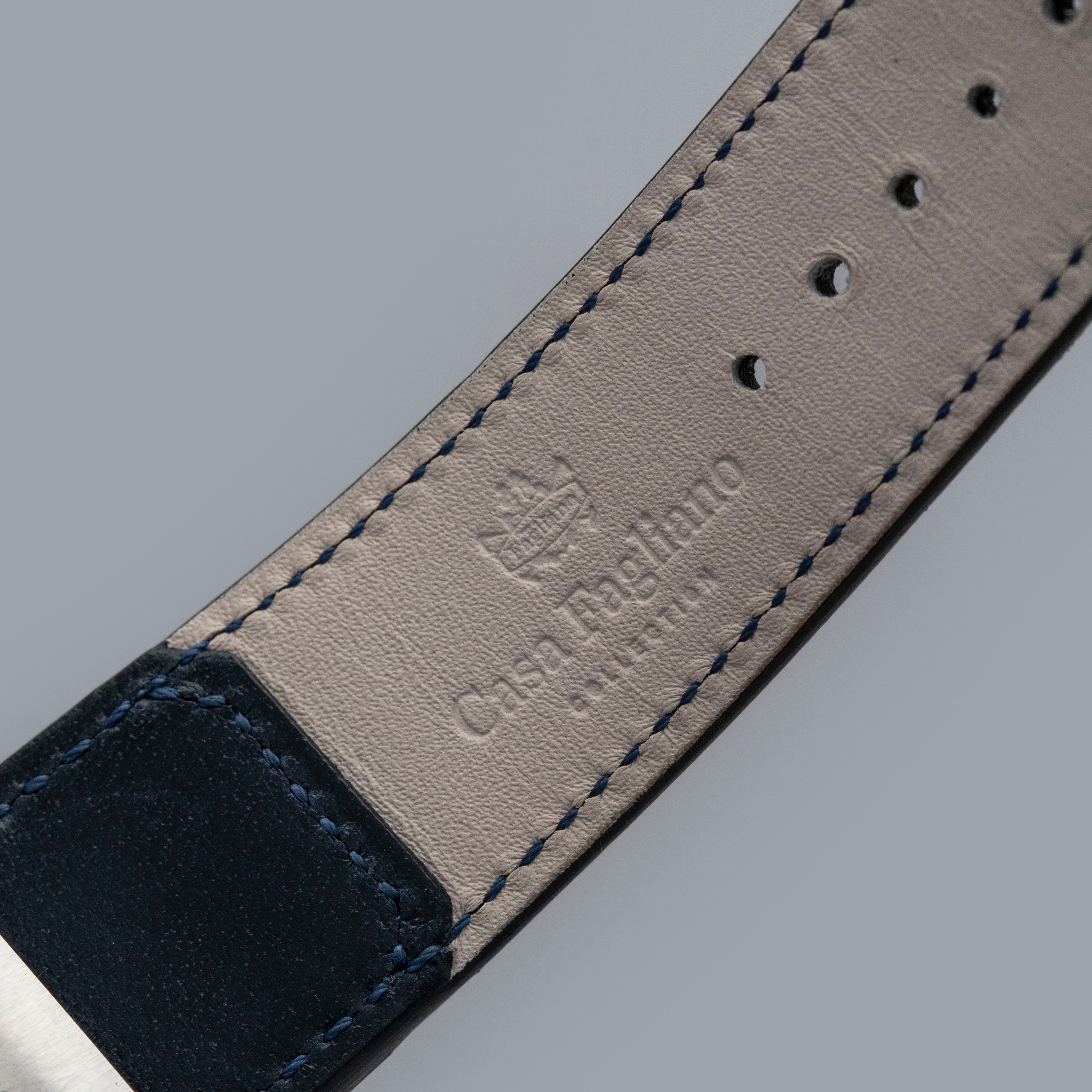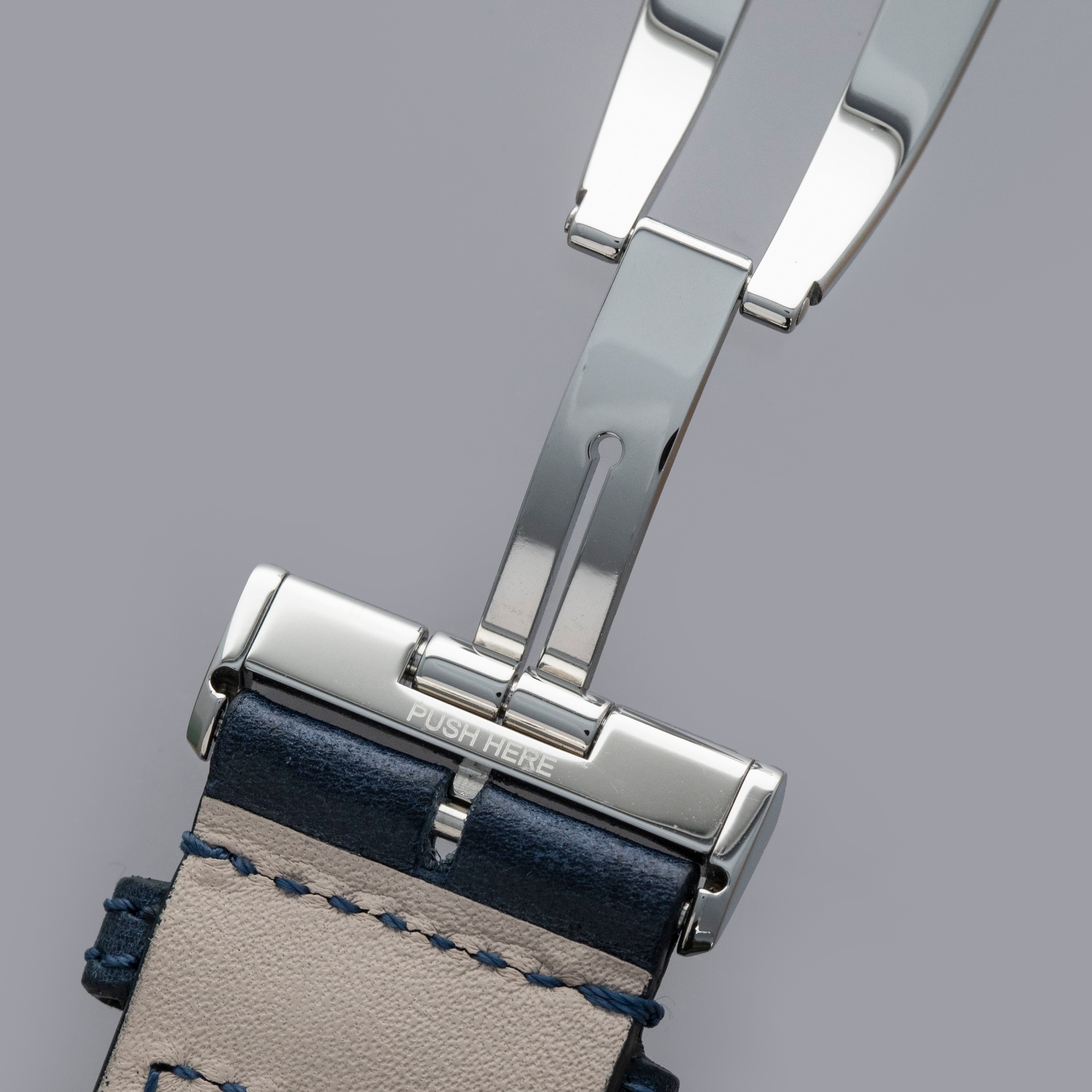 Watch is in overall near-mint condition. The steel case shows a few light signs of wear, with a couple of marks visible on both sides of the case body, while the back of the case retains well-defined engravings. Both dials and handset sets remain like new. It is fitted with a blue leather strap and a steel deployant clasp, both remaining near mint, and includes a spare fabric strap. Comes complete with inner and outer boxes, warranty card, booklet, and setting tool.