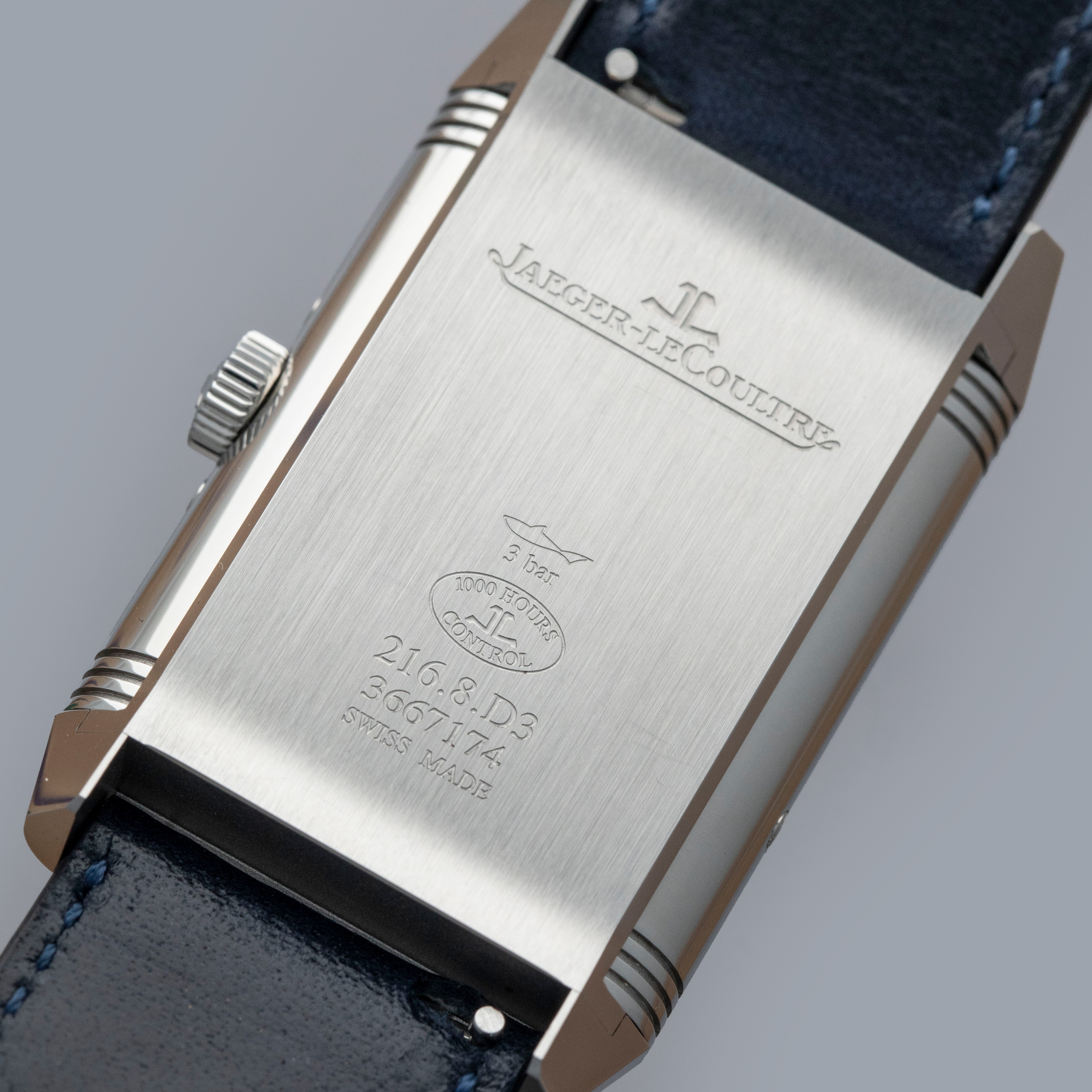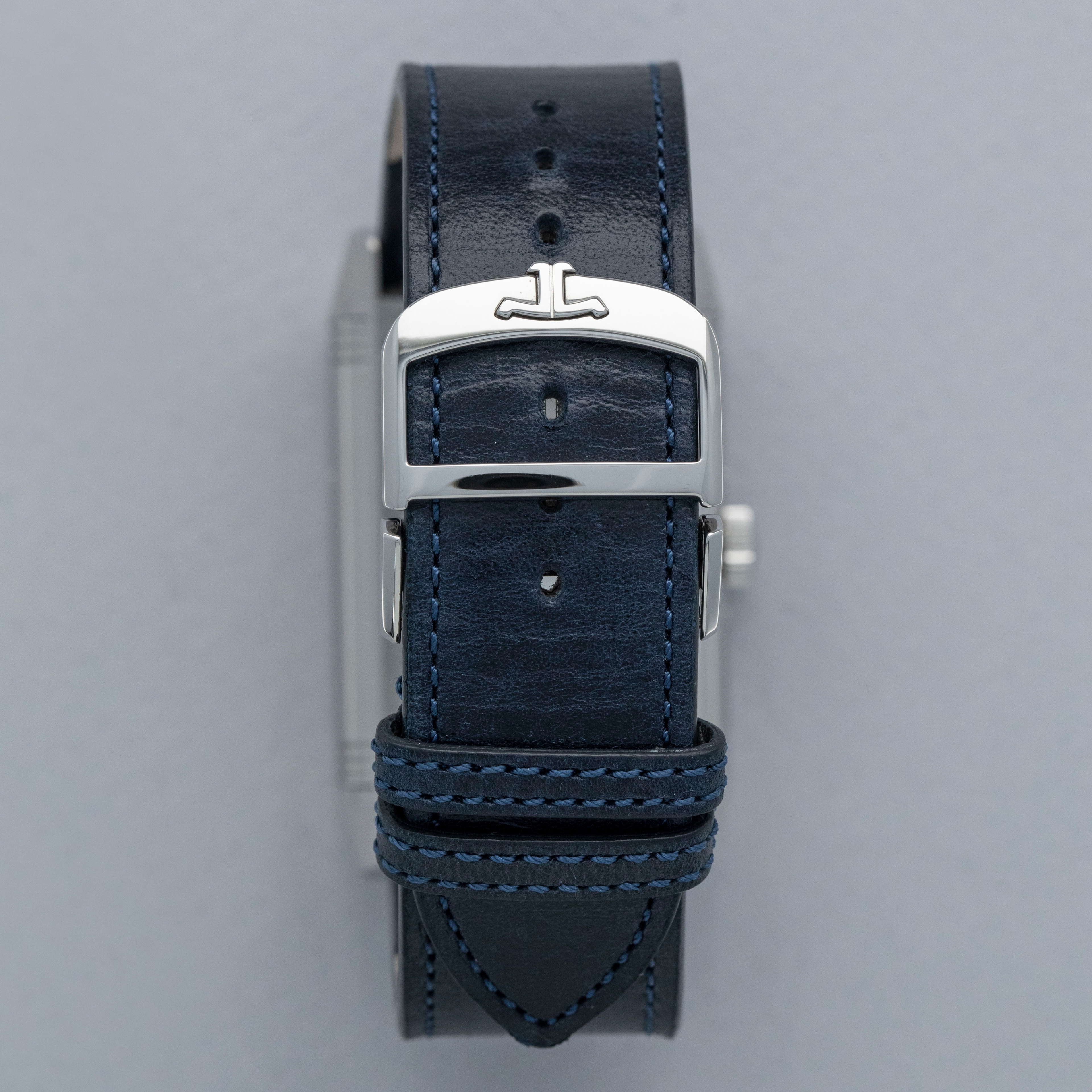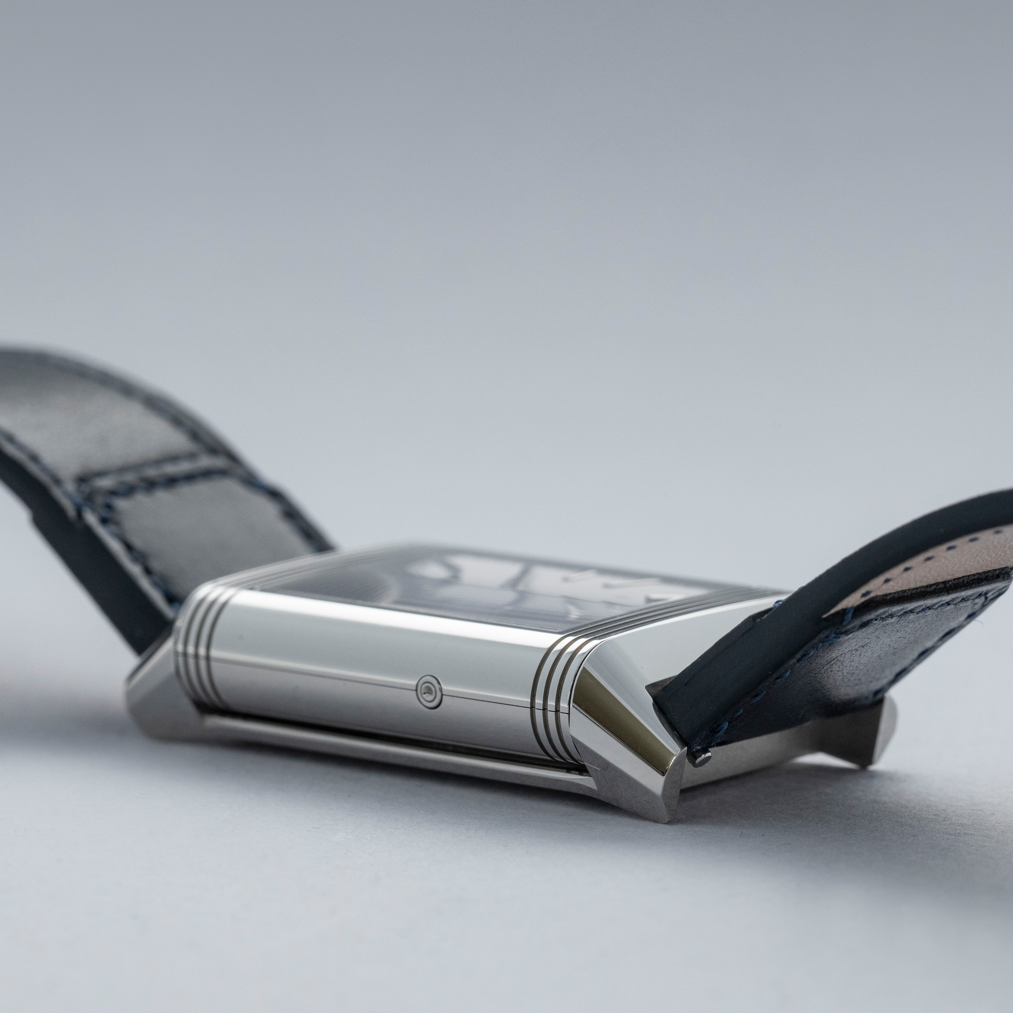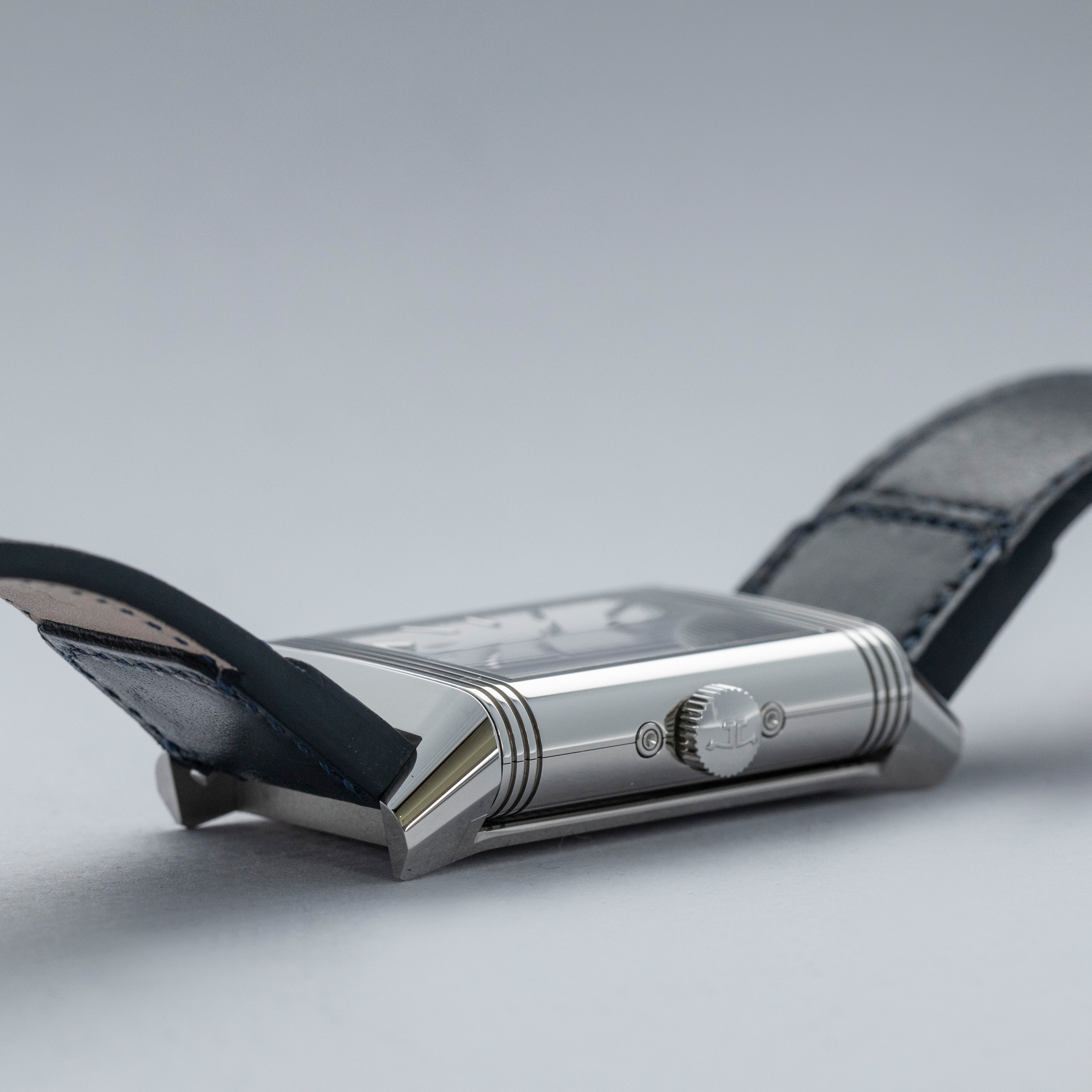 Designed by René-Alfred Chauvot, the Reverso was conceived with the express purpose of being able to withstand the harsh beating a watch would endure during a game of polo by virtue of its eponymous reversible function. This was put to JLC by entrepreneur César de Trey as a challenge for the brand in 1930. Born the year following in 1931, the Reverso was a sports watch, due to its particular use case. Thanks to its now-classical aesthetic and graceful design, the Reverso has evolved into a modern dress watch. However, in the 1930s, the Reverso needed to be more durable than other available watches; hence its ingenious reversible case was born. This protected the dial from a direct hit and gave the Reverso its name. Over 90 years later and the Reverso’s design lives on as one of the most recognizable in watchmaking. Offered here we have the Reverso Tribute Duoface Calendar ref. Q3918420. Made of stainless steel, it features a 29.9mm wide and 49.4mm case which gives meaning to its “Grande” designation. In keeping with the Reverso’s original versions, the ref. Q3918420 is powered by a manual-wind movement, the cal. 853AA, and features a monochromatic silver dial with a triple calendar function across its bevvy of aperture and indicators. Additionally, it also features a blue dial on the reverse side of its case that houses its own day and night indicator. Offering fantastic wearability on account of its twin-dial design, this Reverso will certainly be an easily fit for any collection.