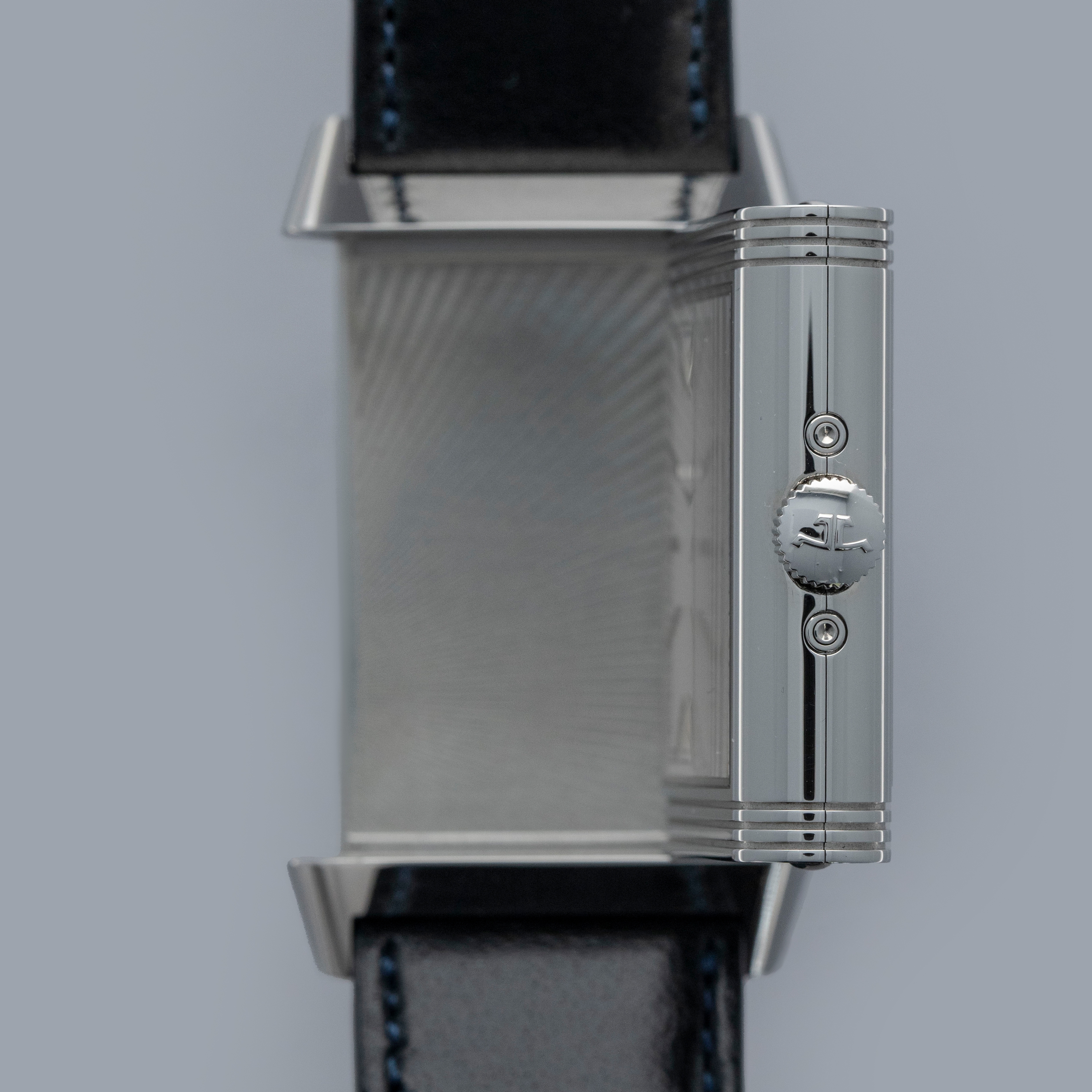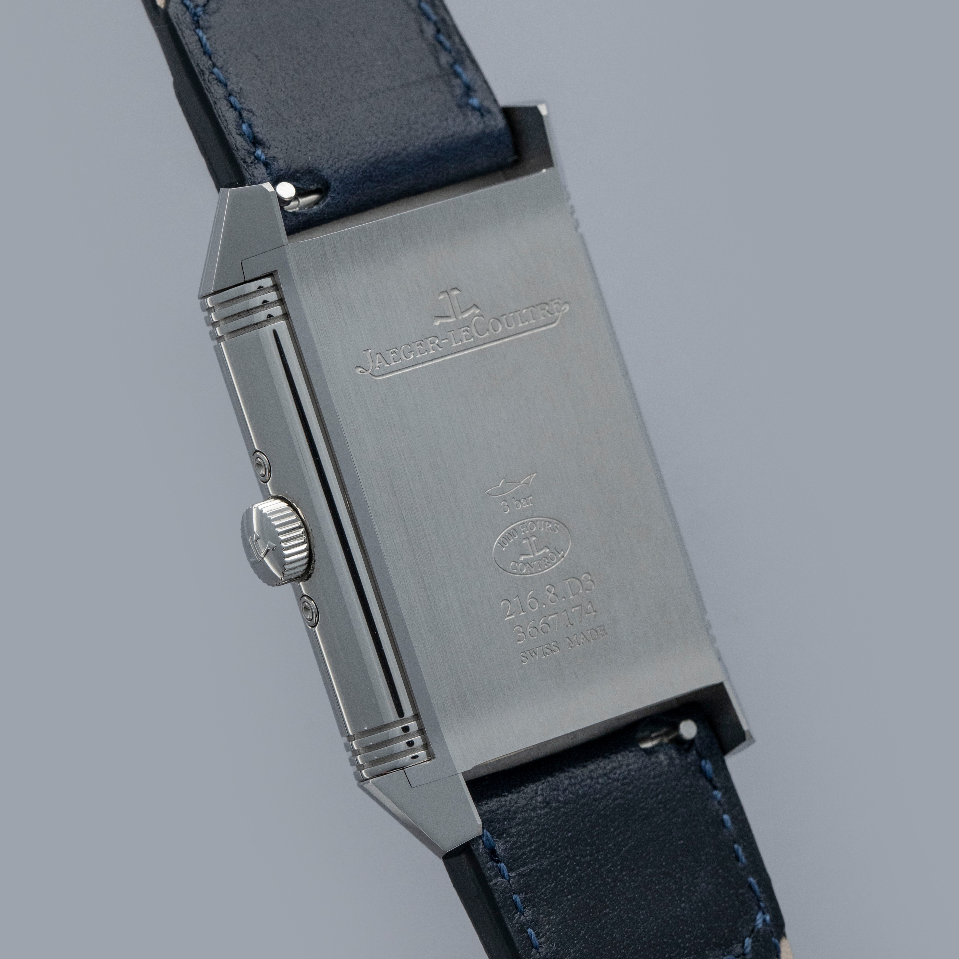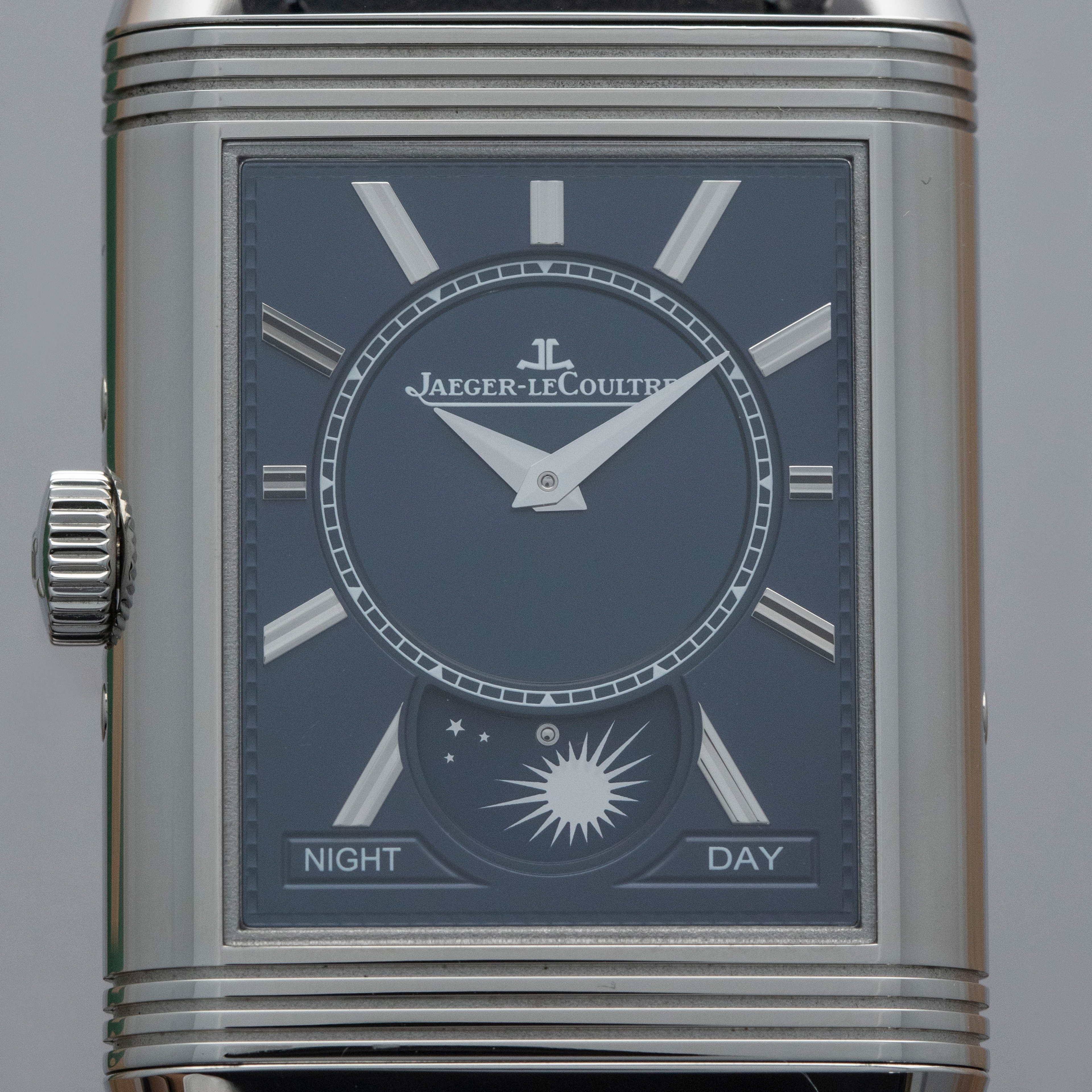 Designed by René-Alfred Chauvot, the Reverso was conceived with the express purpose of being able to withstand the harsh beating a watch would endure during a game of polo by virtue of its eponymous reversible function. This was put to JLC by entrepreneur César de Trey as a challenge for the brand in 1930. Born the year following in 1931, the Reverso was a sports watch, due to its particular use case. Thanks to its now-classical aesthetic and graceful design, the Reverso has evolved into a modern dress watch. However, in the 1930s, the Reverso needed to be more durable than other available watches; hence its ingenious reversible case was born. This protected the dial from a direct hit and gave the Reverso its name. Over 90 years later and the Reverso’s design lives on as one of the most recognizable in watchmaking. Offered here we have the Reverso Tribute Duoface Calendar ref. Q3918420. Made of stainless steel, it features a 29.9mm wide and 49.4mm case which gives meaning to its “Grande” designation. In keeping with the Reverso’s original versions, the ref. Q3918420 is powered by a manual-wind movement, the cal. 853AA, and features a monochromatic silver dial with a triple calendar function across its bevvy of aperture and indicators. Additionally, it also features a blue dial on the reverse side of its case that houses its own day and night indicator. Offering fantastic wearability on account of its twin-dial design, this Reverso will certainly be an easily fit for any collection.