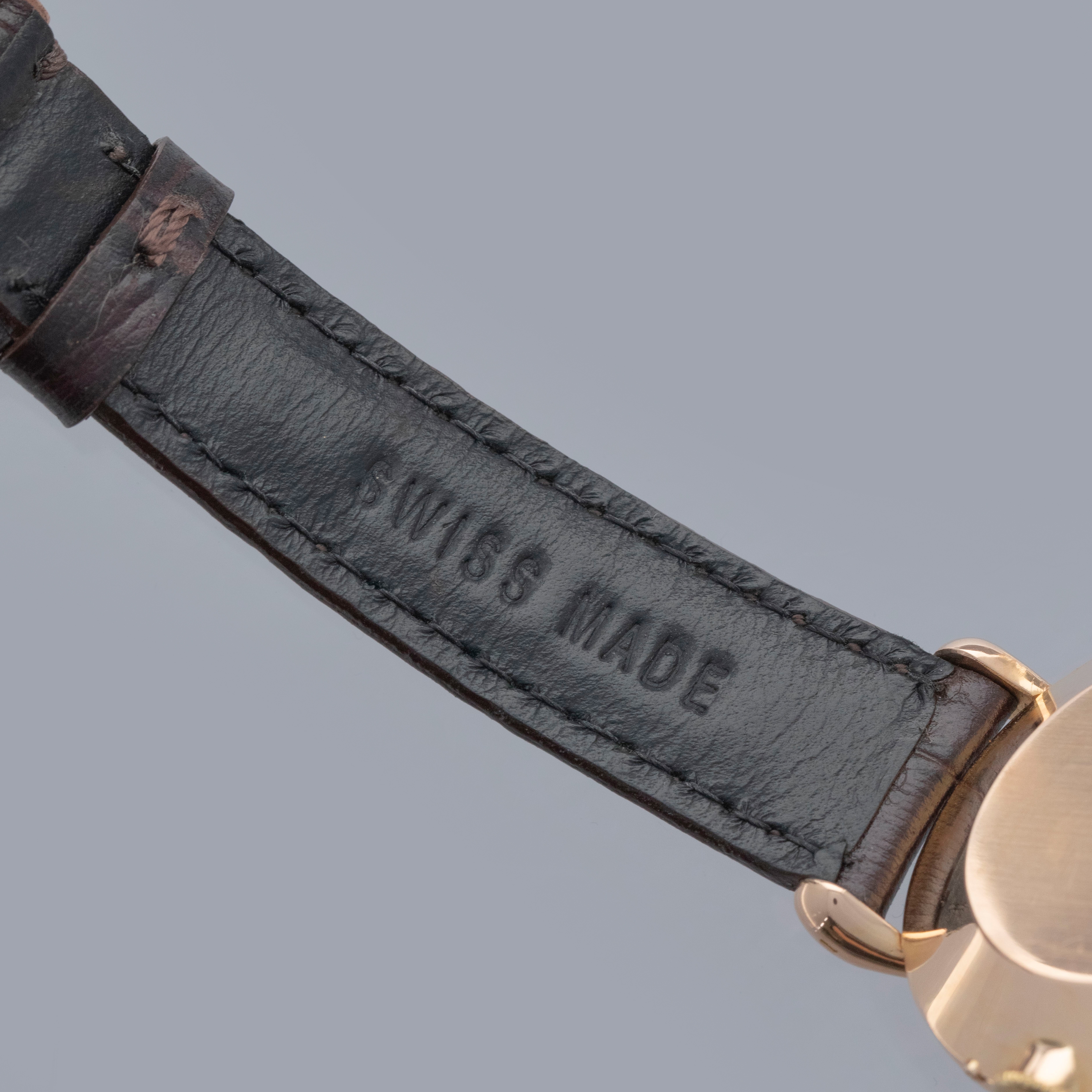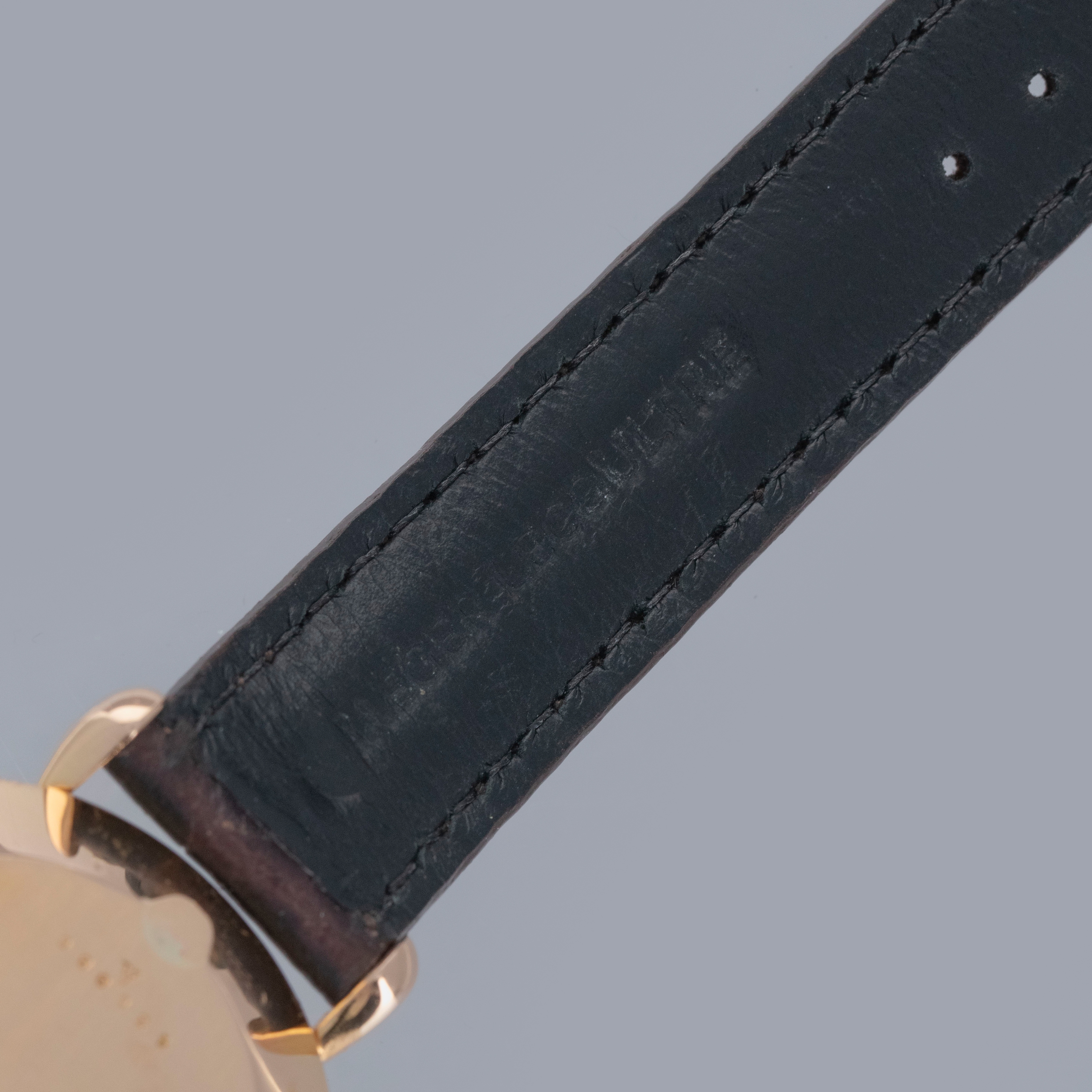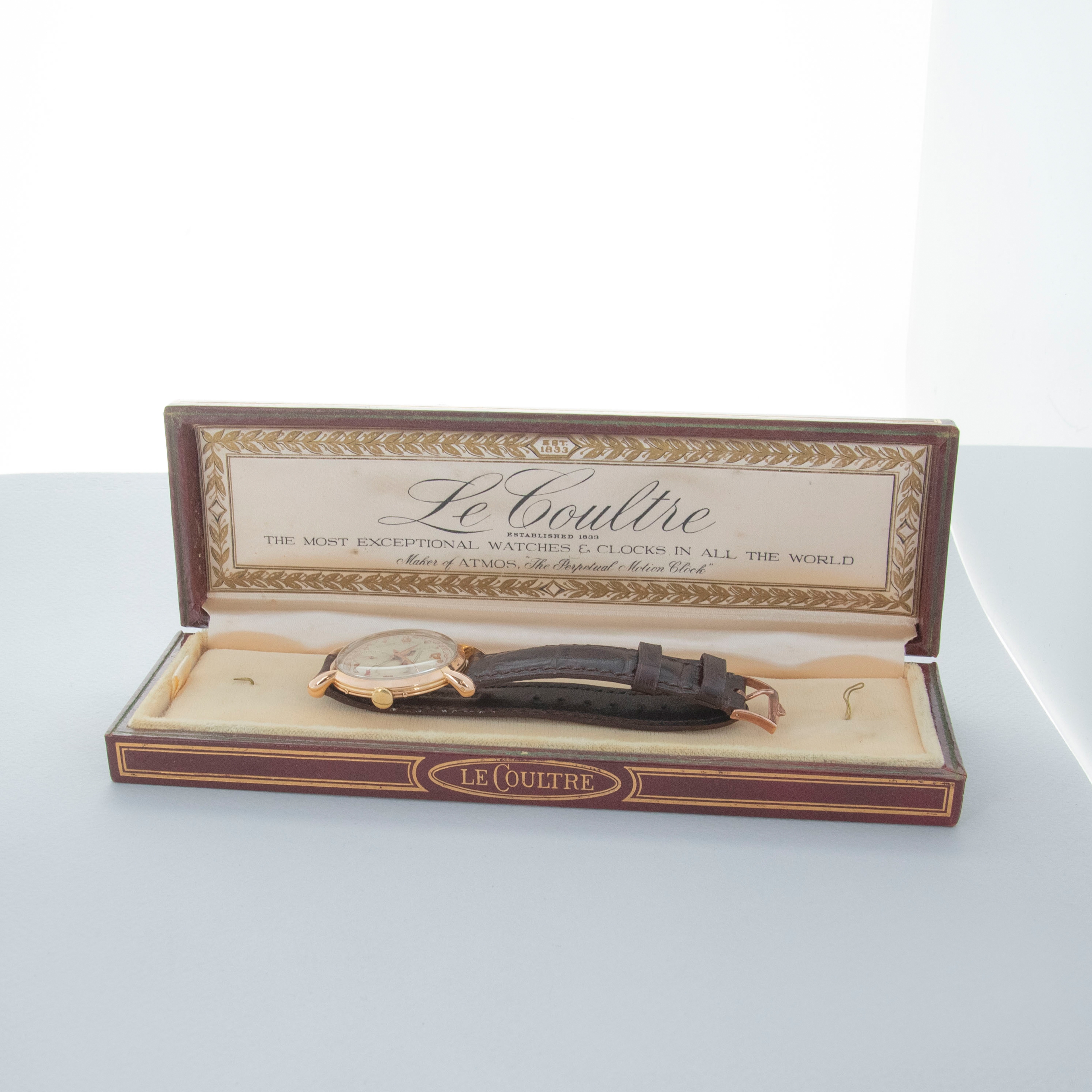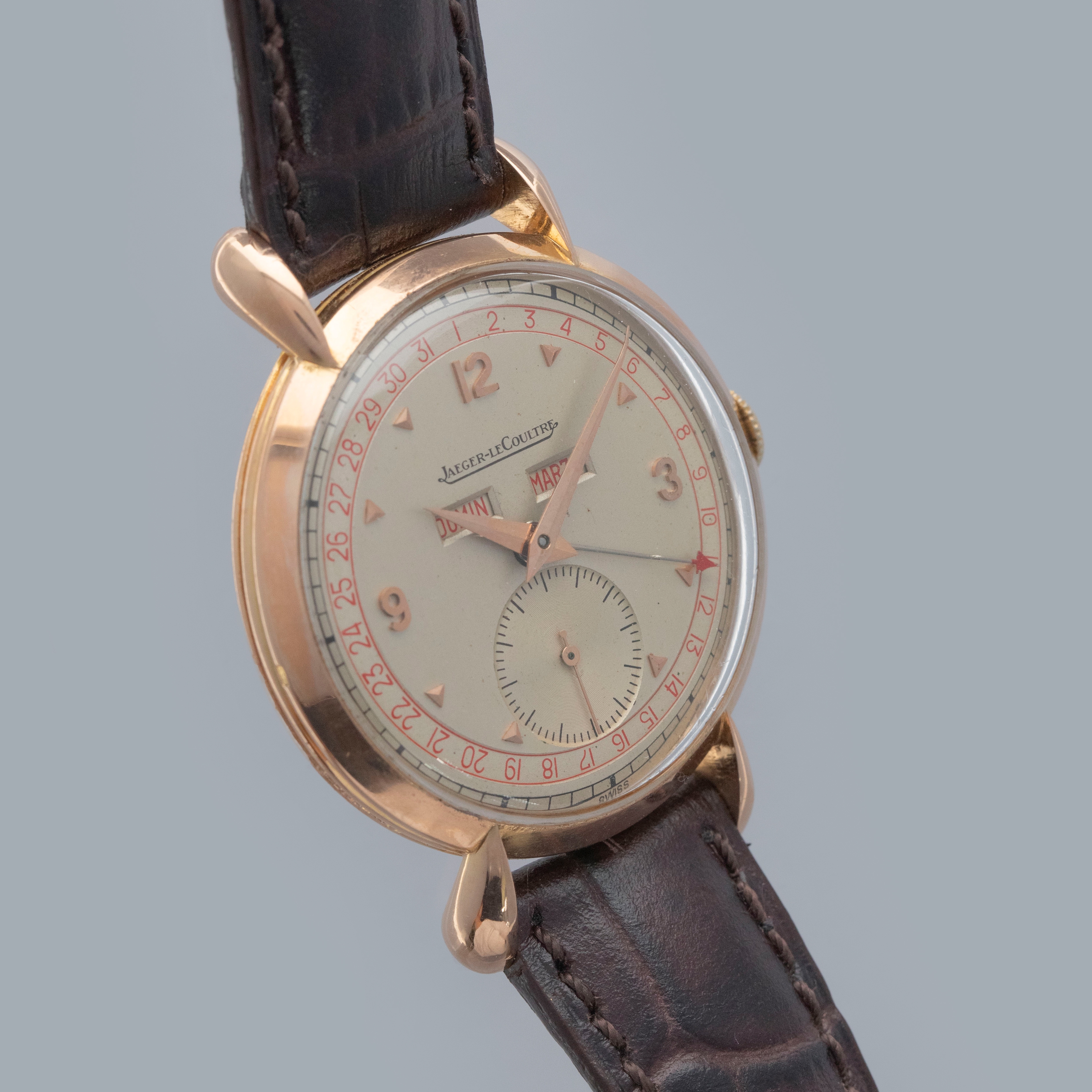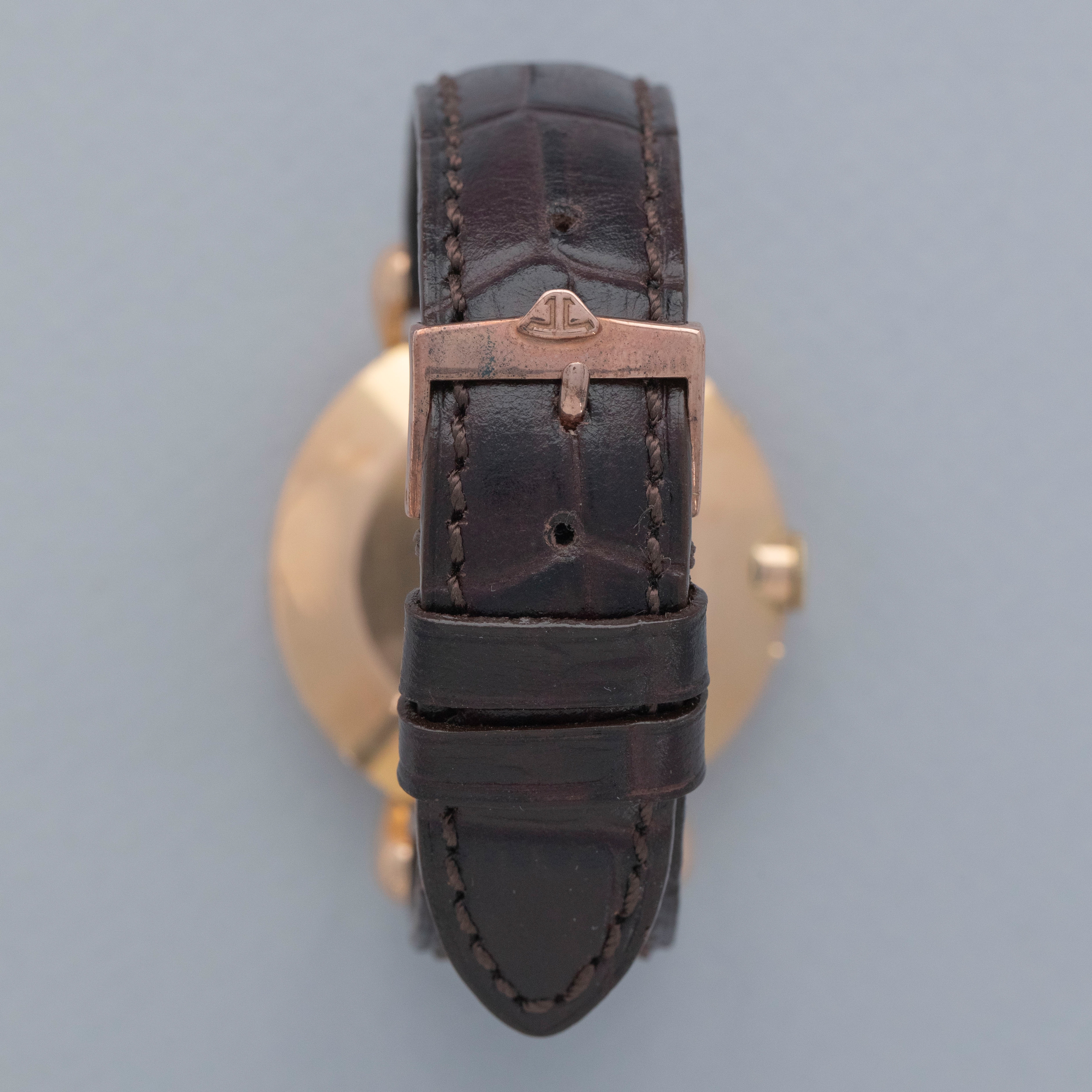 Watch is in overall excellent condition. The rose gold case shows surface scuffs and scratches, with clear hallmarks visible on the case side and lug. The case back retains well-defined stamps. The dial remains excellent, with some light surface spotting, while the hands are very clean, with a small chip visible to the red tip of the calendar hand. It is fitted with a brown alligator strap and a gold-plated Jaeger-LeCoultre pin buckle showing some tarnishing.