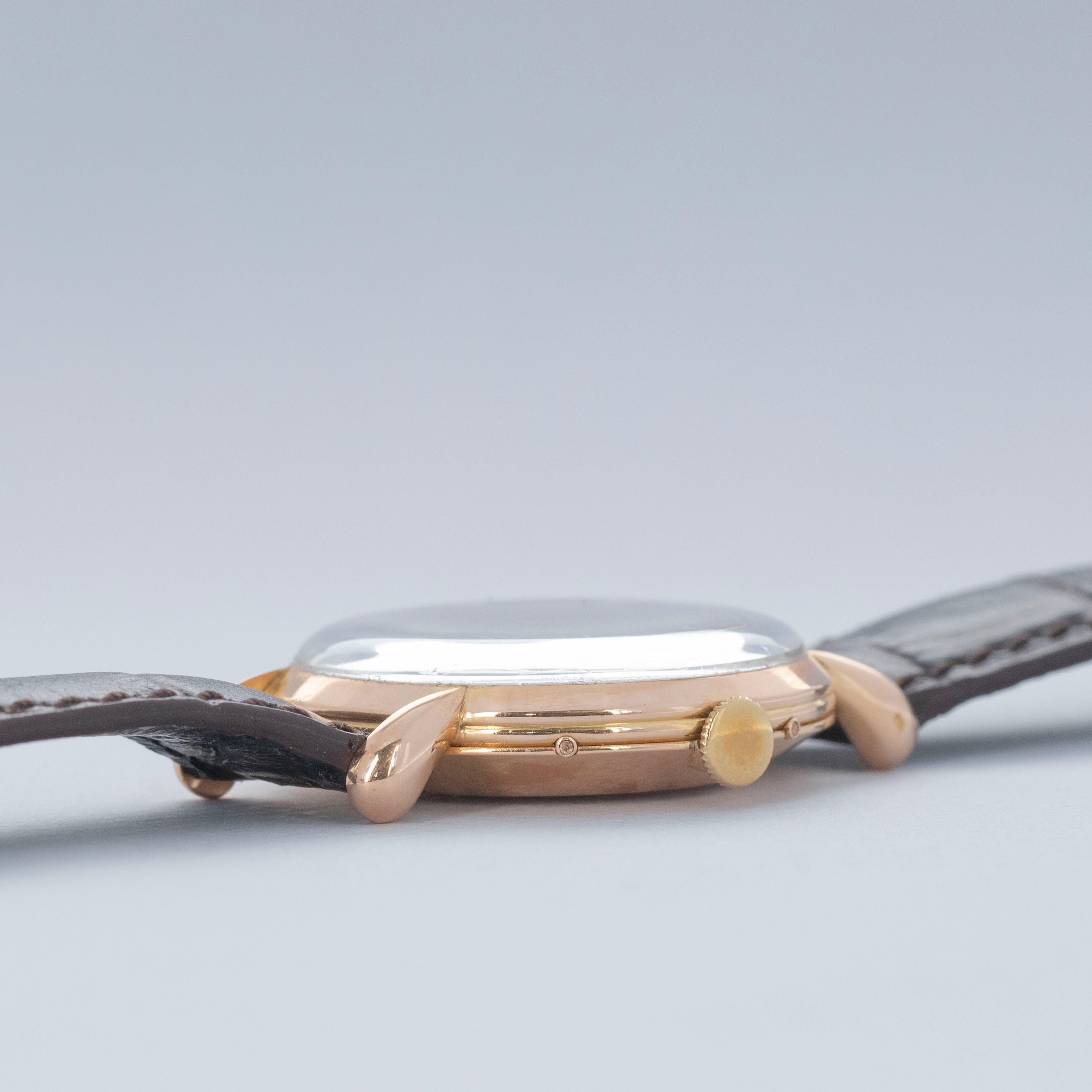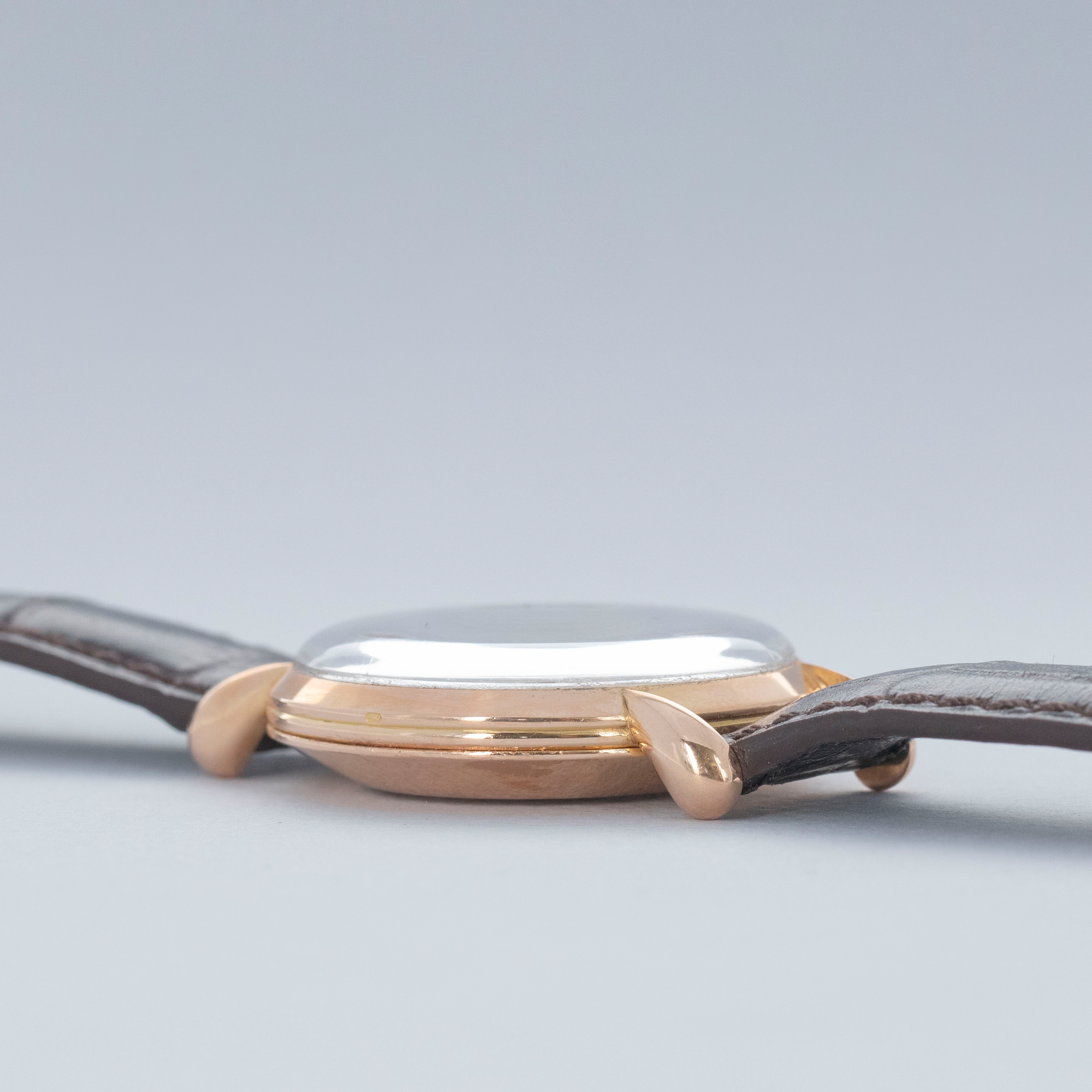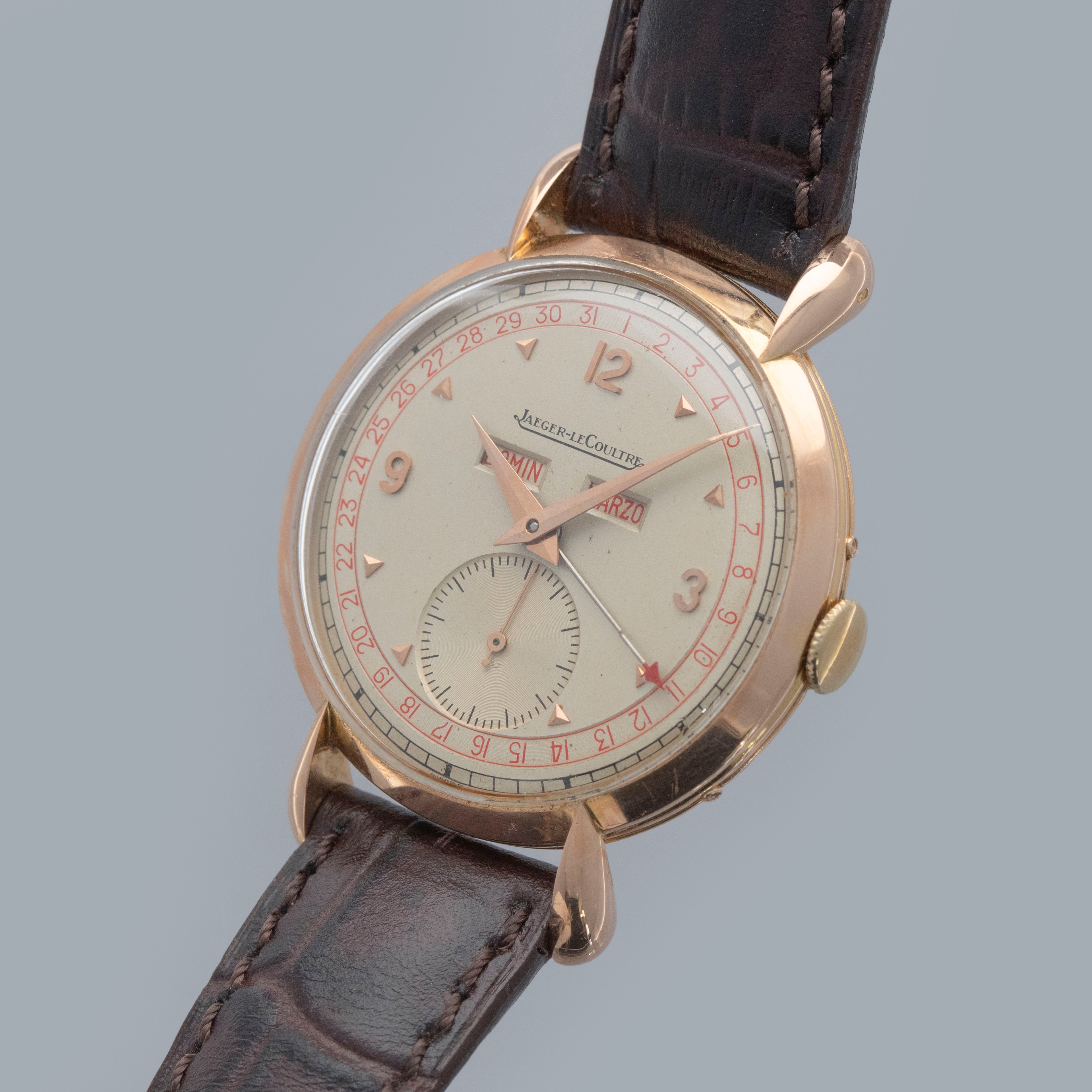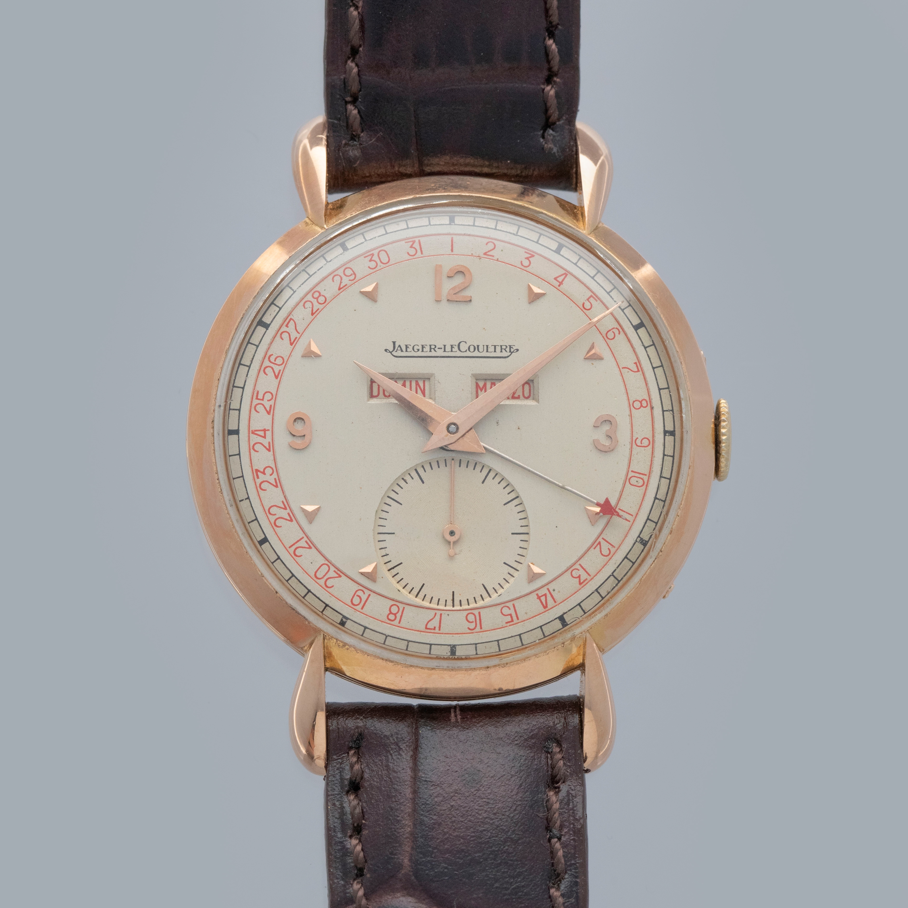 Founded in 1833, Jaeger LeCoultre has had one of the most successful and illustrious careers as a watchmaker, with over 1200 movements created and 400 patents filed under the brand's name. Today famed as the "watchmaker's watchmaker," Jaeger LeCoultre is best known for supplying movements to brands like Audemars Piguet, Patek Philippe, Vacheron Constantin, and a whole host of other horological heavyweights. Offered here, we have a vintage Jaeger Le Coultre ref. 2721 Triple Date, a fine 18kt pink gold dress watch with a stunning silver dial that houses a useful set of functions, such as its pointer date, the day, and date, all of which are displayed in red, and serve as perfect complements for its 18kt pink gold construction and dial furniture.