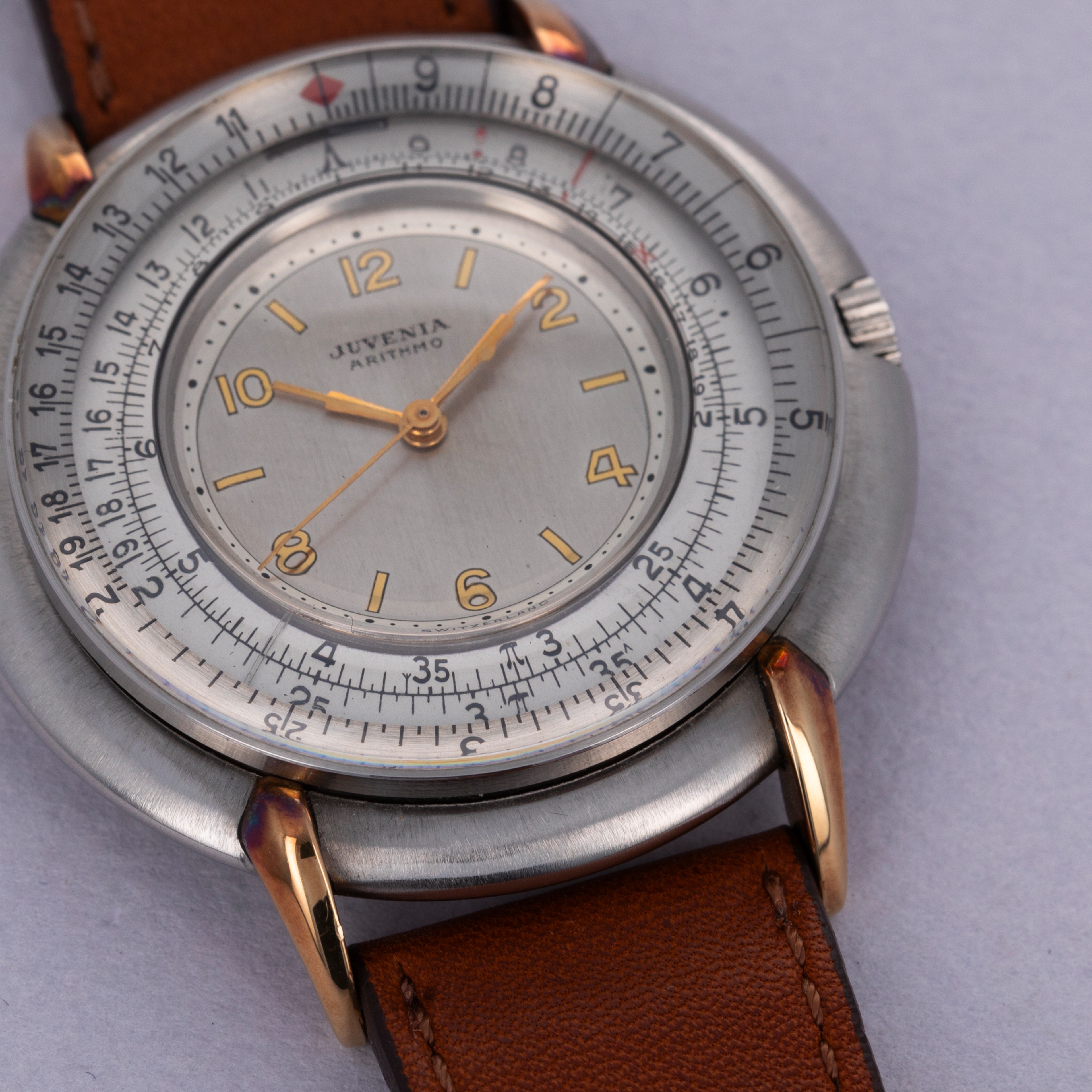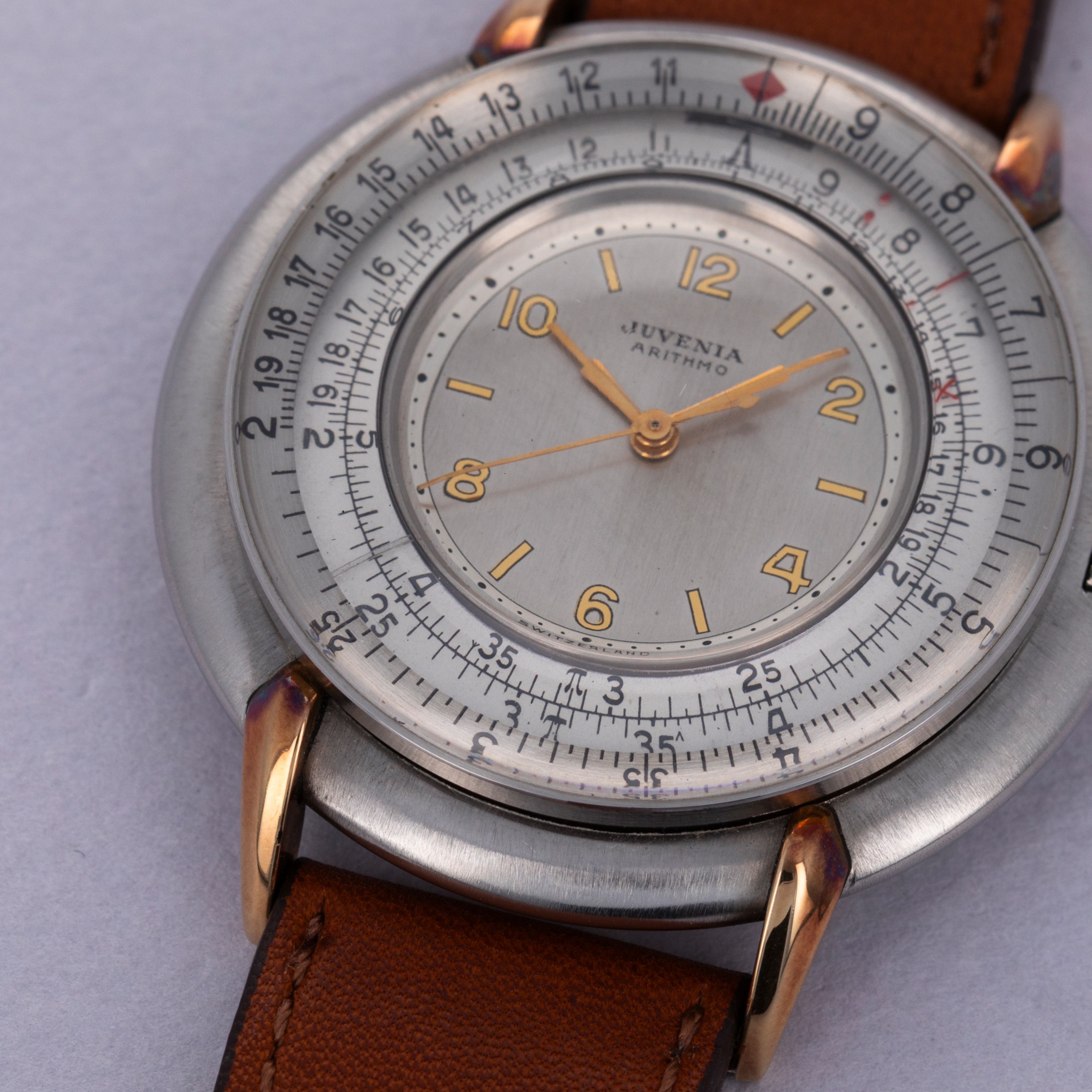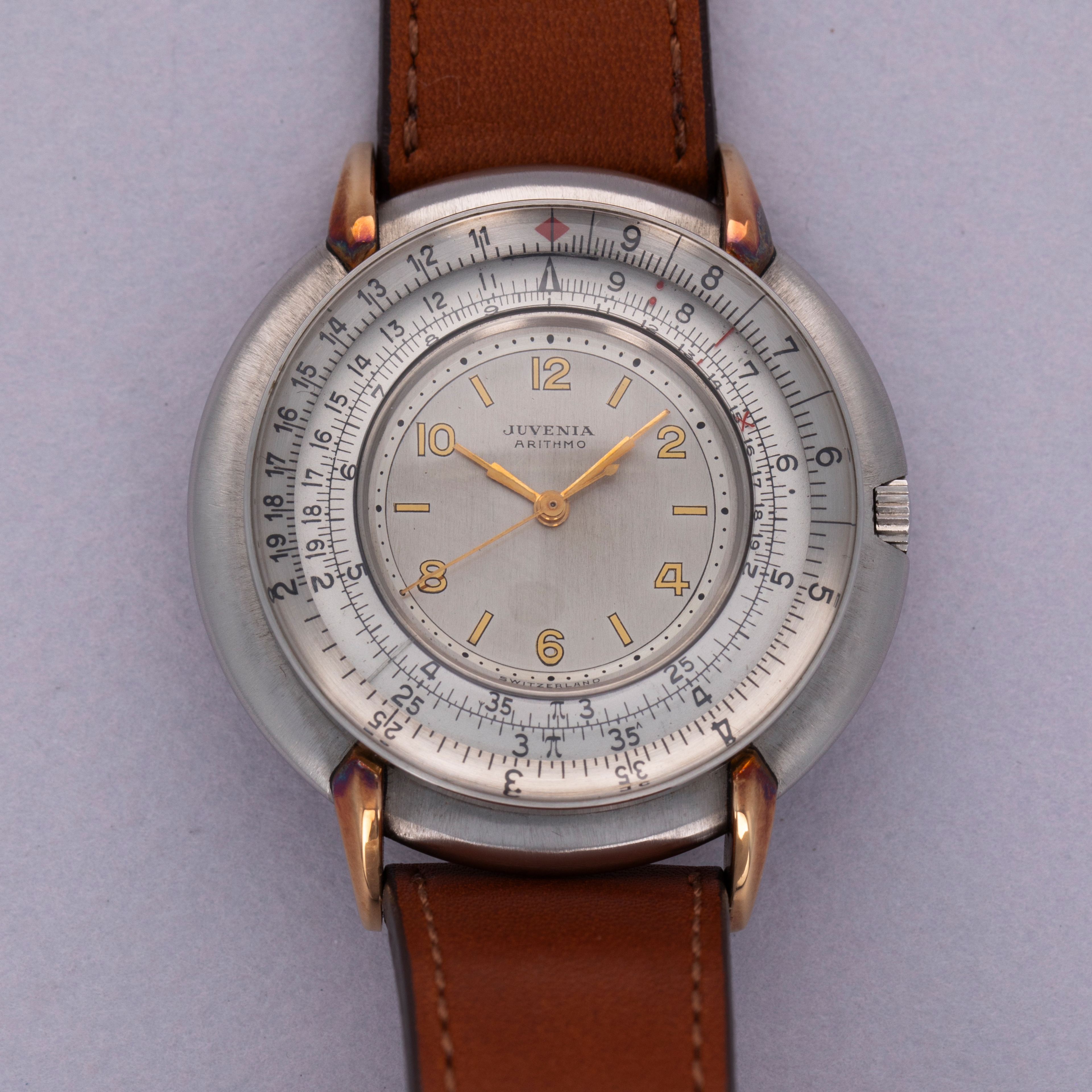 Beginning life in 1860, Juvenia can trace their origins to Saint-Imier in Switzerland after its founding by Jacques Didisheim-Goldschmidt. One of the few watchmakers to enjoy uninterrupted production since its founding, Juvenia have created a slew of timepieces best known for avant-garde designs, unorthodox constructions and unusual displays, of which the Arithmo that we have here features. Launched in 1945 to aid its wearer in performing calculations through its slide rule bezel, the Arithmo boasts a hulking (for the time) 42mm stainless steel construction with 18kt gold lugs. Boasting golden accents on its information-dense silver dial to match its golden lugs, the Arithmo feeds into Juvenia’s history as the creator of several wonderful and whacky timepieces that have come to symbolize the brand’s unique history.