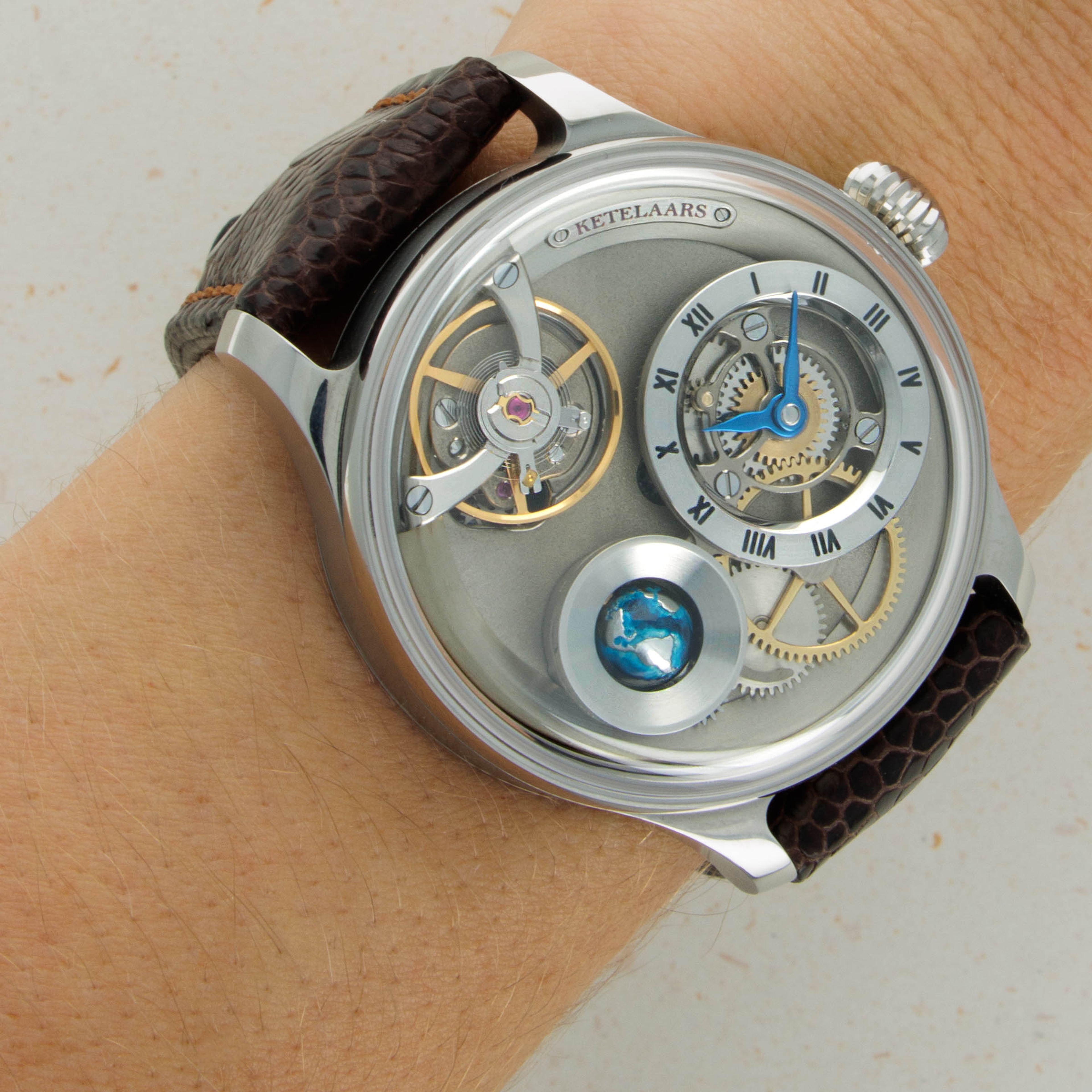 3D Terra in Motion also boasts an elevated balance wheel that sits on the timepiece’s dial, and a small hours and minutes dial that completes the trio. With the blued titanium hands matching the Earth’s blue oceans and the silver subdials popping against their hand hammered grey titanium backdrop, the Ketelaars 3D Terra in Motion is perhaps one of the most unique timepieces available in this price range. Encased within a simple stainless steel case and a boxed sapphire crystal, the 3D Terra in Motion wears uniquely on the wrist as its display provides the timepiece with an abundance of intrigue, while the contrastingly understated case allows all of the attention to slip by and be focused on the incredible dial.