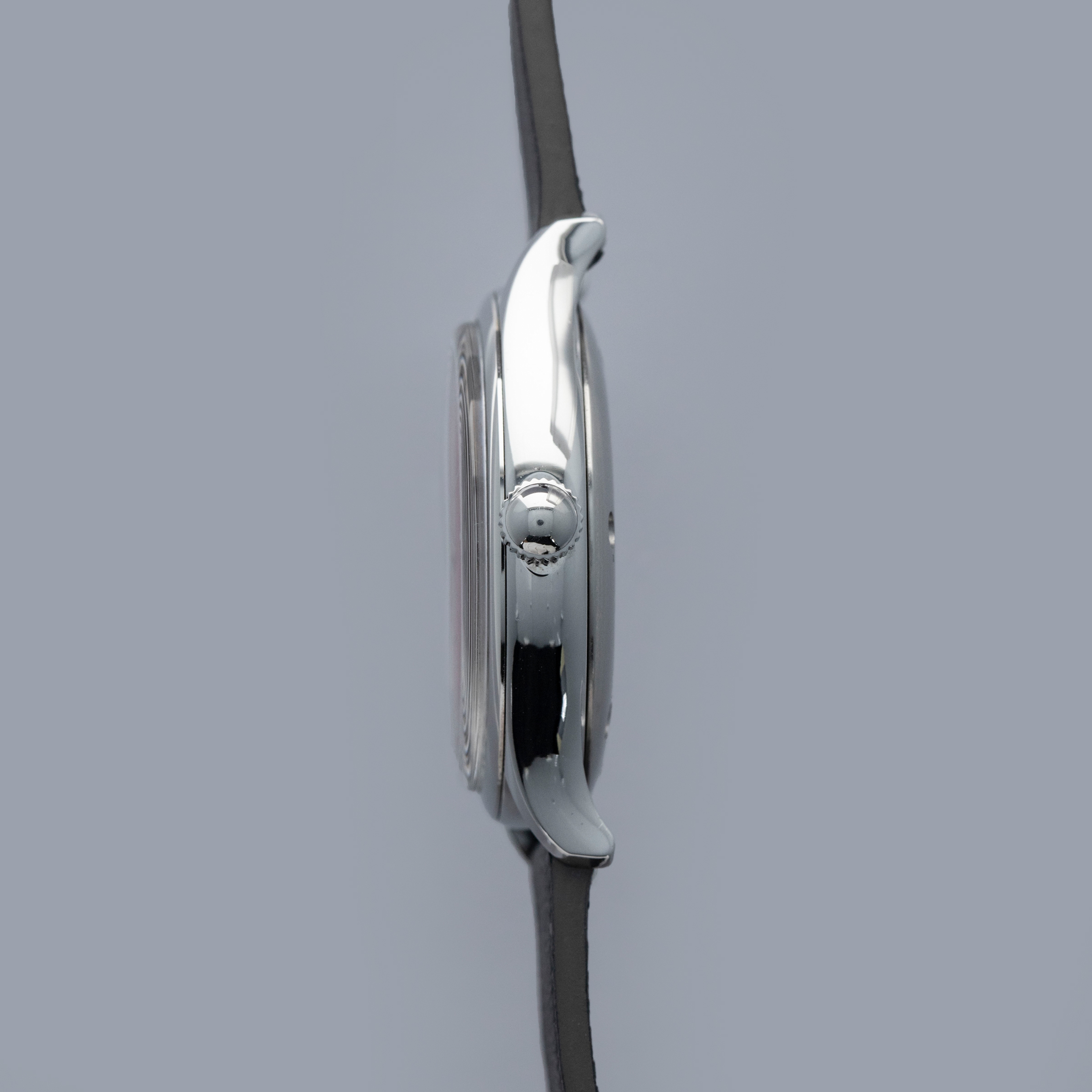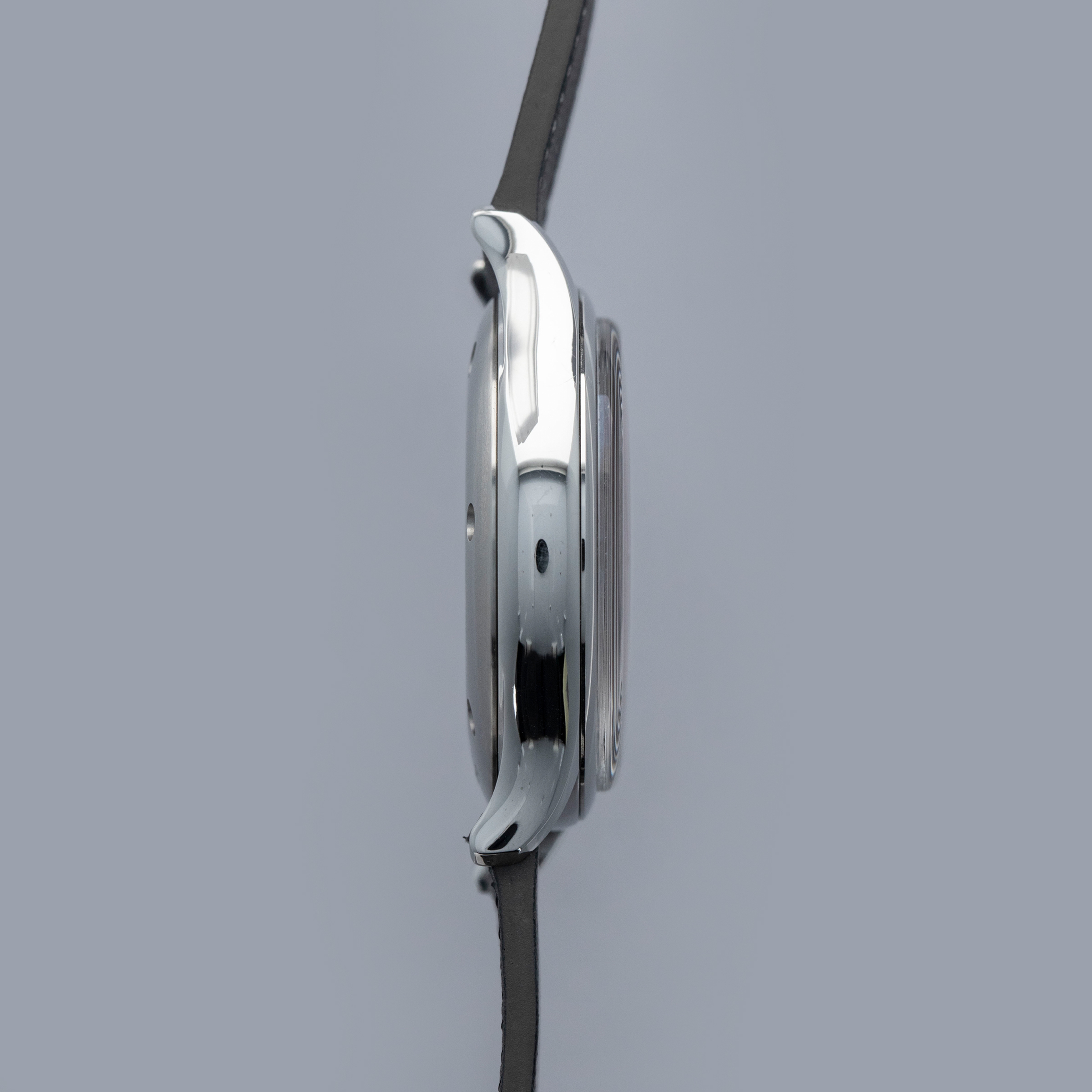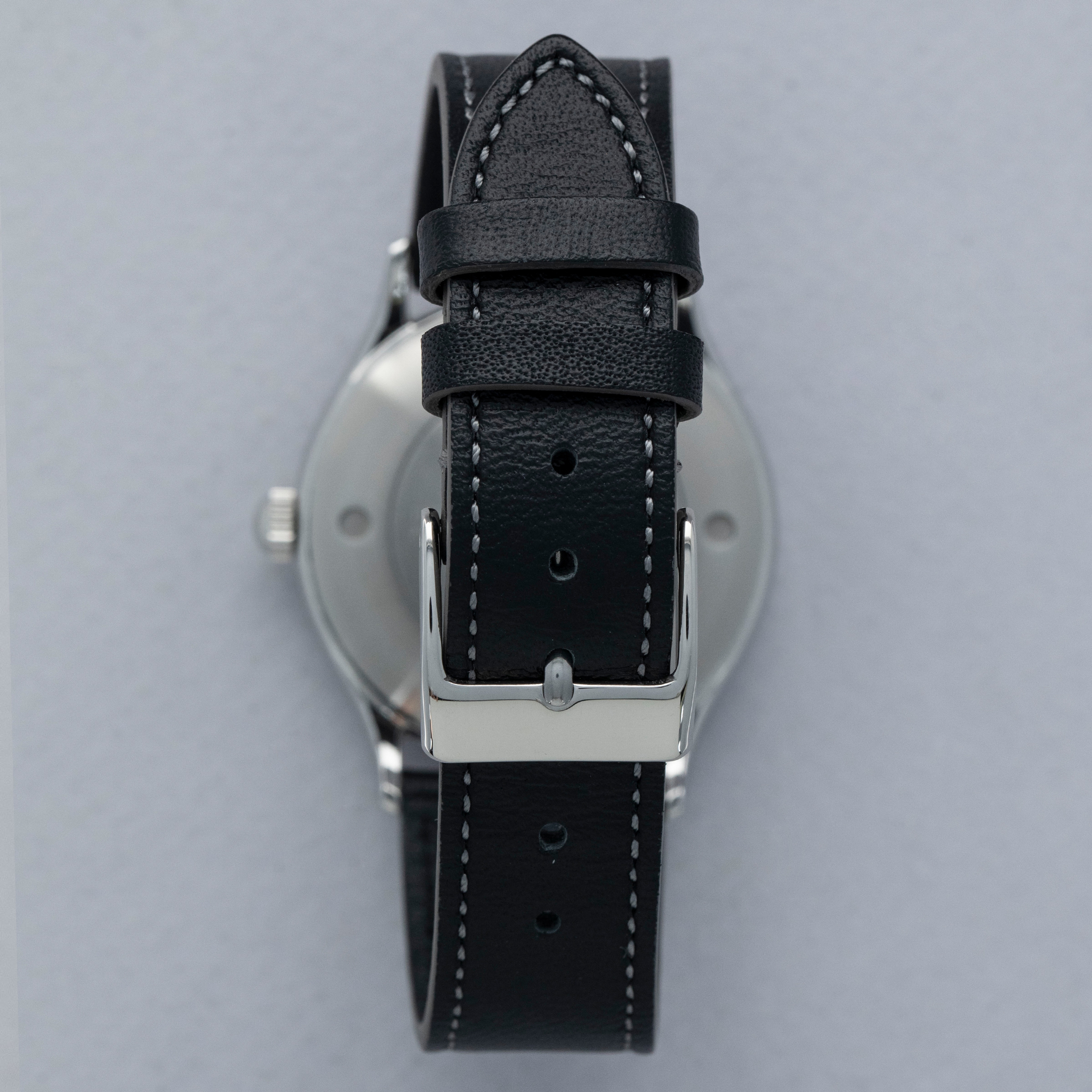 The watch is in near-mint condition. There are a few signs of wear on the case back and some very light scratches on the rear of the lugs. The dial and hands are pristine. The watch is fitted with a black leather quick-release strap with a steel buckle. Comes complete with box, papers, and accessories.