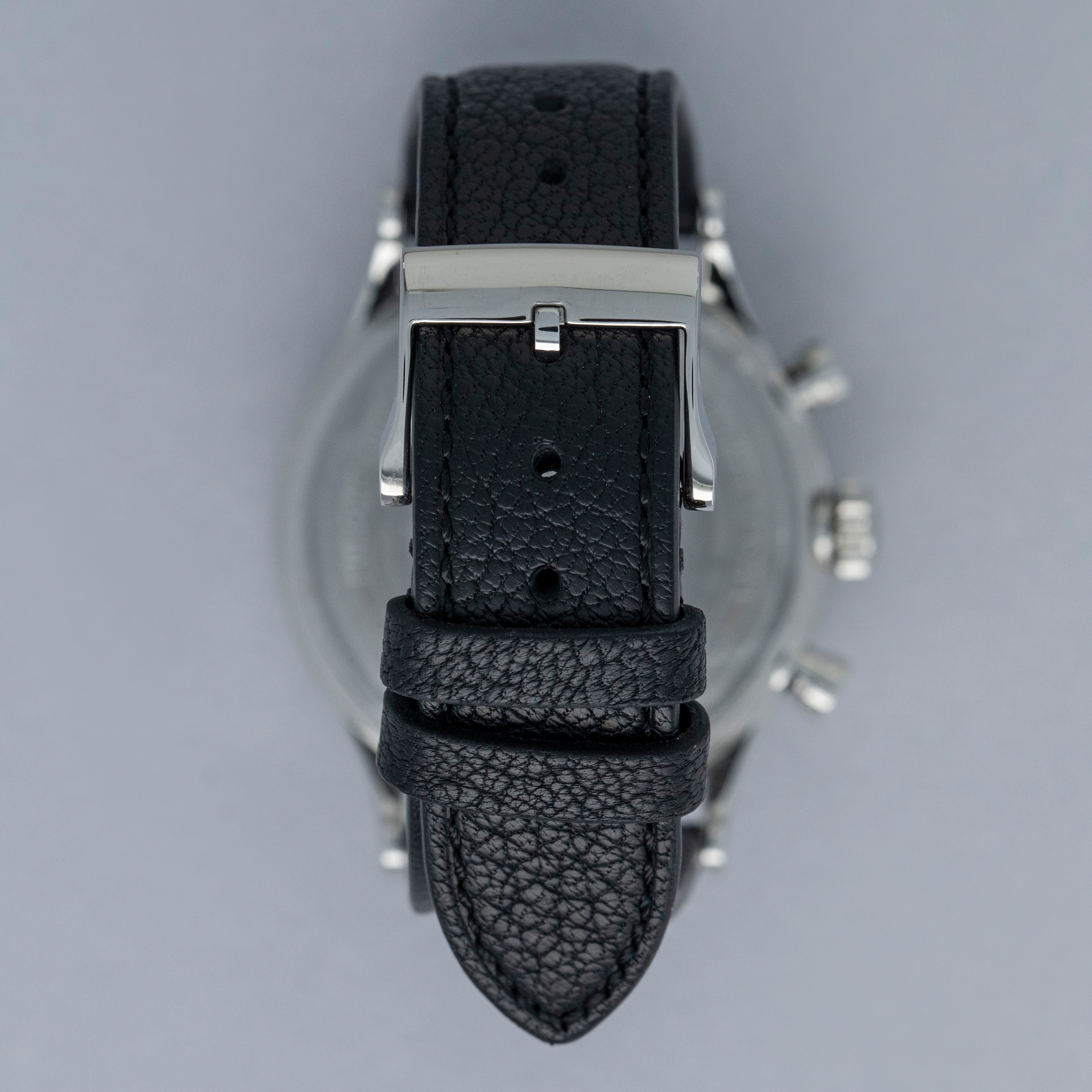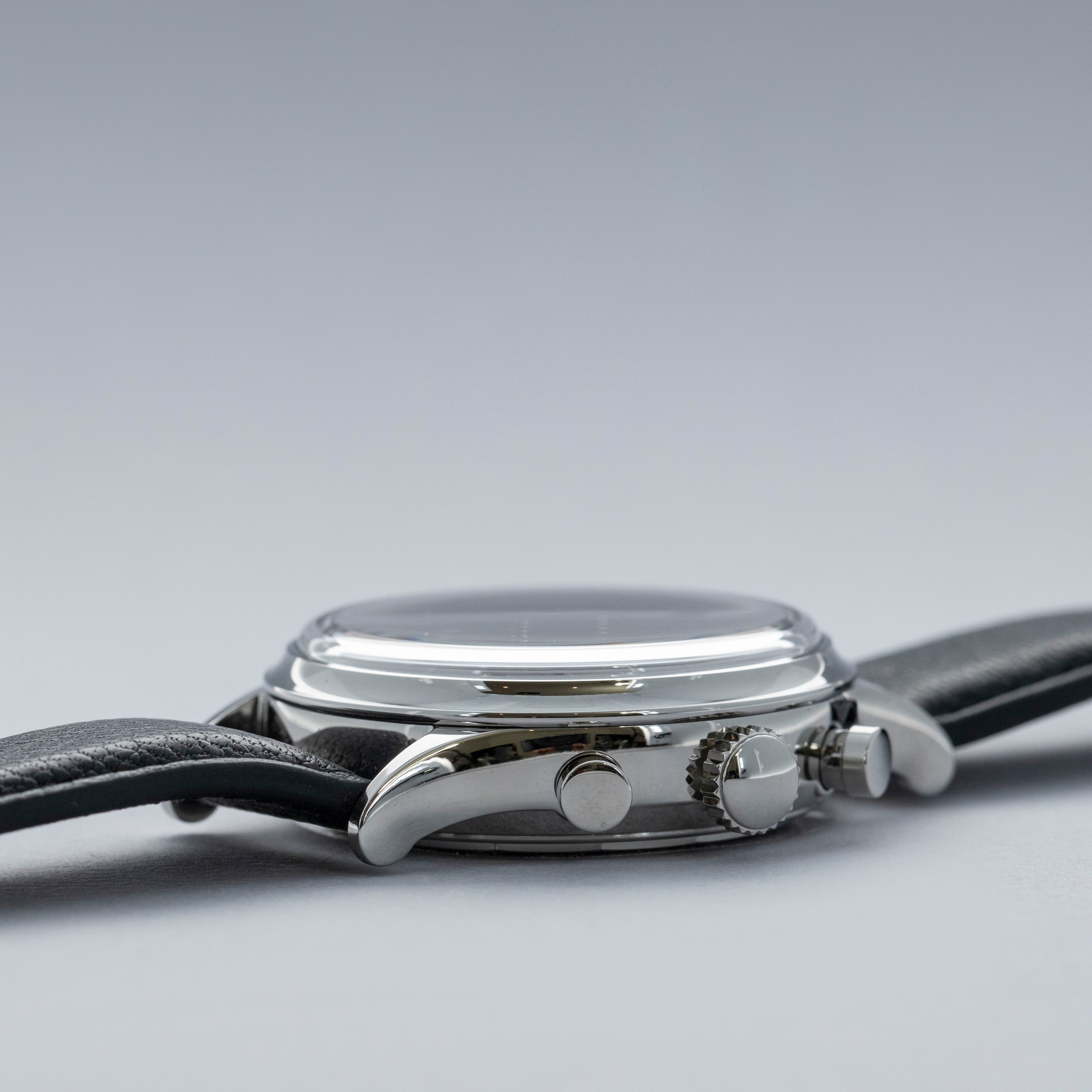 Inspired by the design eras of the past, the Chronograph 1's stainless steel physical construction is reminiscent of vintage watches of old with its heavily domed sapphire crystal, polished bezel, and pump pushers.