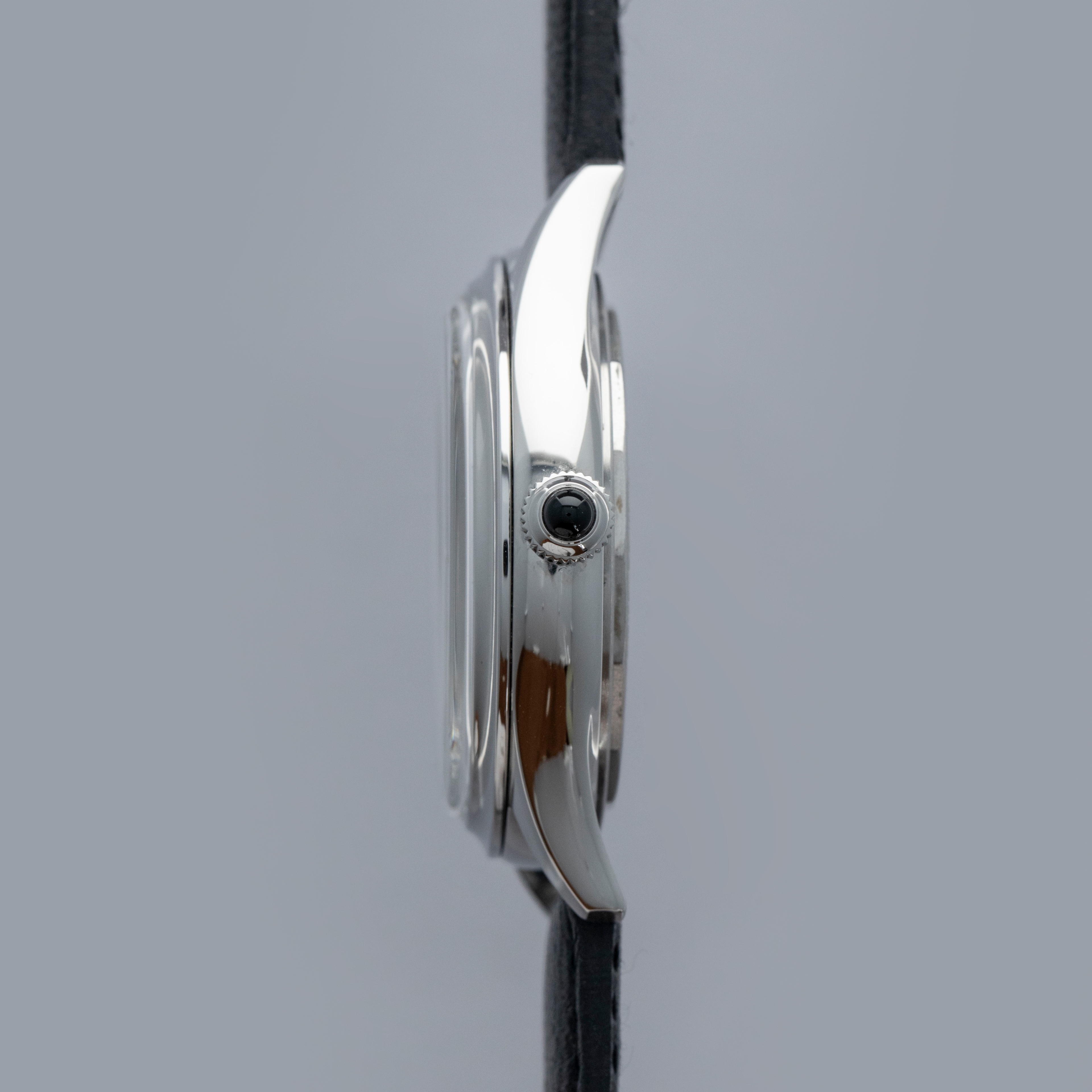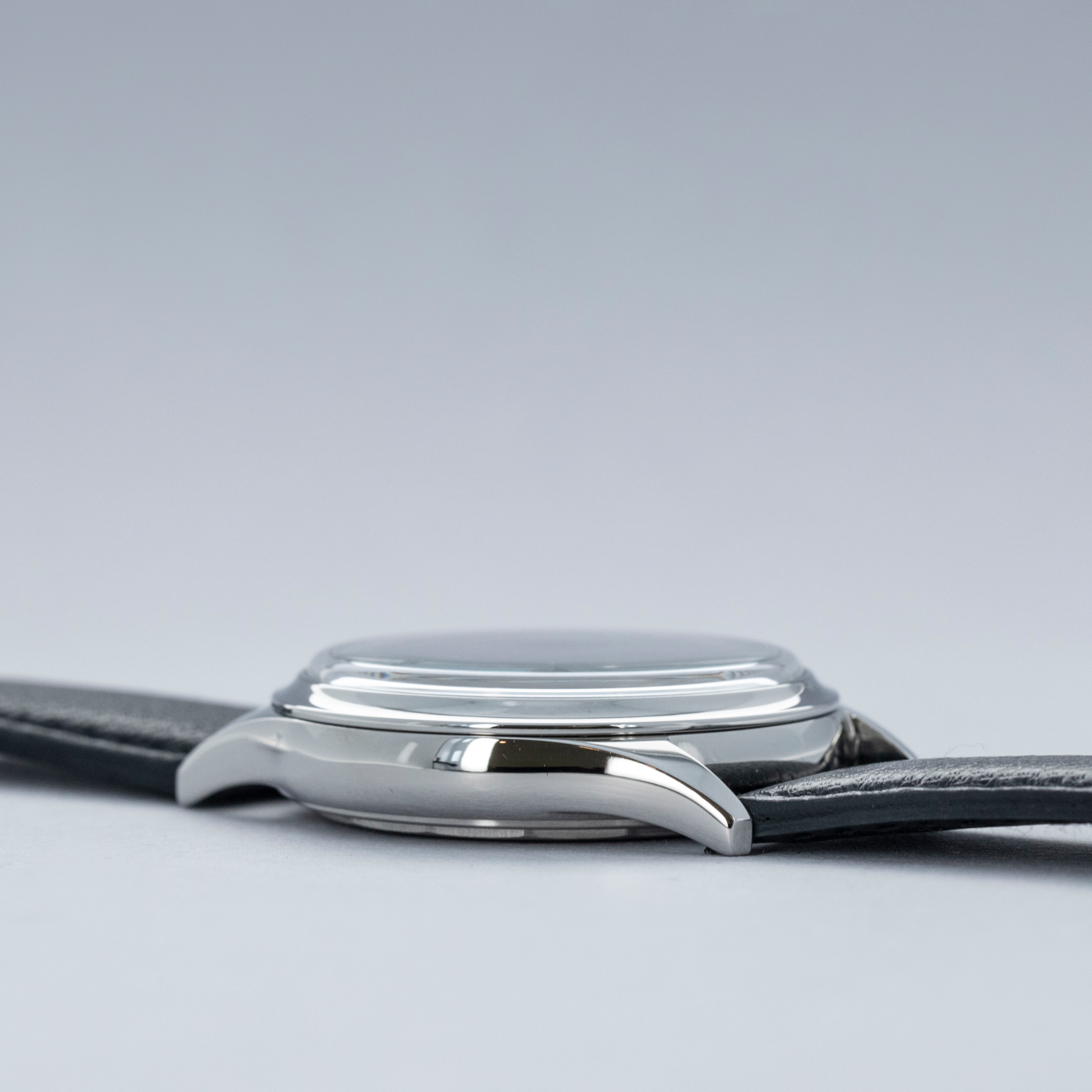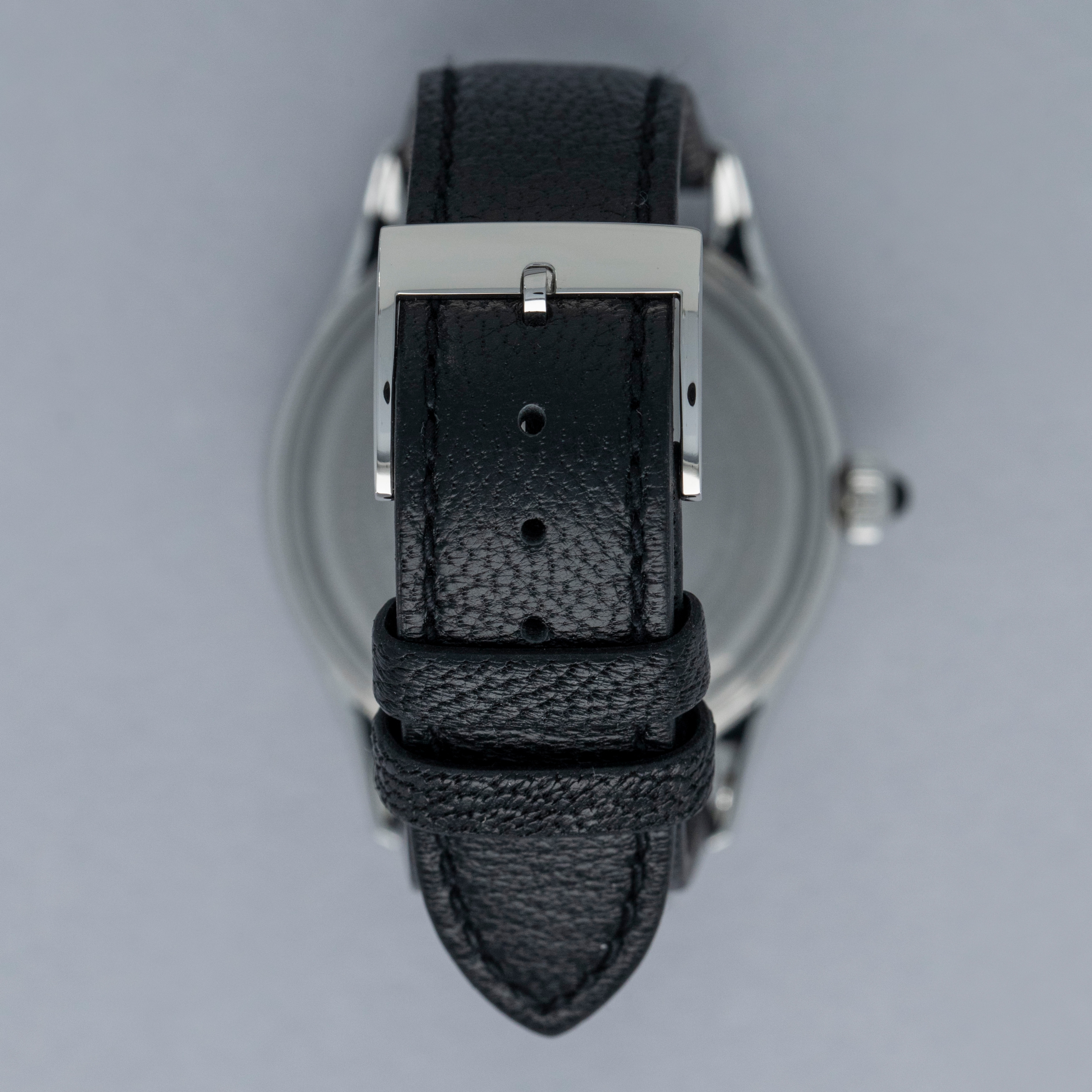 Watch is in overall near-mint condition. The steel case shows light signs of wear, while the dial and hands remain like new. It is fitted with a black leather strap and a steel pin buckle, both remaining in near-mint condition. Comes complete with inner and outer boxes, watch roll, warranty, and accessories.