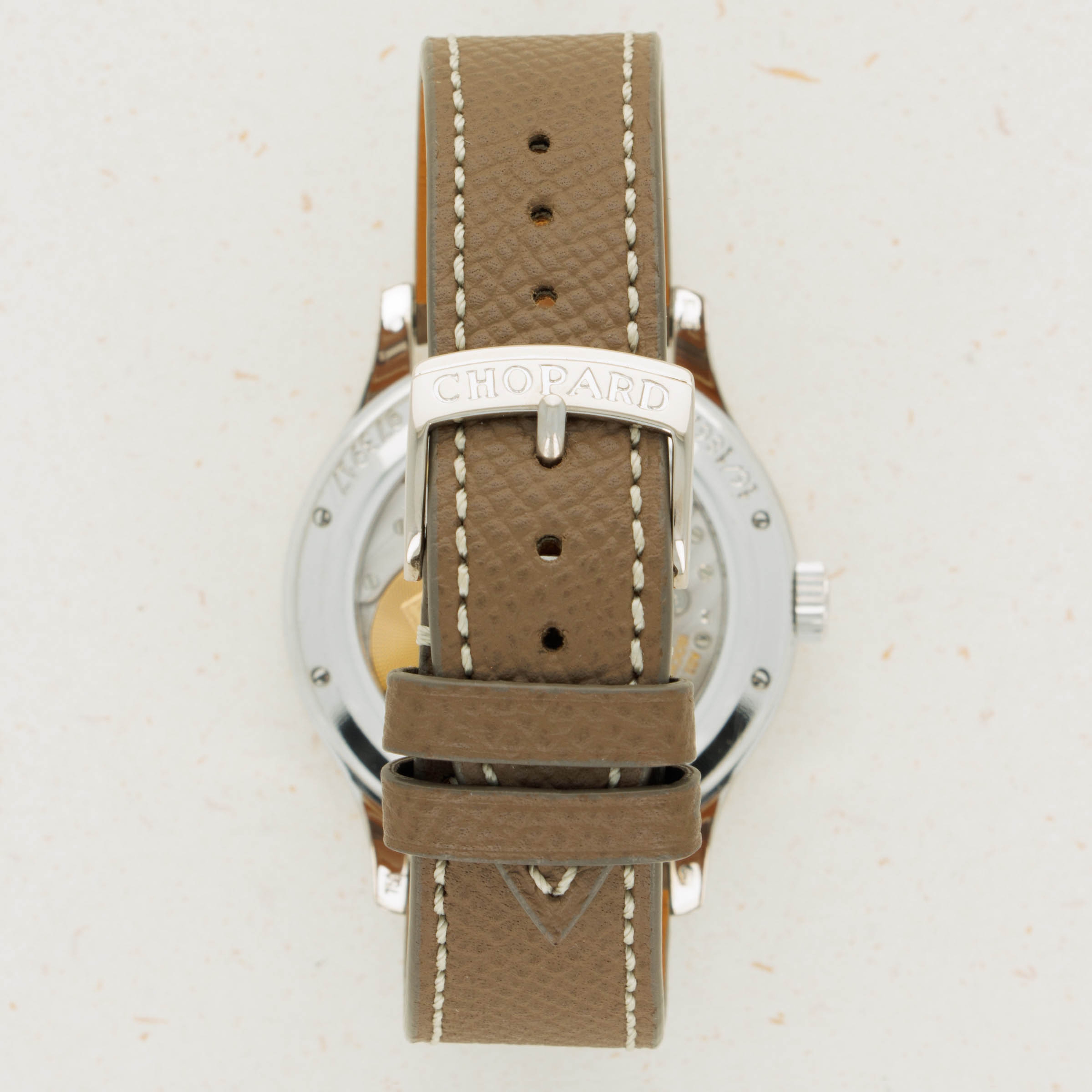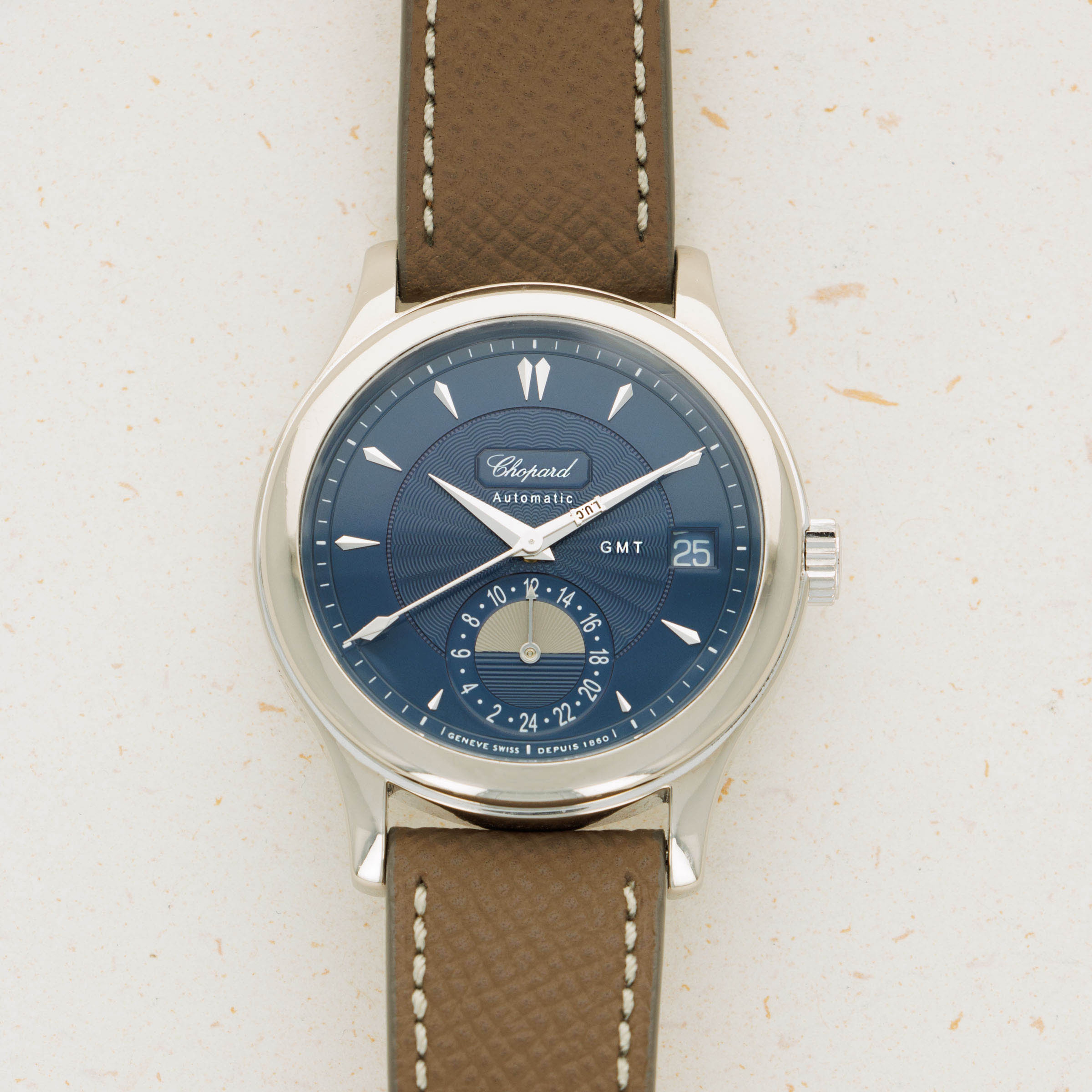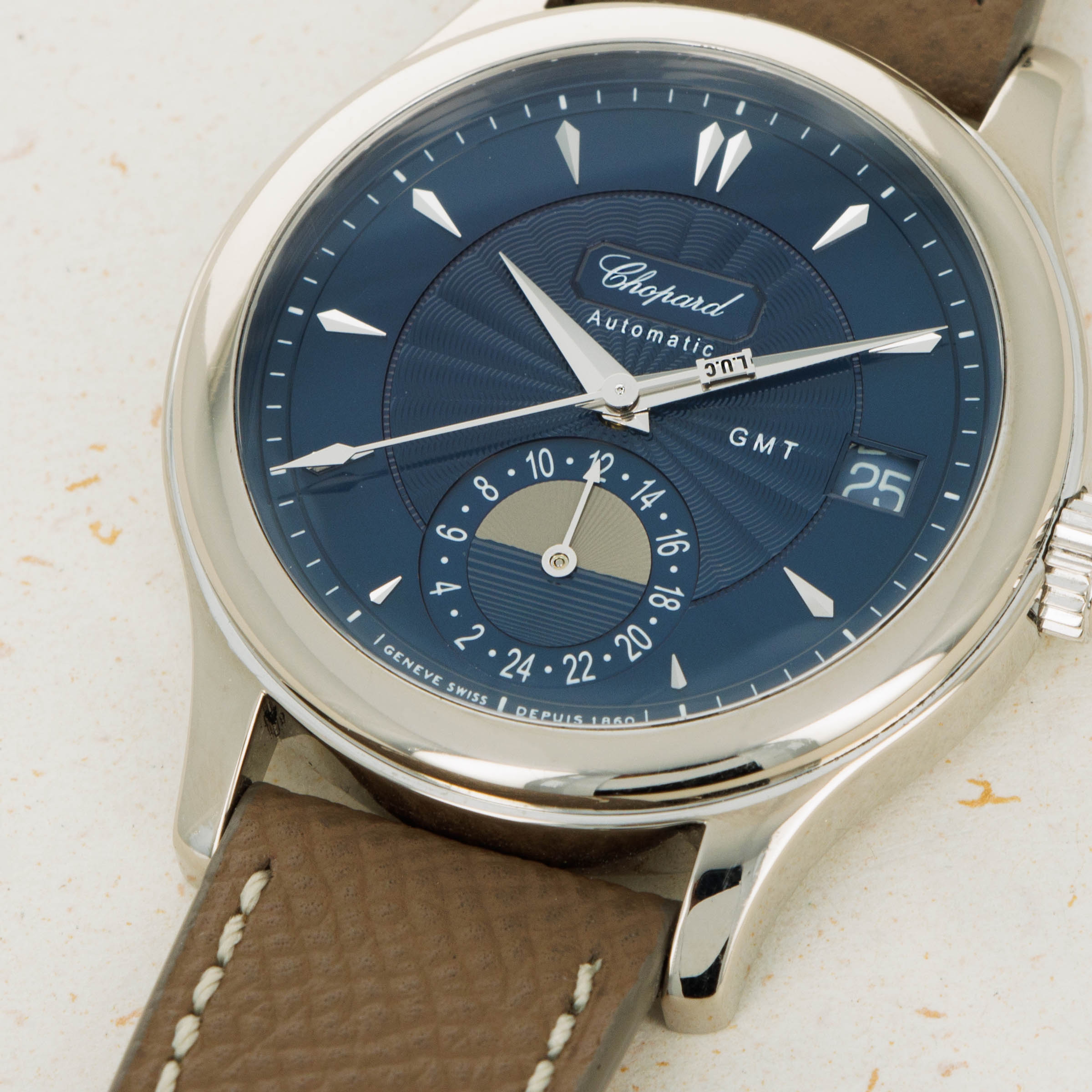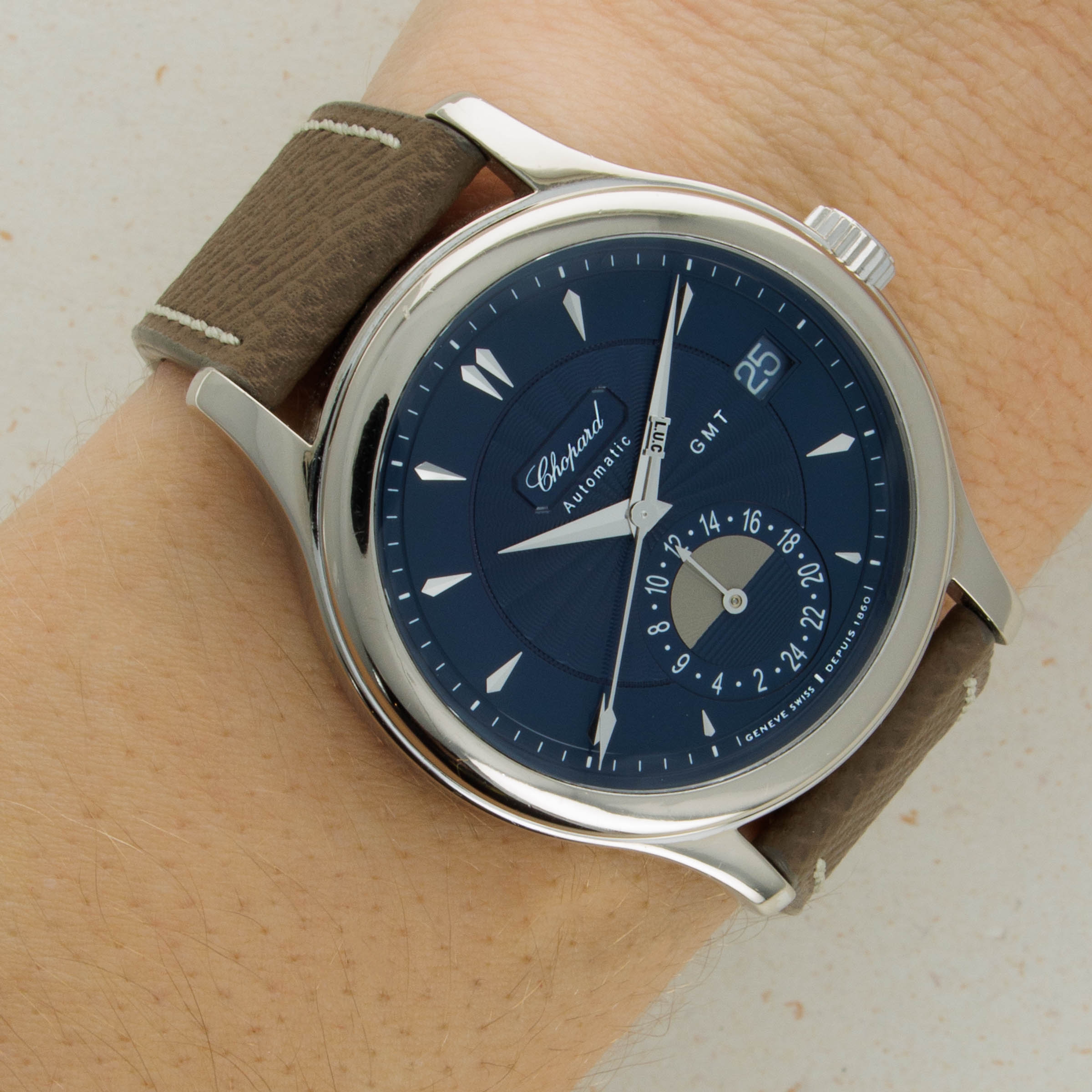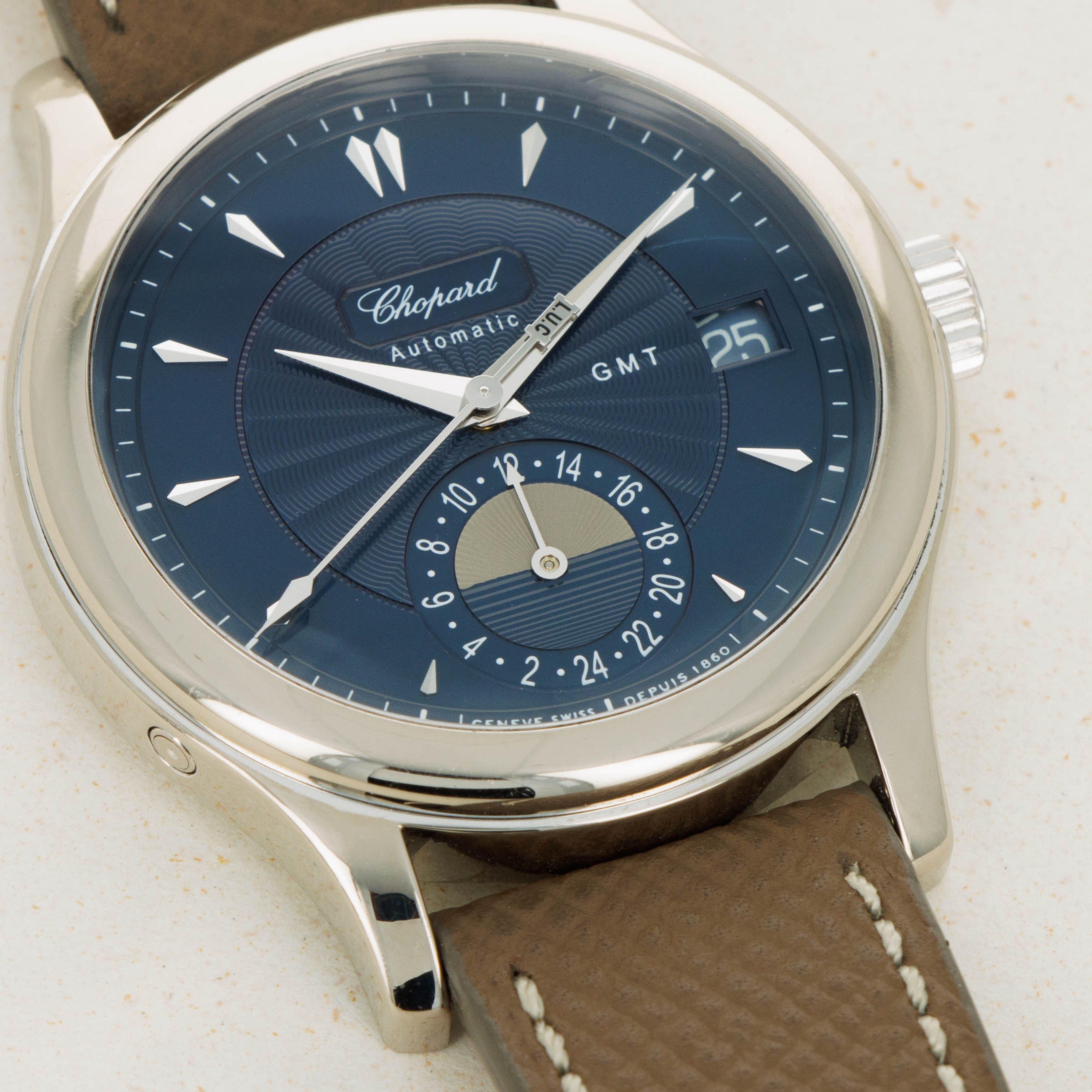 Boasting a blue dial with a stunning guilloche engraved center and a guilloche engraved AM/PM indicator, this GMT showcases the impressive craftsmanship it took for Chopard to produce such a beautifully well-made timepiece.