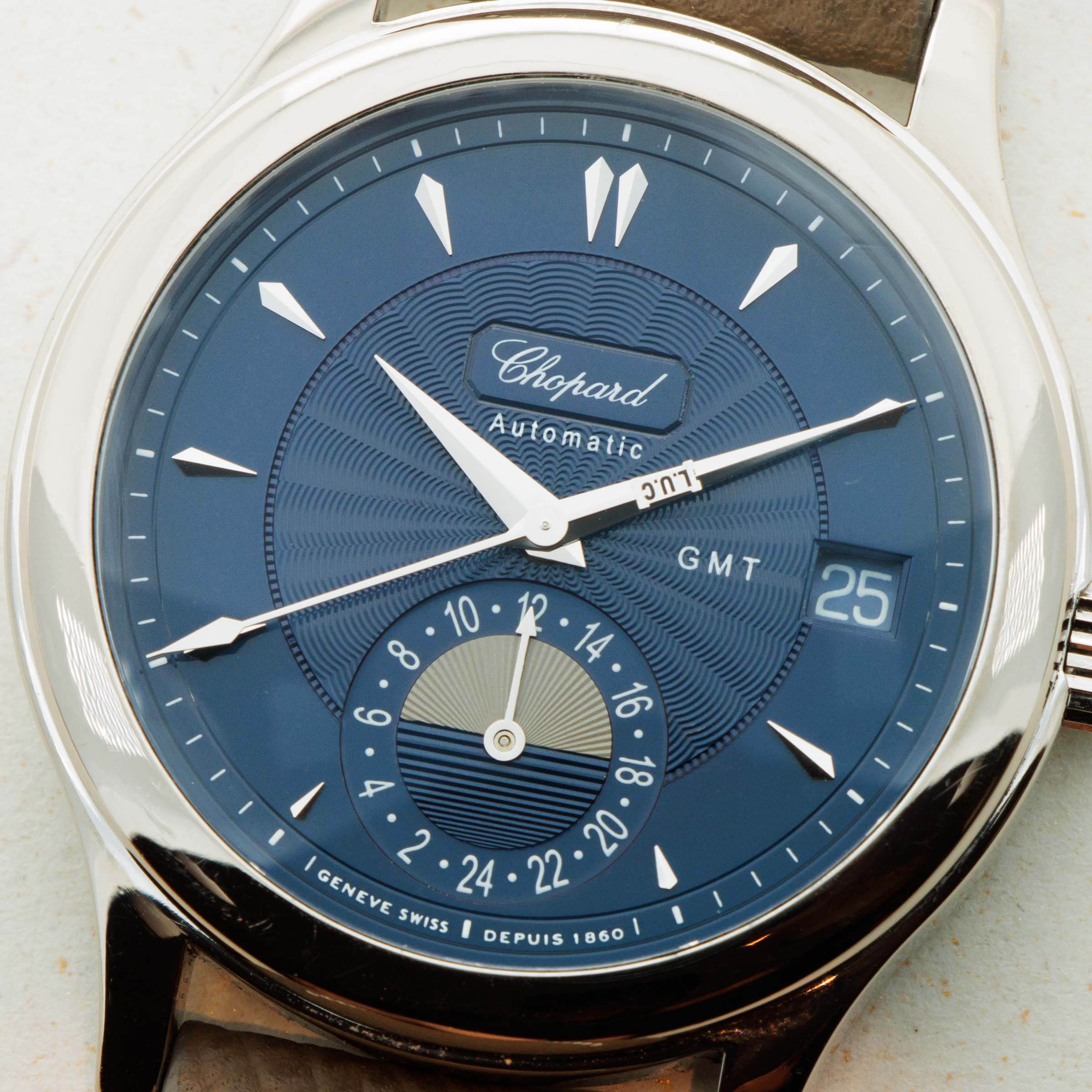 Launched in 1996, Chopard’s L.U.C. segment (named after Chopard's founder) was set up to commemorate Chopard's heritage as a high-precision movement manufacturer. Perhaps the ultimate expression of Chopard's watchmaking prowess, watches produced by L.U.C. include some of the most laboriously produced movements to come from Switzerland. The processes used to produce these movements include delicate hand finishing, accurate assembly, tedious testing, and careful casing. In 2004, Chopard and Parmigiani Fleurier even came together to create a certification to attest that 100% of a watch head was made in Switzerland, an attempt to combat the Swiss Government's lackluster definition of "Swiss Made” whereby only 60% of the value of a watch has to come from Switzerland. Ever since its inception, Chopard’s L.U.C. timepieces have become celebrated pieces of horology, and this limited edition GMT of only 1860 pieces is no different with its beautiful blue guilloche dial, stunning movement, and wonderfully classical 38mm x 10mm 18kt white gold case. A dress watch in style, but far more than that, this timepiece boasts a date and a second time zone set around an AM/PM indicator that introduces some grey to the dial alongside another guilloche pattern that contrasts the pattern found the rest of the dial, thus drawing attention to the craftsmanship and attention to detail required to produce this wonderful watch.