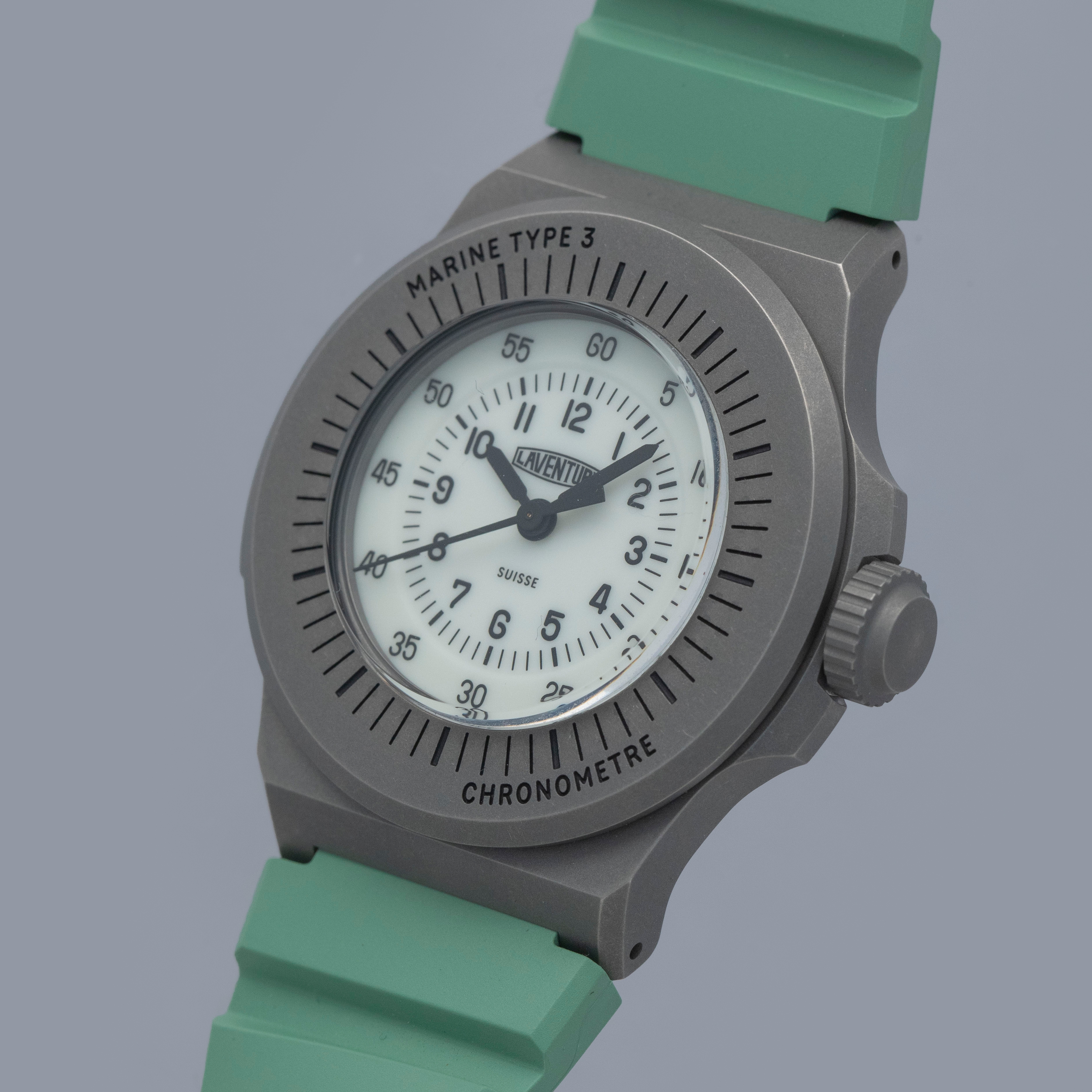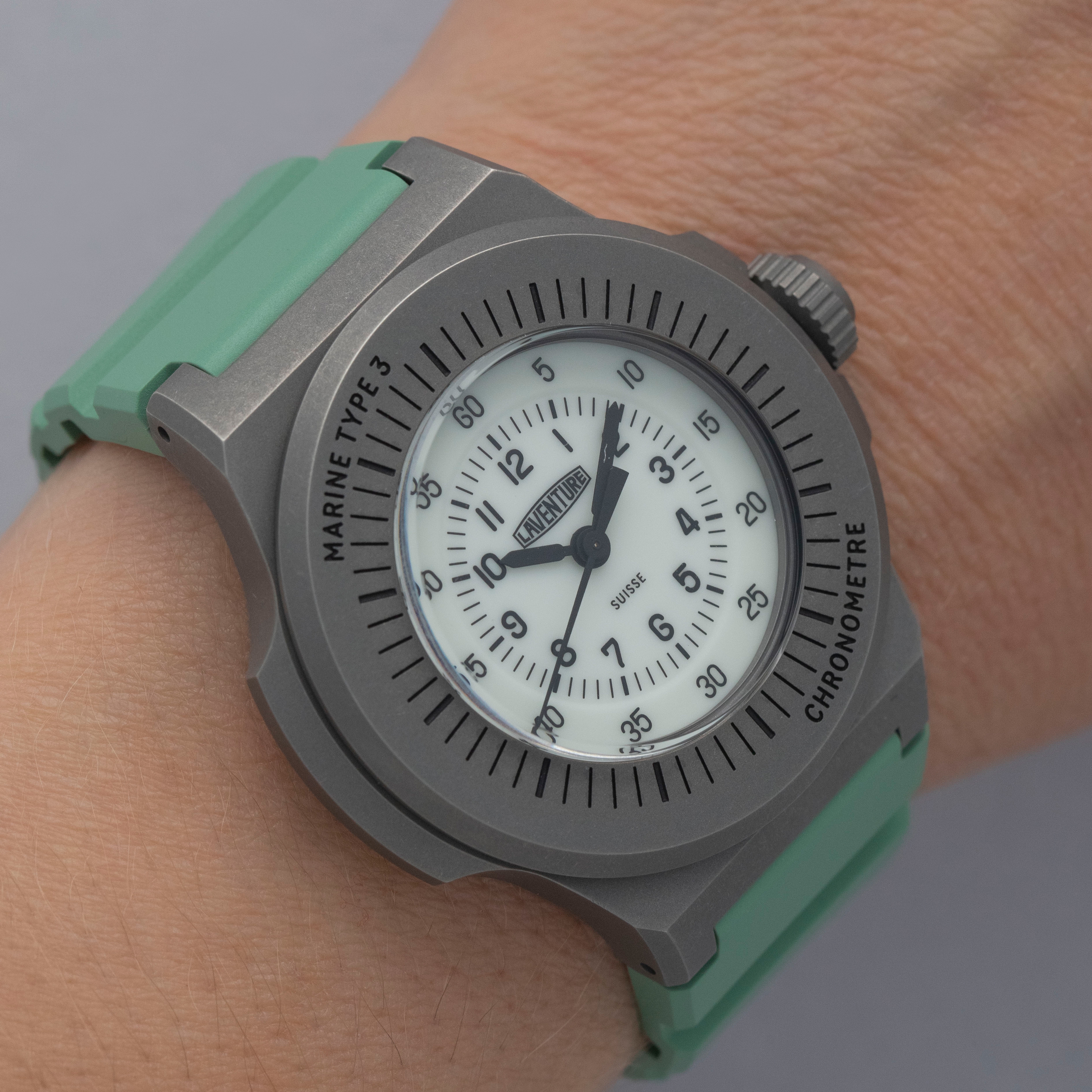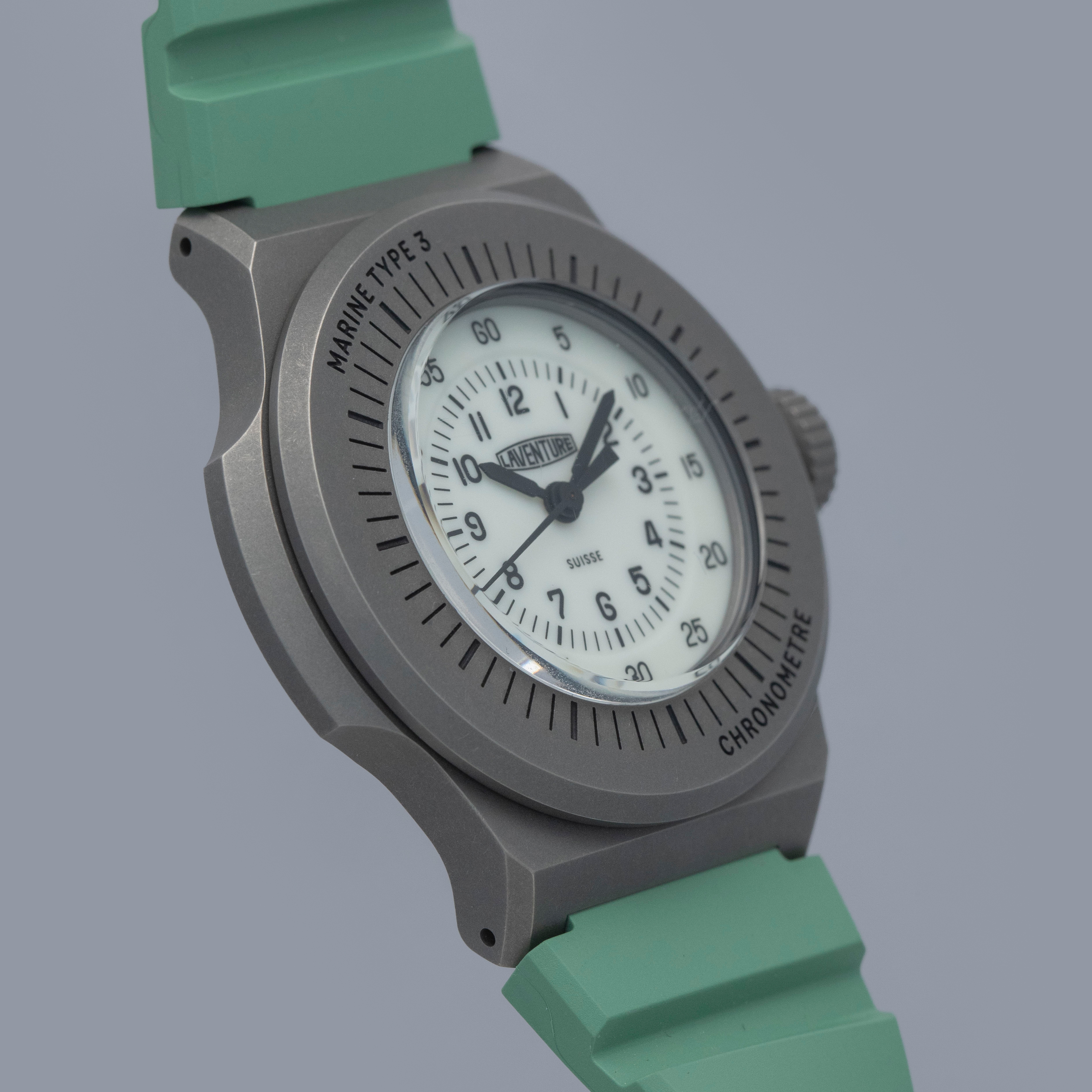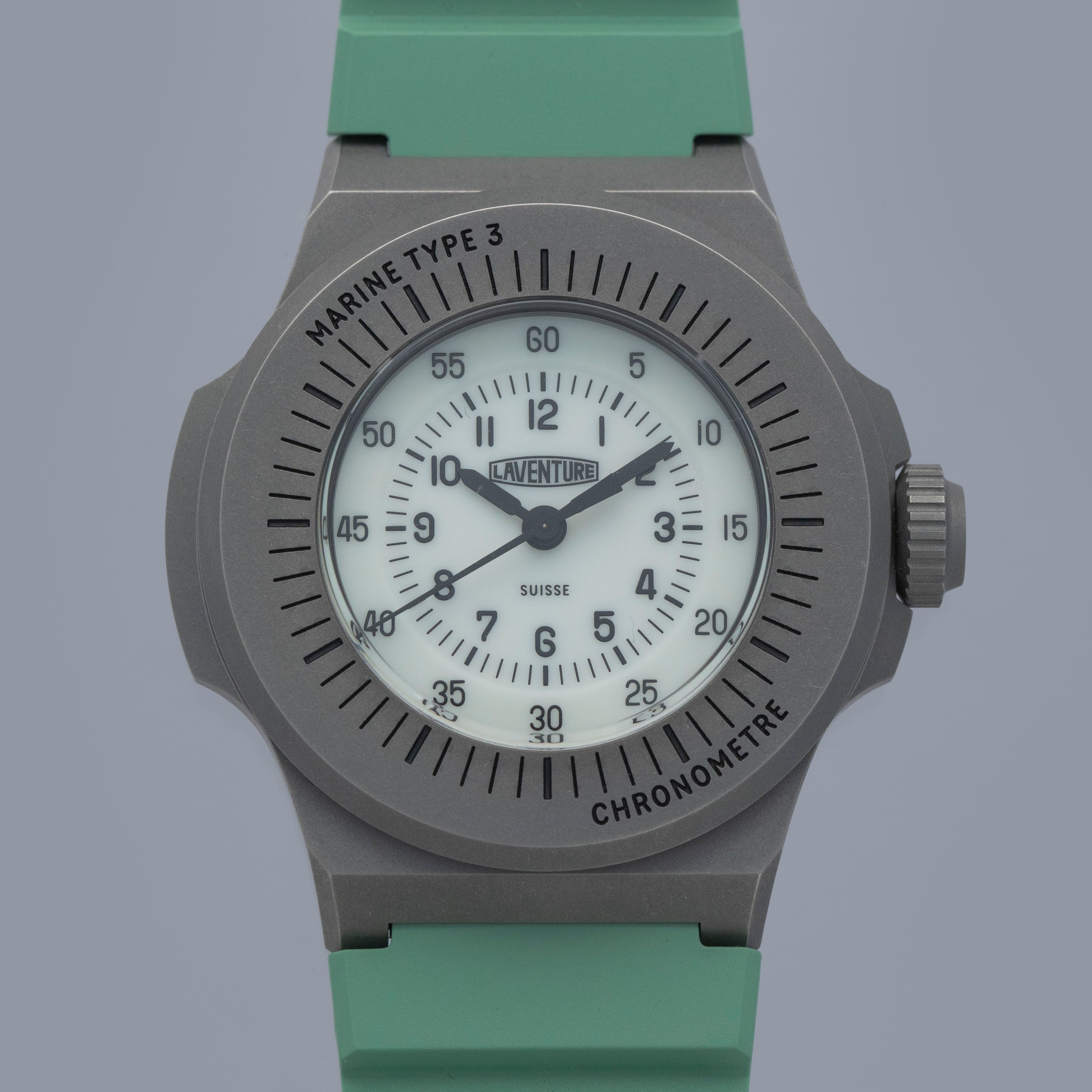 Made of grade 23 titanium, the Marine Type 3's 38mm case construction is dark in color, and serves as the perfect background for its bright dial and green rubber strap.