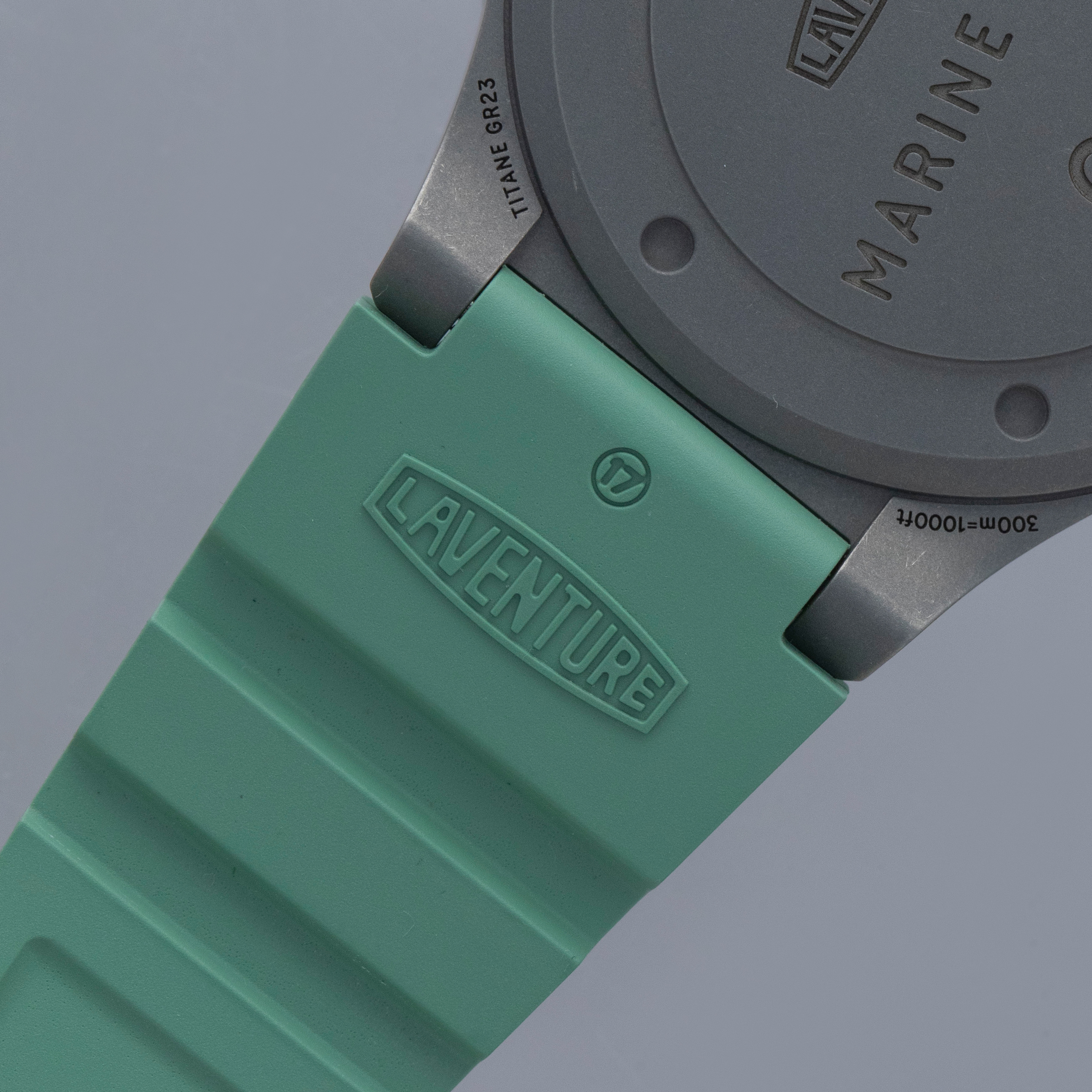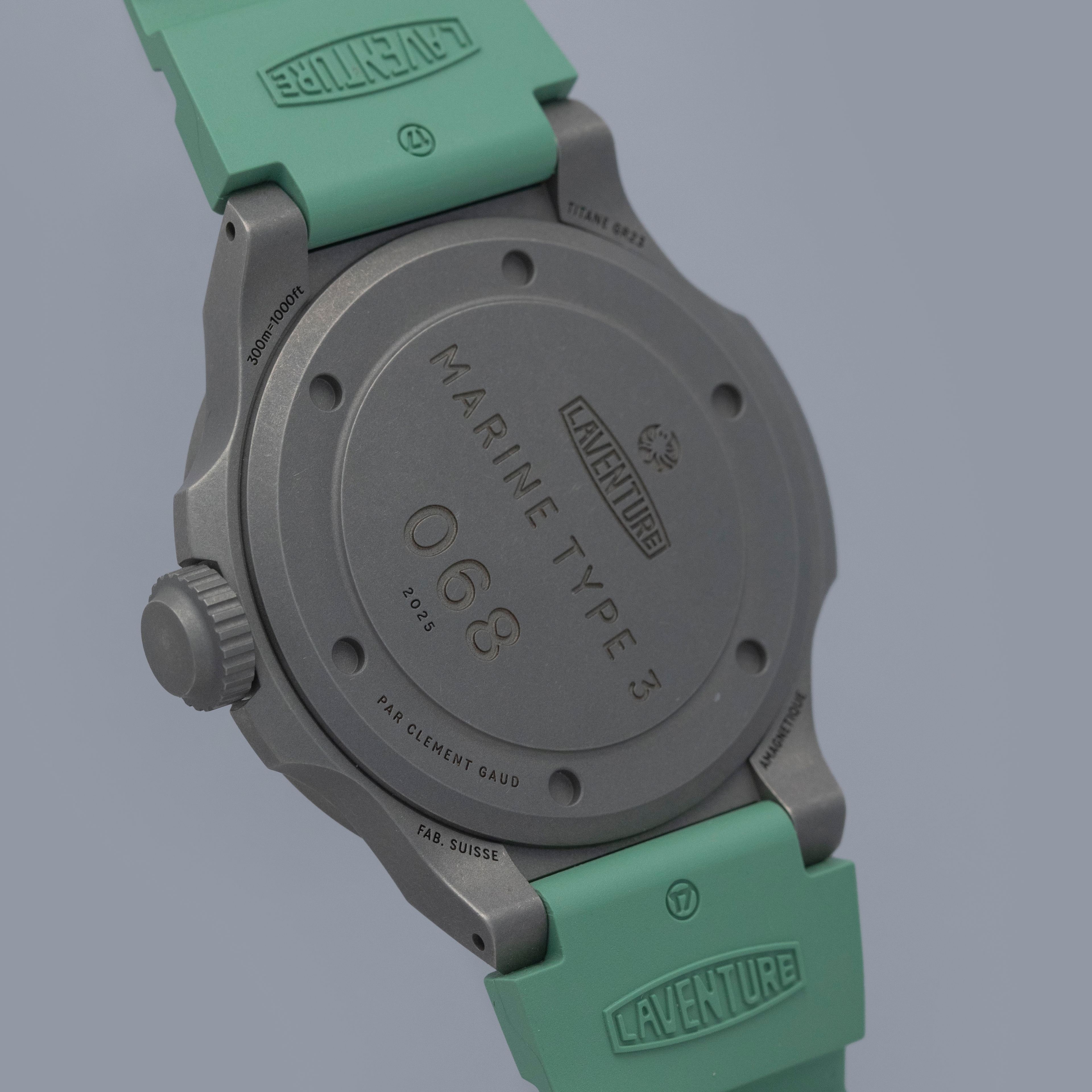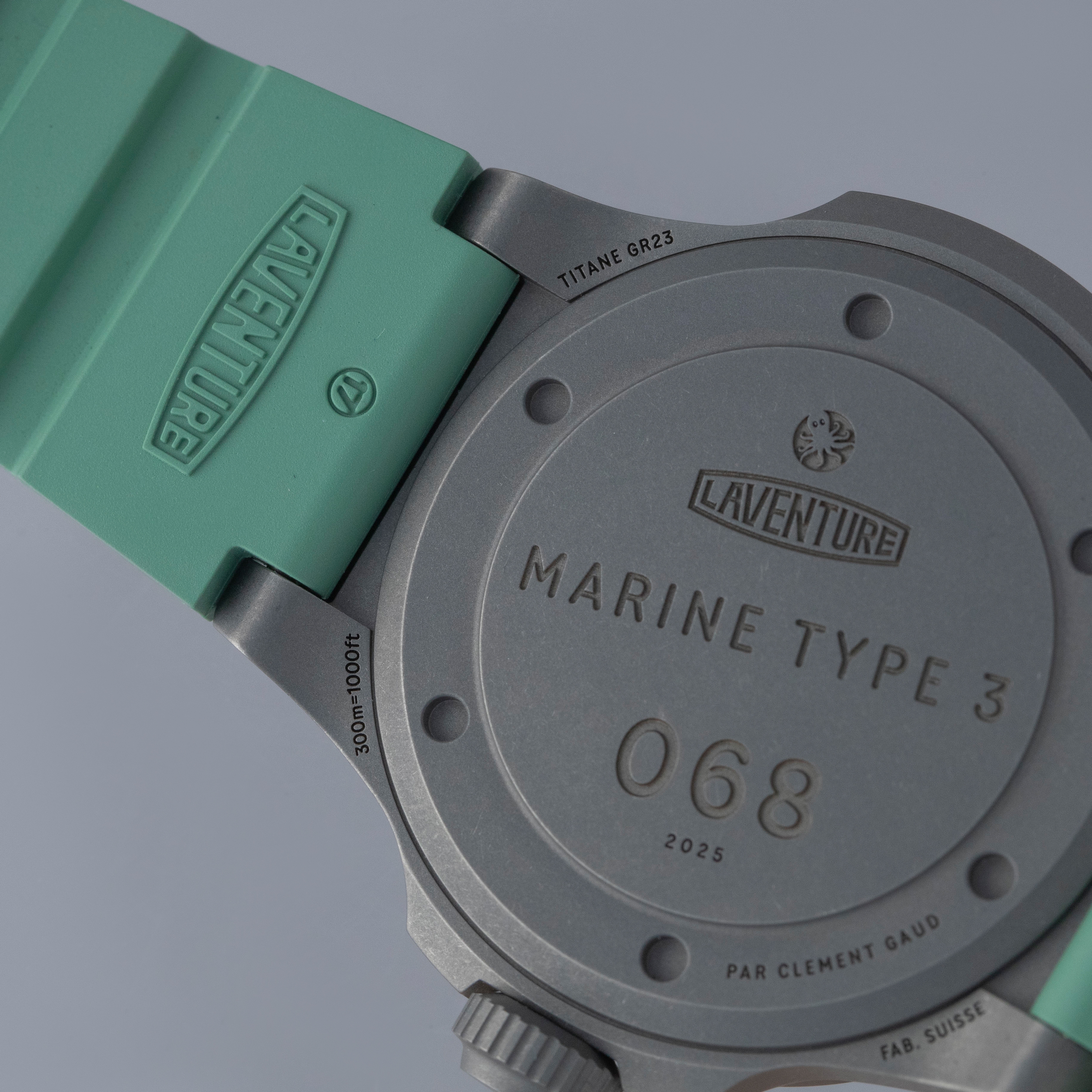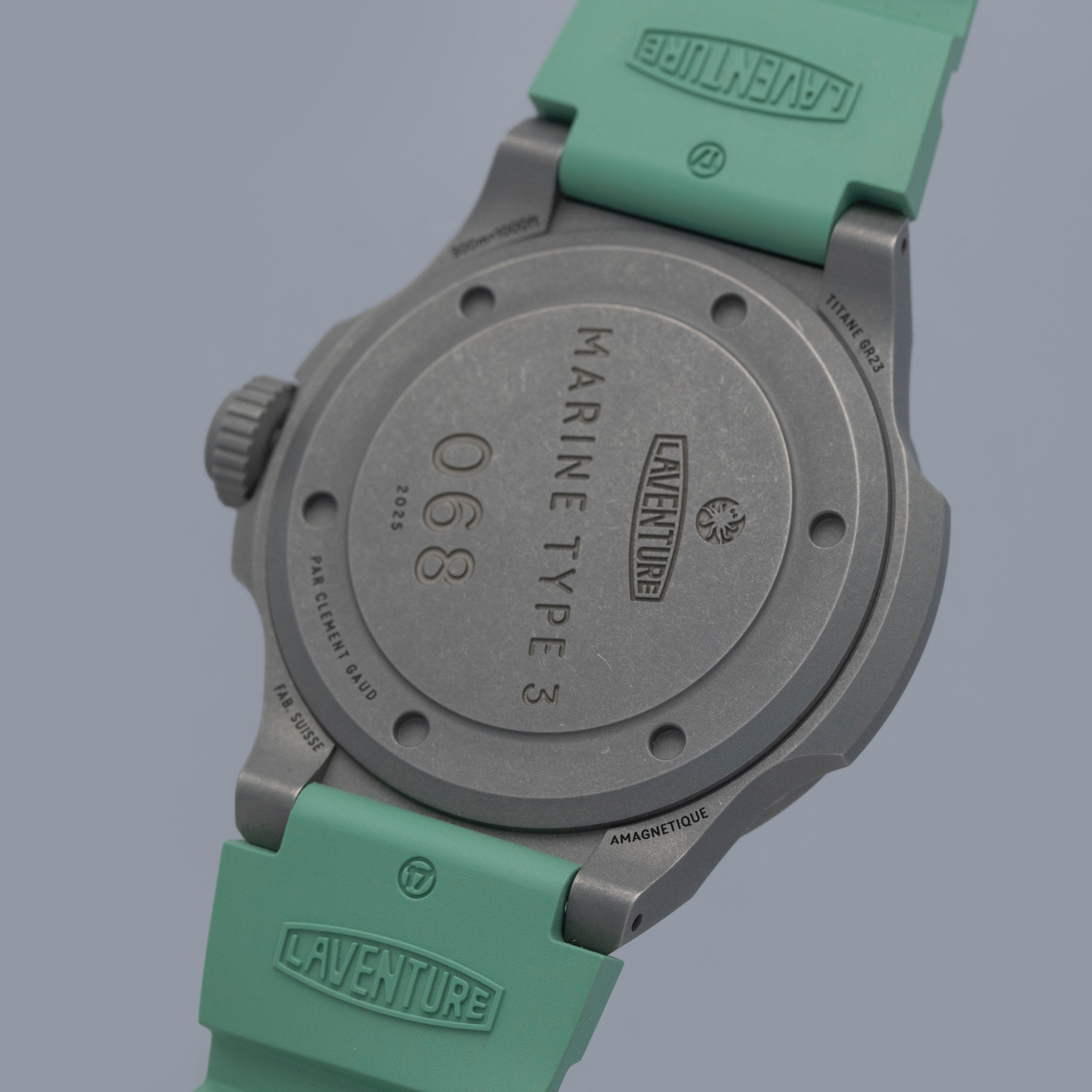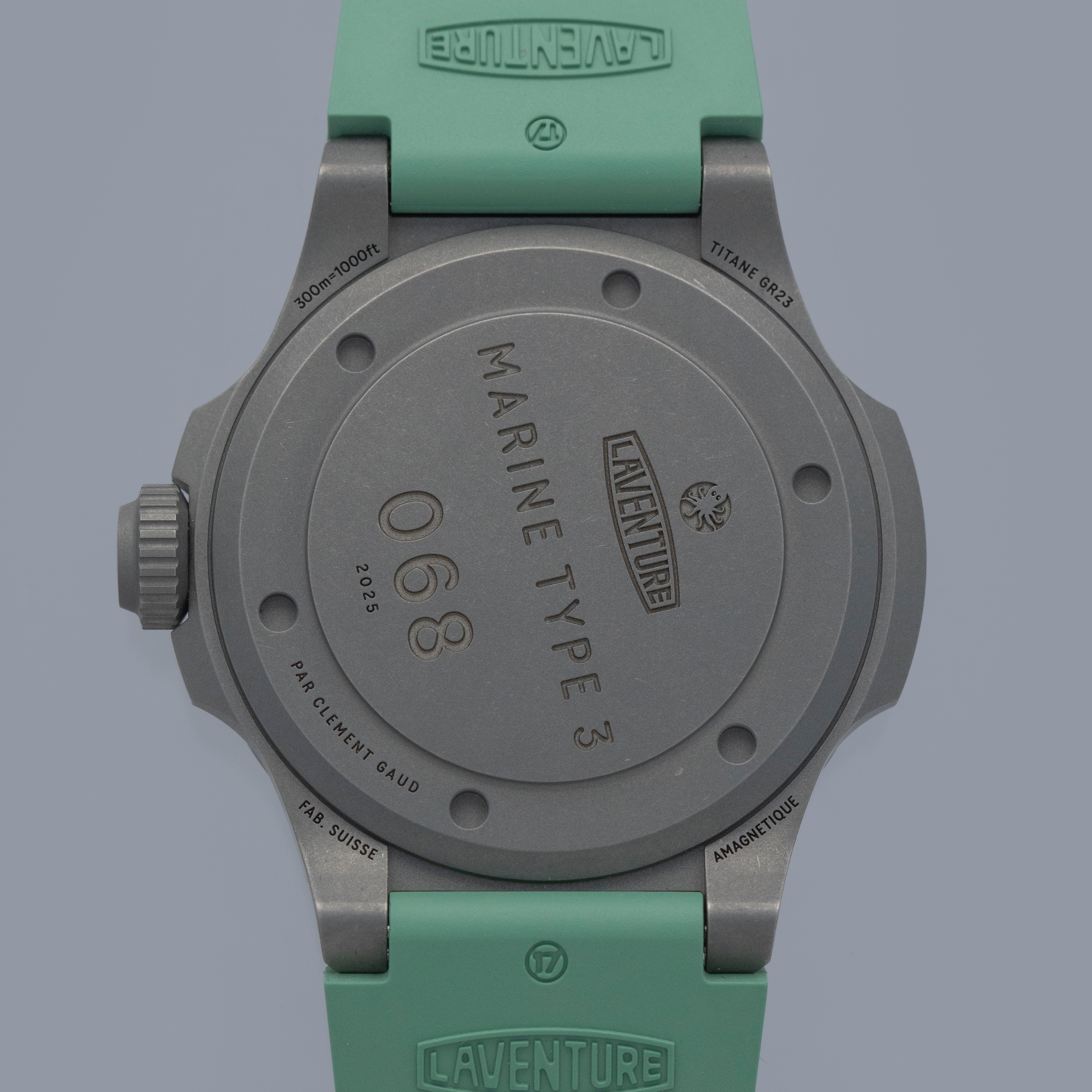 Made of grade 23 titanium, the Marine Type 3's 38mm case construction is dark in color, and serves as the perfect background for its bright dial and green rubber strap.