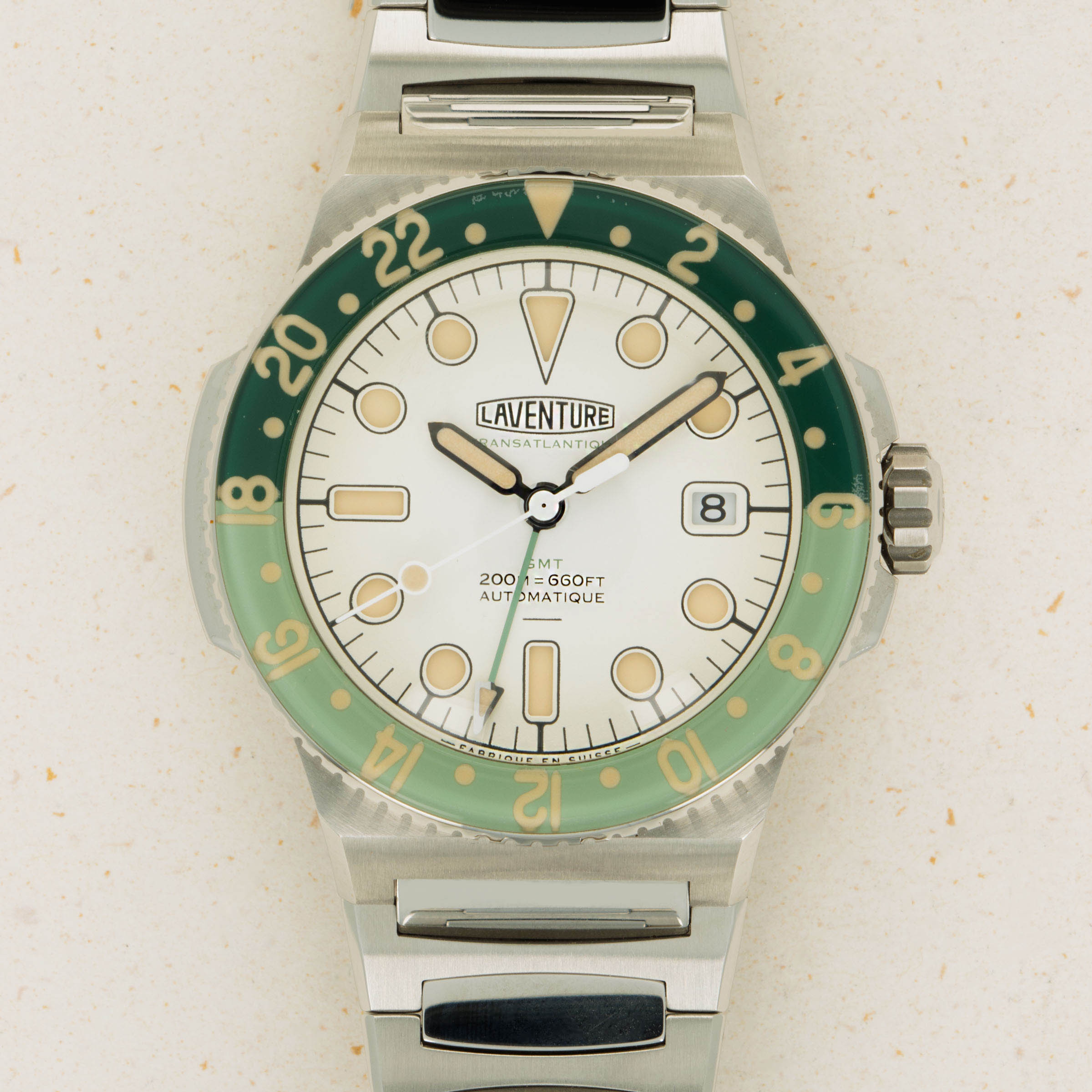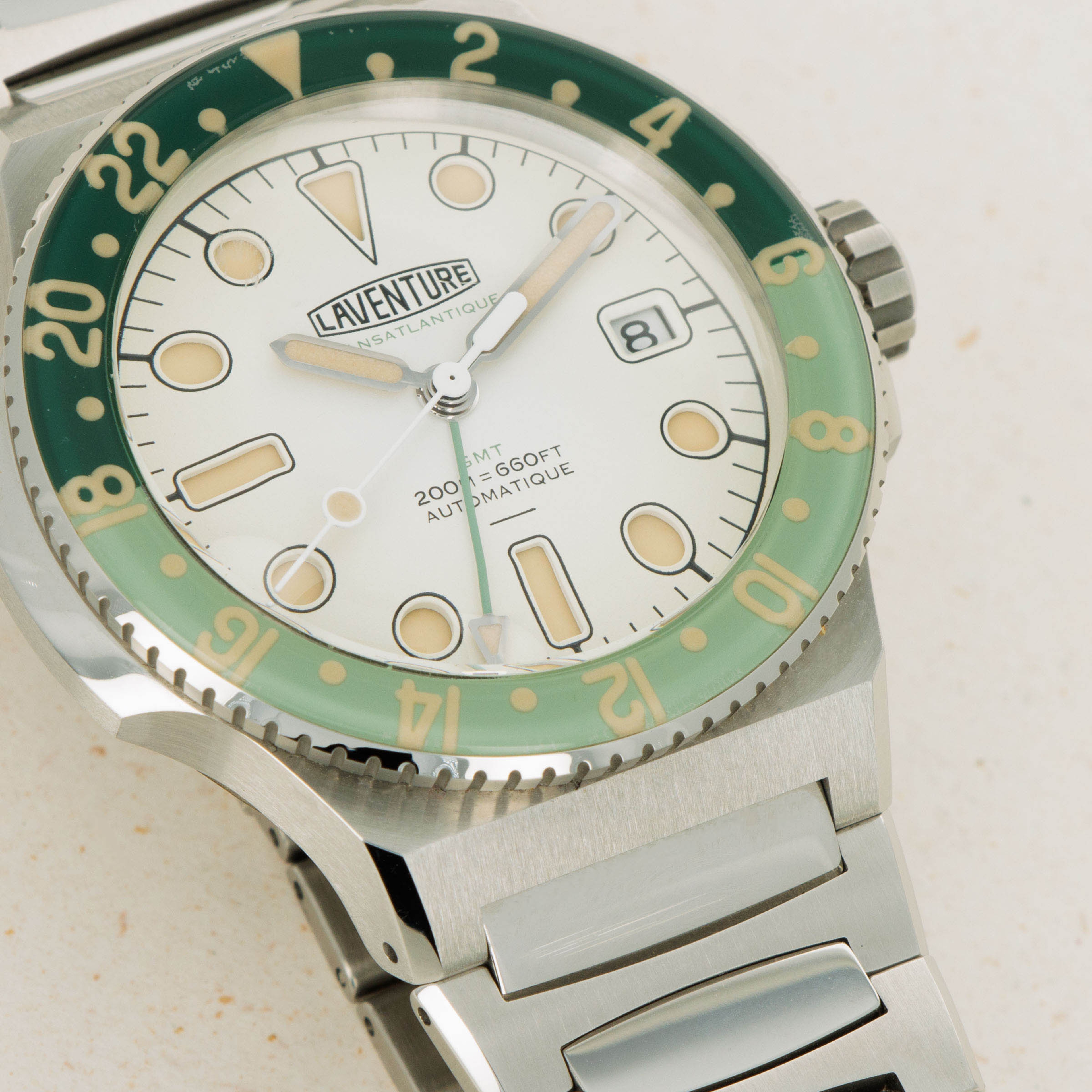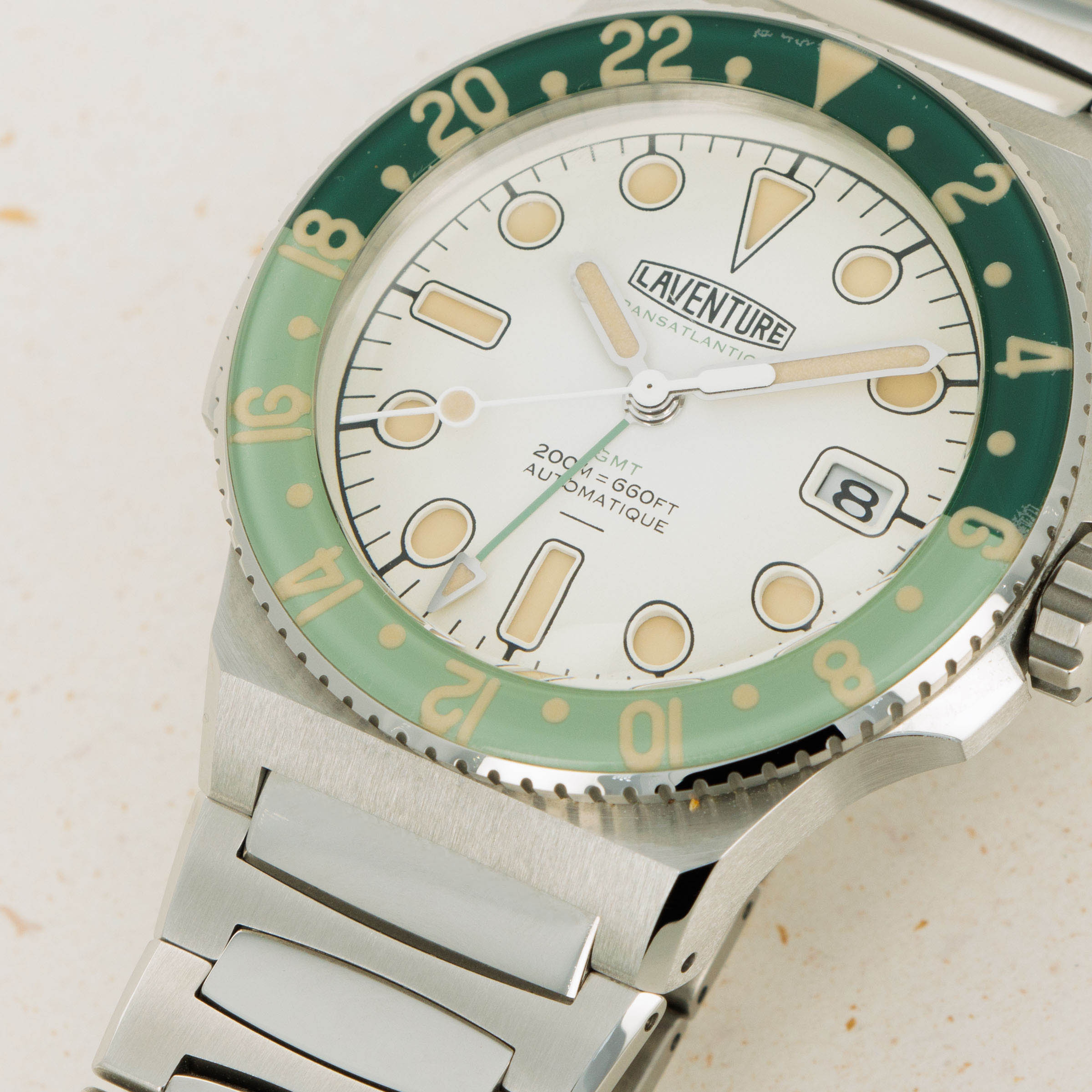 Founded as a microbrand watchmaker that focuses on producing small scale limited edition timepieces, Laventure have grown from their humble beginnings in 2017 as just another project on Kickstarter into a popular independent watchmaker who now has a handful of releases under its belt that are all becoming more and more popular than the last. Offered here we have Laventure’s first GMT, the Transatlantique. Launched in 2020 as a limited edition release of 100 pieces split between two options and inspired by 1950s transatlantic travel and long haul trips, as its name suggests, like the NYC to Paris route, the Transatlantique features a stainless steel 40.5mm construction filled with soft lines and gentle curves. Furthermore, it features a beautifully executed sandwich matte dial that was offered in two color schemes as mentioned, either a dark green or a light cream, which is what we have here. Featuring a sandwich construction with a baseplate providing the Super-LumiNova-powered fauxtina for its round indices, the Transatlantique’s dial’s color scheme is linked with the luminous fauxtina font in its two-tone green-on-green bezel. Offered on a stainless steel integrated bracelet and featuring a Plexiglas superdome crystal, the Transatlantique combines the best of modern watchmaking with vintage aesthetics to create something unique and novel that collectors seemingly can’t get enough of.