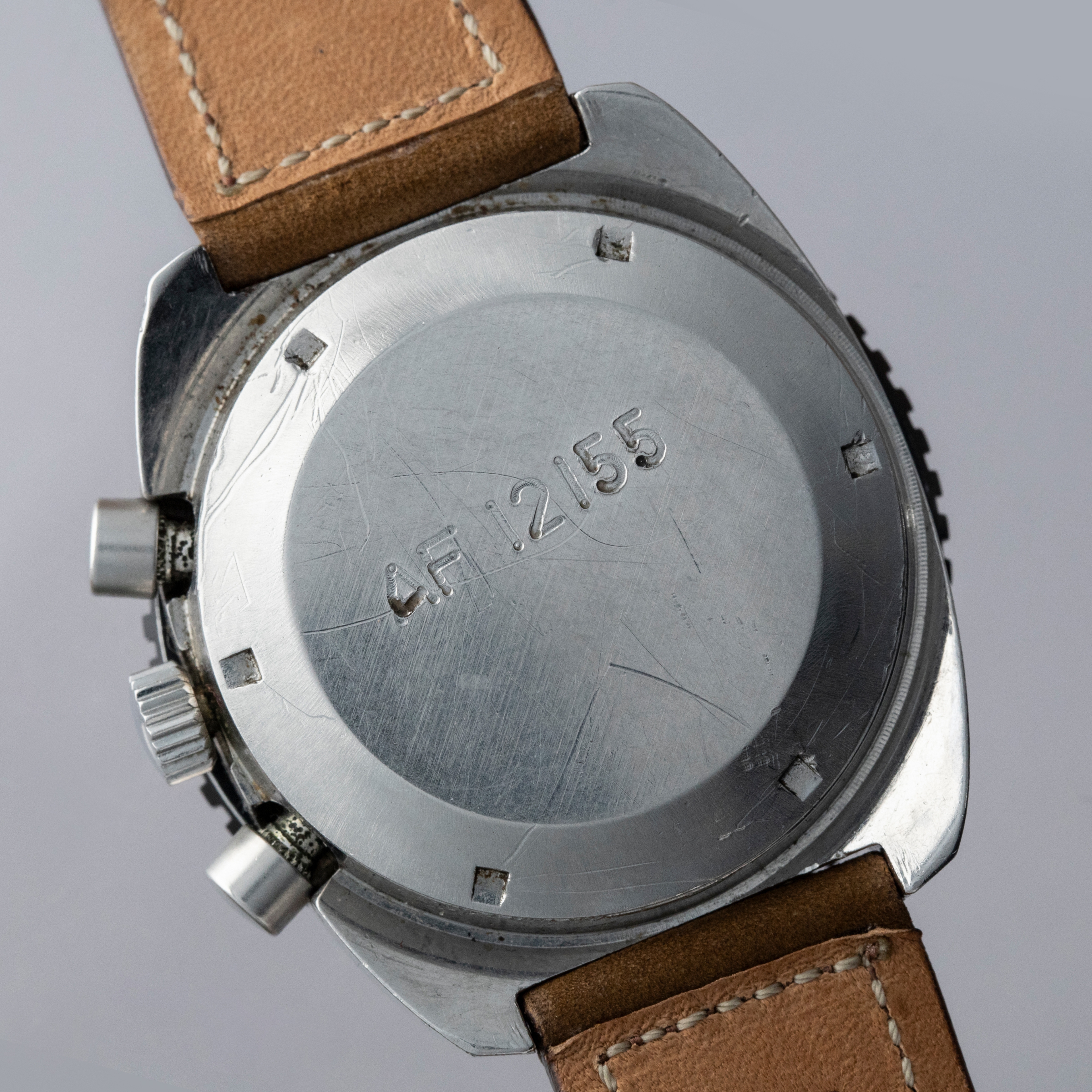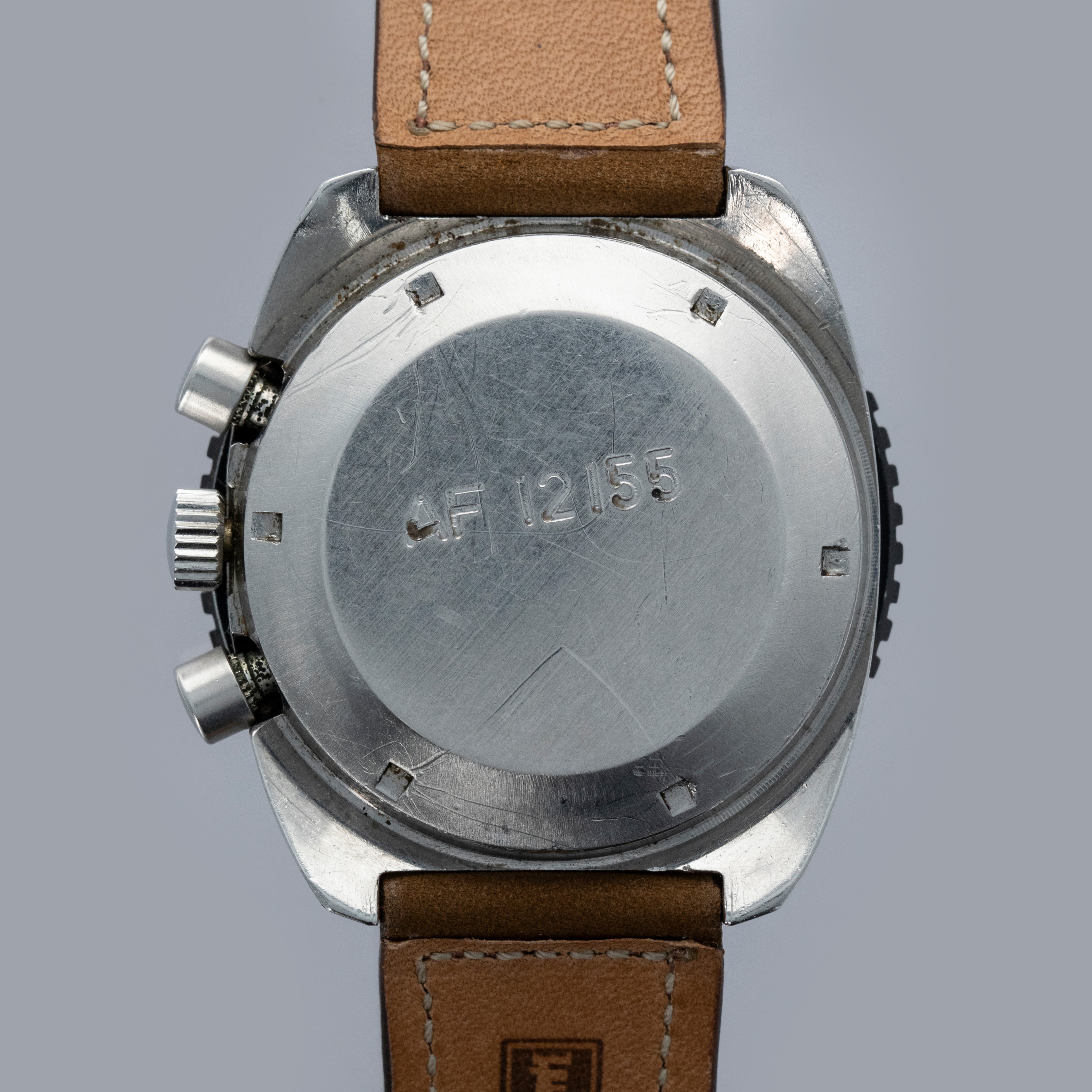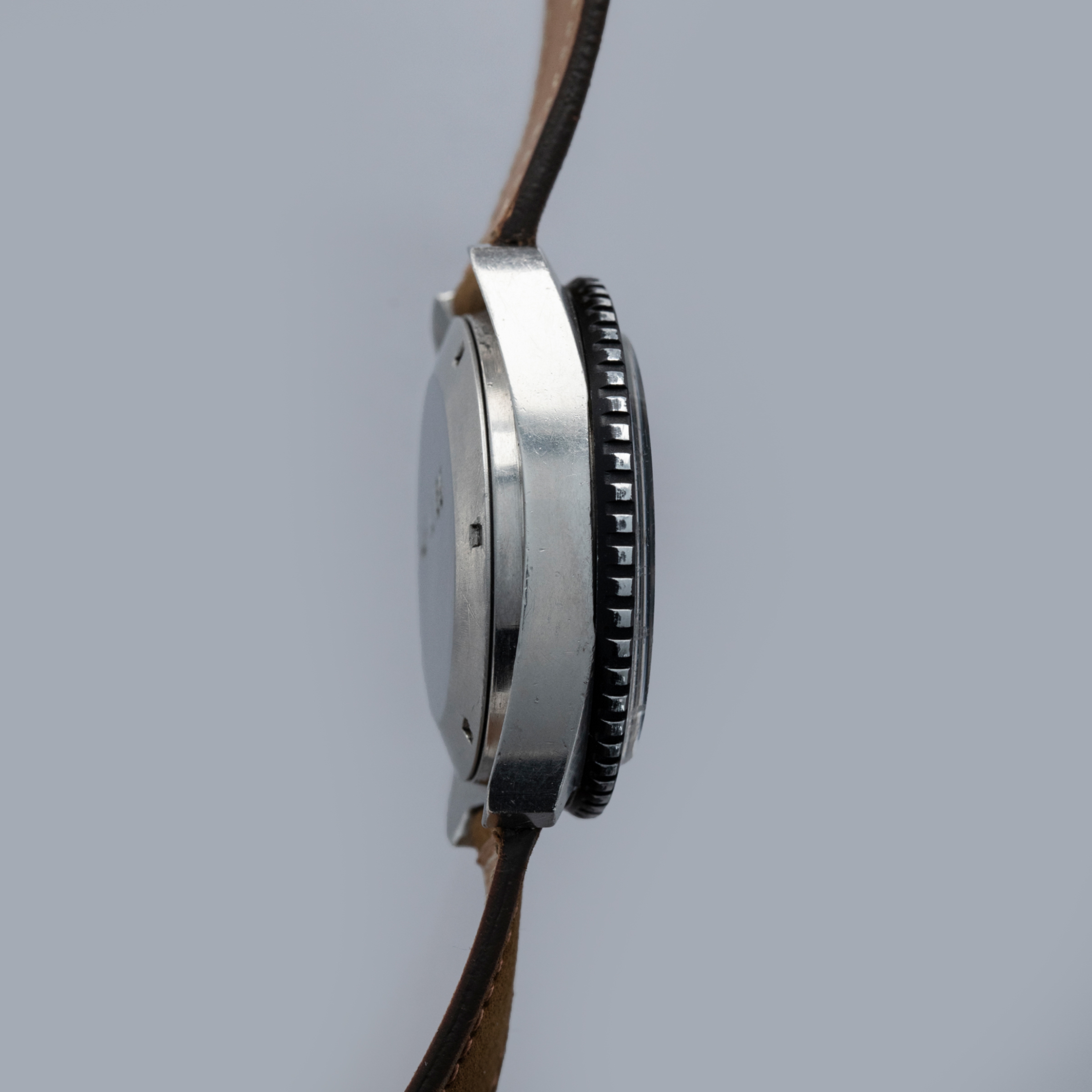 The watch is in overall very good condition. The stainless steel case has some scratches and nicks, with the most noticeable mark on the case side of the upper lug on the crown side. The case back features well-defined military engravings and some surface scratches. The black bezel has some wear to the finish around the edges, while the front remains very clean. The dial is in excellent condition, and the hands show some discoloration on the luminous surface. The watch is fitted with a leather strap with a steel buckle. Please note that the watch ticks at the time of cataloging and appears to keep good time, but the date changes at 3:00. A service is recommended.