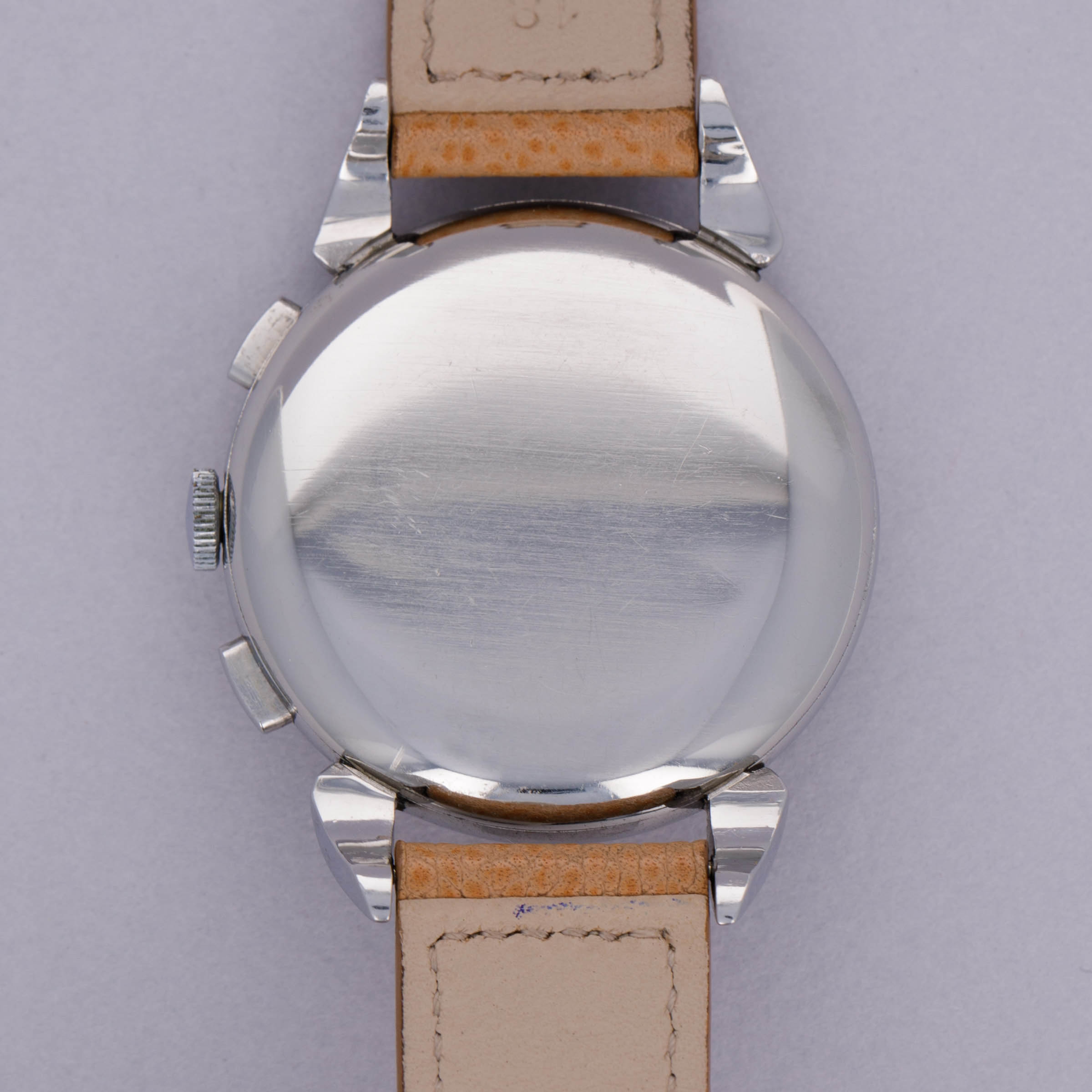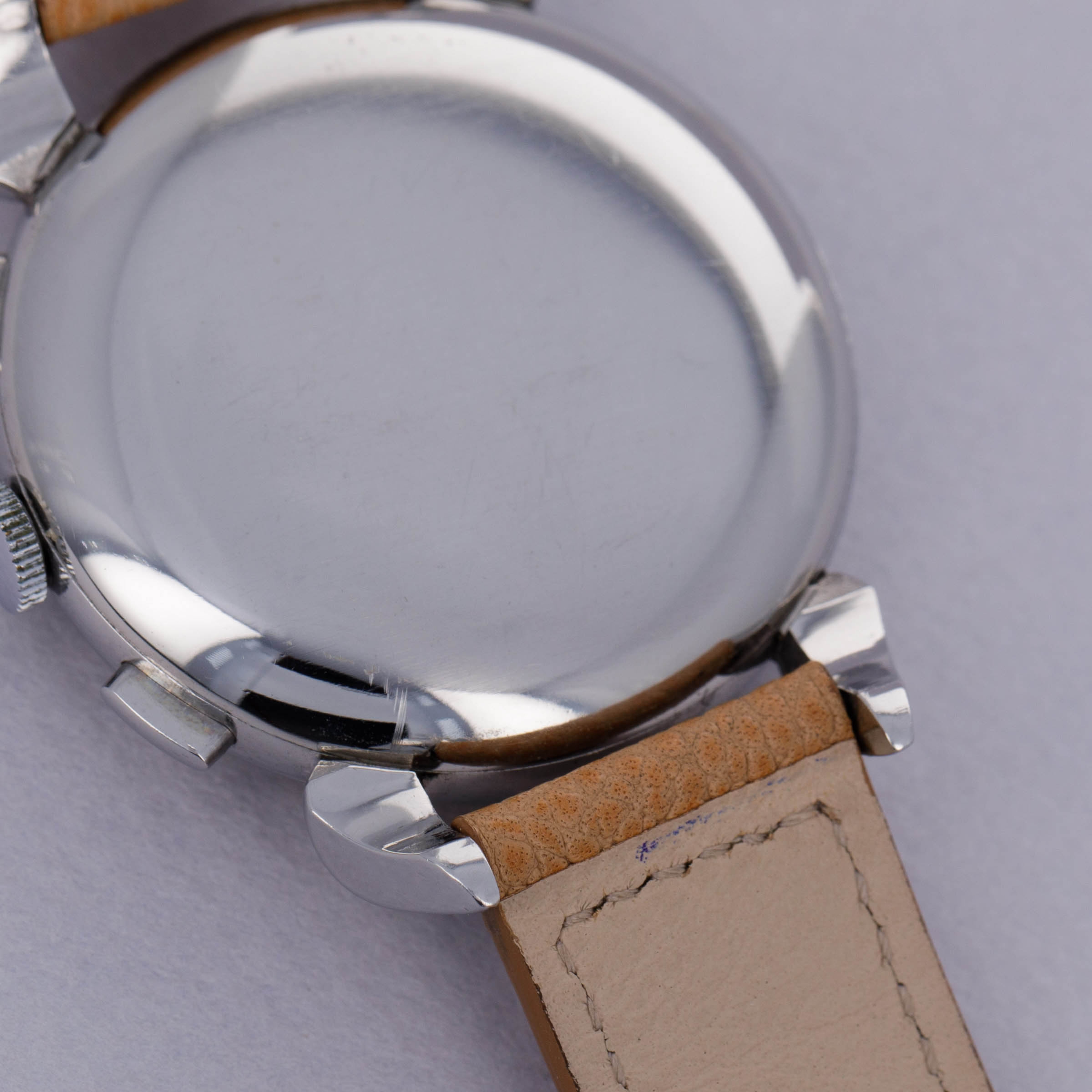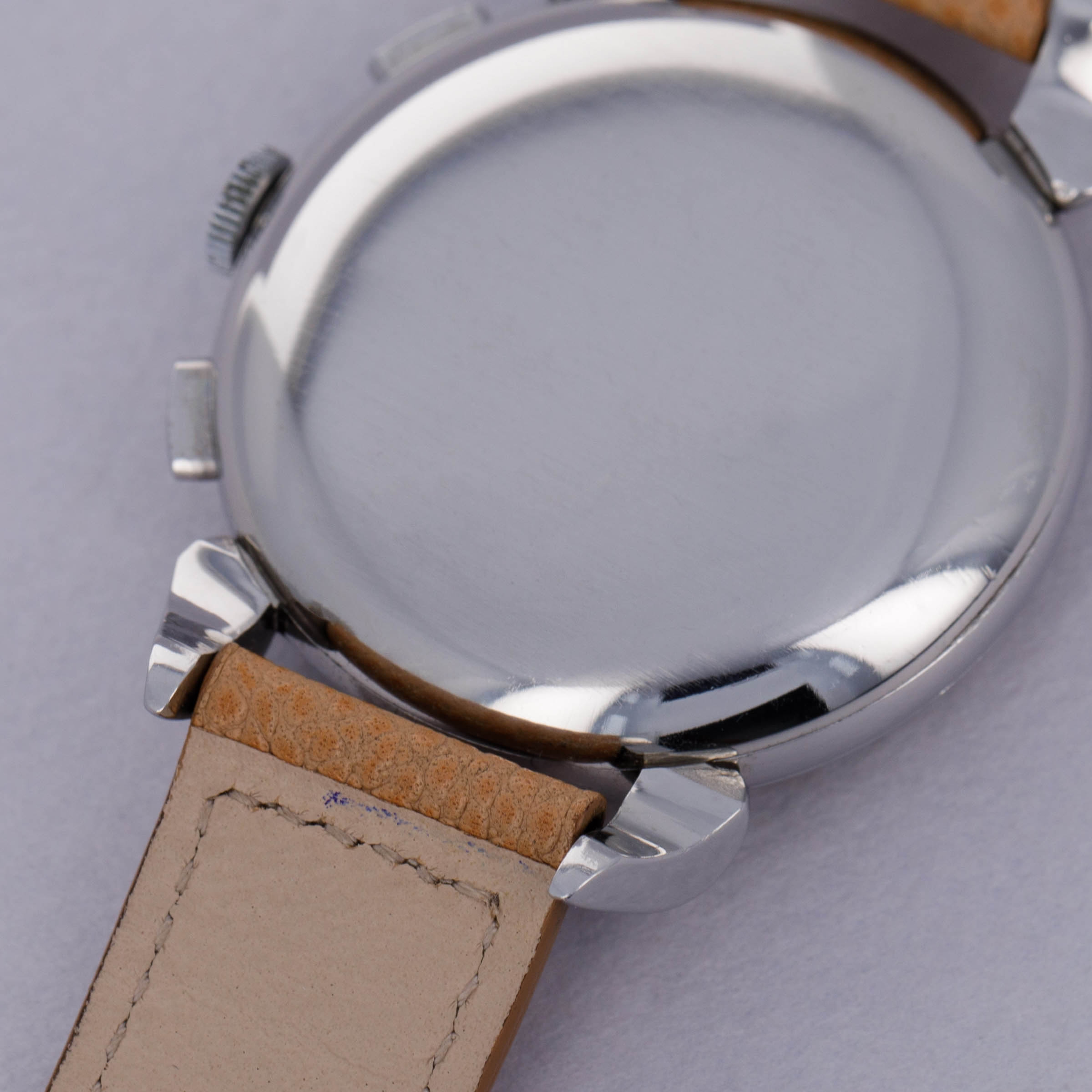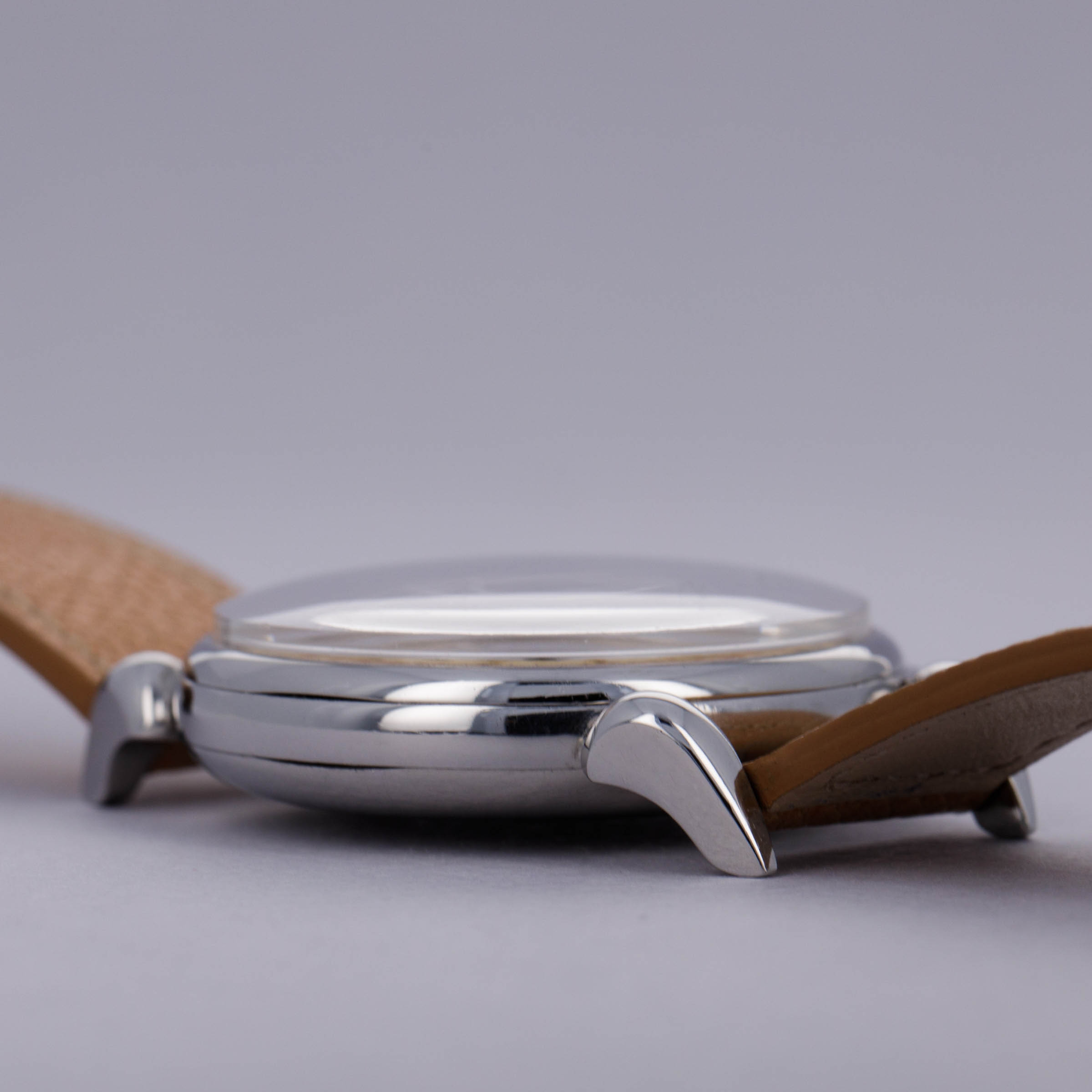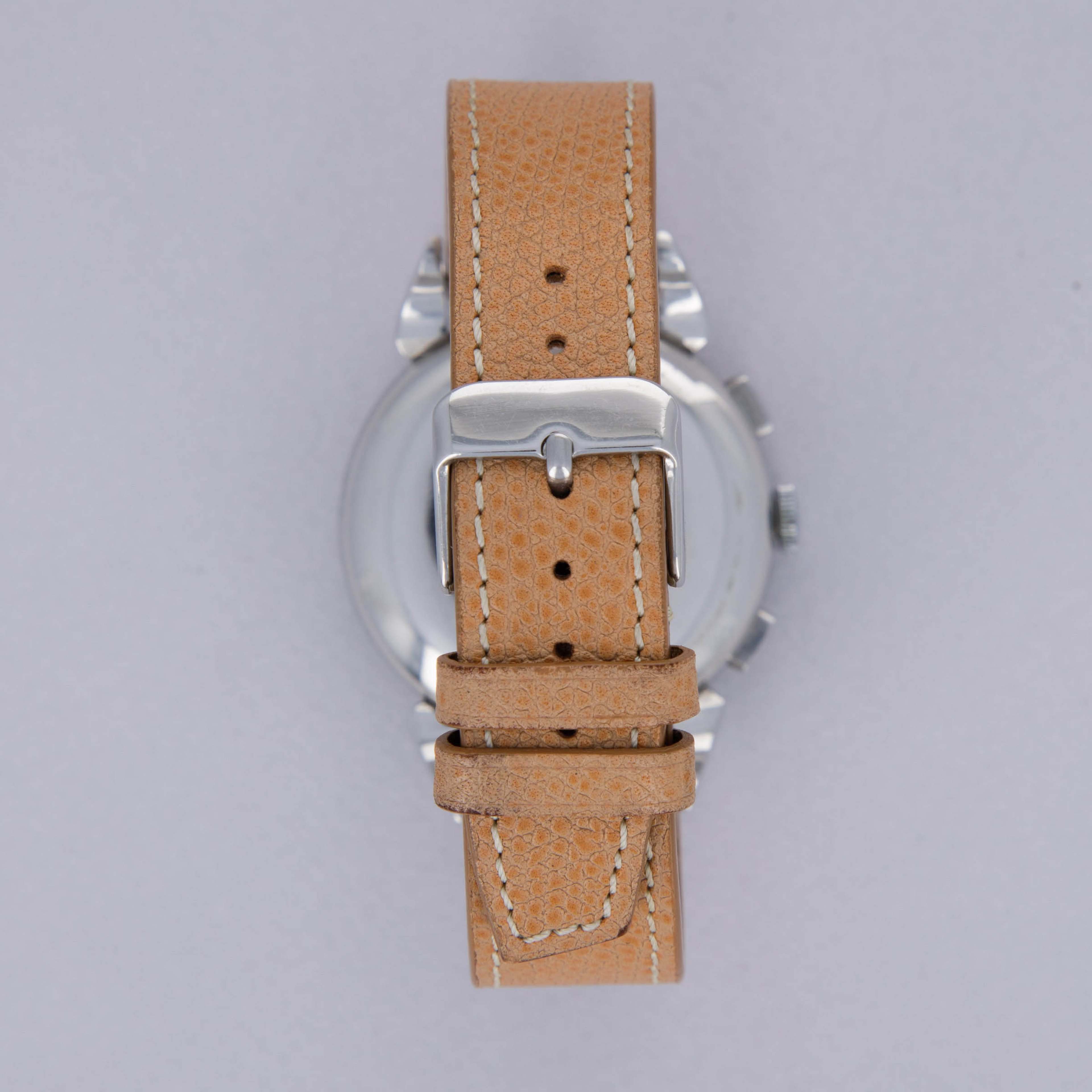 Today best known for their competitively priced and well-built offerings, Longines’ history as one of horology’s most advanced watchmakers usually escapes most collectors. Built upon an extensive archive of incredible chronographs and dress watches, this reputation would be nothing compared to what it is now if it wasn’t for the the cal. 13ZN movement. Famously regarded as one of the finest chronograph movements ever produced, the manual-wind cal. 13ZN was launched in 1936 as one of Longines’ most advanced movements and the first flyback chronograph movement to be fitted within a wristwatch. Offered over several decades with different subvariants depending on dial layouts and the number of pushers used to operate it, the cal. 13ZN is perhaps one of watchmaking’s best-ever movements, and related to it is the cal. 30H that powers the example we have here. Launched 11 years after the cal. 13ZN, in 1947, and used until the 1970s, the cal. 30H was an upgraded version of the 13ZN. Powered by the cal. 30H, the model we have here is the “Cornes de Vache” chronograph, as it is known due to the flamboyant design of its lugs. Made in stainless steel and offered with a stunningly refined golden beige dial that has aged to take on a being color and boasts golden applied indices, this ref. 23505 is perhaps one of the most stunning mid-century Longines chronographs we have had in our possession so far.