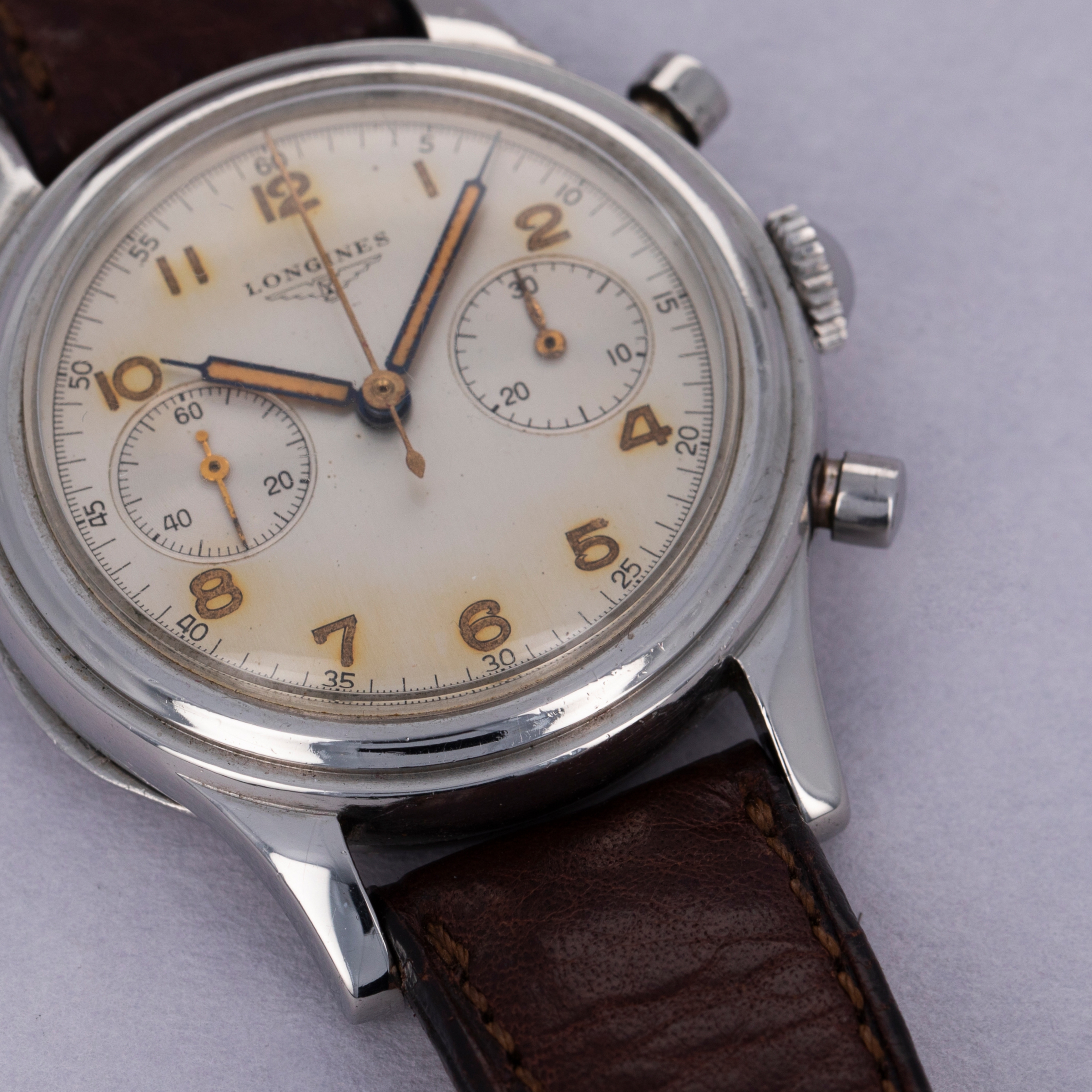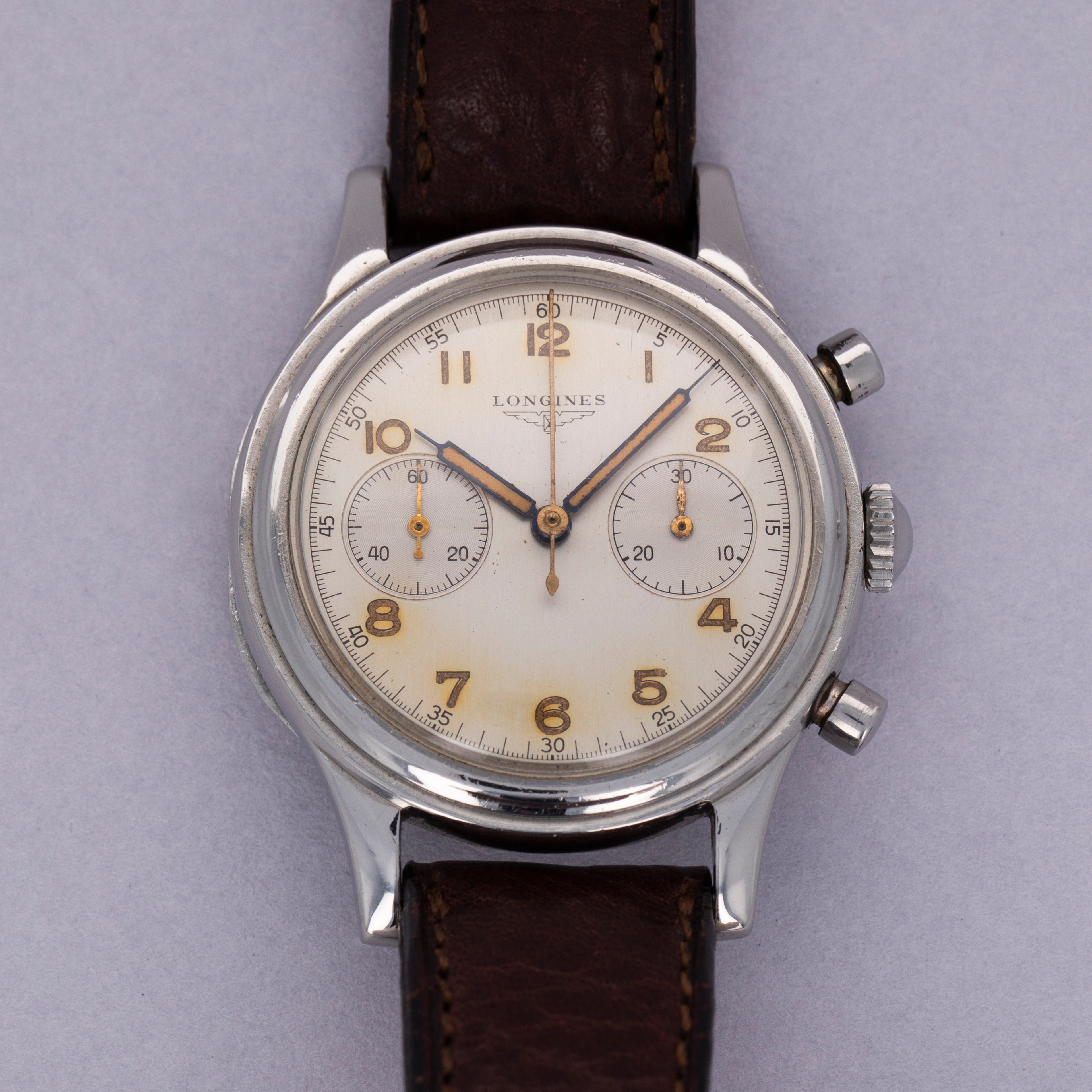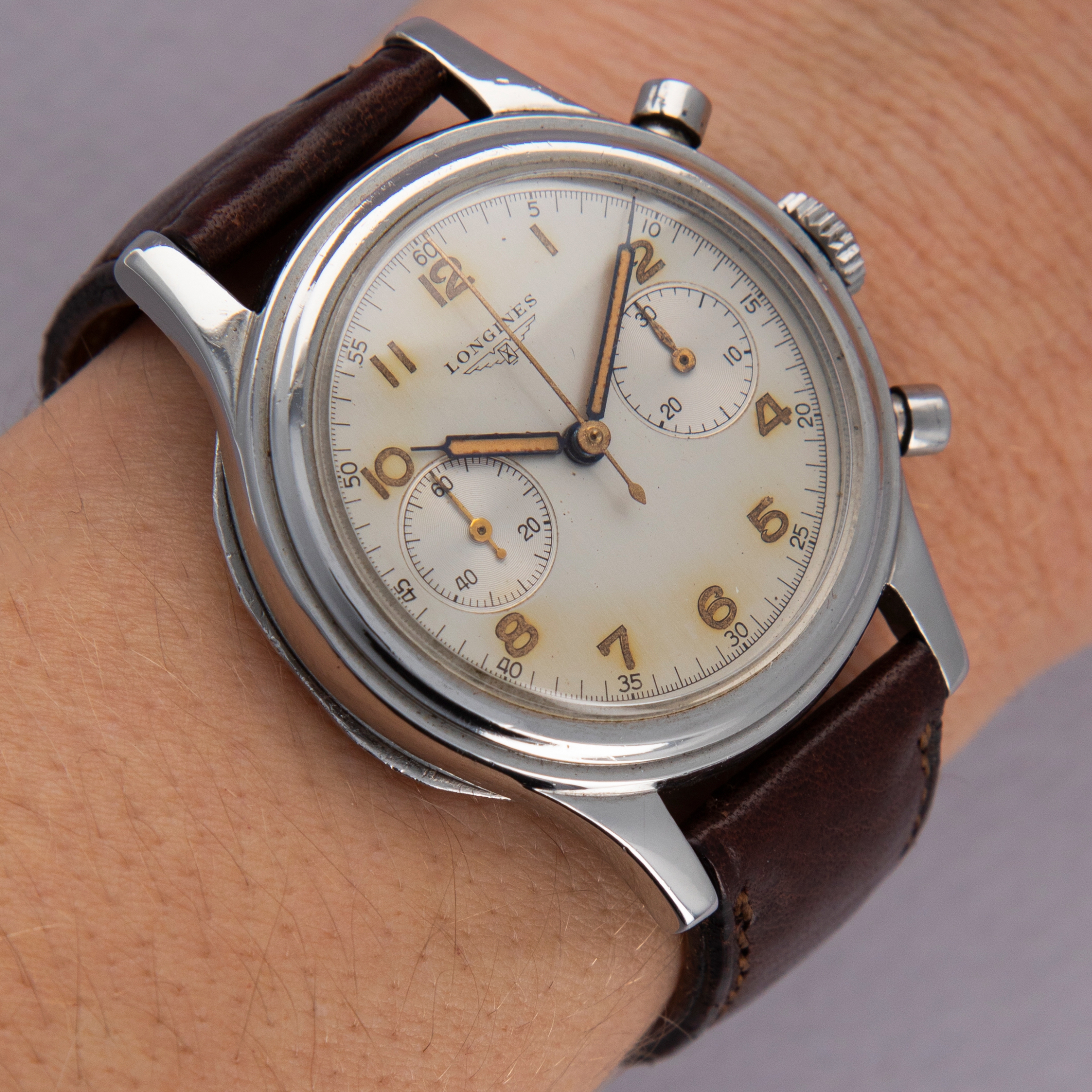 Today best known for their competitively priced and well-built offerings, Longines’ history as one of horology’s most advanced watchmakers usually escapes most collectors. Built upon an extensive archive of incredible chronographs and dress watches, this reputation would be nothing compared to what it is now if it wasn’t for the cal. 13ZN, which is famously regarded as one of the finest chronograph movements ever produced. The manual-wind cal. 13ZN was launched in 1936 as one of Longines’ most advanced movements and the first flyback chronograph movement to be fitted within a wristwatch. Introduced 11 years after the cal. 13ZN, Longines launched the cal. 30CH, another inarguably iconic and collectable movement that is highly coveted and esteemed. Thanks to its impeccable level of craftsmanship, stunning architecture, and unparalleled level of ingenuity, the cal. 30CH is as famous today as it was ahead of its time in the 1947. Offered here is a large 37.5mm stainlyess Flyback Chronograph fitted with the cal. 30CH that sports a beautifully luxurious silver dial with beautifully aged radium-filled hands and Arabic numerals that have burned the silver dial for a gorgeously-unique effect.