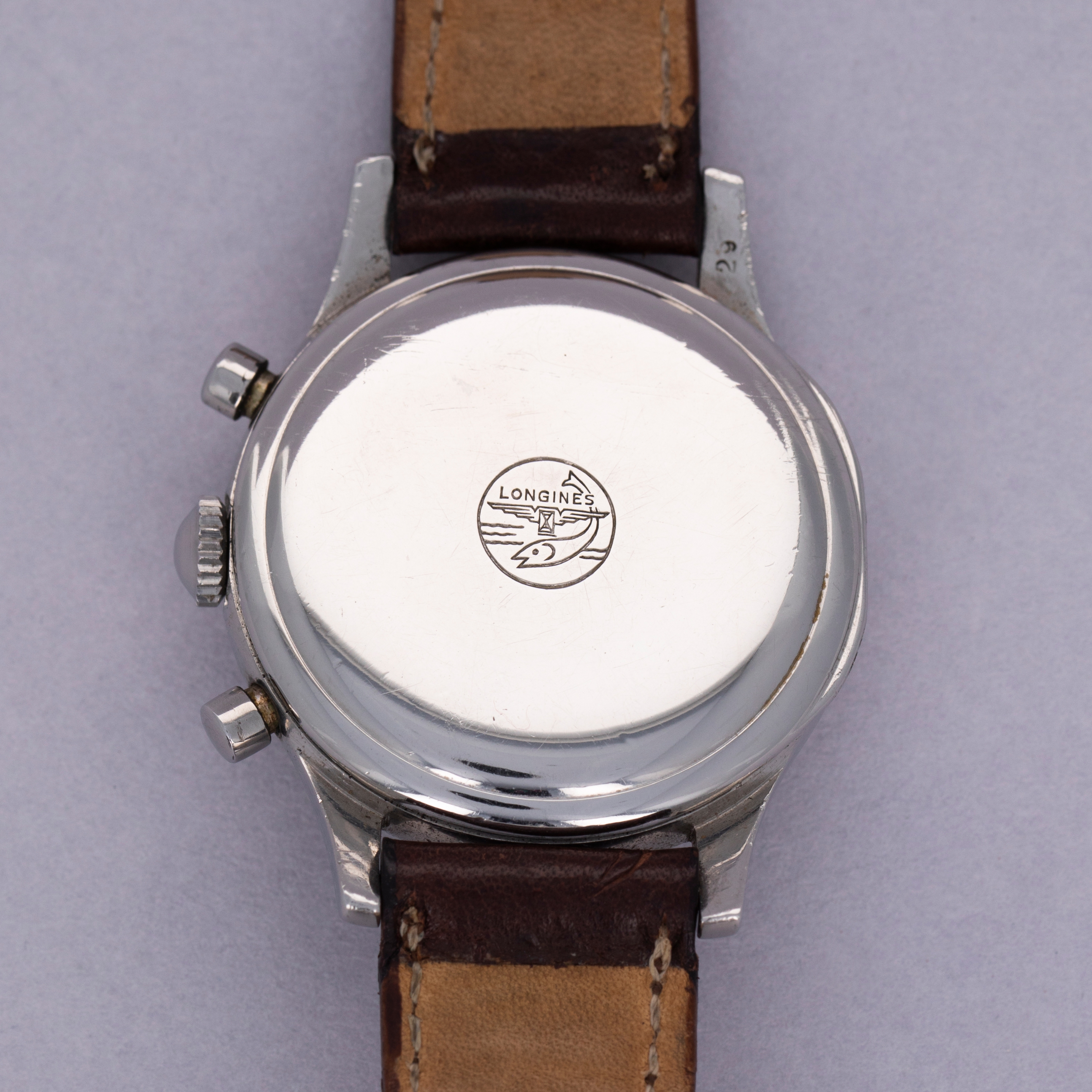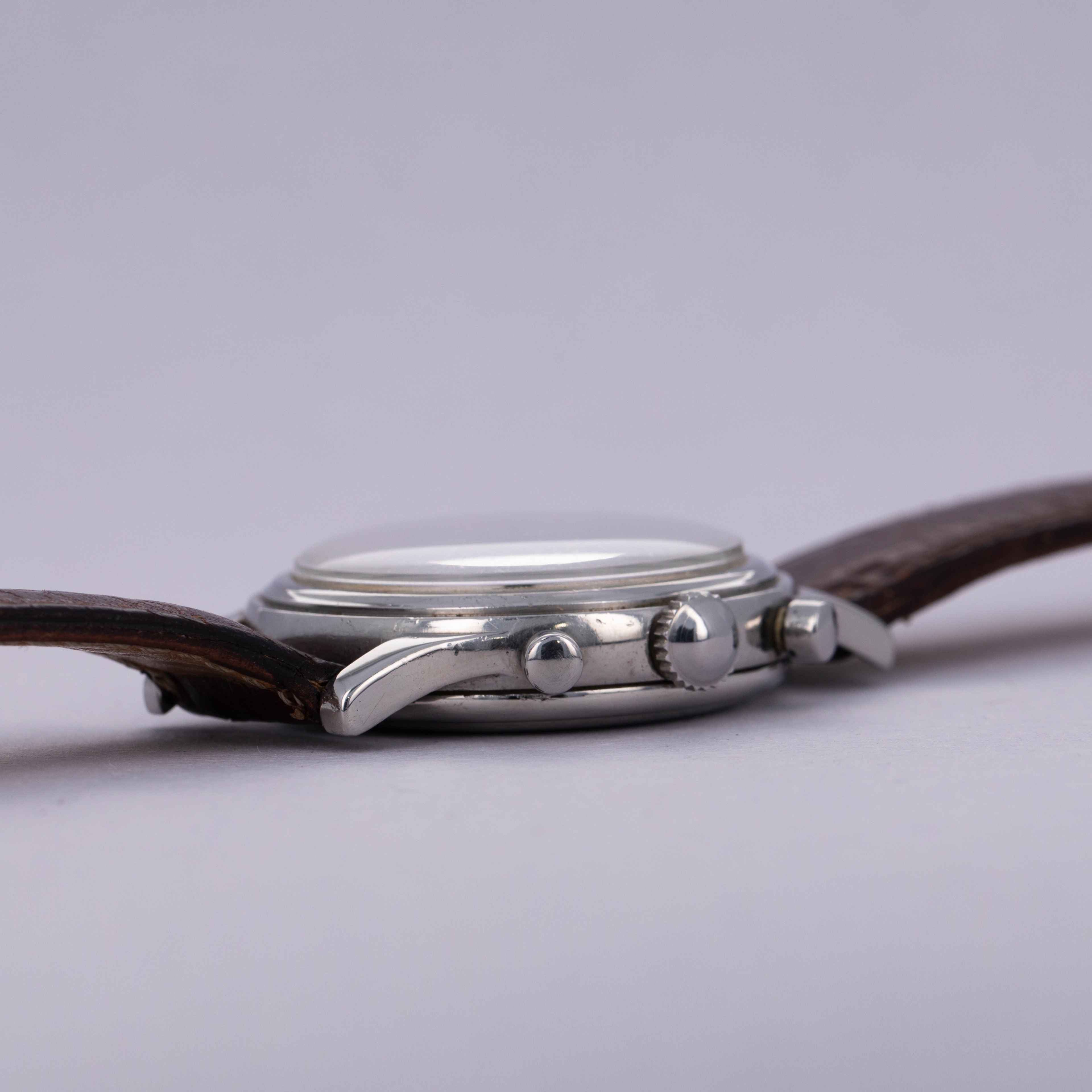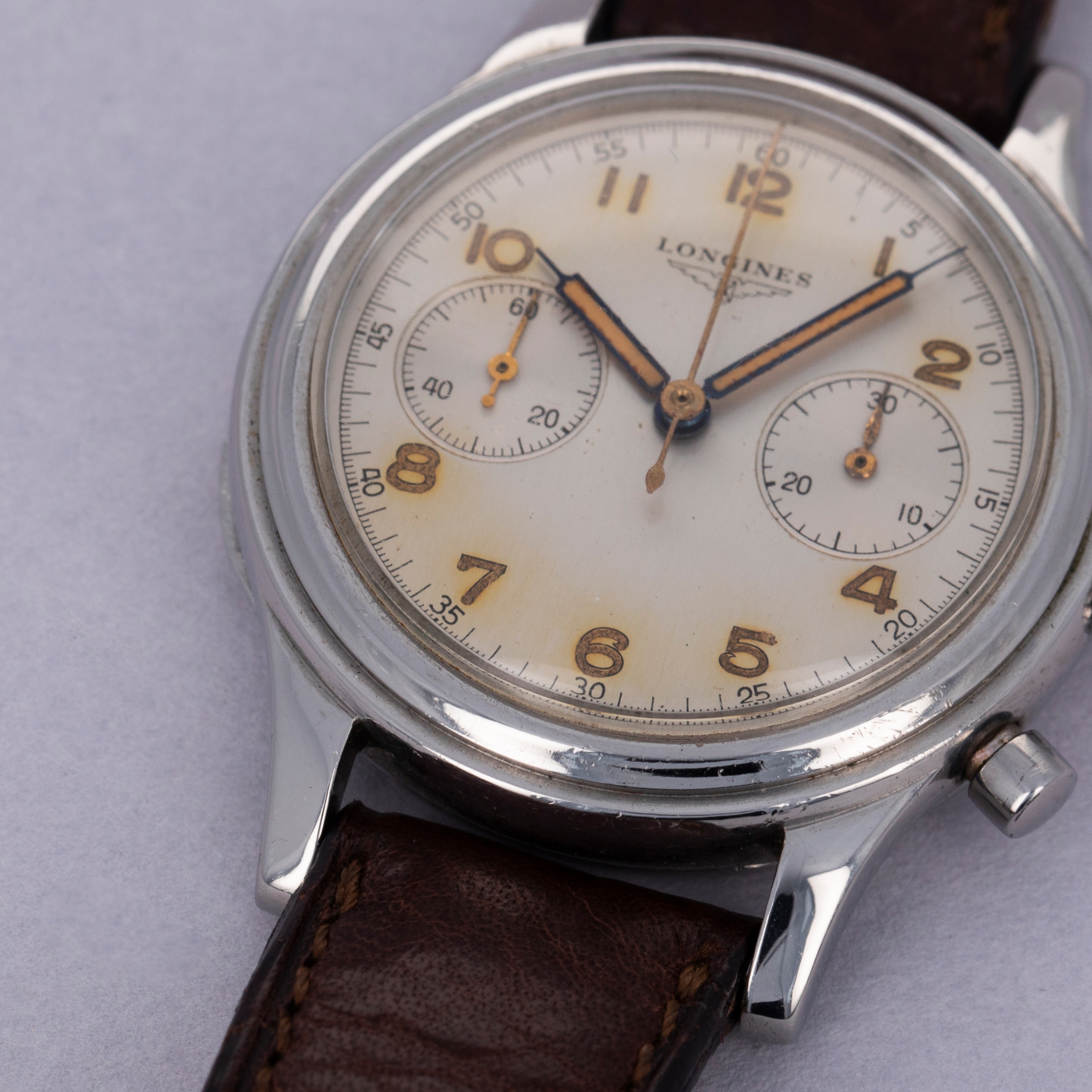 Today best known for their competitively priced and well-built offerings, Longines’ history as one of horology’s most advanced watchmakers usually escapes most collectors. Built upon an extensive archive of incredible chronographs and dress watches, this reputation would be nothing compared to what it is now if it wasn’t for the cal. 13ZN, which is famously regarded as one of the finest chronograph movements ever produced. The manual-wind cal. 13ZN was launched in 1936 as one of Longines’ most advanced movements and the first flyback chronograph movement to be fitted within a wristwatch. Introduced 11 years after the cal. 13ZN, Longines launched the cal. 30CH, another inarguably iconic and collectable movement that is highly coveted and esteemed. Thanks to its impeccable level of craftsmanship, stunning architecture, and unparalleled level of ingenuity, the cal. 30CH is as famous today as it was ahead of its time in the 1947. Offered here is a large 37.5mm stainlyess Flyback Chronograph fitted with the cal. 30CH that sports a beautifully luxurious silver dial with beautifully aged radium-filled hands and Arabic numerals that have burned the silver dial for a gorgeously-unique effect.