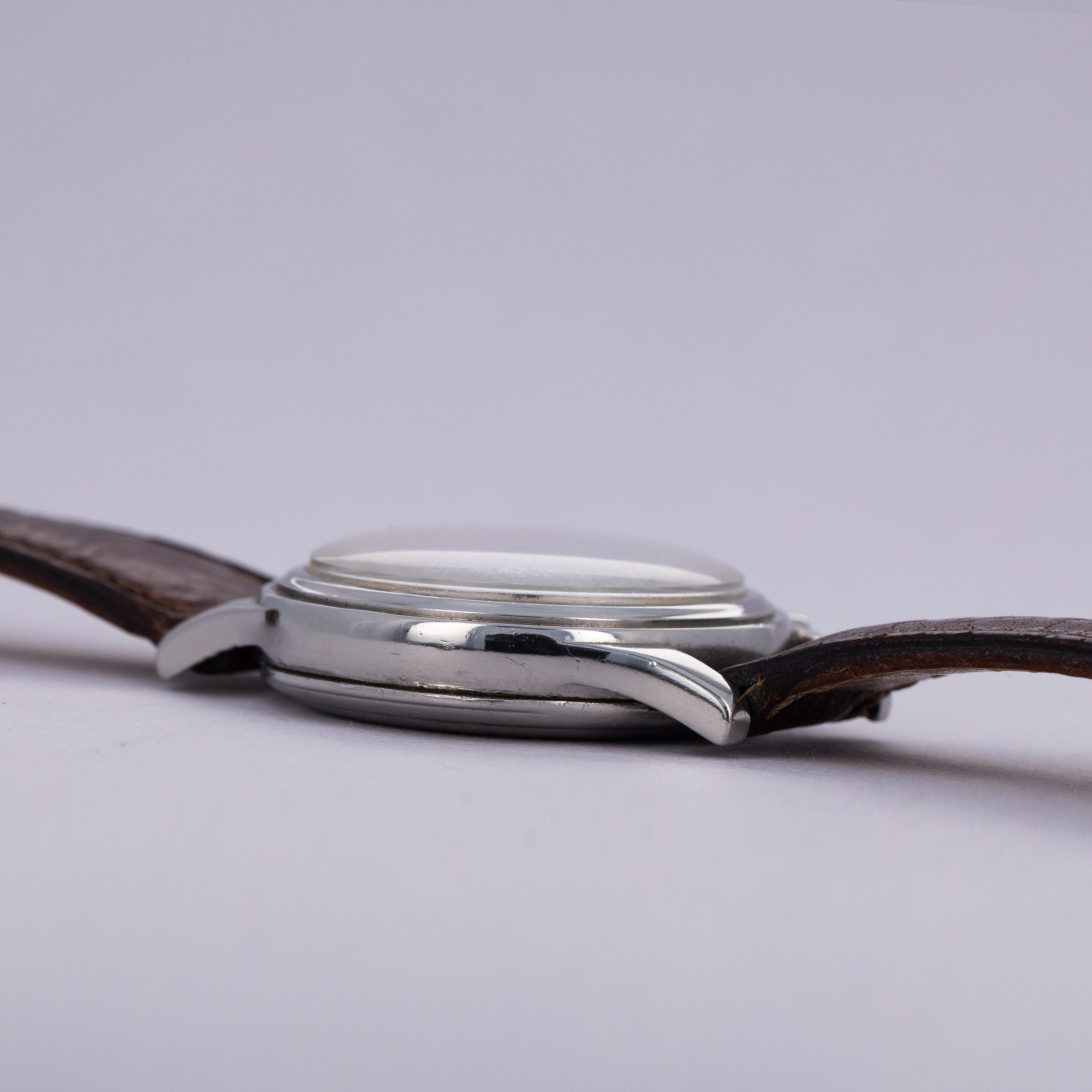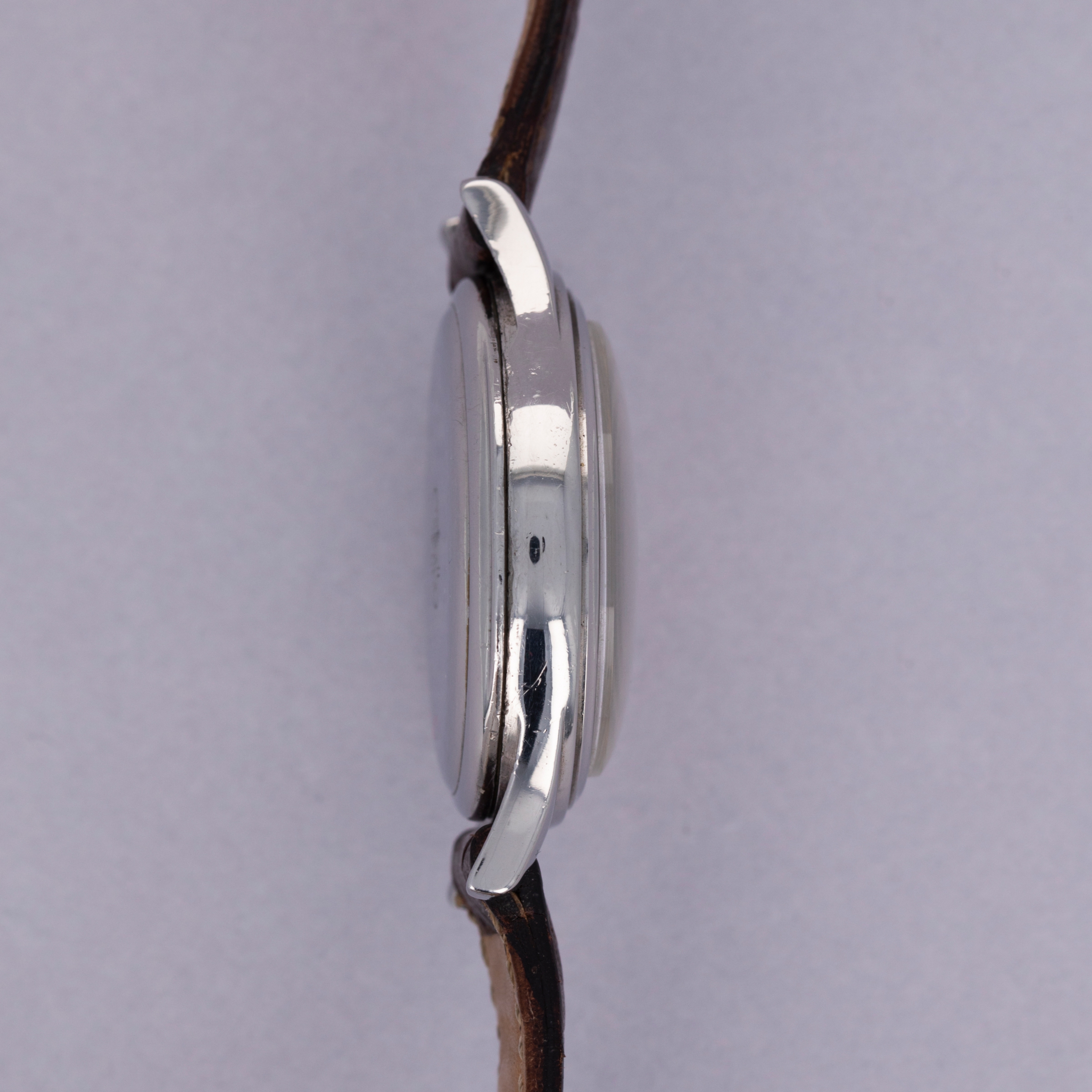 Fitted with a beautiful silver dial, this ref. 6075 features beautiful syringe hands and Arabic numerals, all of which have been filled with radium, which has aged gorgeously and burned the dial around the indexes for a uniquely vintage effect.