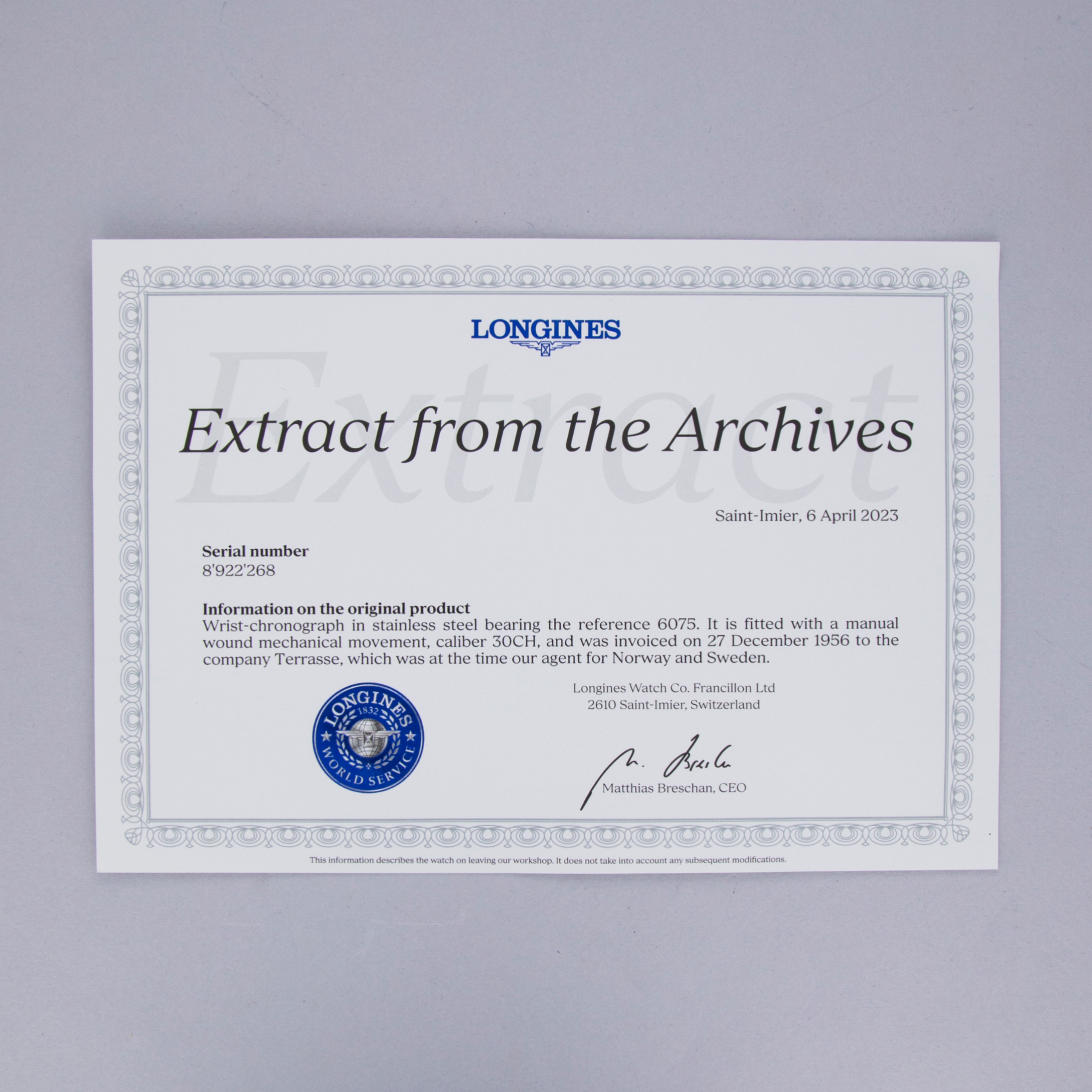Watch is in excellent overall condition. Case shows moderate surface wear, with some visible scratches and marks along the bezel and other surfaces. Snap-on caseback retains a crisp logo in the center. Original dial with warmly aged radium indexes in excellent overall condition. There are minor spots visible along the dial surface, and some radiation burn around the indexes. Original blued hands retain their original luminous material with light aging. Watch comes on a generic strap and steel buckle. The watch is accompanied by a Longines Extract of the Archives that dates the watch to 1956.