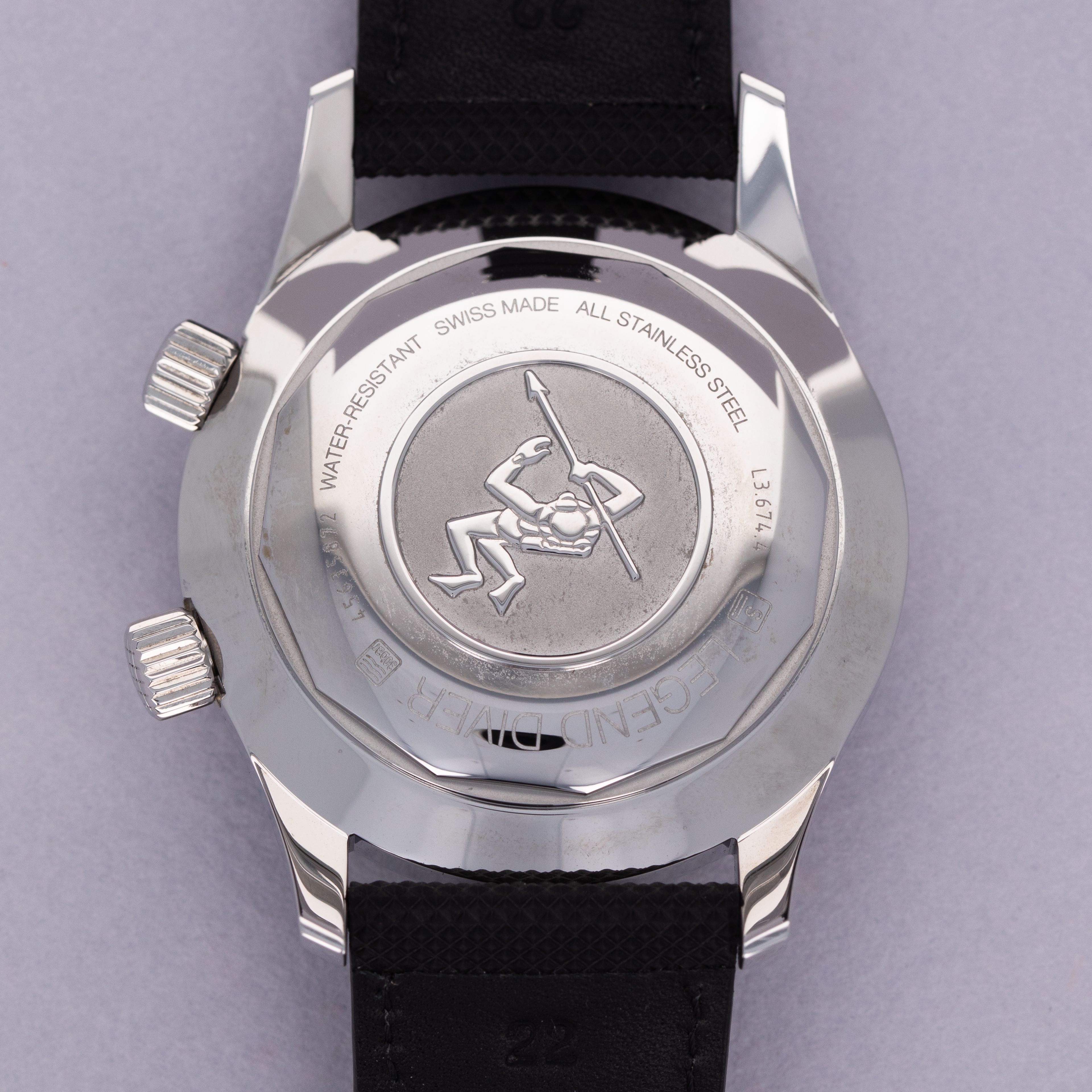 Following the rise in popularity of recreational diving in the 1950 and 1960s, a trend appeared in watchmaking with the rise of so-called ‘Skin divers’ that featured improved water resistance compared to regular timepieces, but maintained a somewhat casual aesthetic compared to out-and-out dive watches. In a bid to innovate on the humble Skin Diver, Longines launched the Super Compressor ref. 7042 in 1958 with a dive bezel, plenty of luminescence, and its eponymous Super Compressor case. Patented by Ervin Piquerez SA (EPSA) in 1956, the Super Compressor case works by using the water pressure to press and seal the caseback against the case of the watch. With its dual-crown system and internal rotating bezel, the Super Compressor is a harmonious marriage between style and utility, earning its position as an icon of its category. Such an icon in fact, Longines have since decided to re-issue this classic, with the ref. L3.674.4.50.0 that we have here standing as one of the earlier references, launched in 2009. Boasting a 42mm stainless steel case with a black dial that is faithful to the original, this model is a contemporarily made timepiece that embodies the sporting spirit of the 1950s and 1960s.